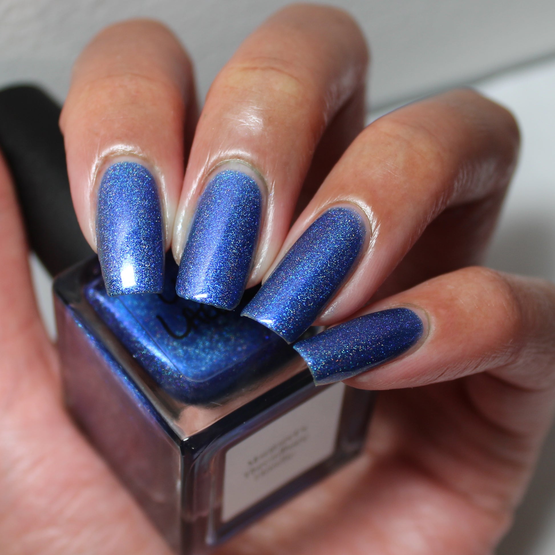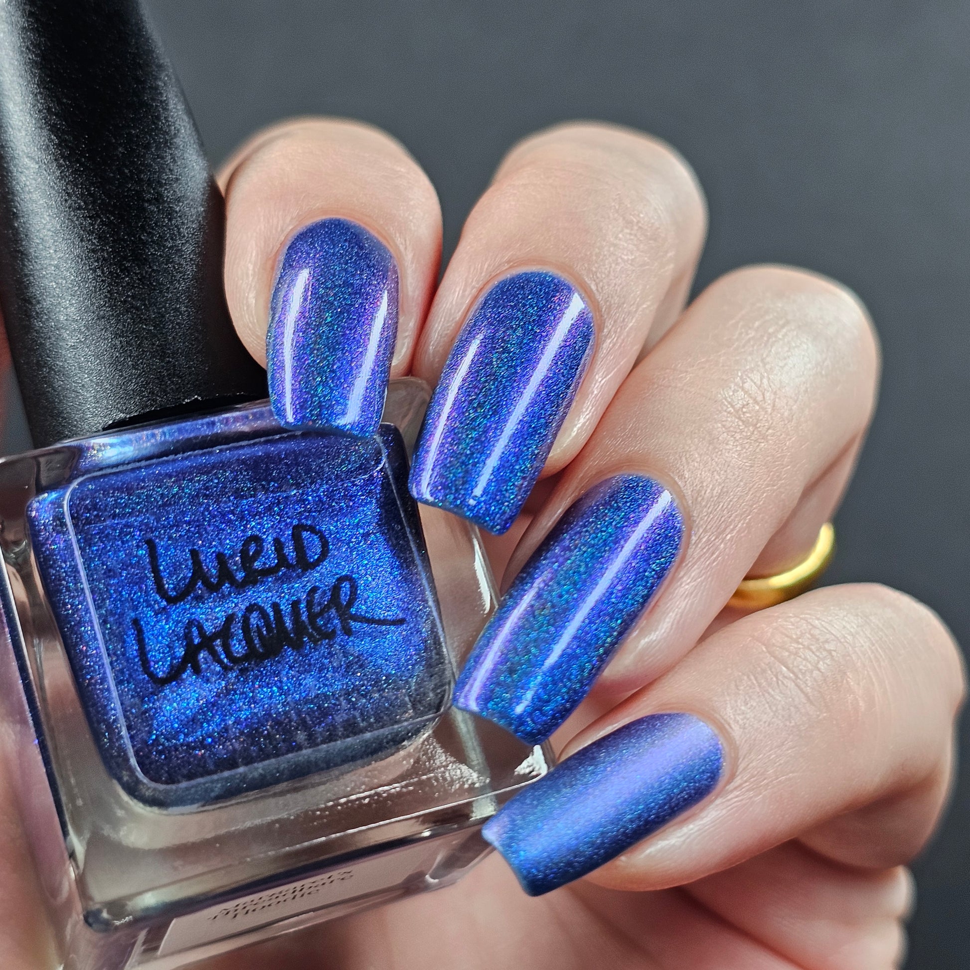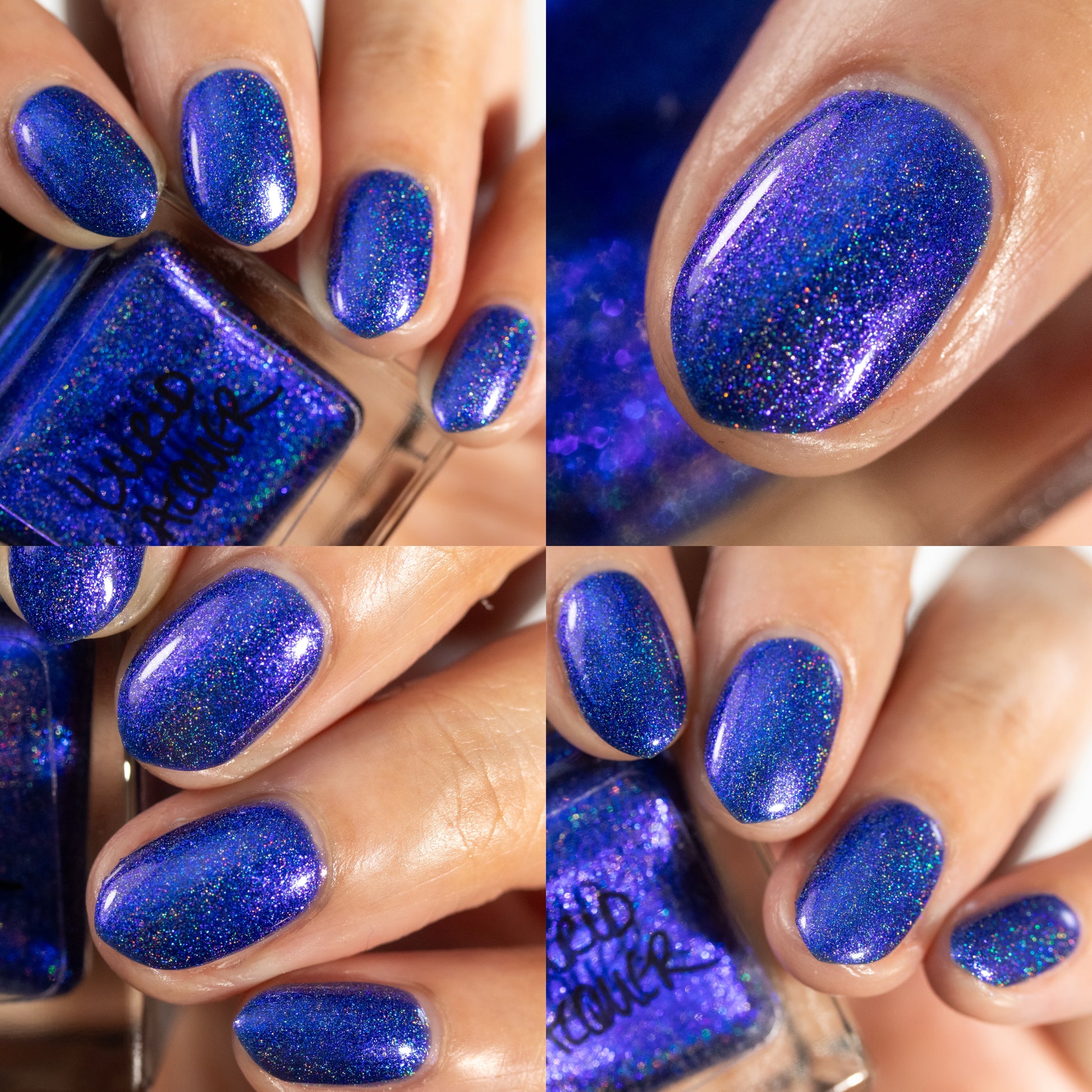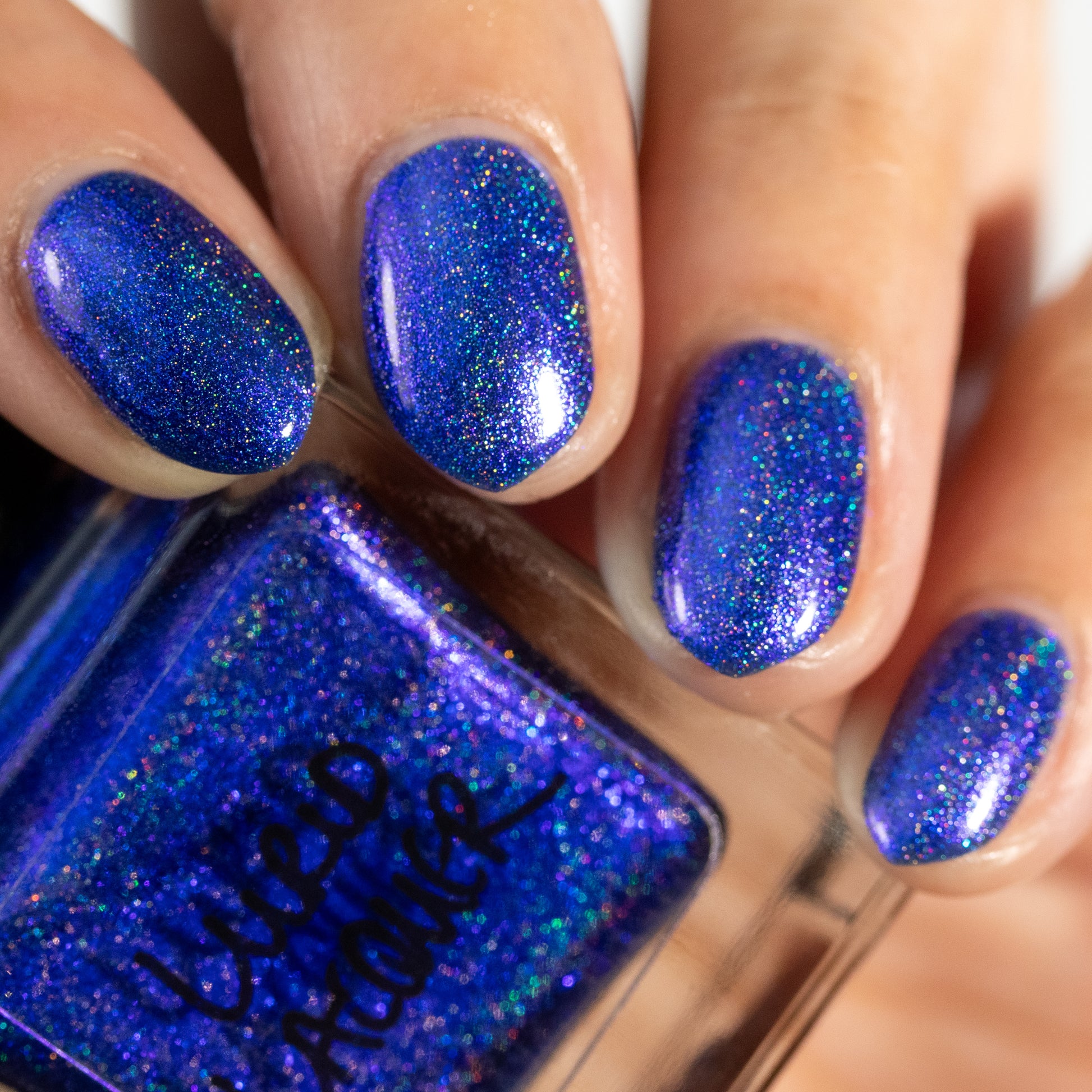 An indigo jelly base with subtle blue to purple aurora shimmer and linear holographic pigment