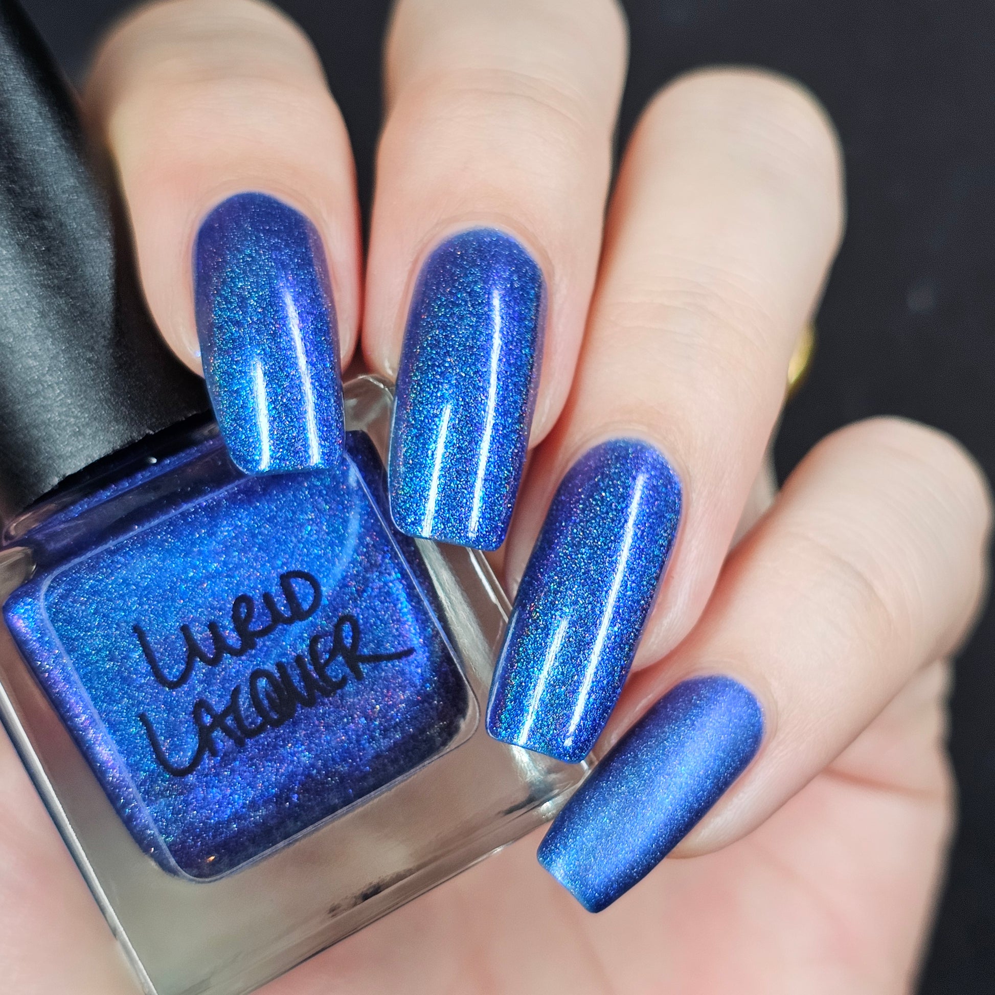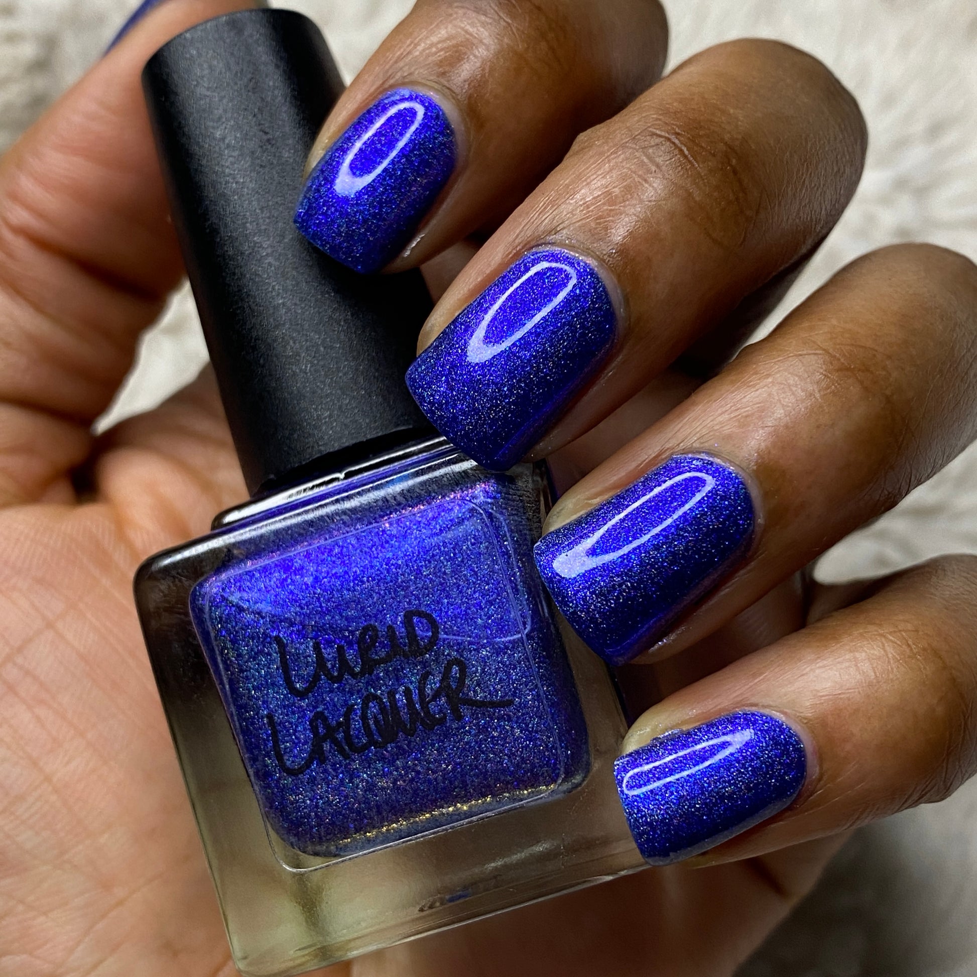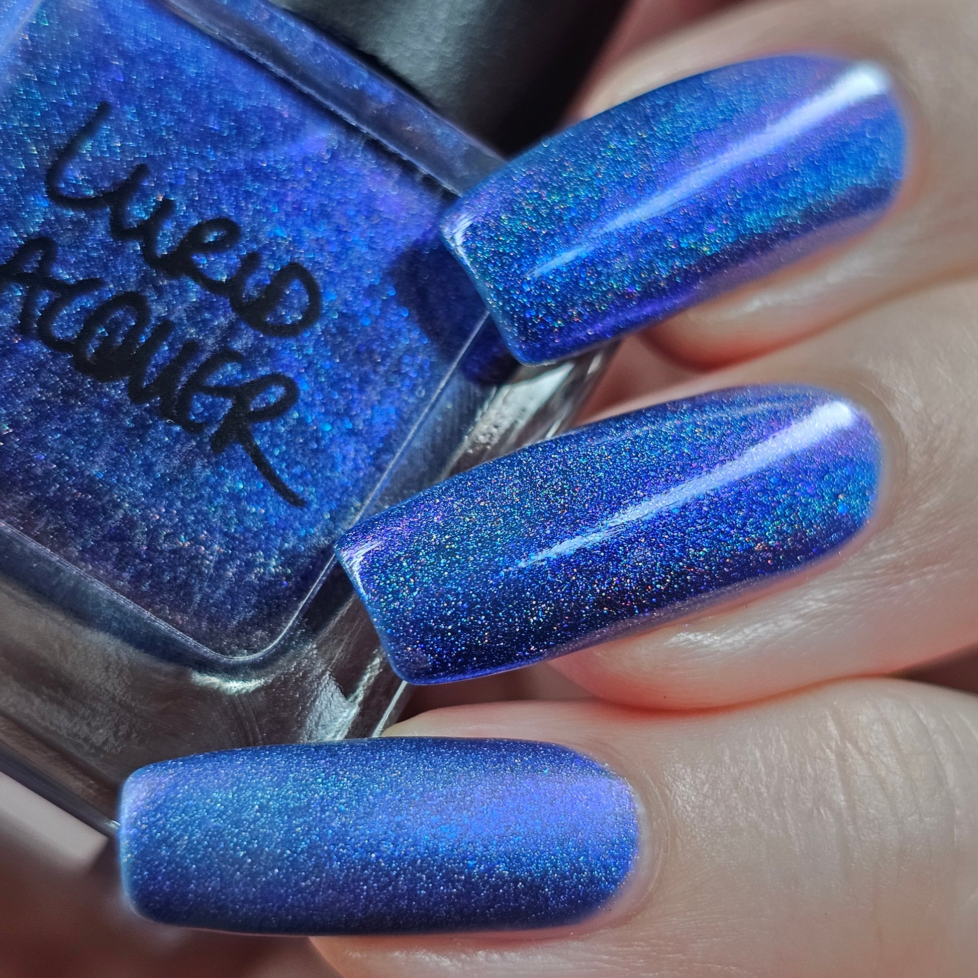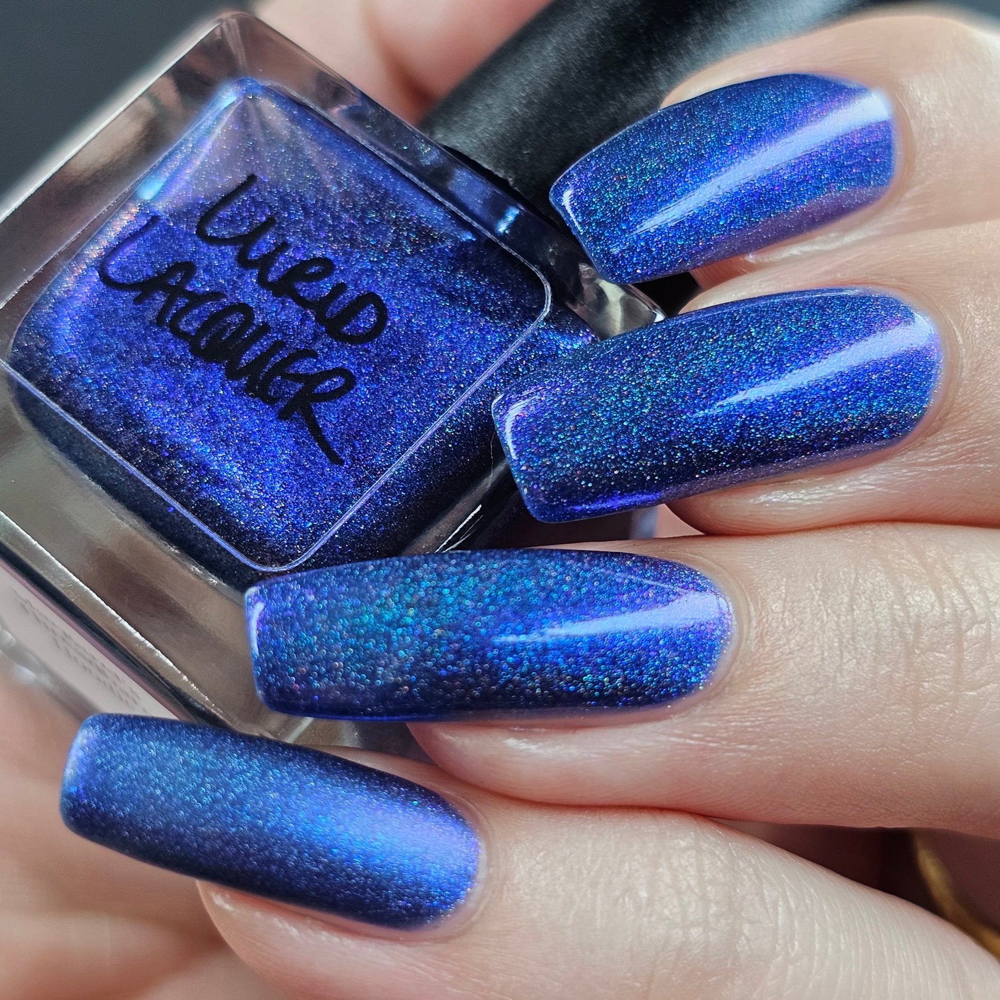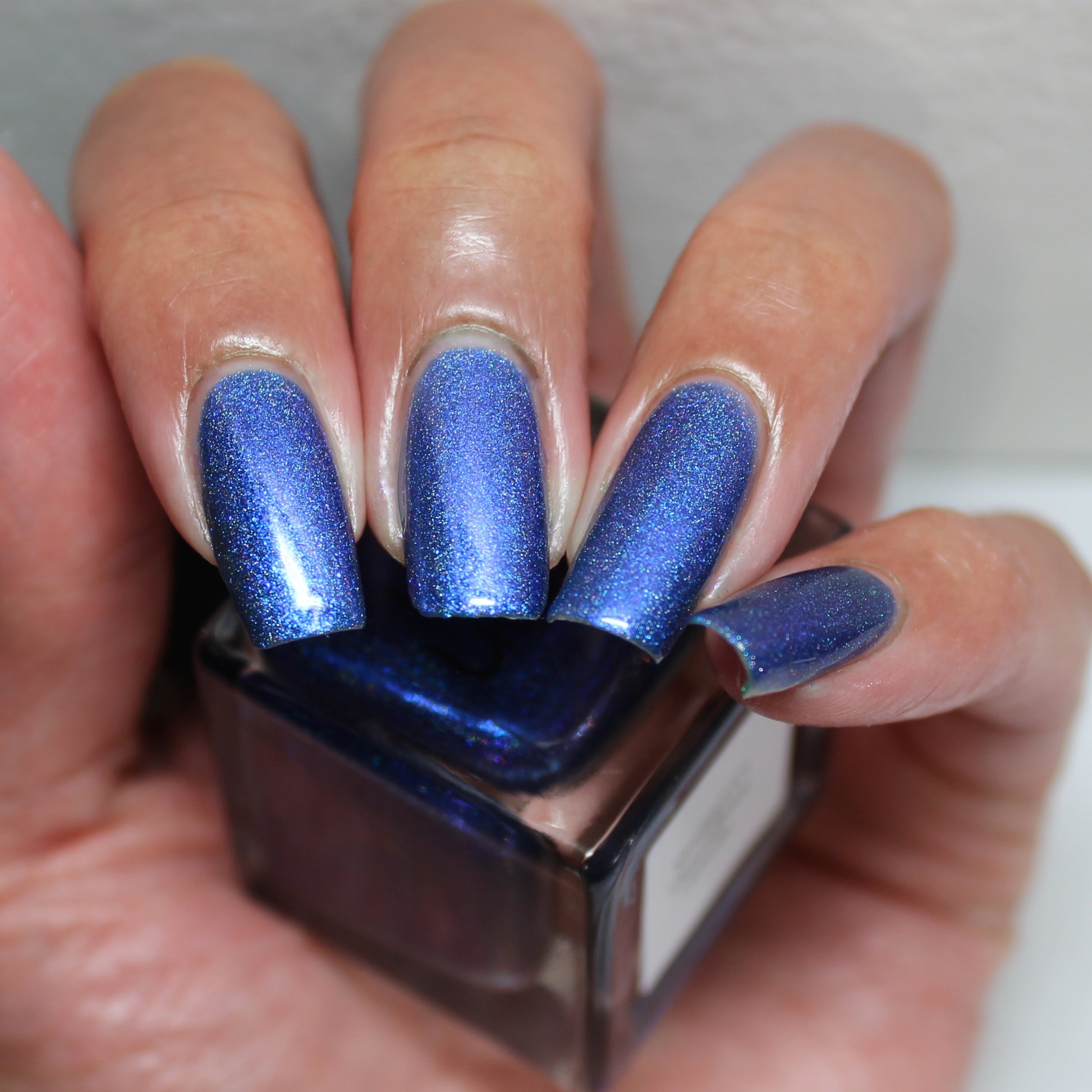 An indigo jelly base with subtle blue to purple aurora shimmer and linear holographic pigment