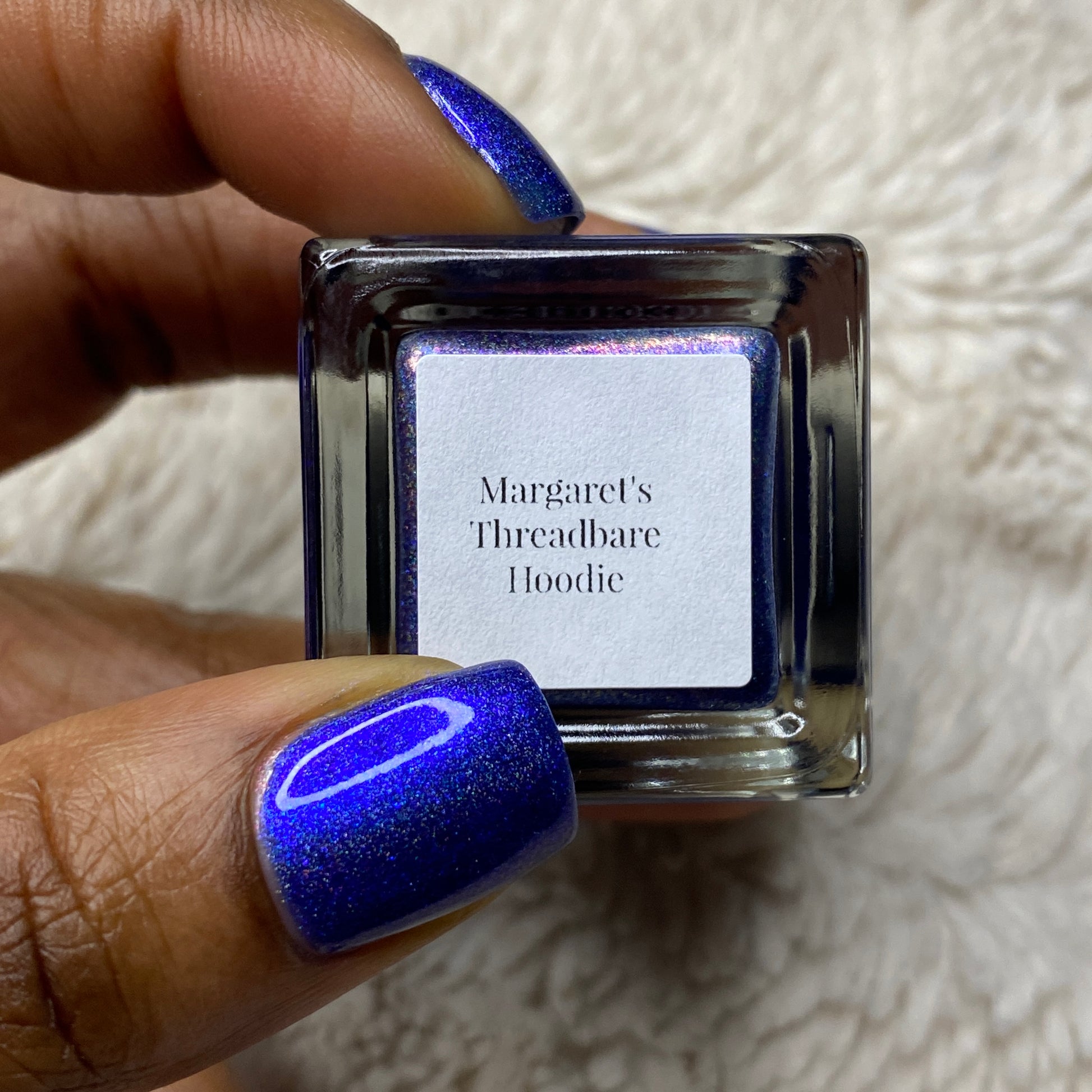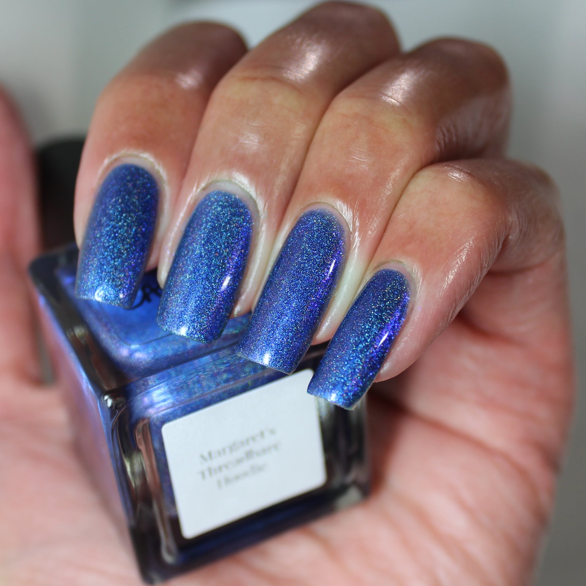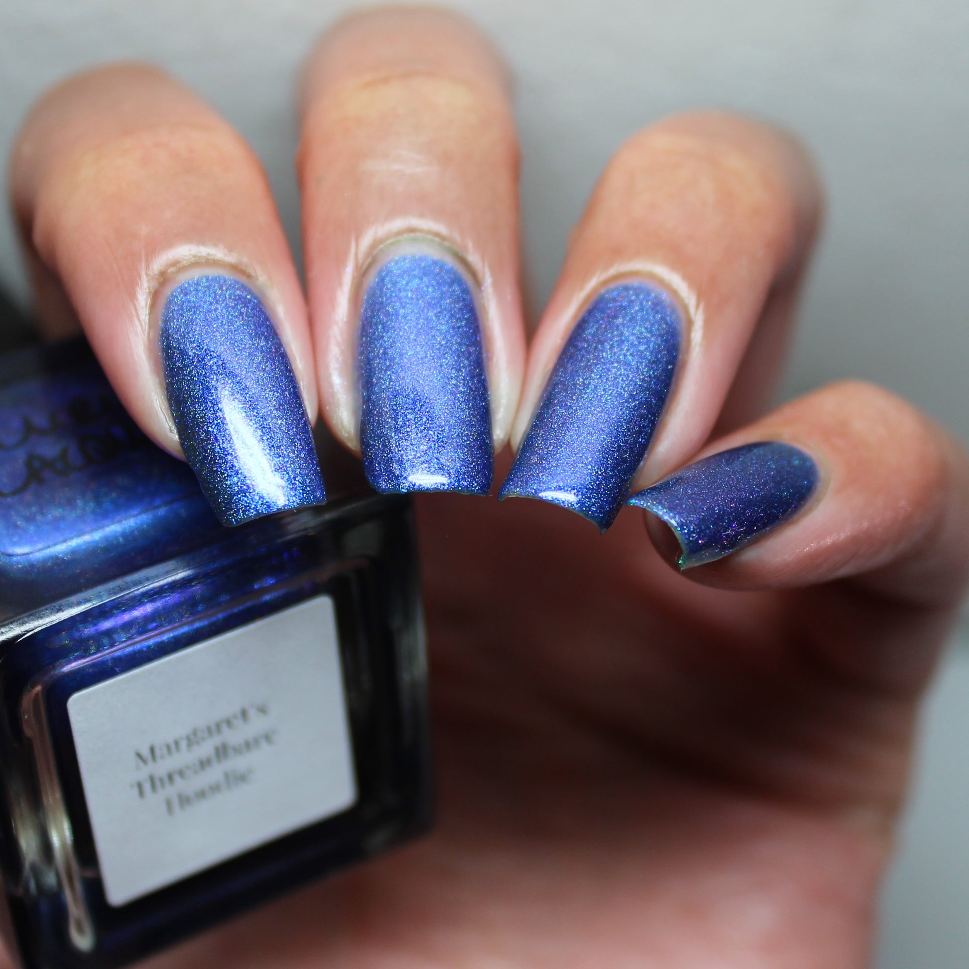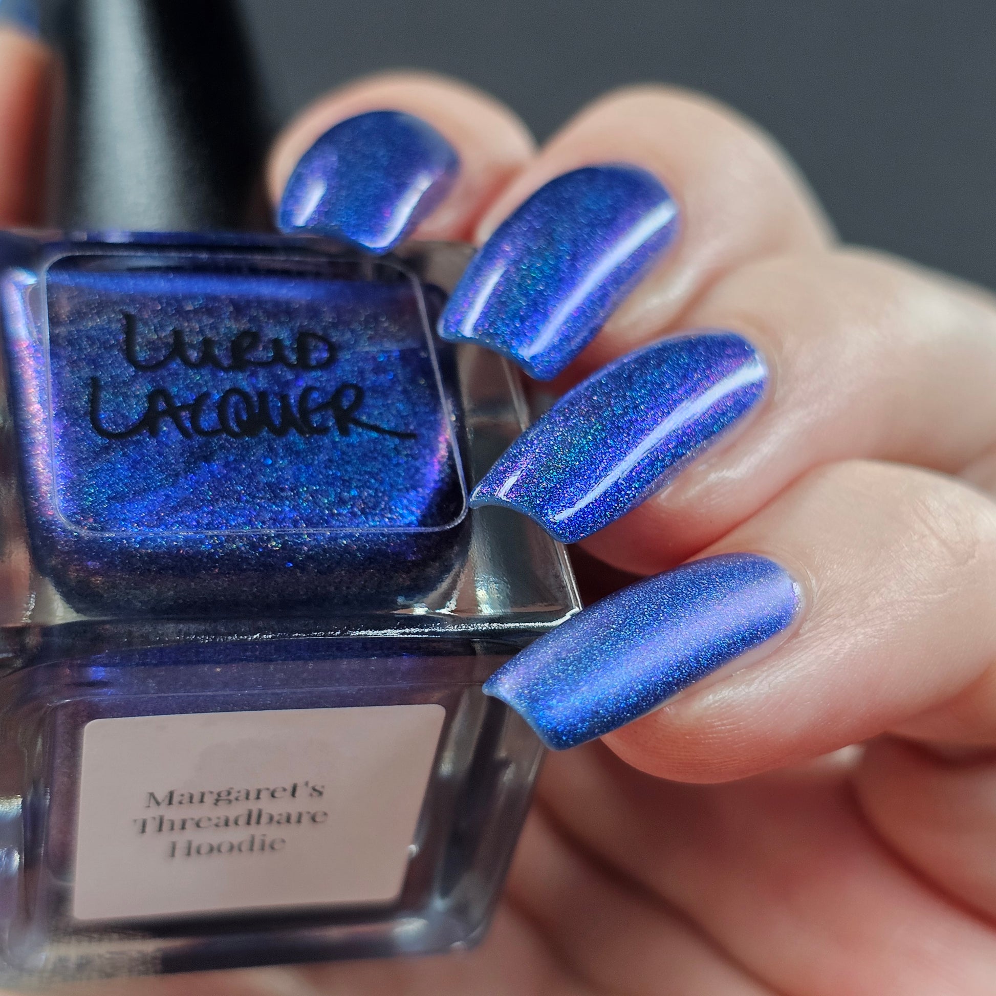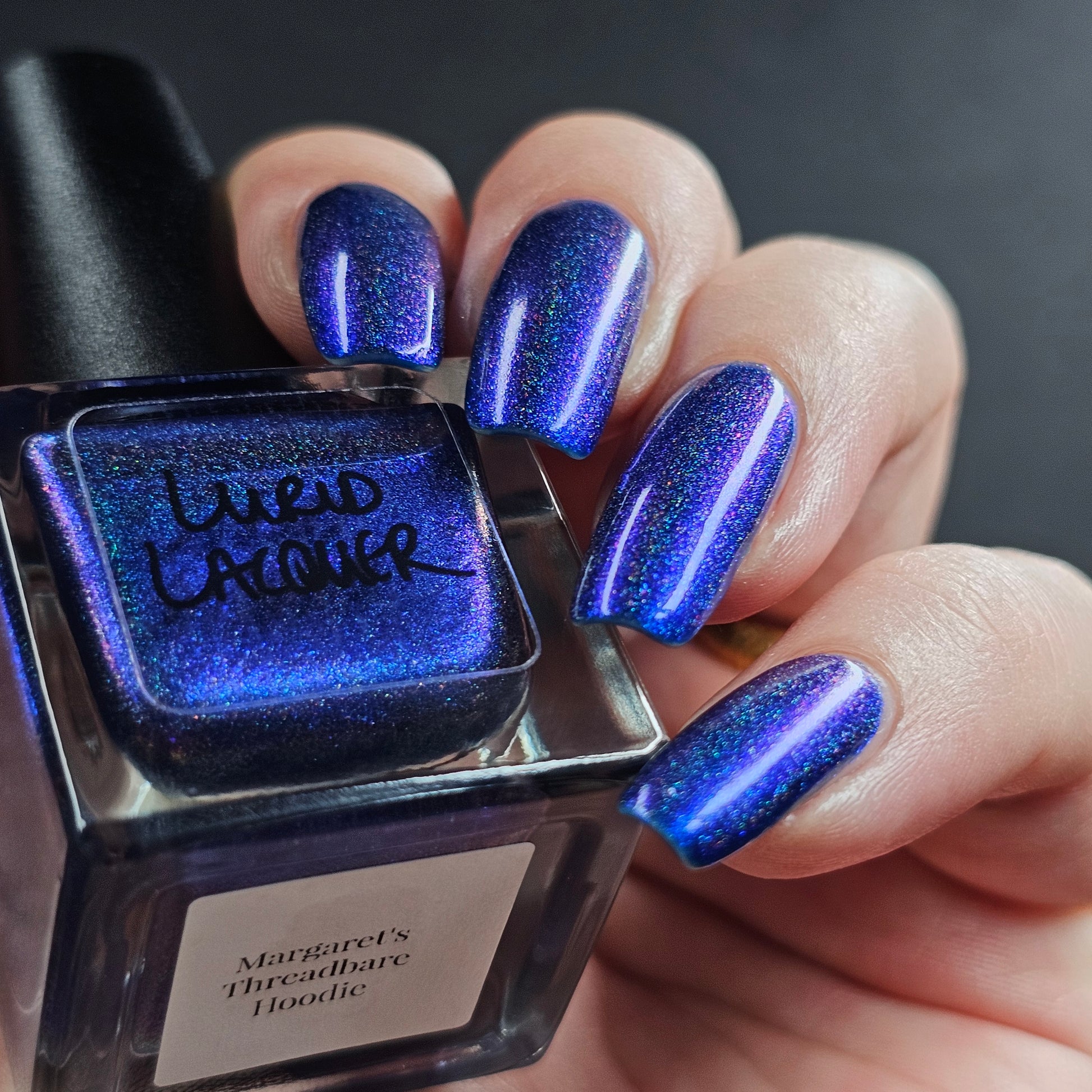 An indigo jelly base with subtle blue to purple aurora shimmer and linear holographic pigment
