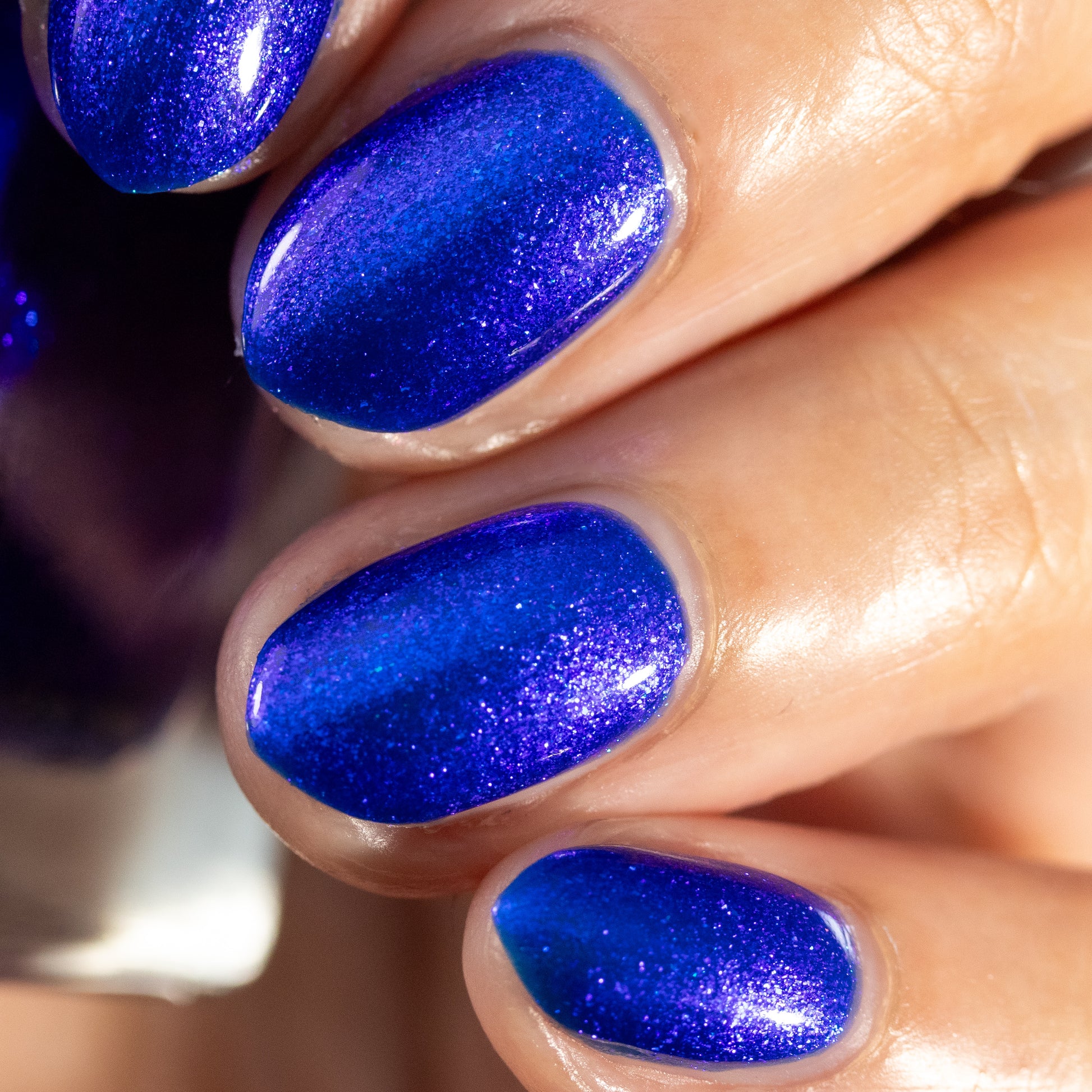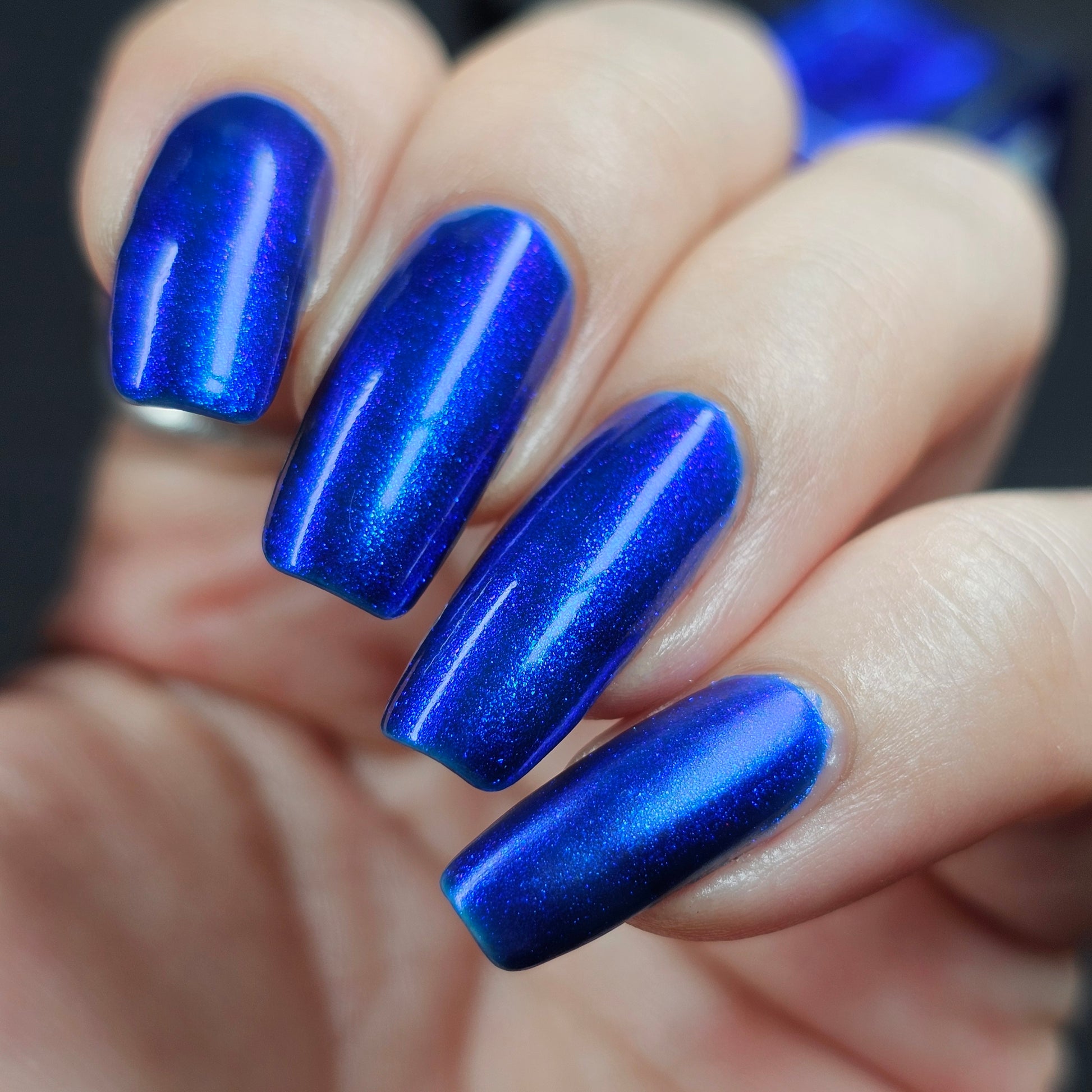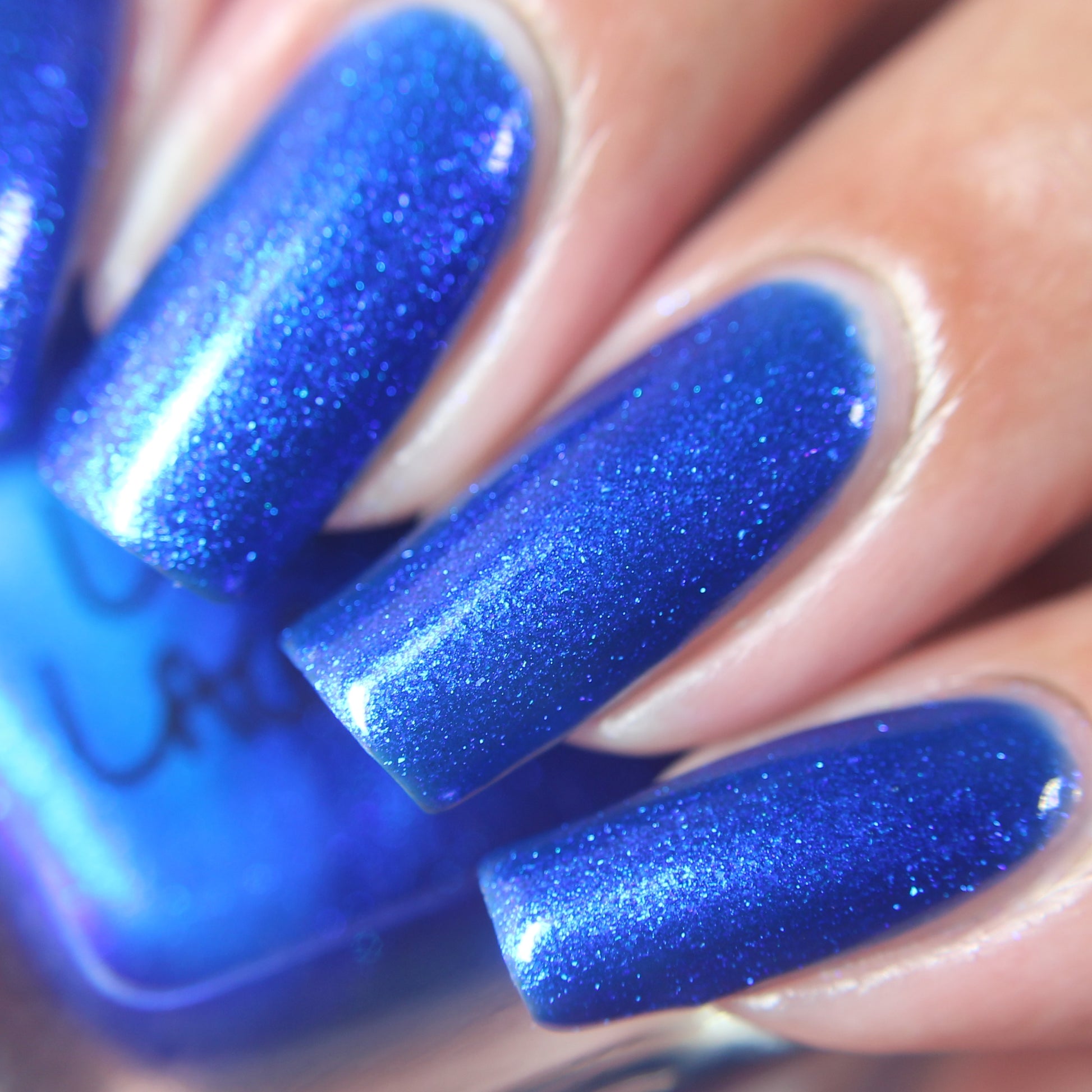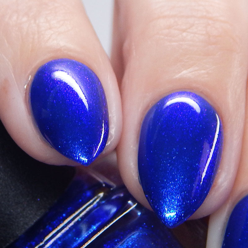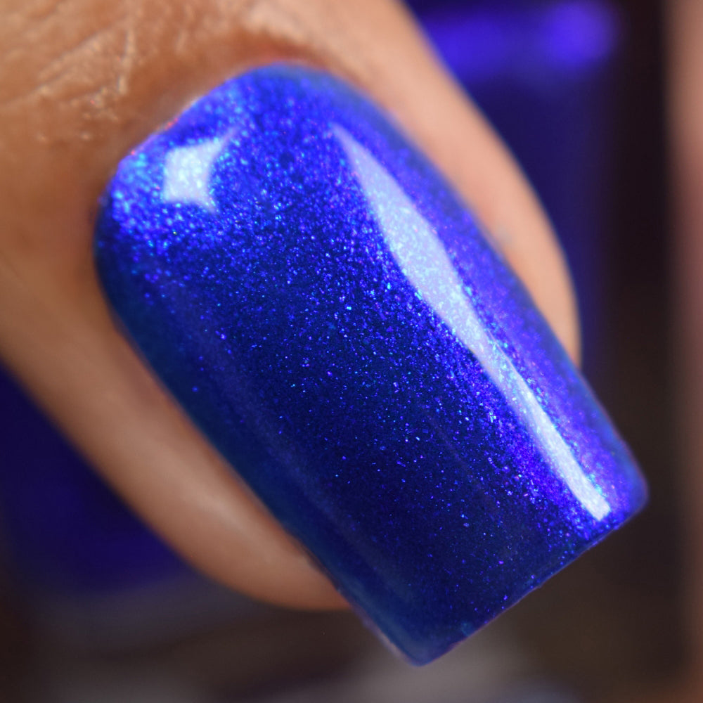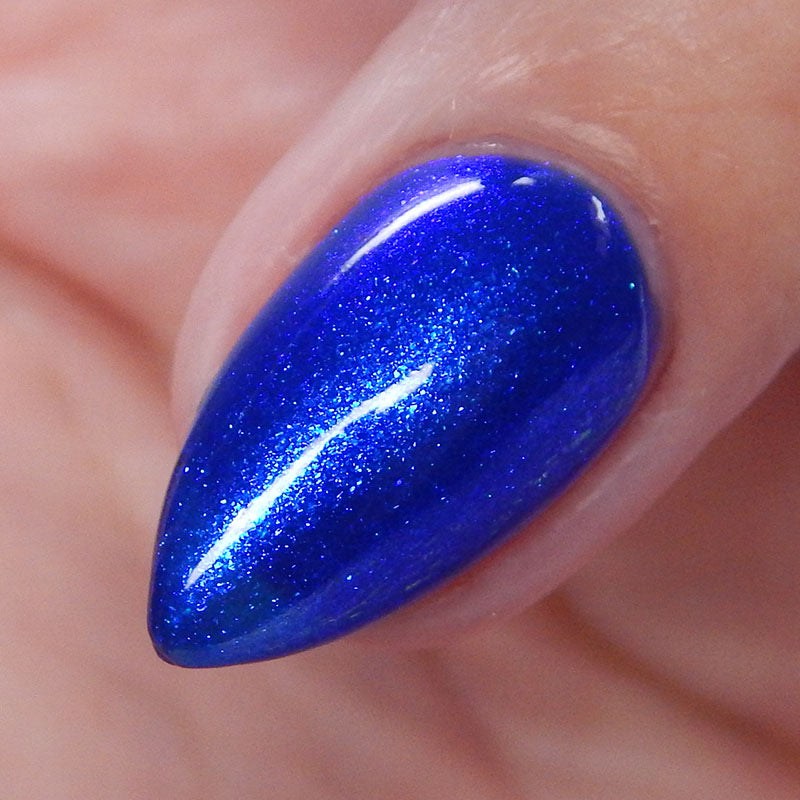 A saturated blue base with large particle blue to purple aurora shimmer that shifts subtly to red at extremes