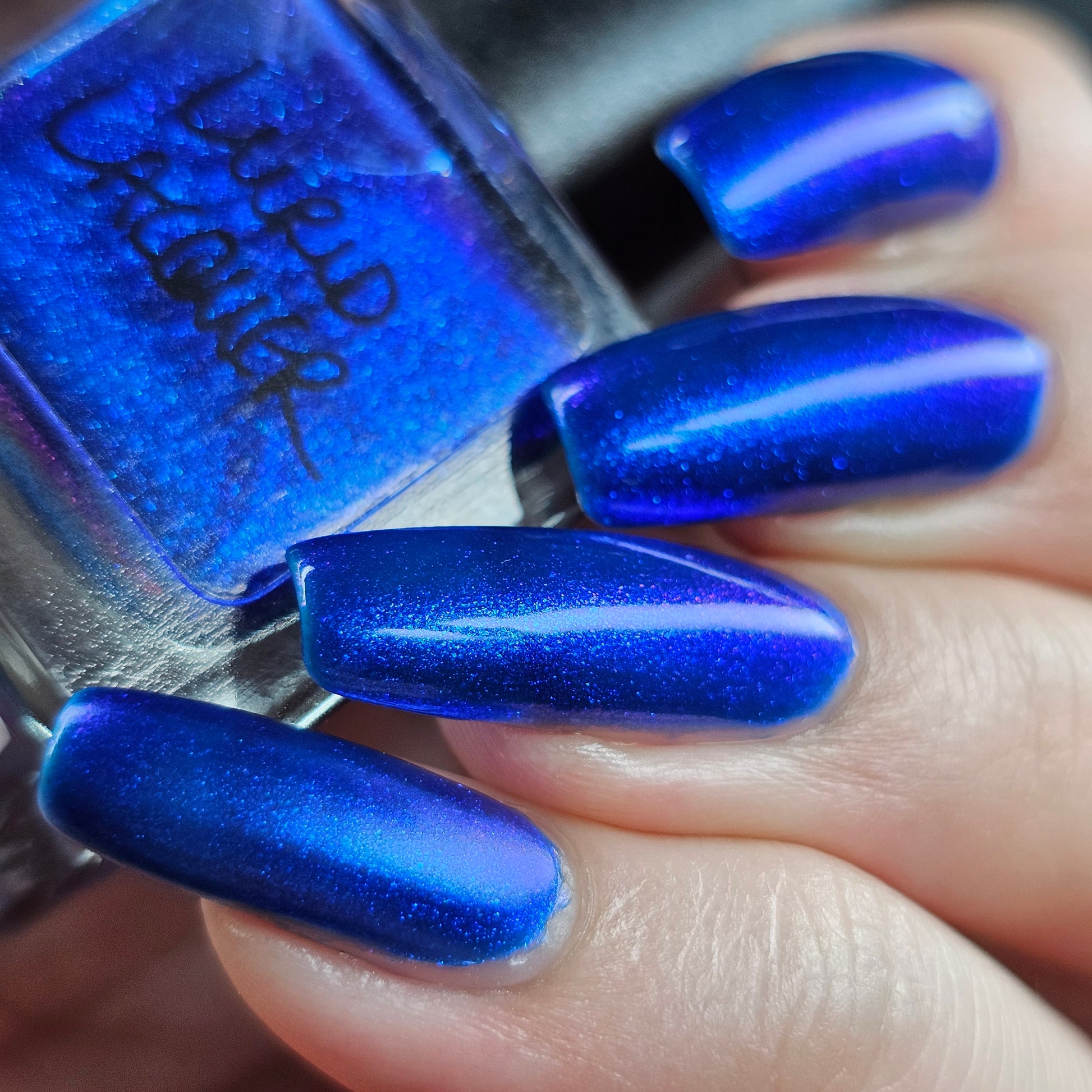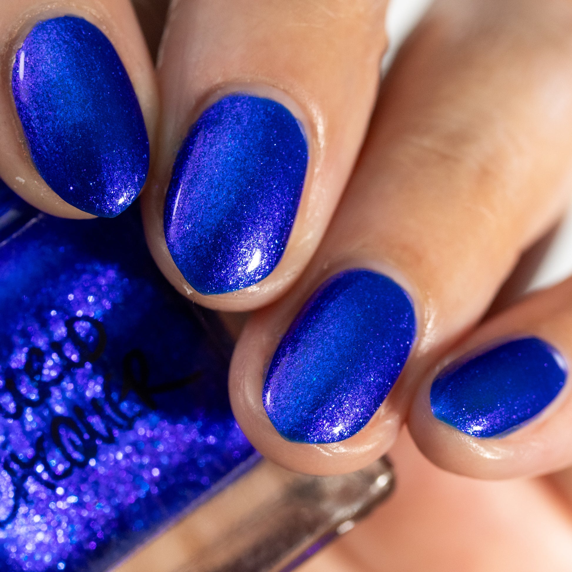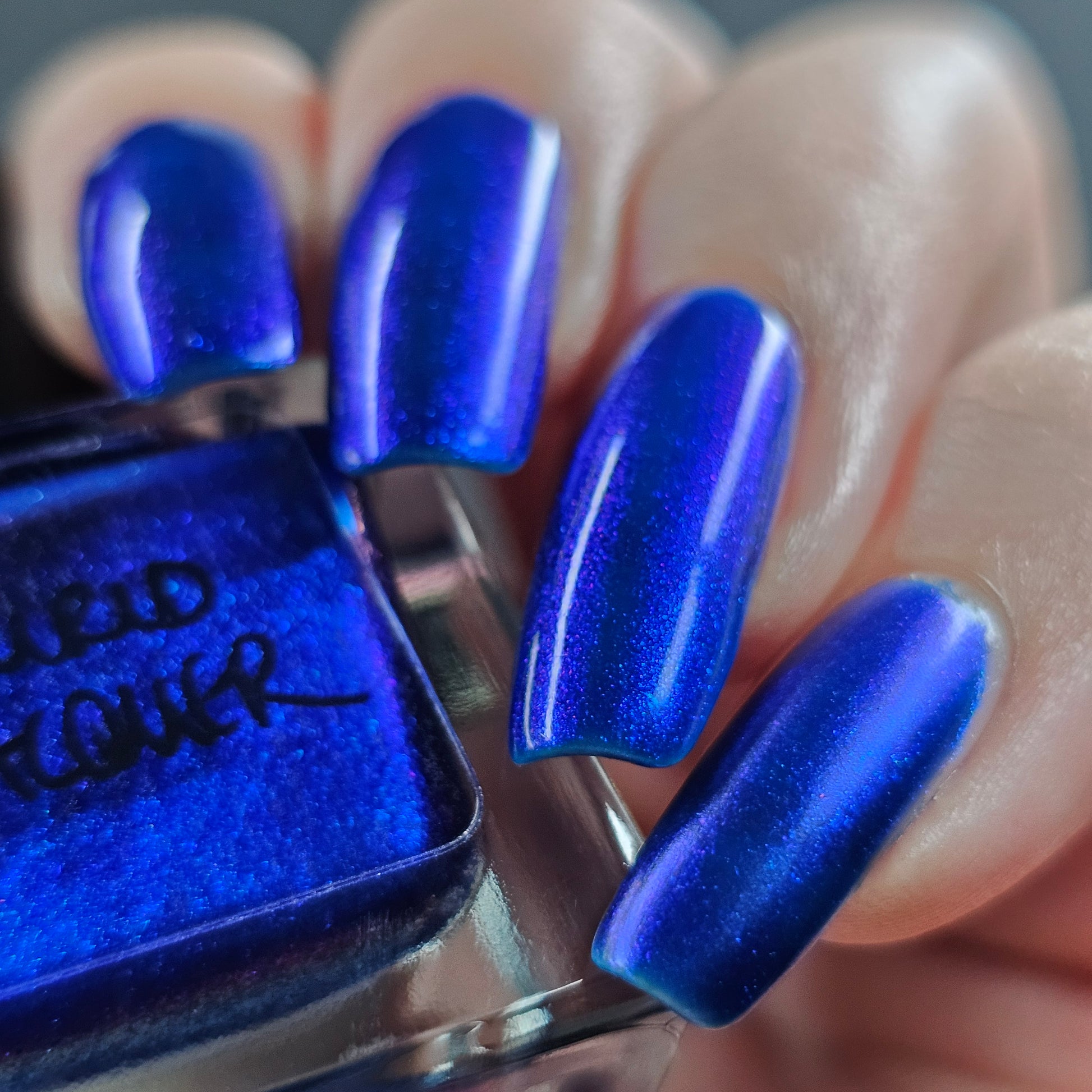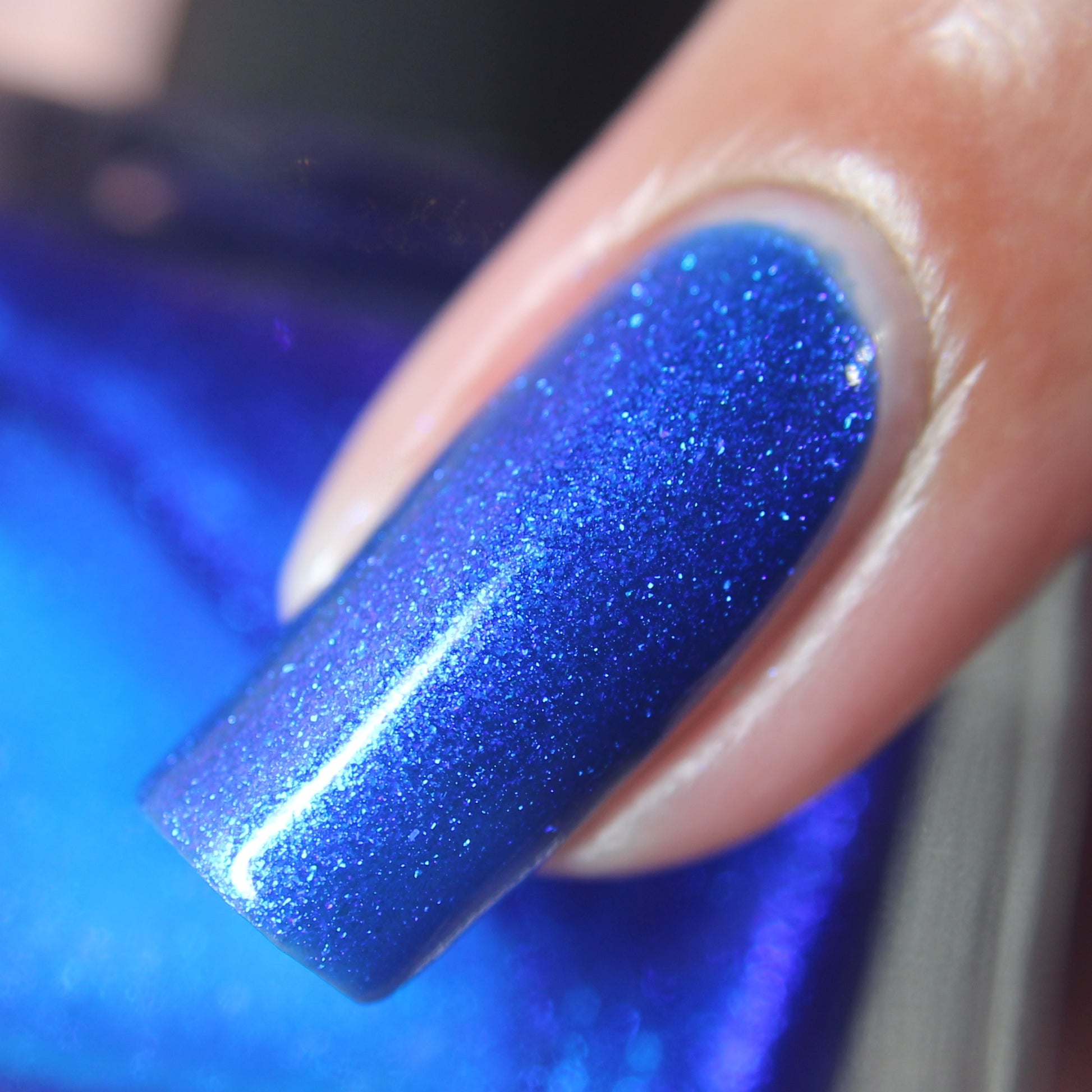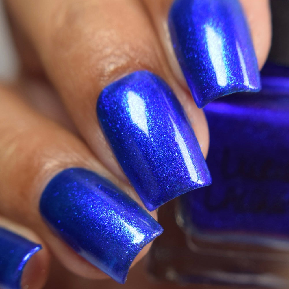 A saturated blue base with large particle blue to purple aurora shimmer that shifts subtly to red at extremes