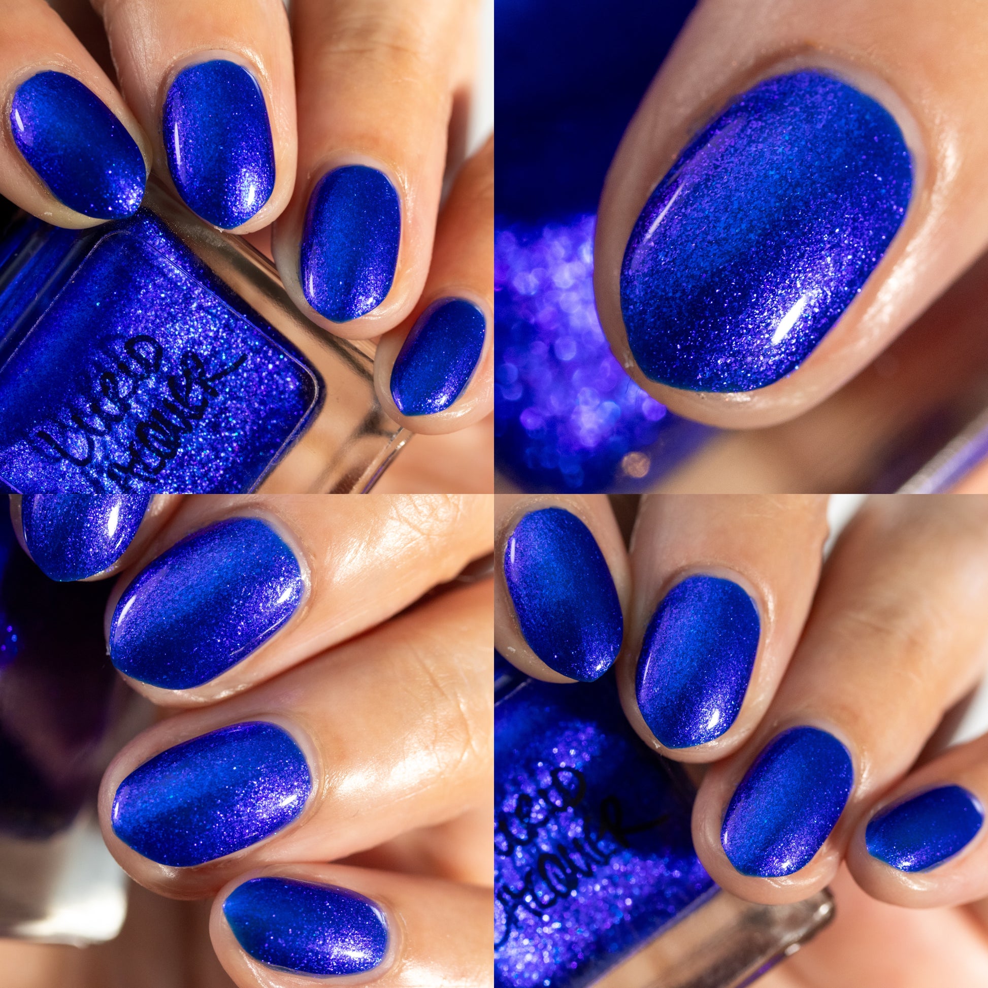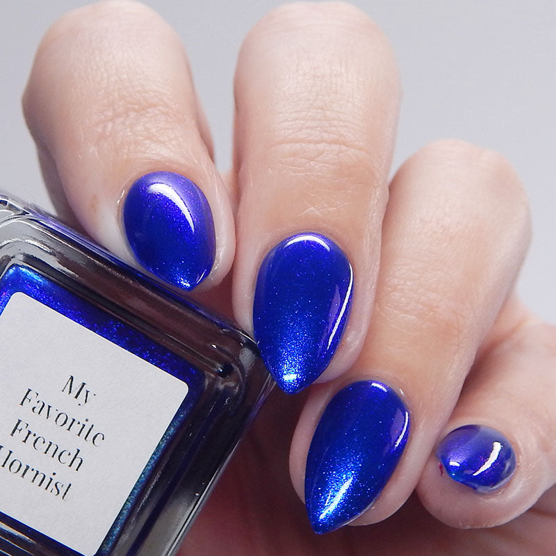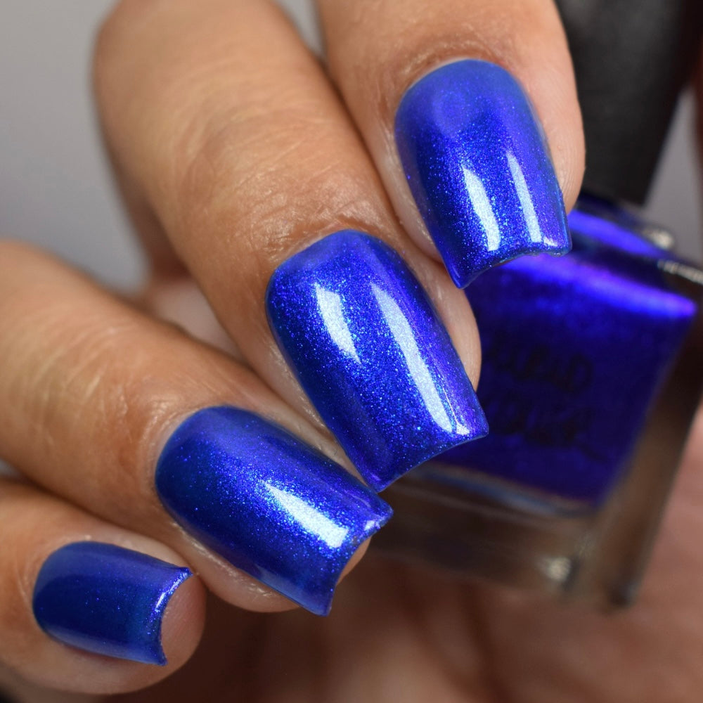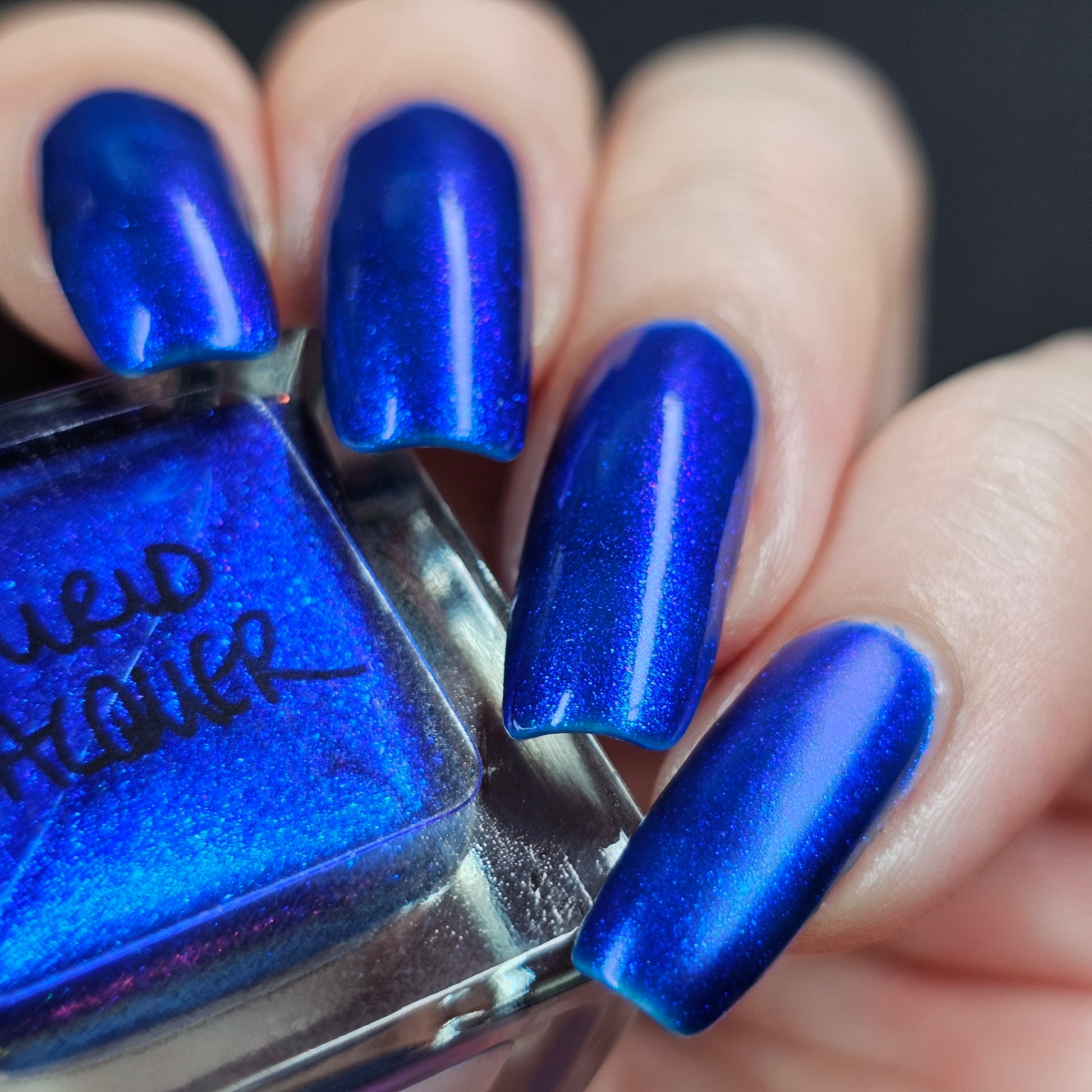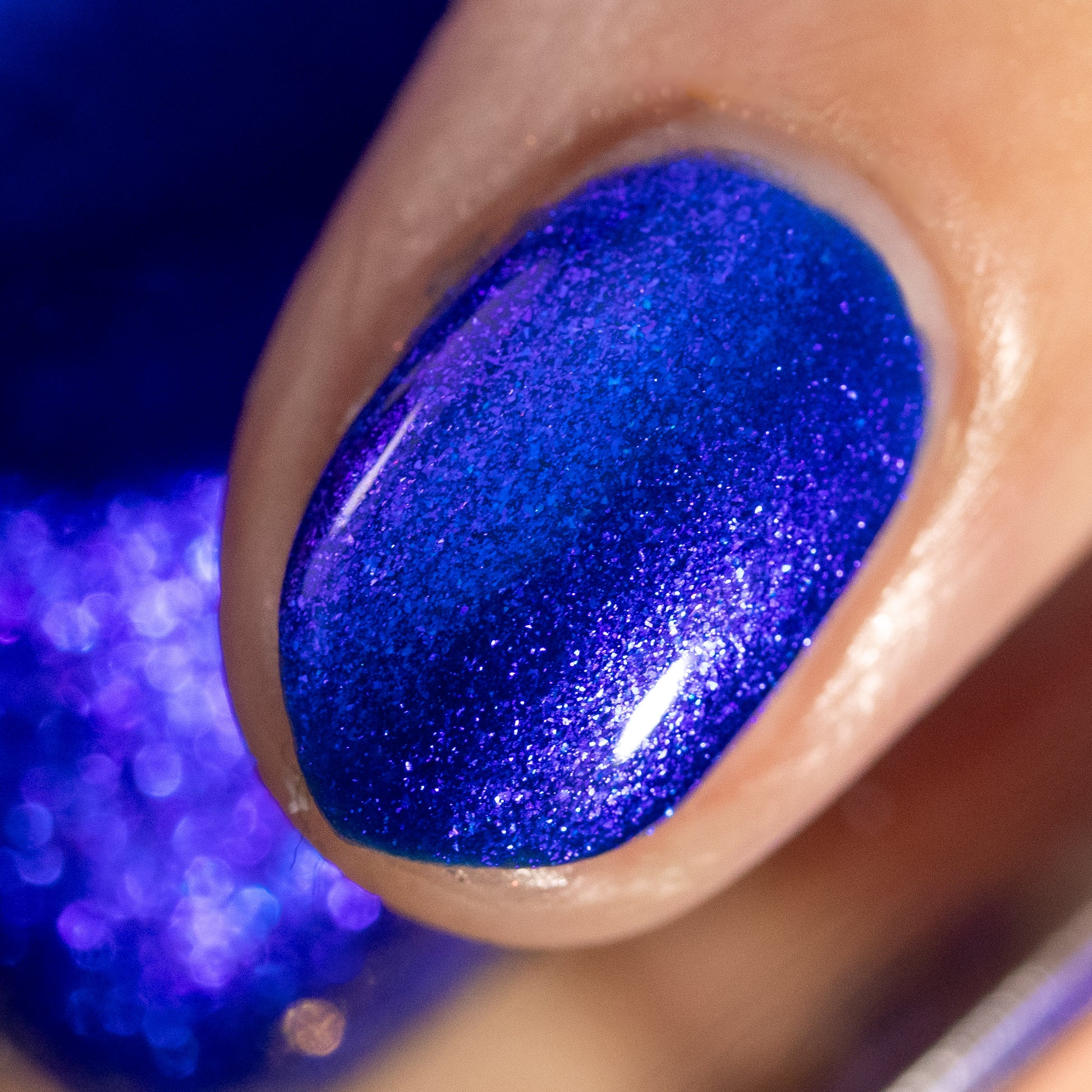 A saturated blue base with large particle blue to purple aurora shimmer that shifts subtly to red at extremes