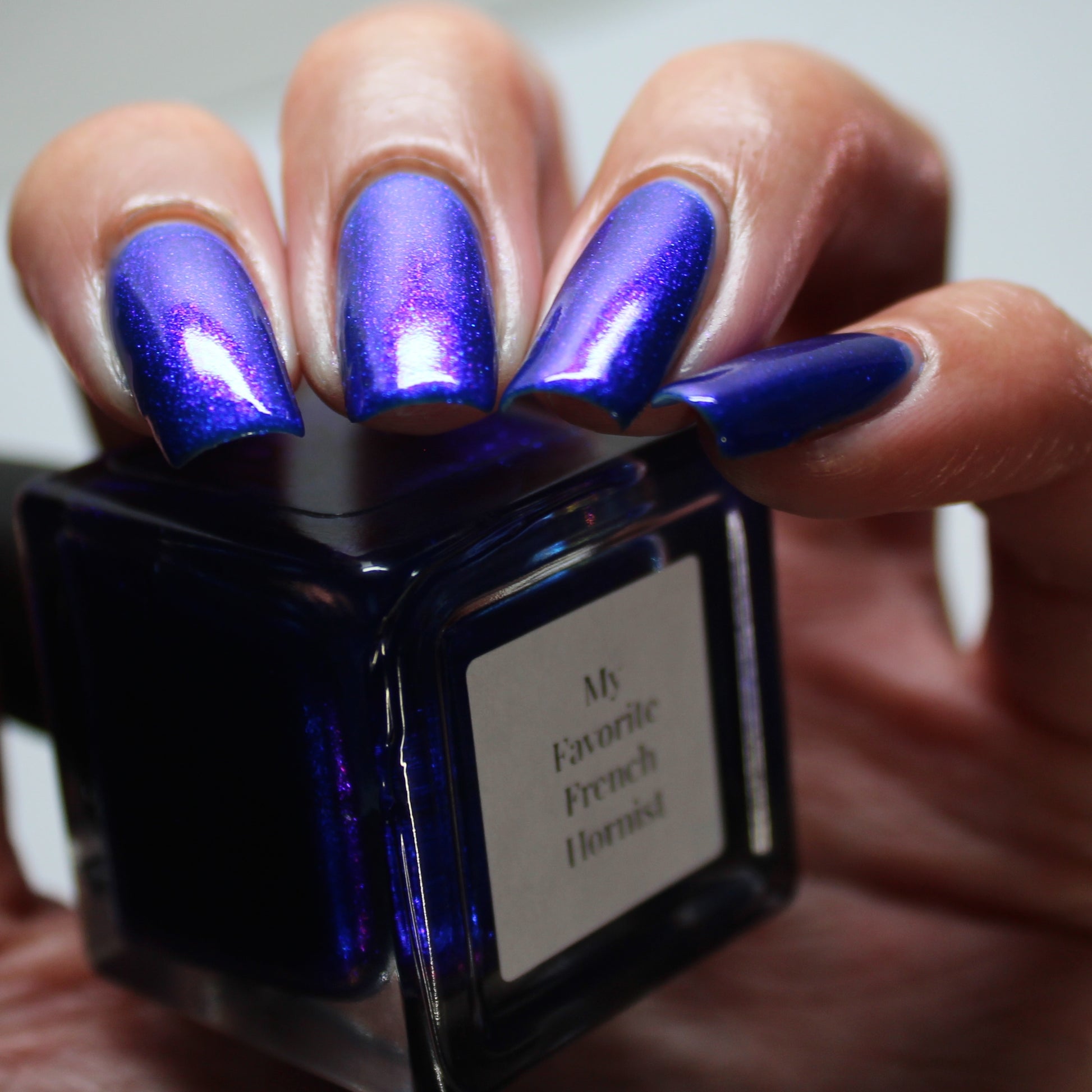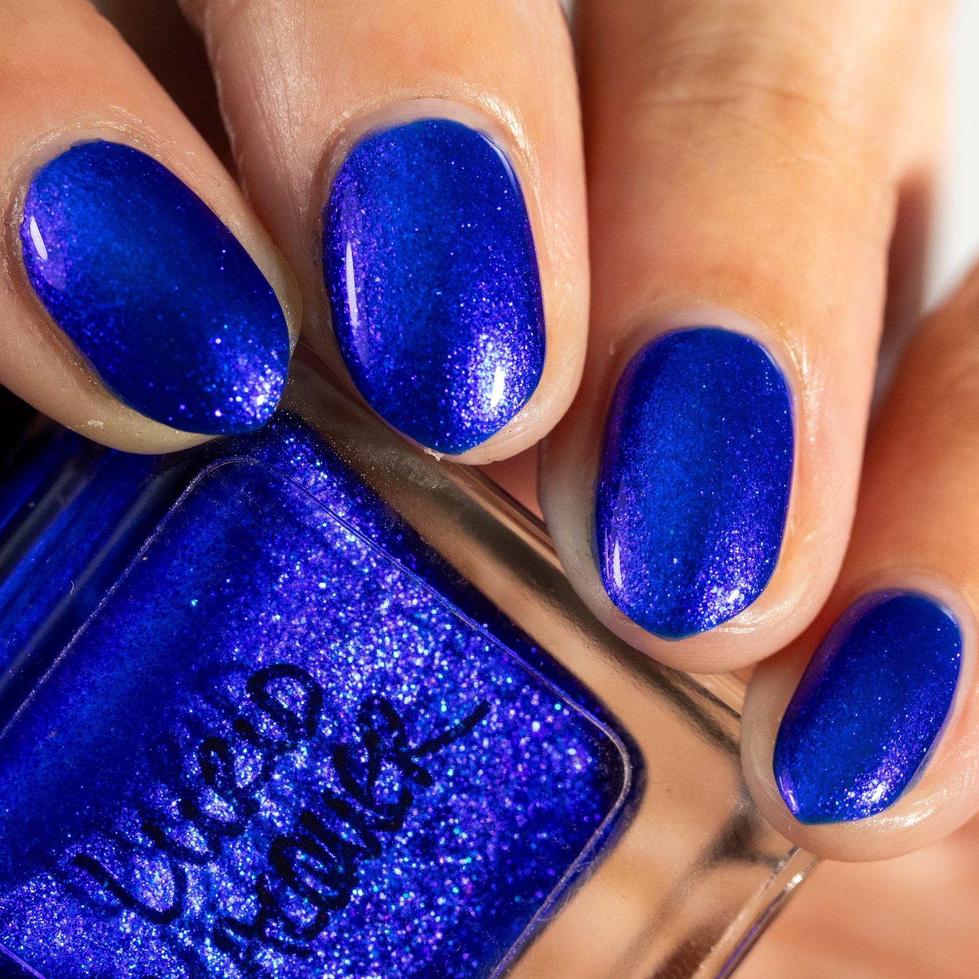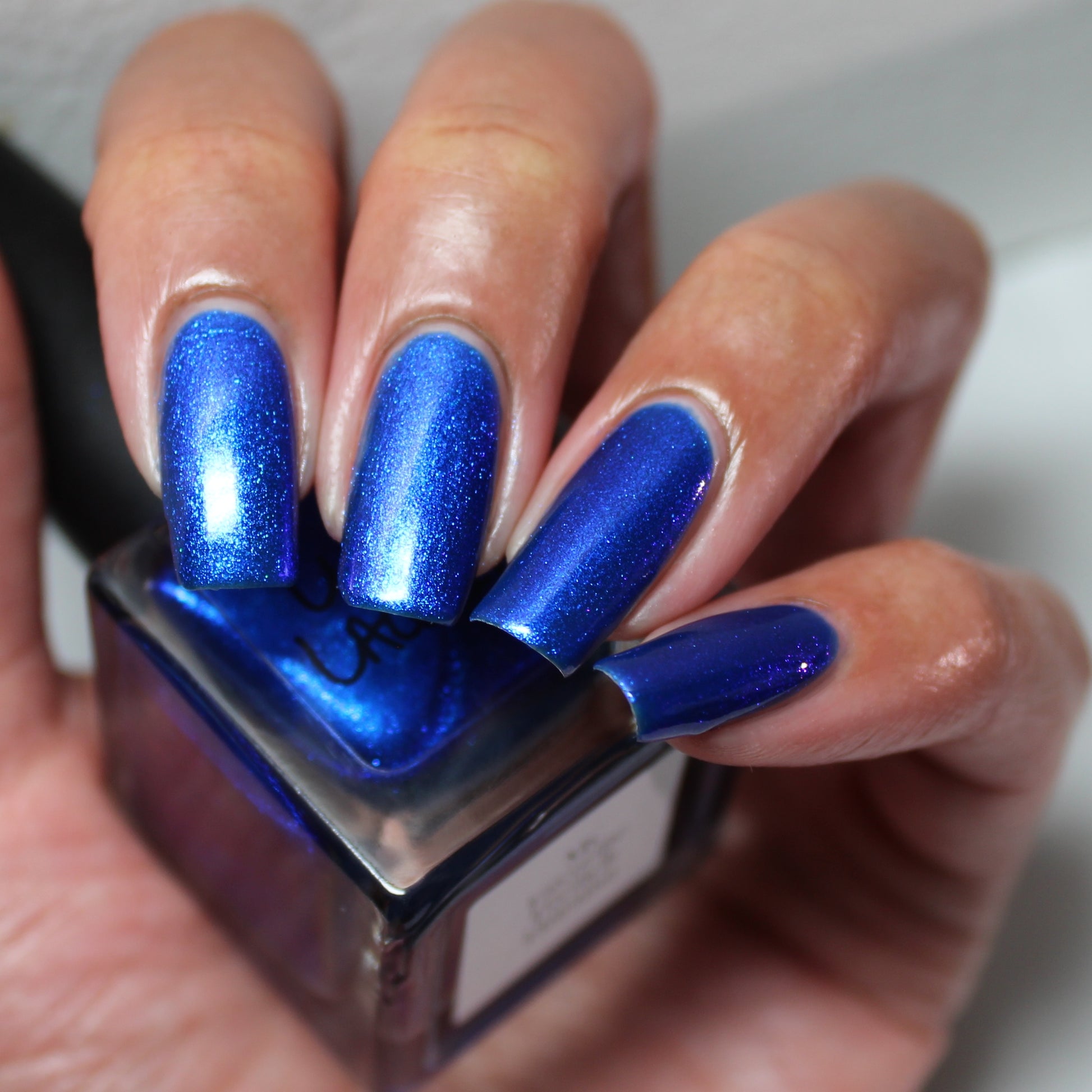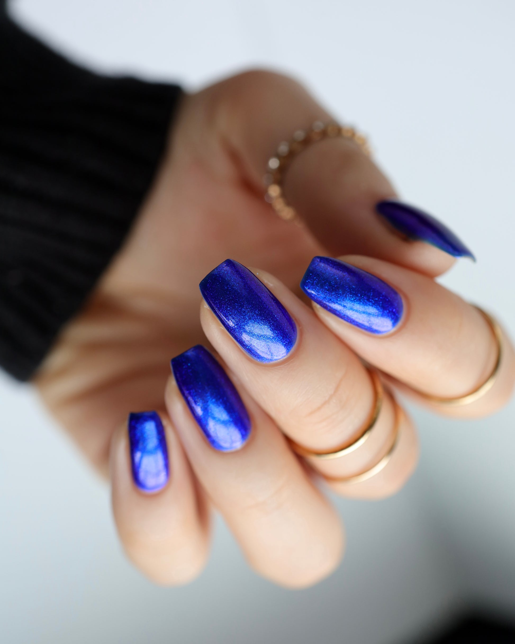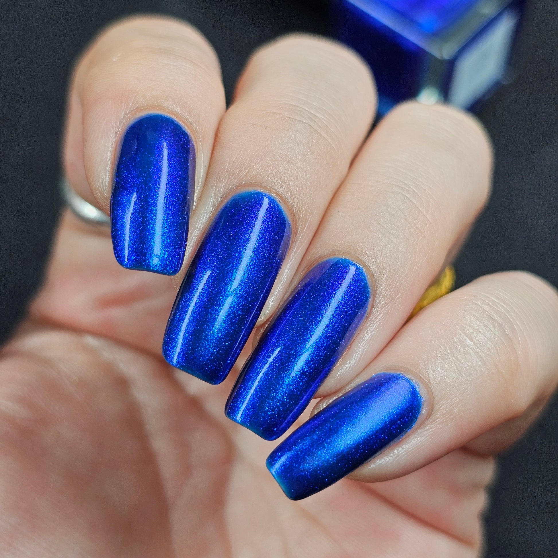 A saturated blue base with large particle blue to purple aurora shimmer that shifts subtly to red at extremes
