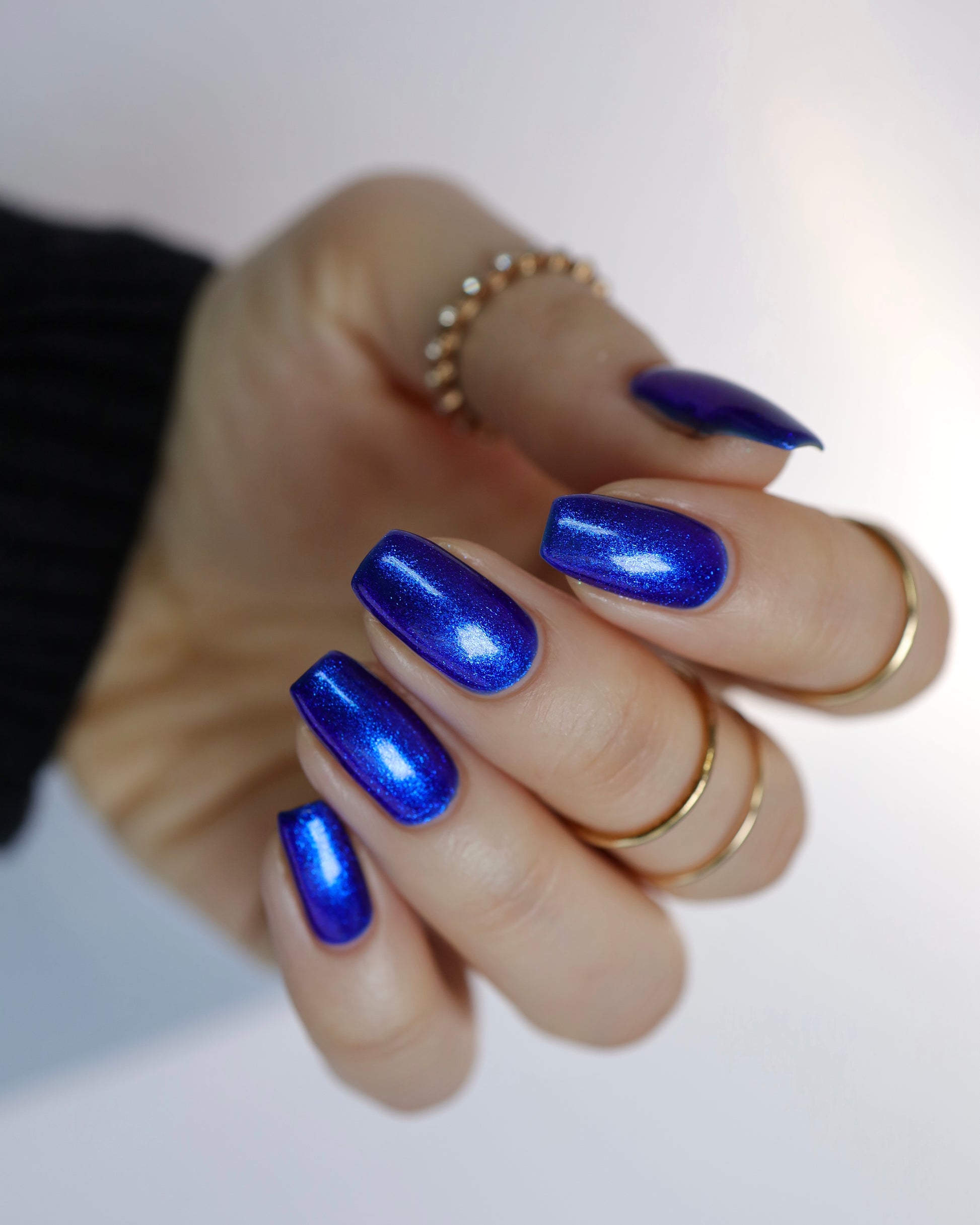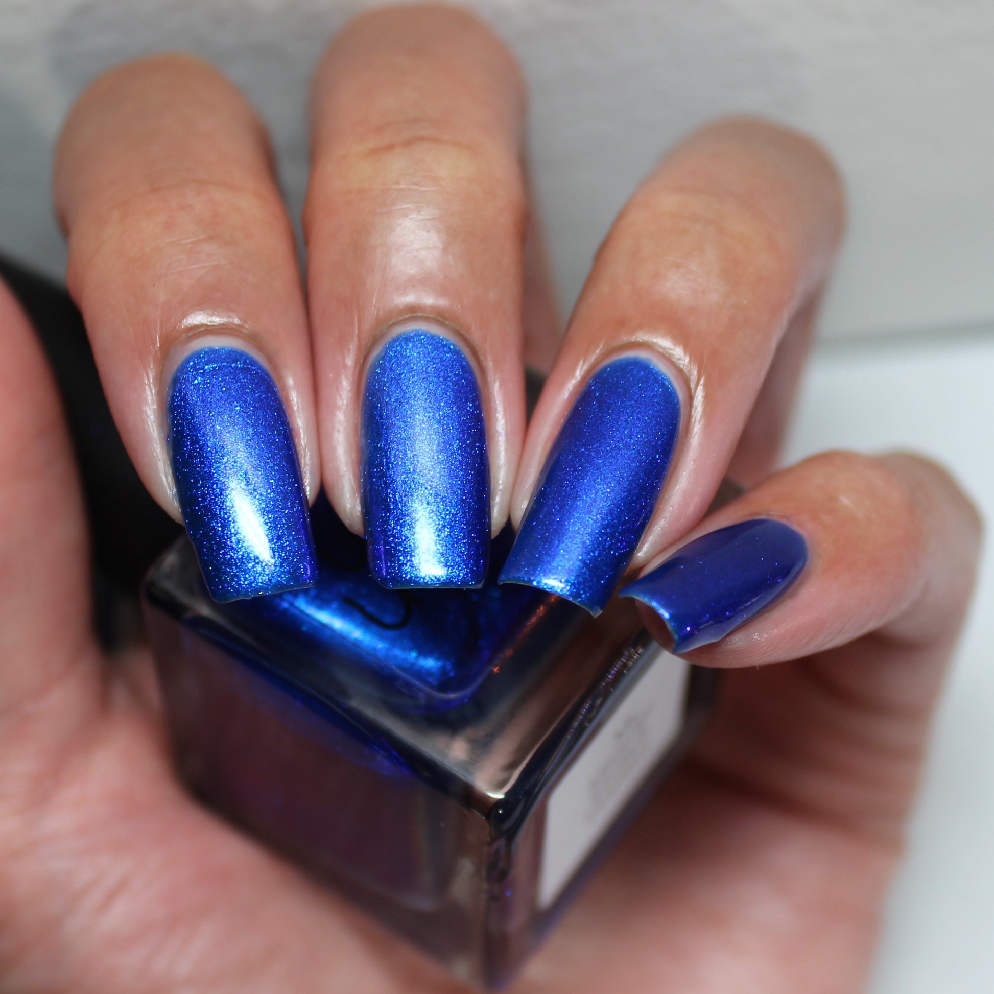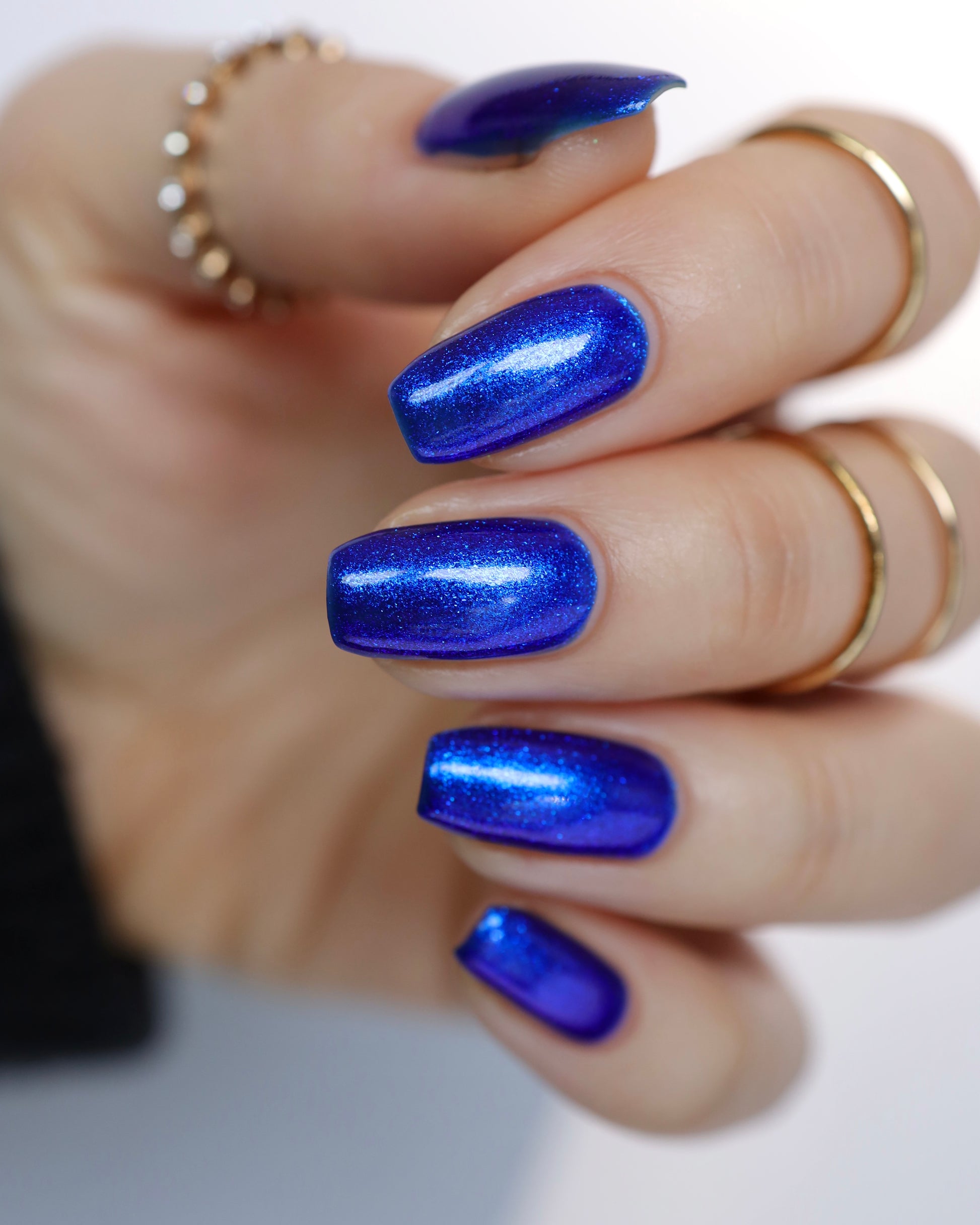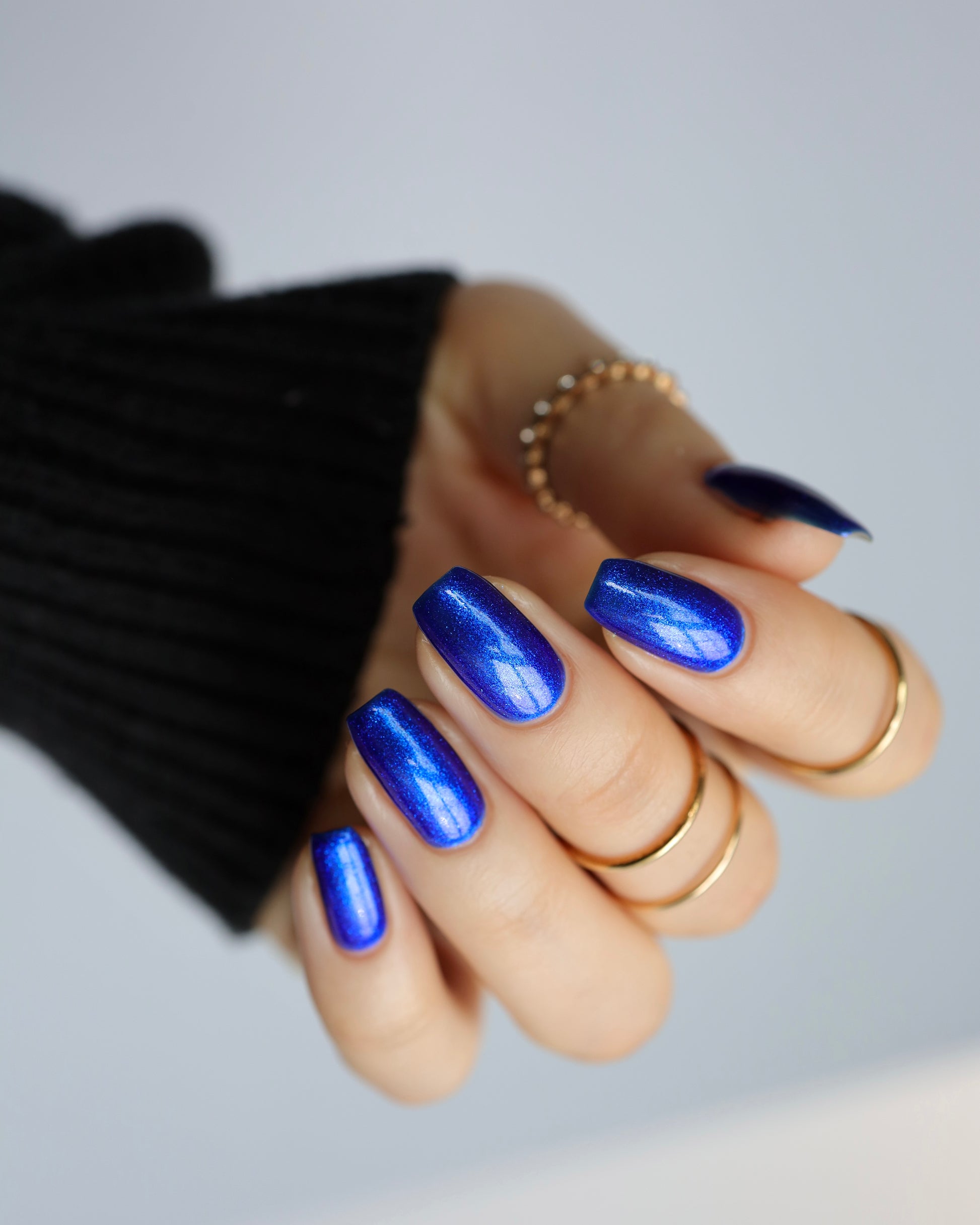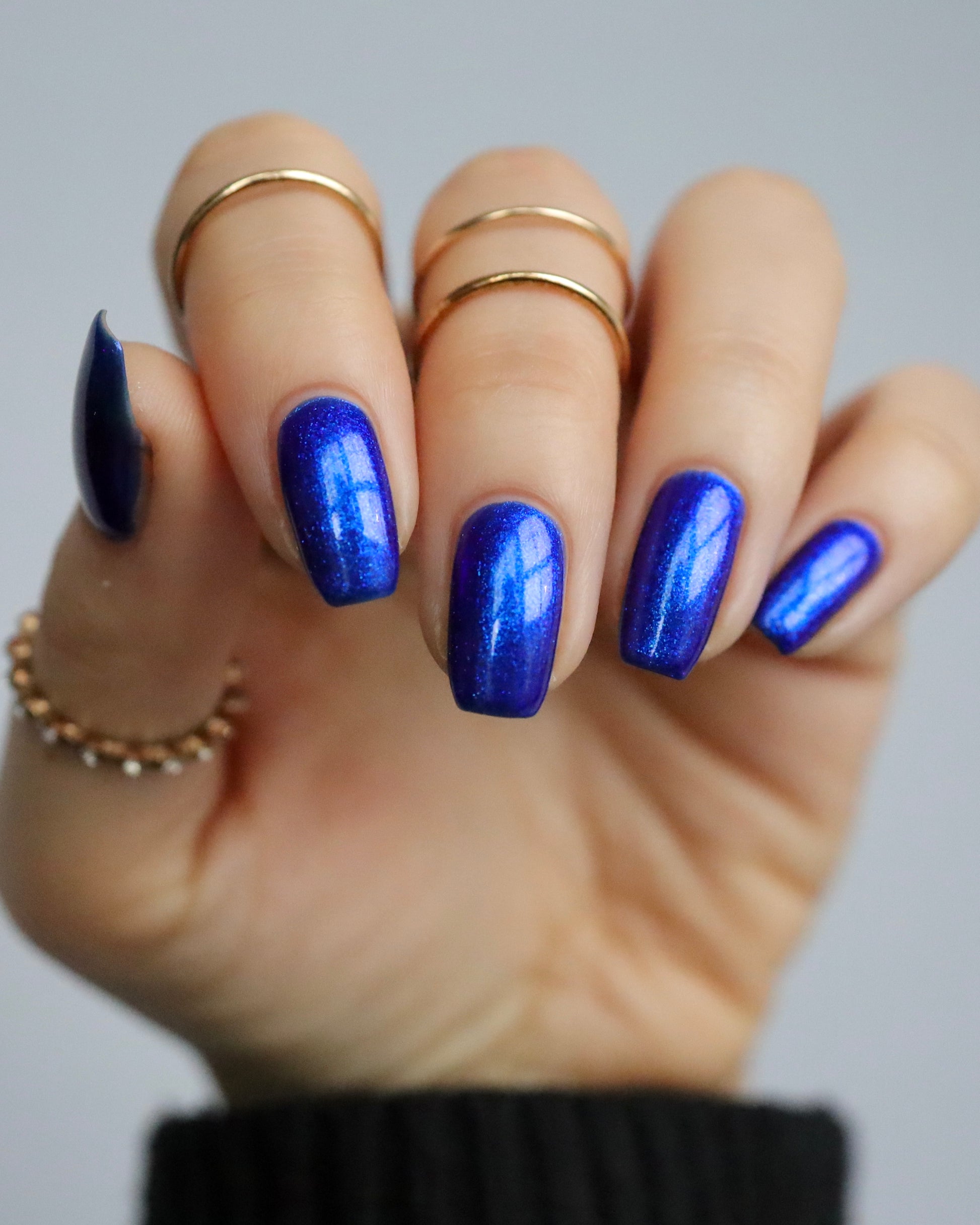 A saturated blue base with large particle blue to purple aurora shimmer that shifts subtly to red at extremes