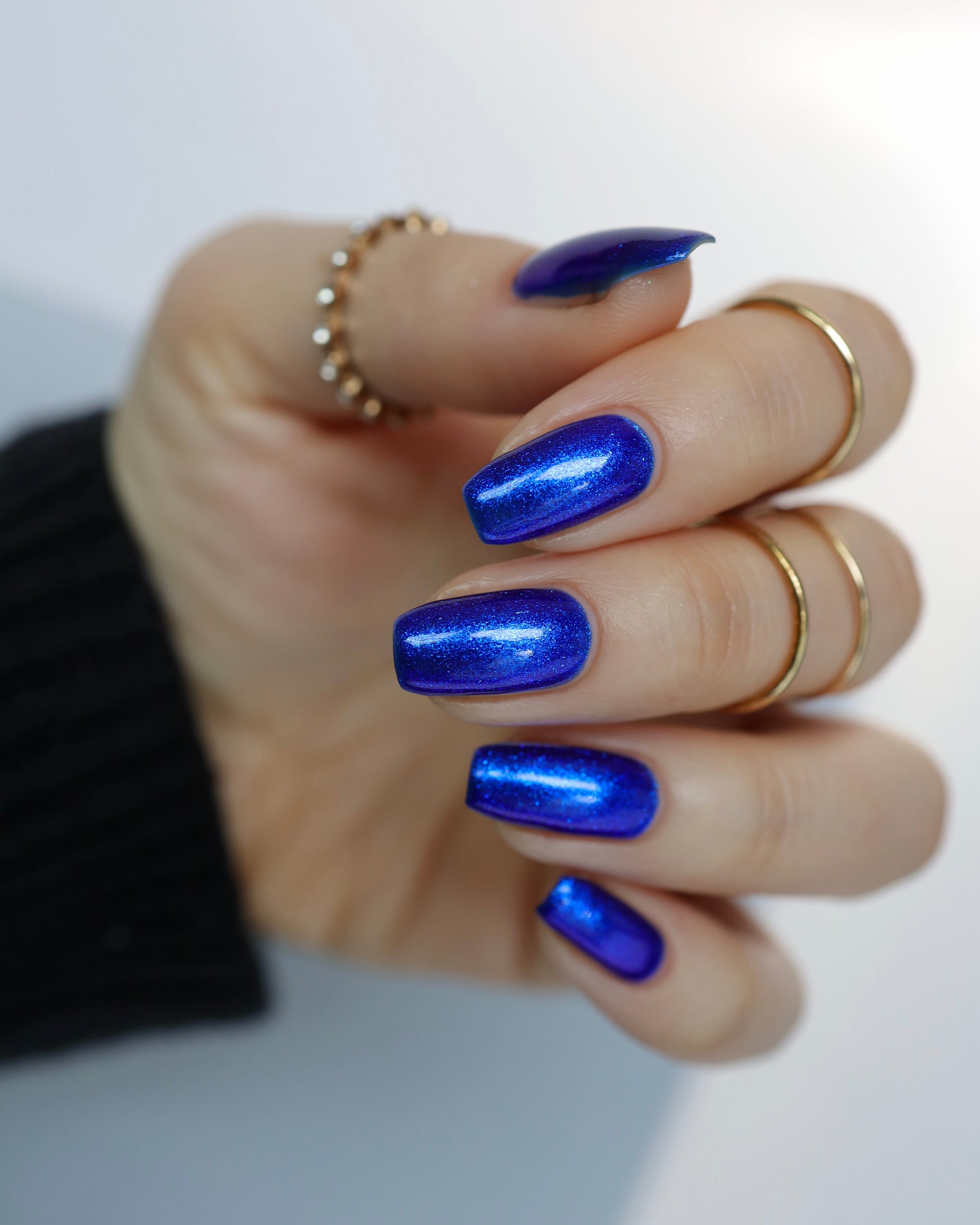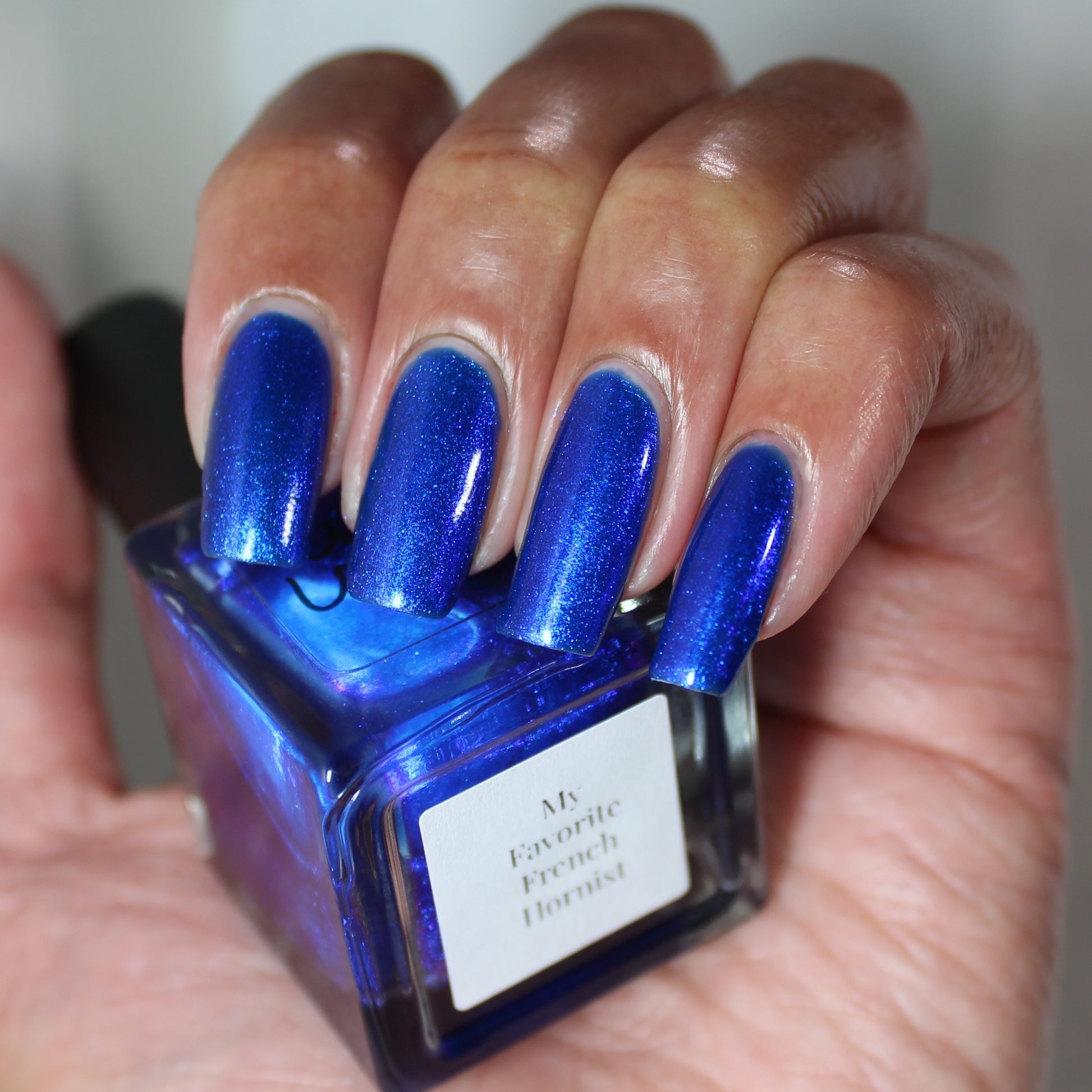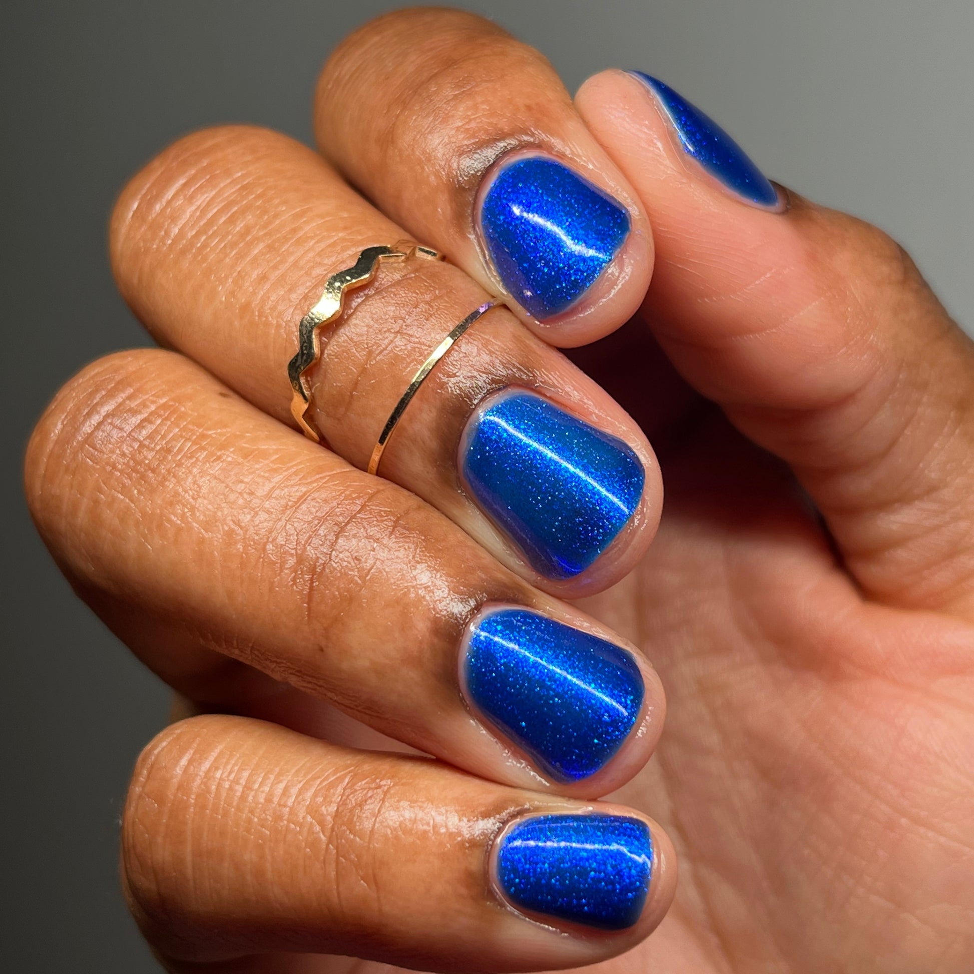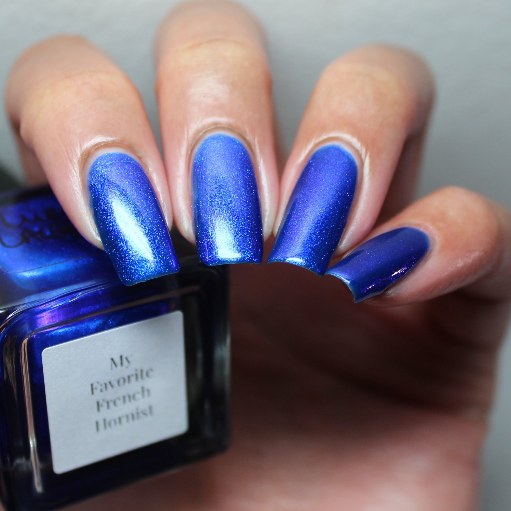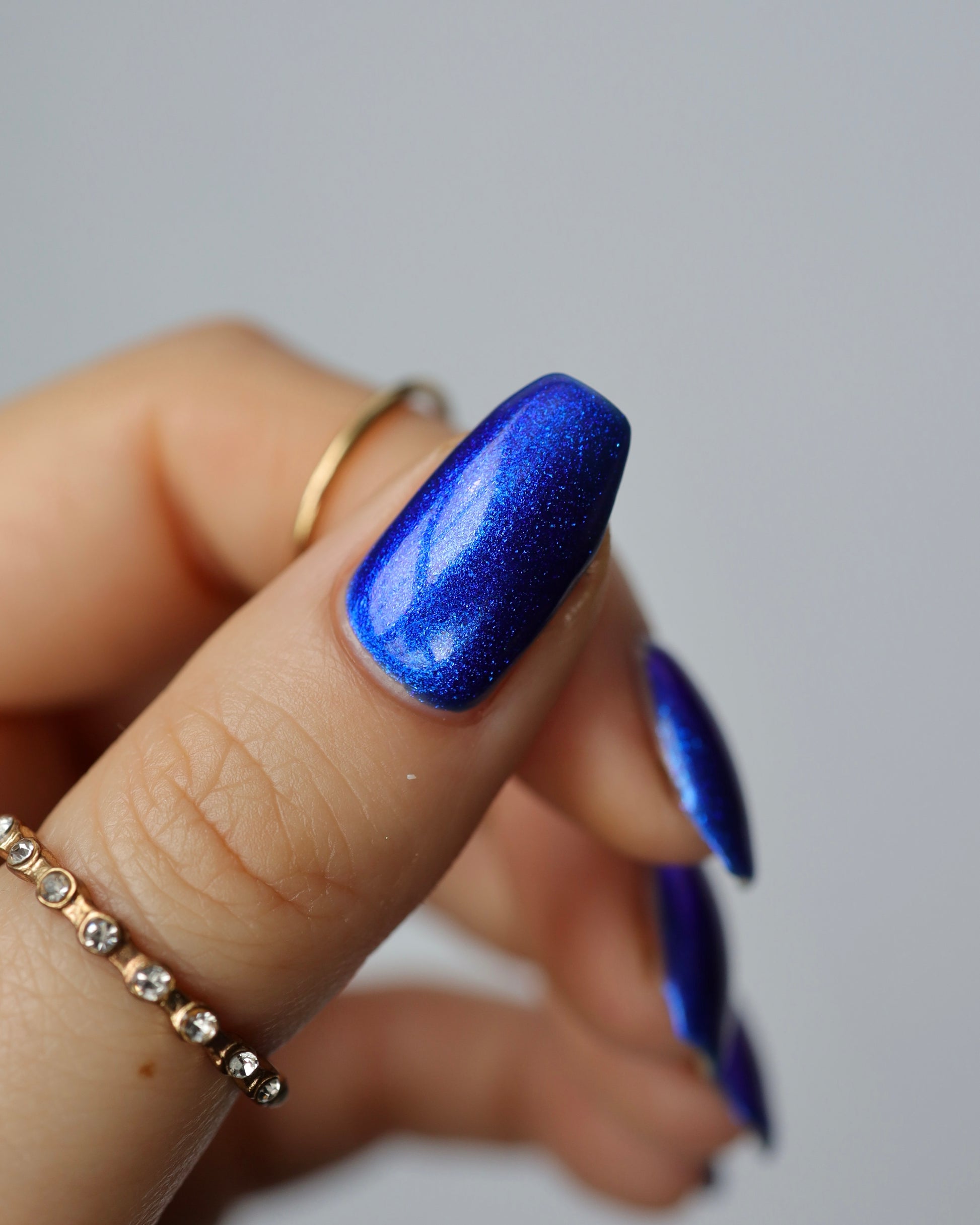 A saturated blue base with large particle blue to purple aurora shimmer that shifts subtly to red at extremes