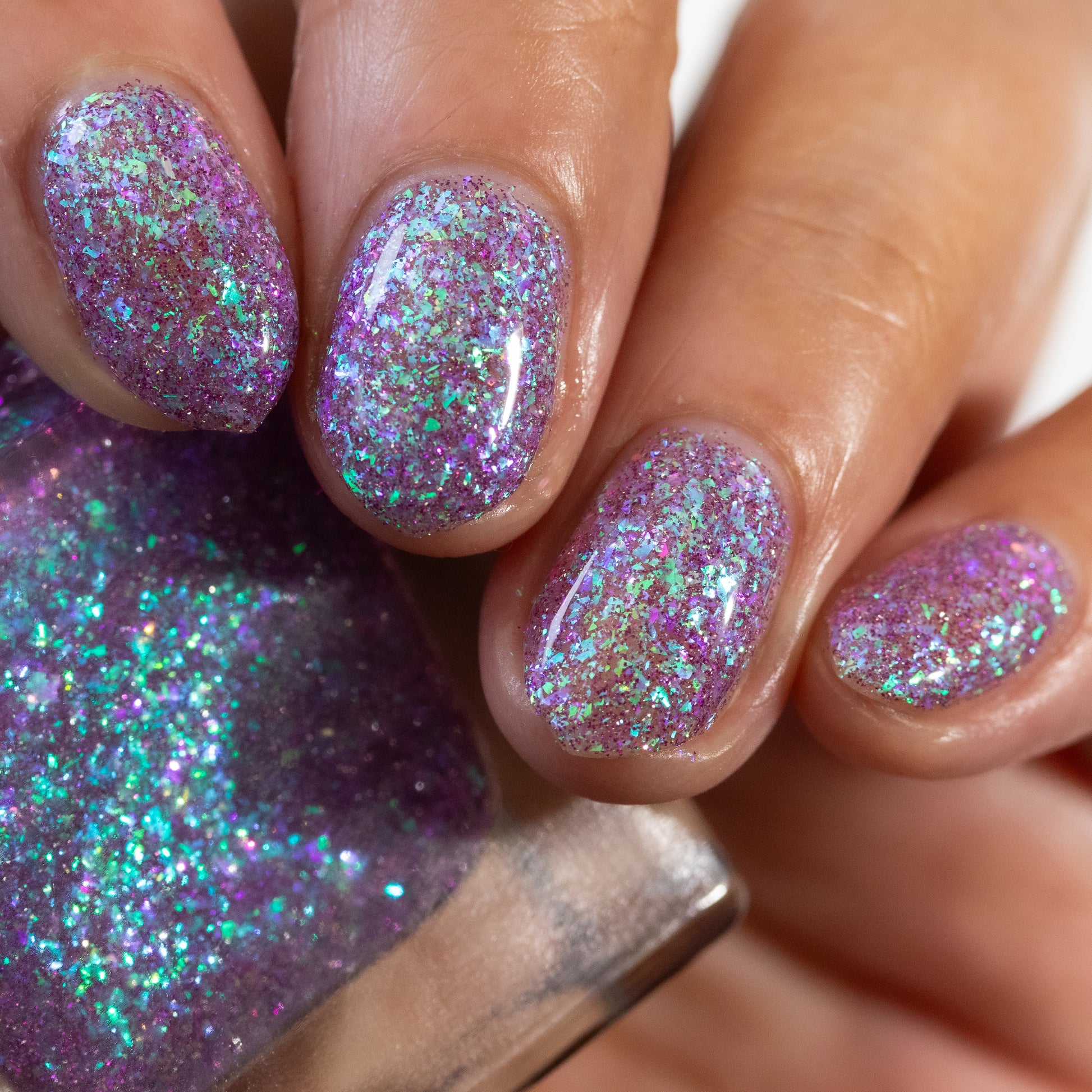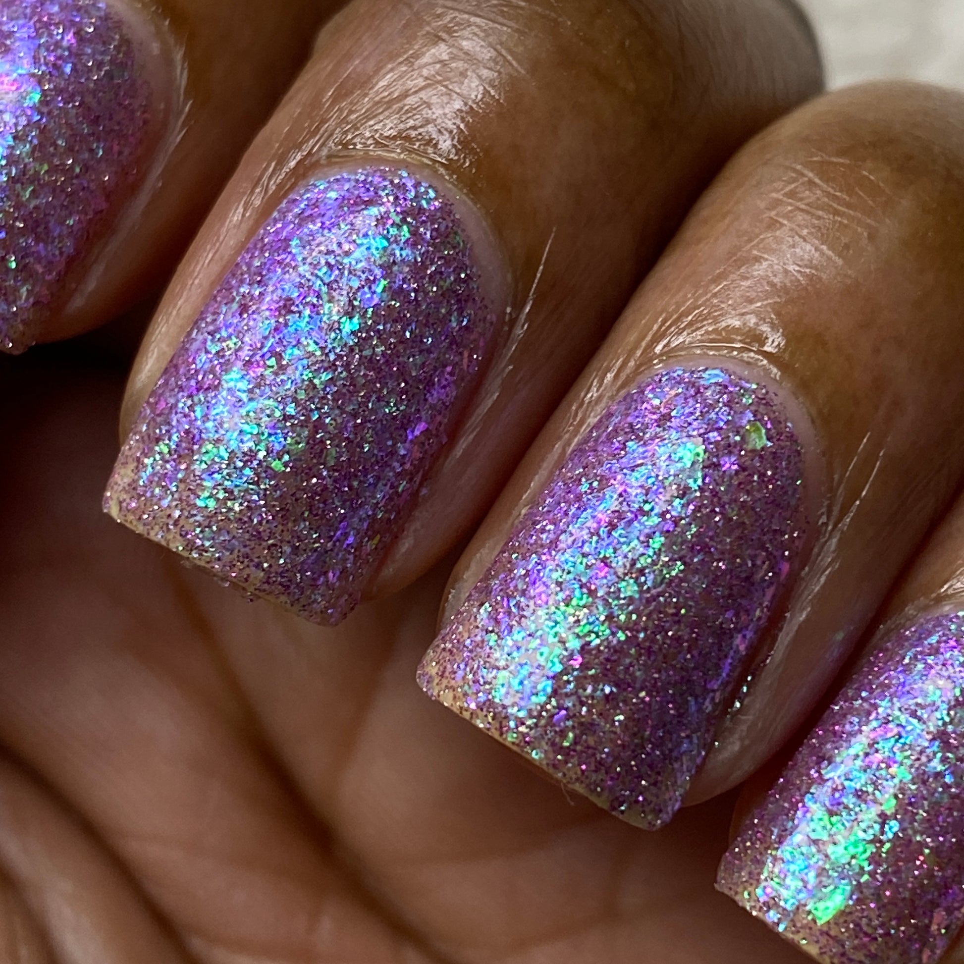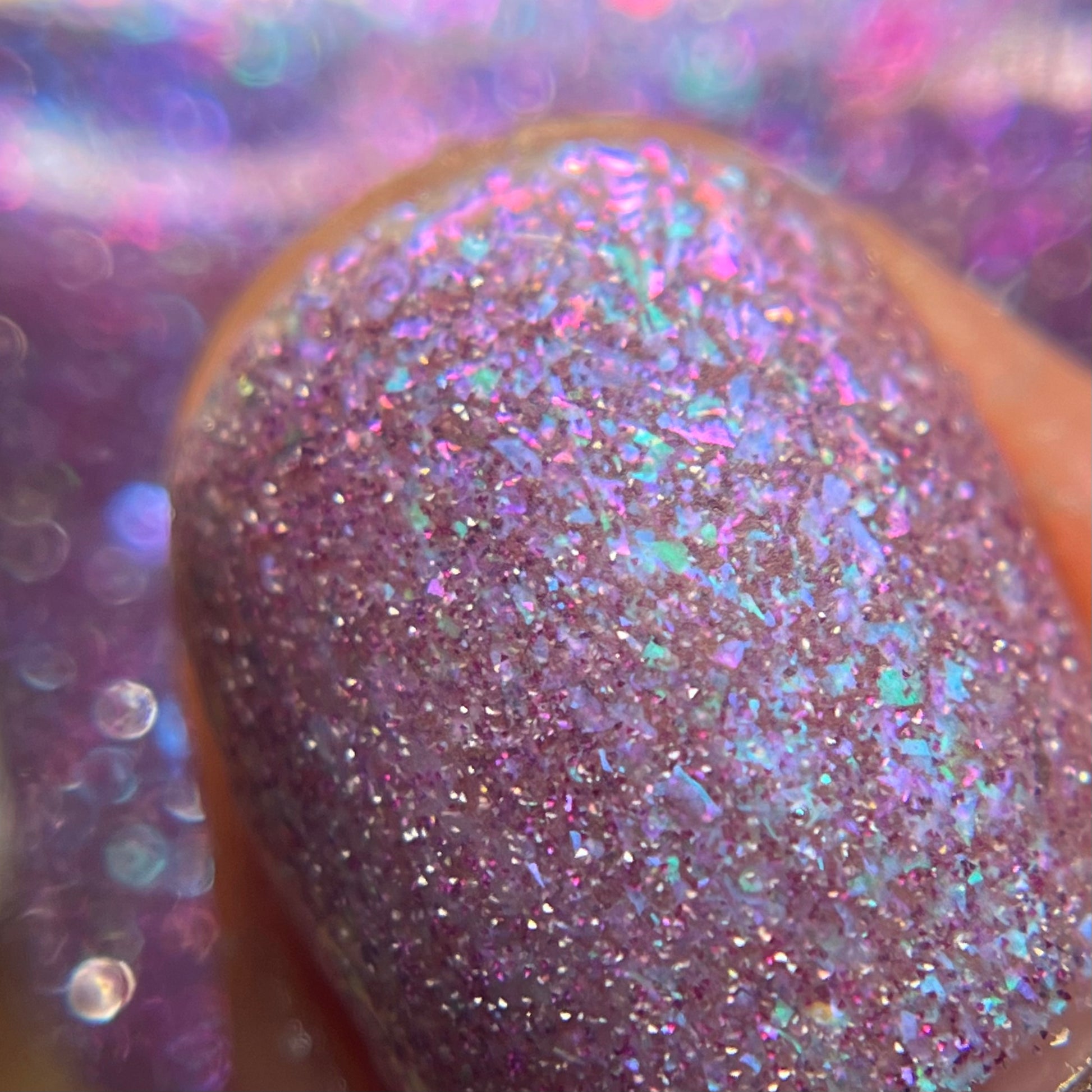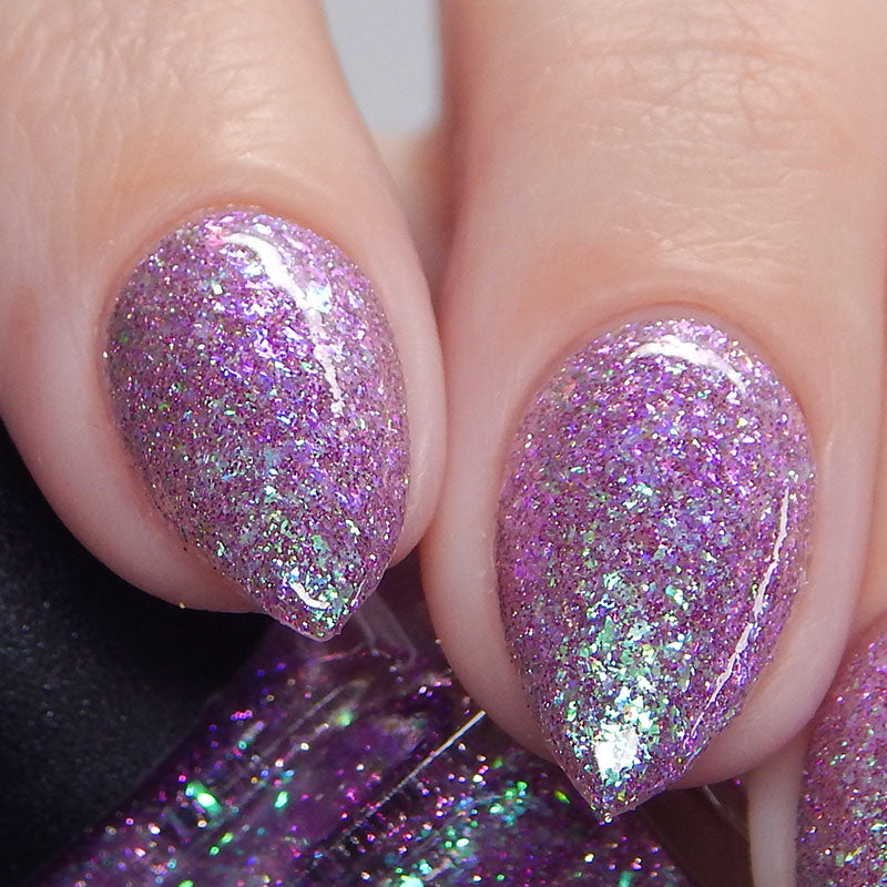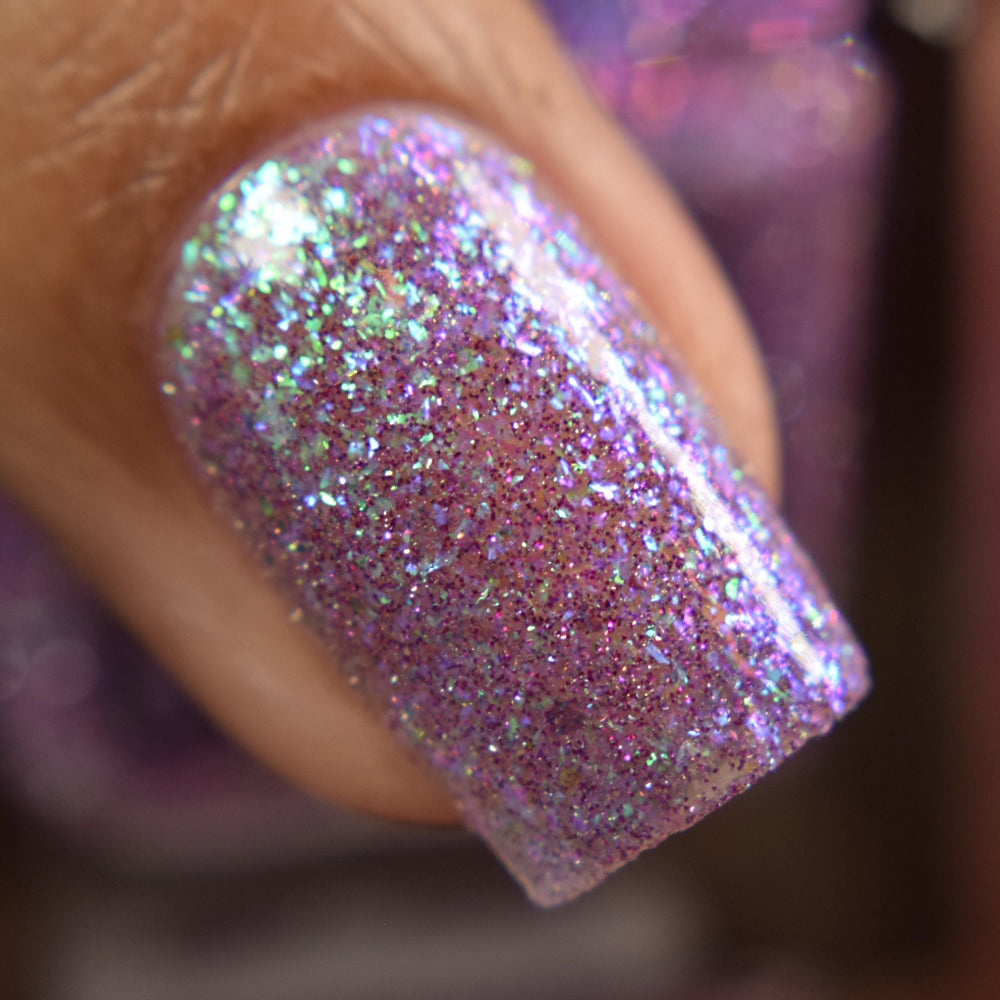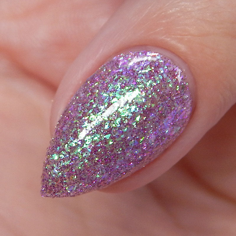 A clear base packed with green to purple iridescent flakies and purple reflective glitter