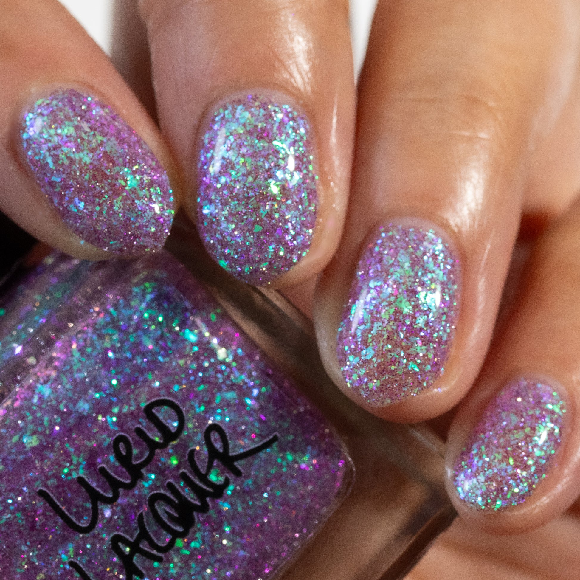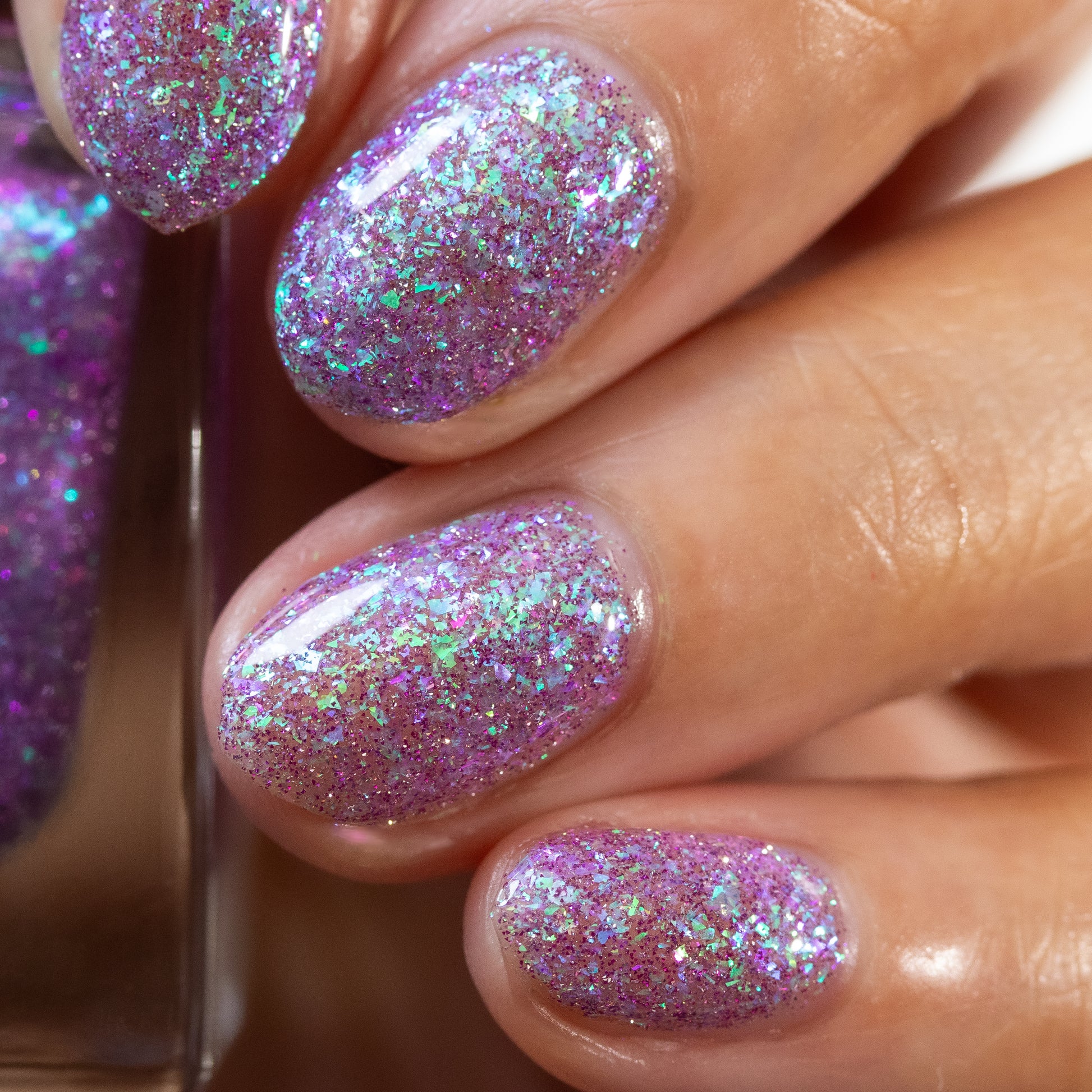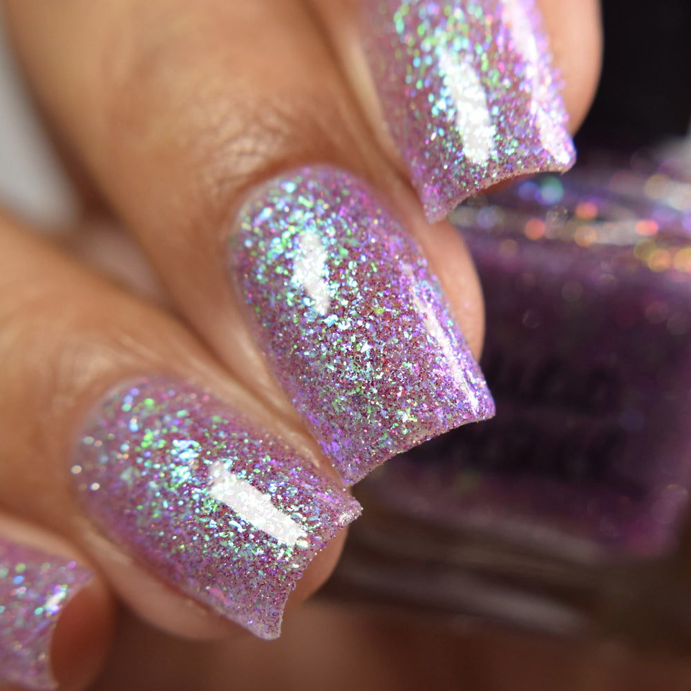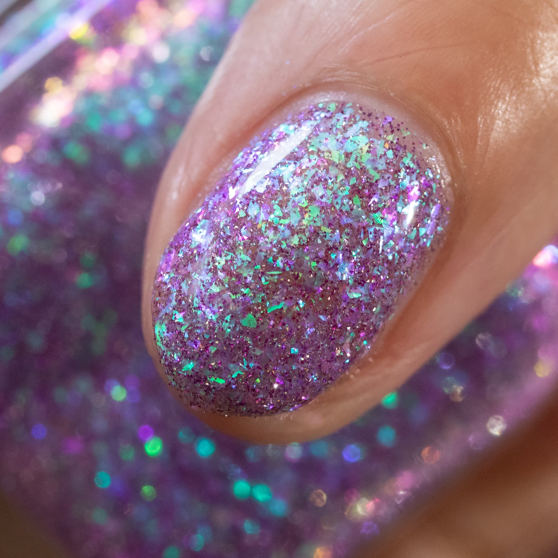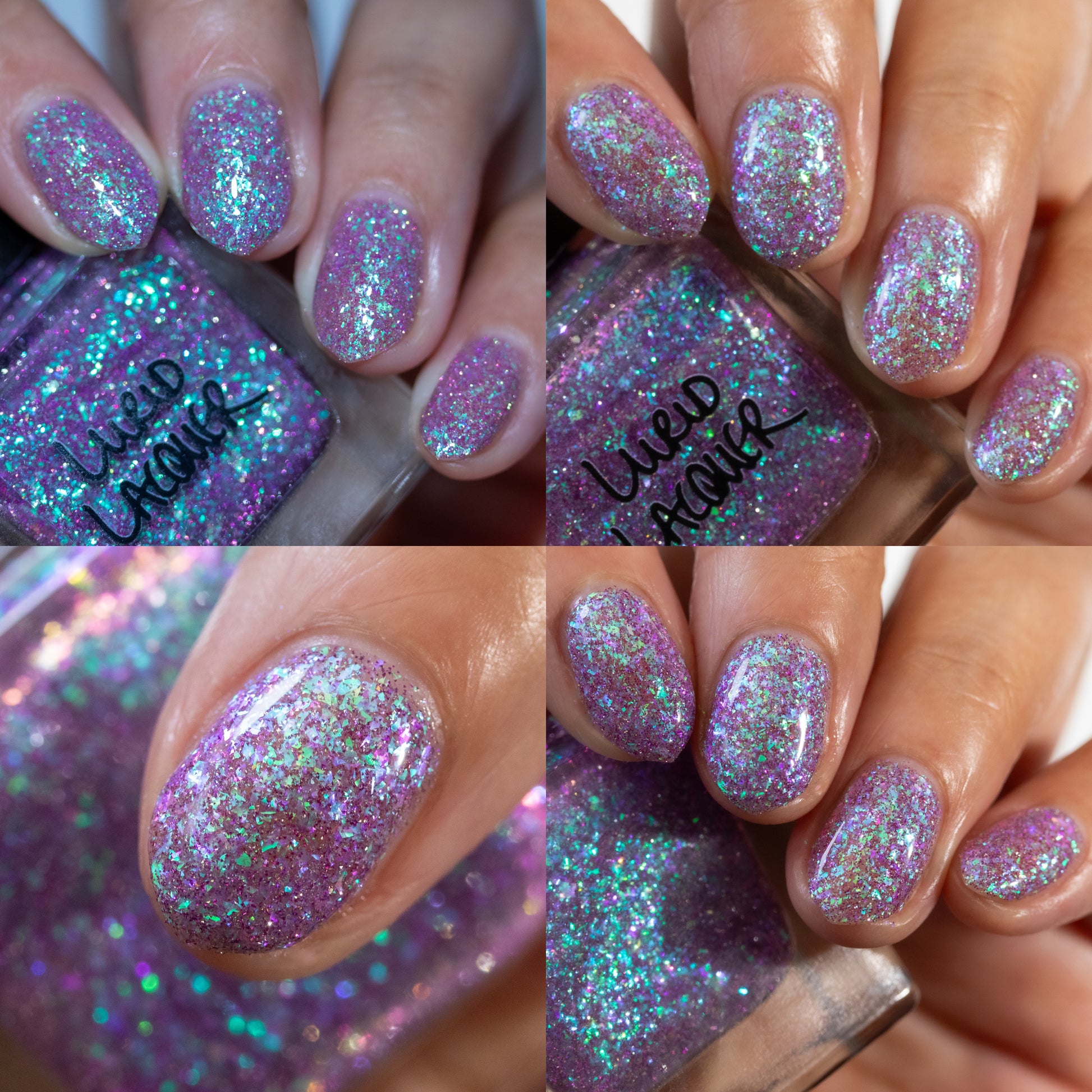 A clear base packed with green to purple iridescent flakies and purple reflective glitter