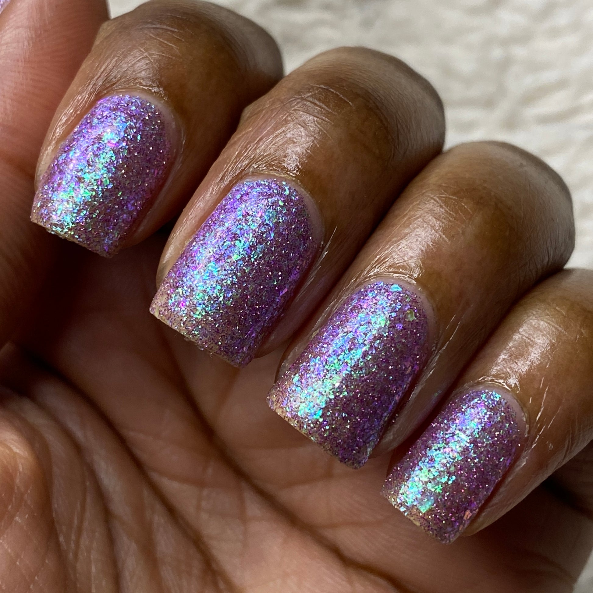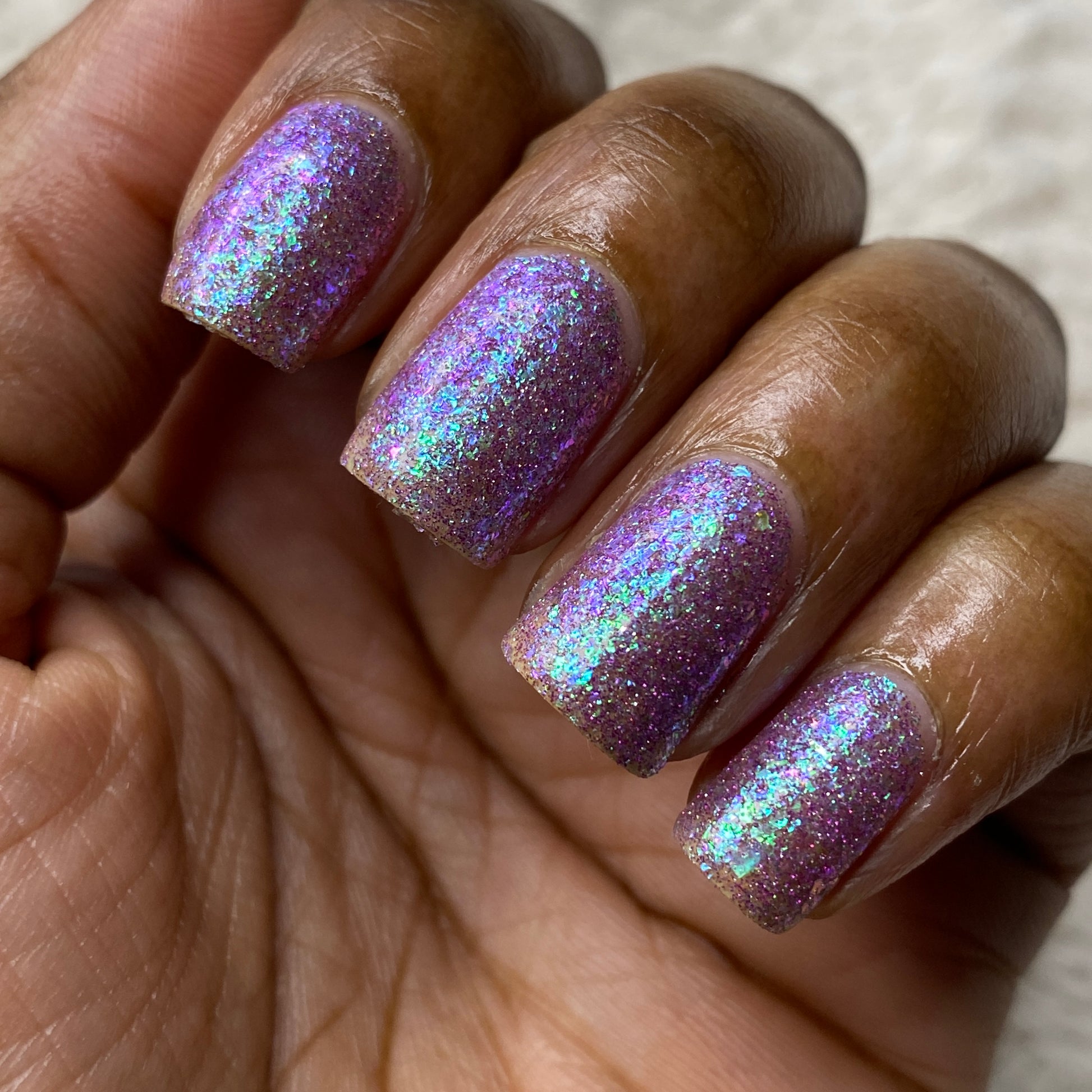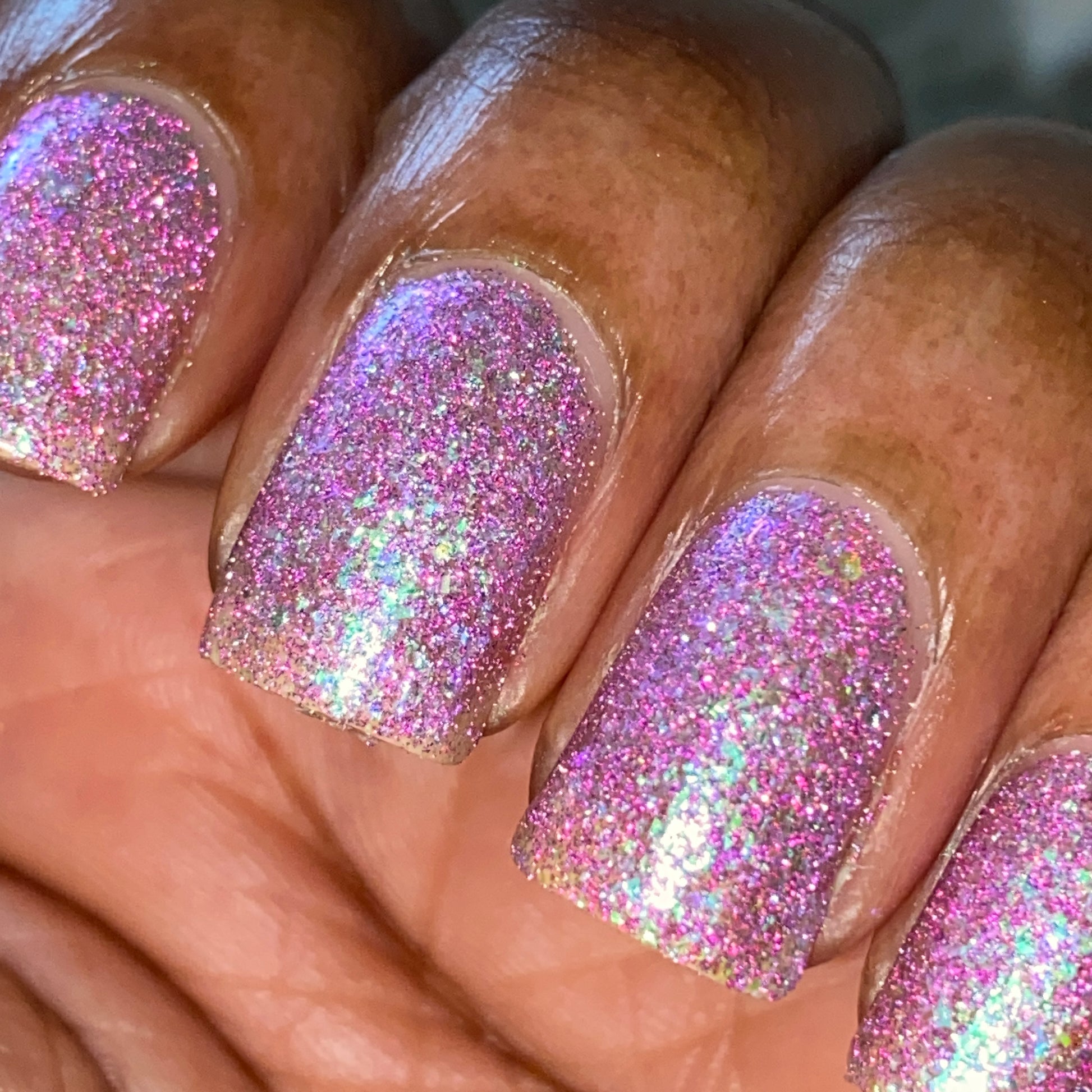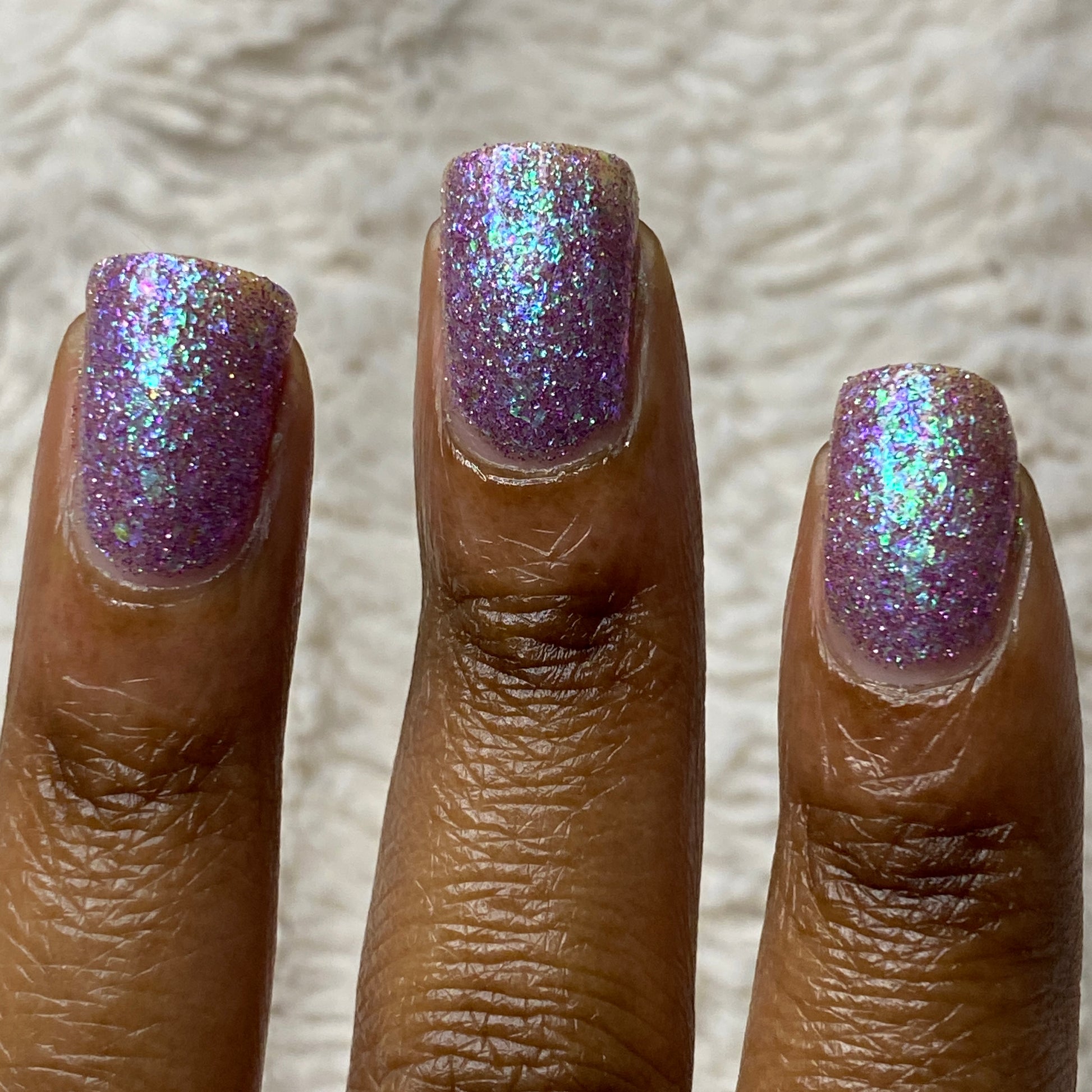 Please note: Reflective glitter polishes are textured and dry down with a gritty, sandpaper feeling. To make them look smooth and glossy, I recommend applying 2-3 coats of the polish, then applying one coat of a glitter smoother, followed by one coat of top coat.