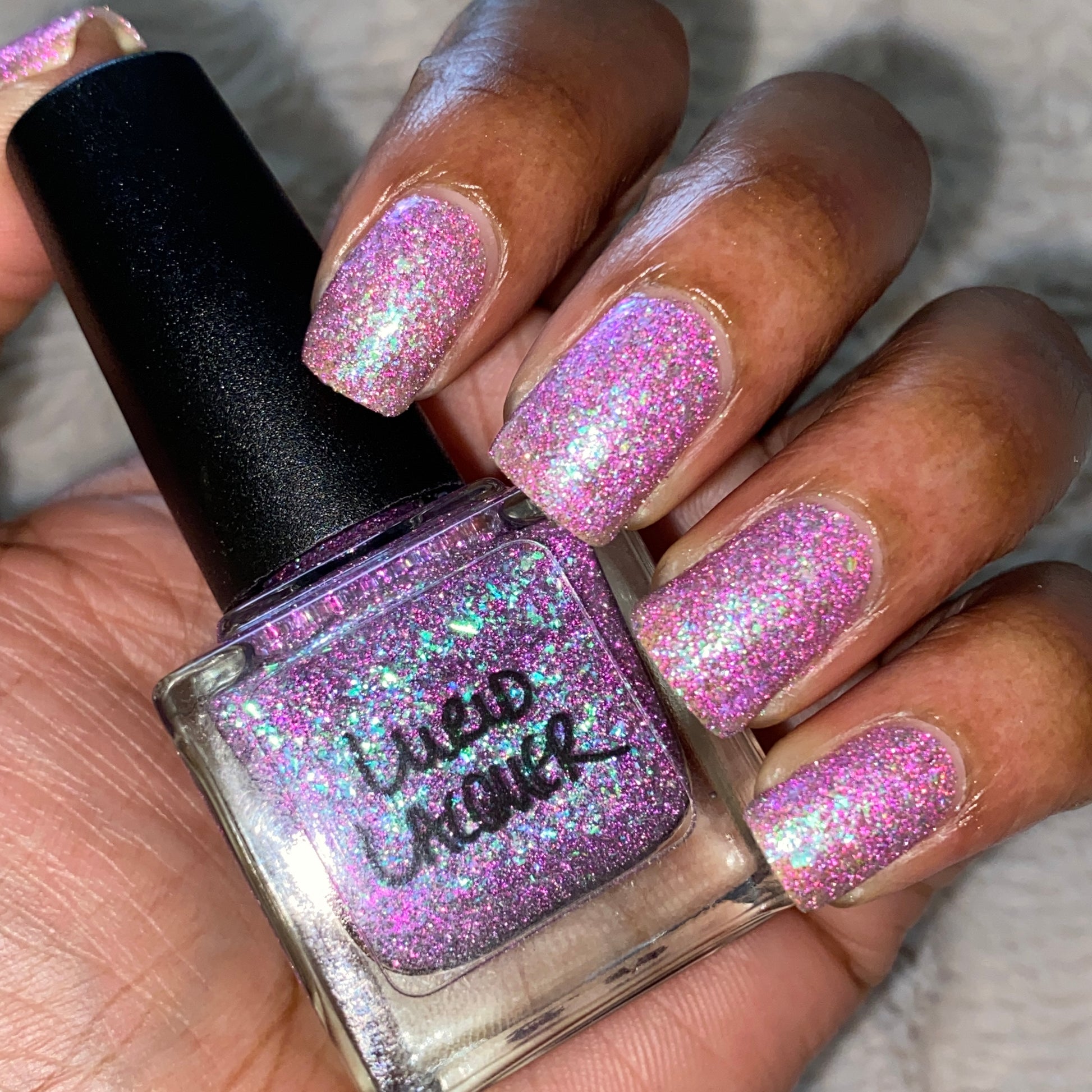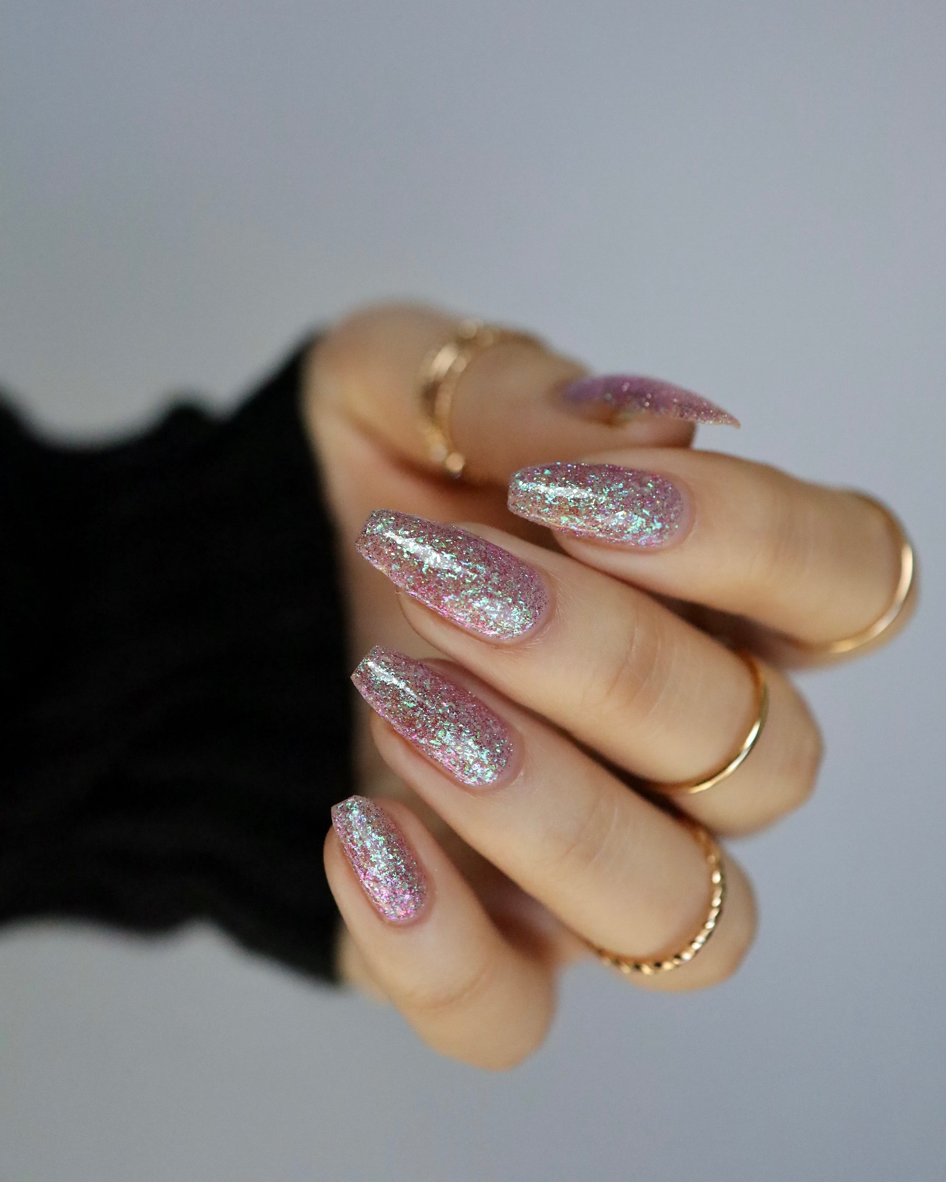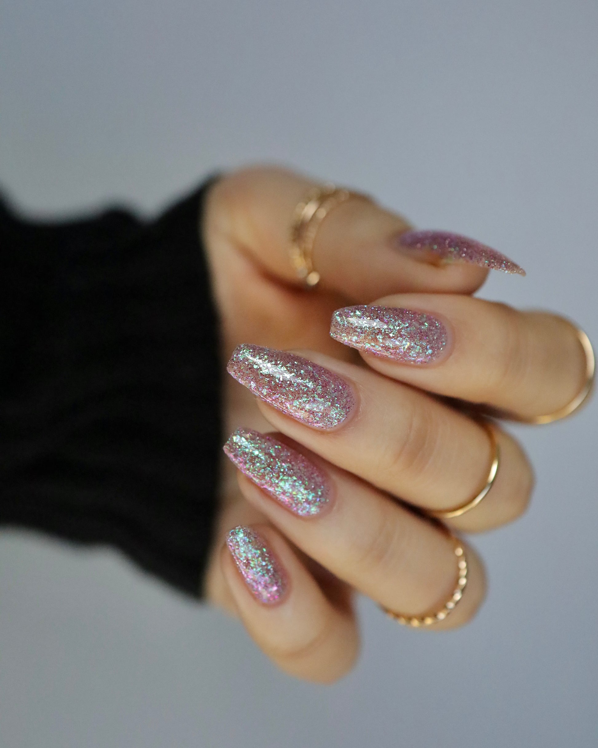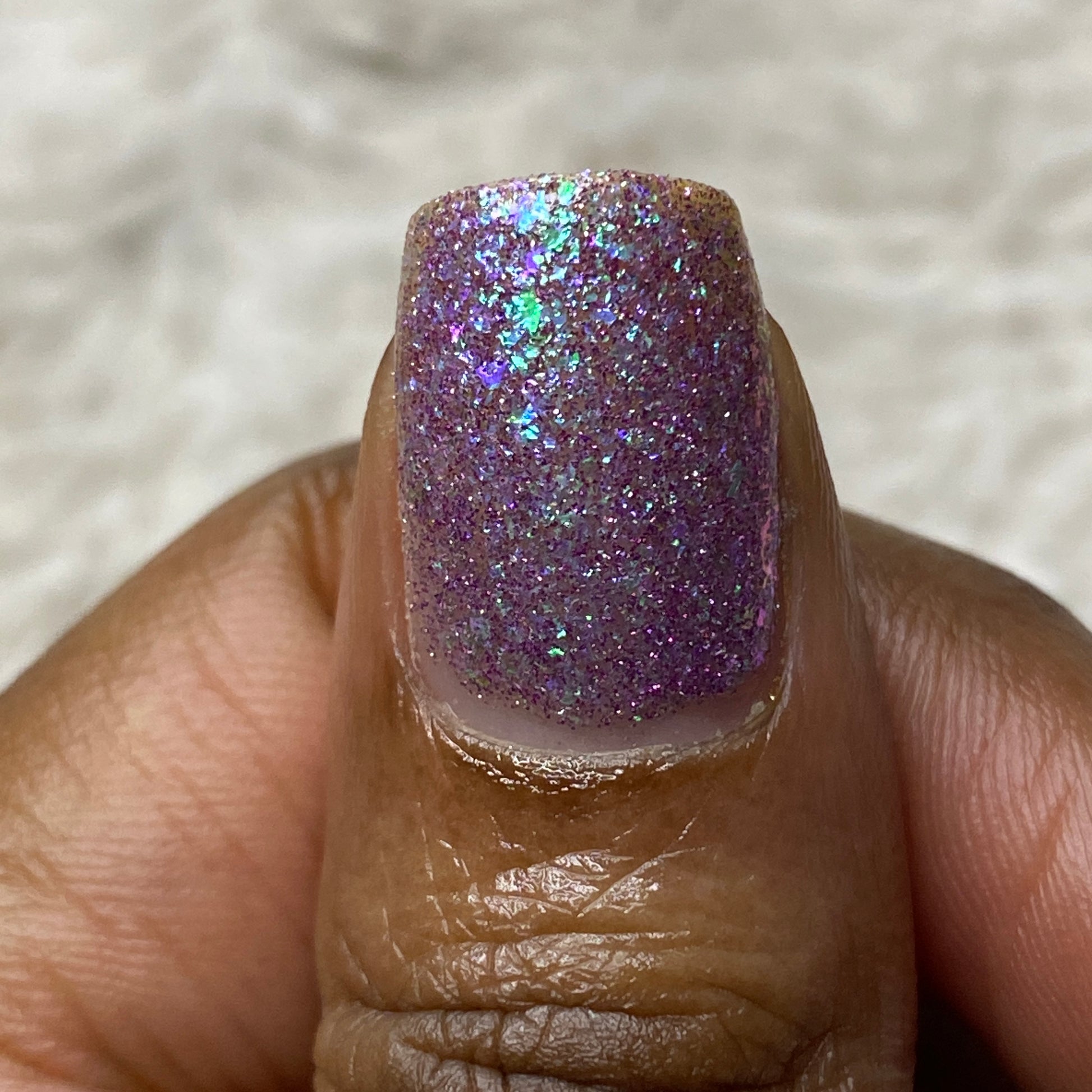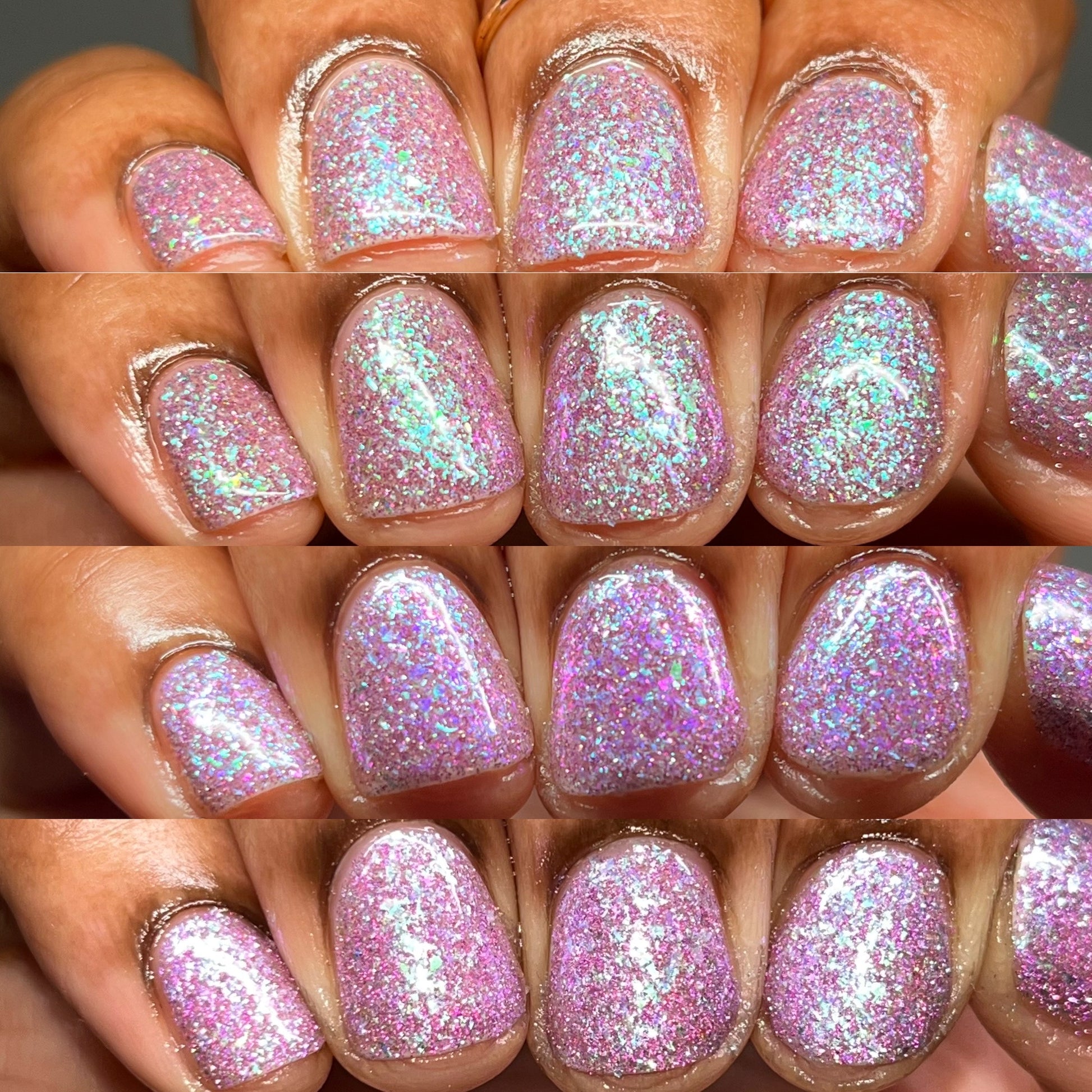 Please note: Reflective glitter polishes are textured and dry down with a gritty, sandpaper feeling. To make them look smooth and glossy, I recommend applying 2-3 coats of the polish, then applying one coat of a glitter smoother, followed by one coat of top coat.