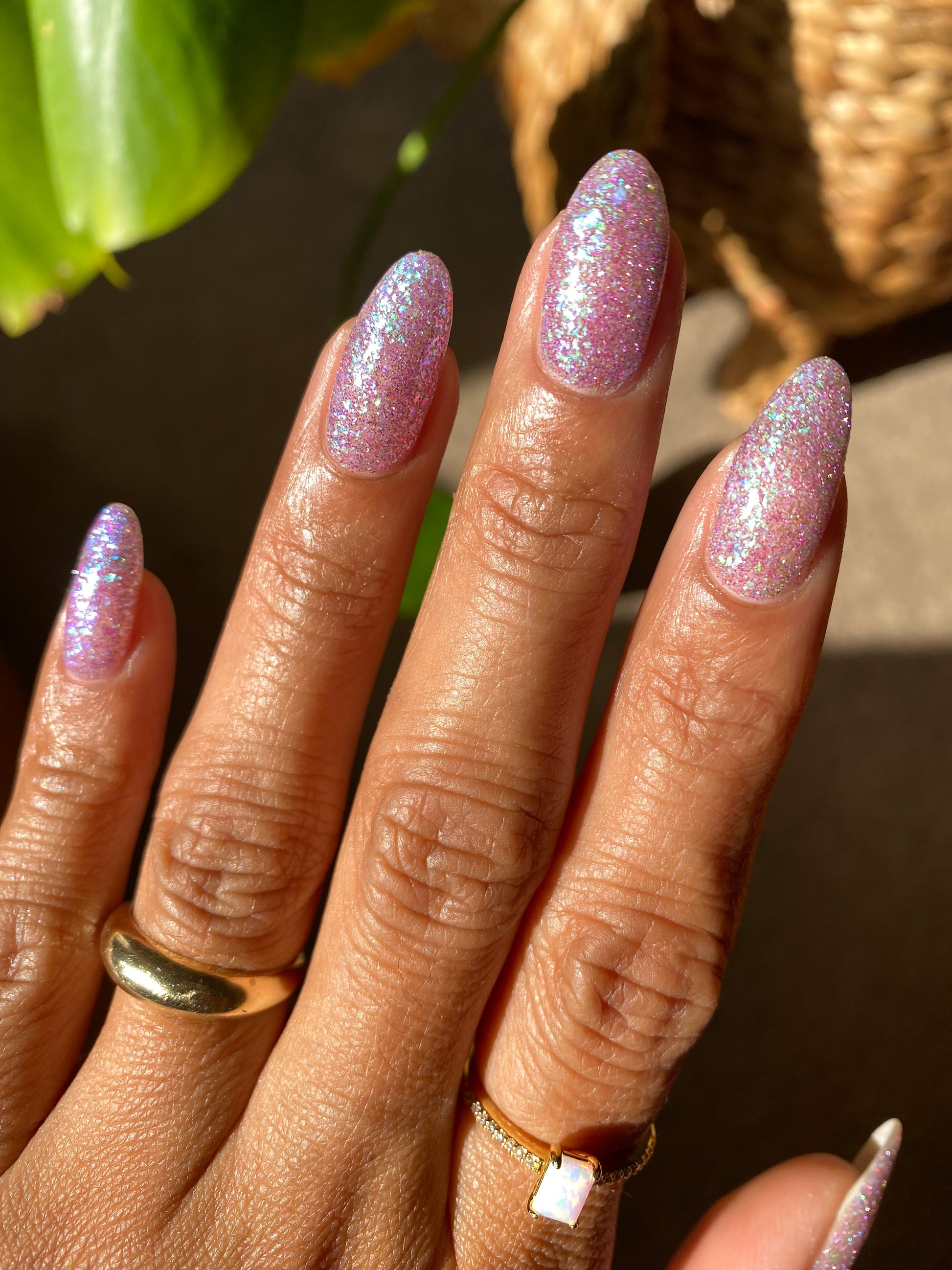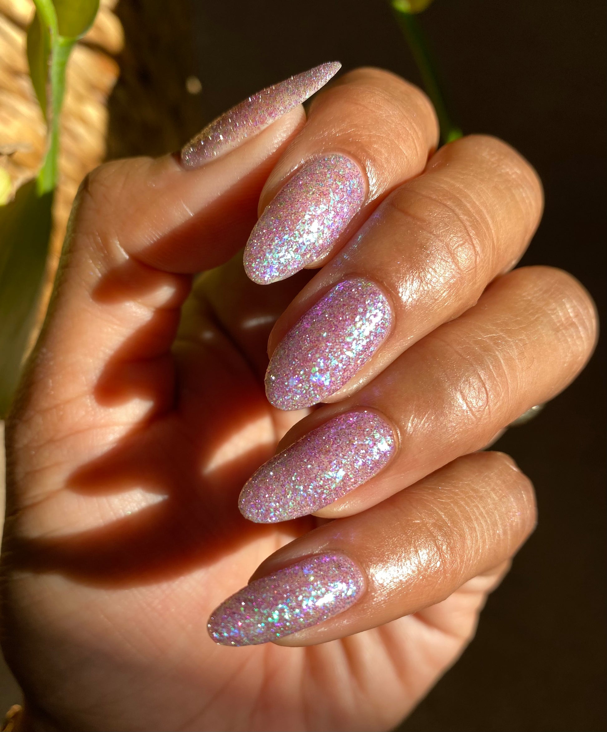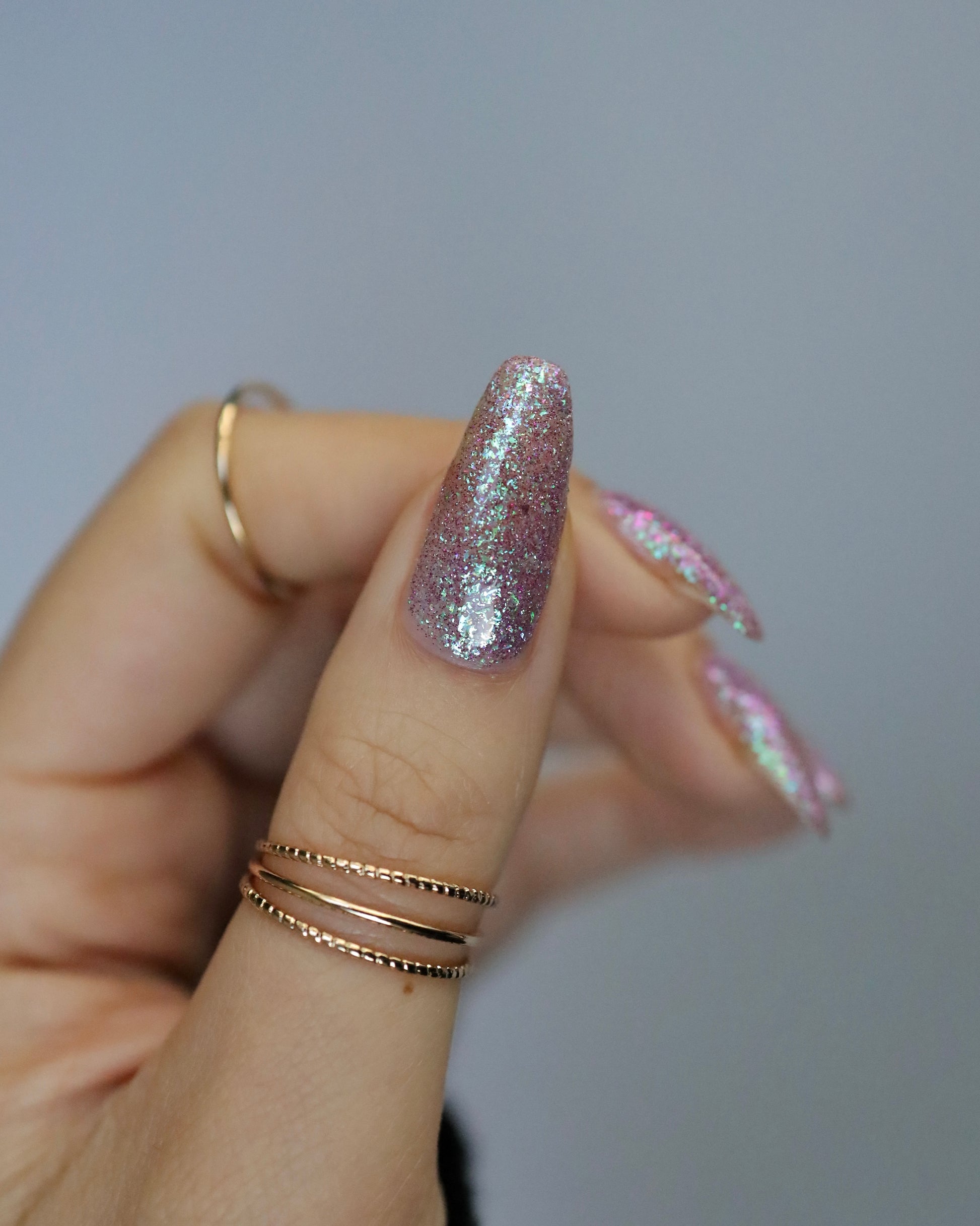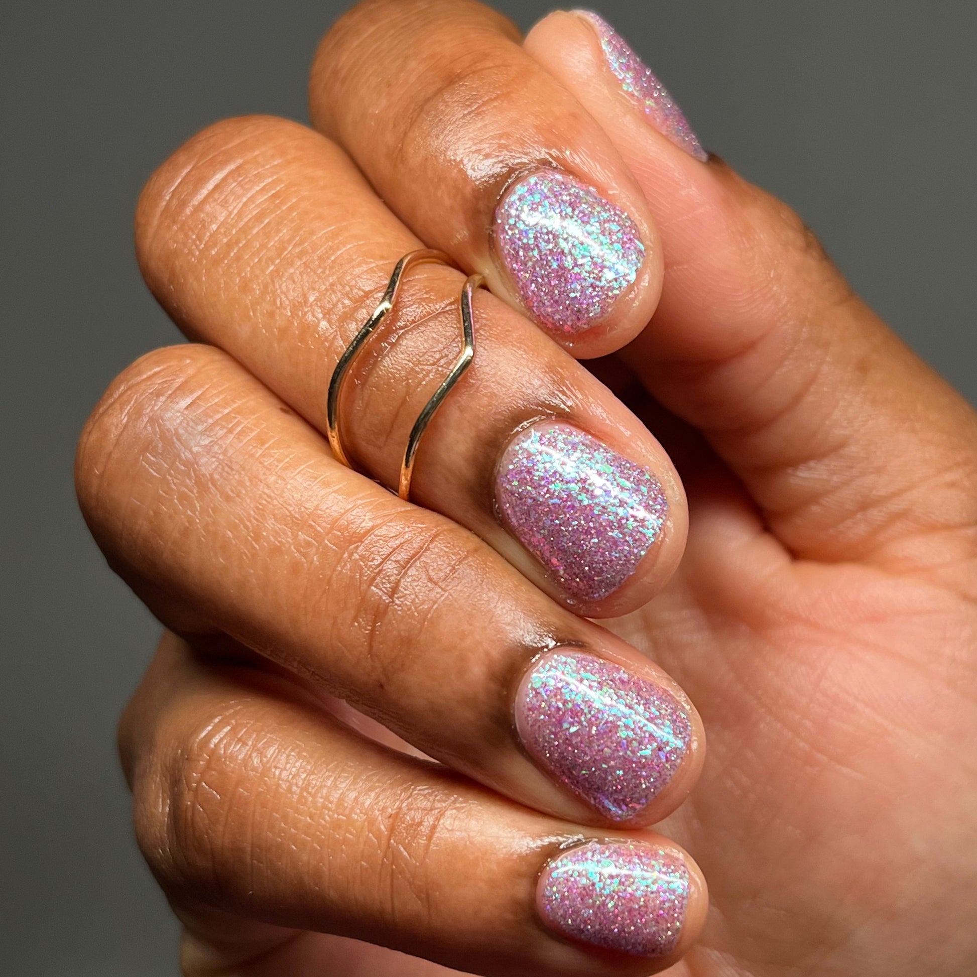 Please note: Reflective glitter polishes are textured and dry down with a gritty, sandpaper feeling. To make them look smooth and glossy, I recommend applying 2-3 coats of the polish, then applying one coat of a glitter smoother, followed by one coat of top coat.