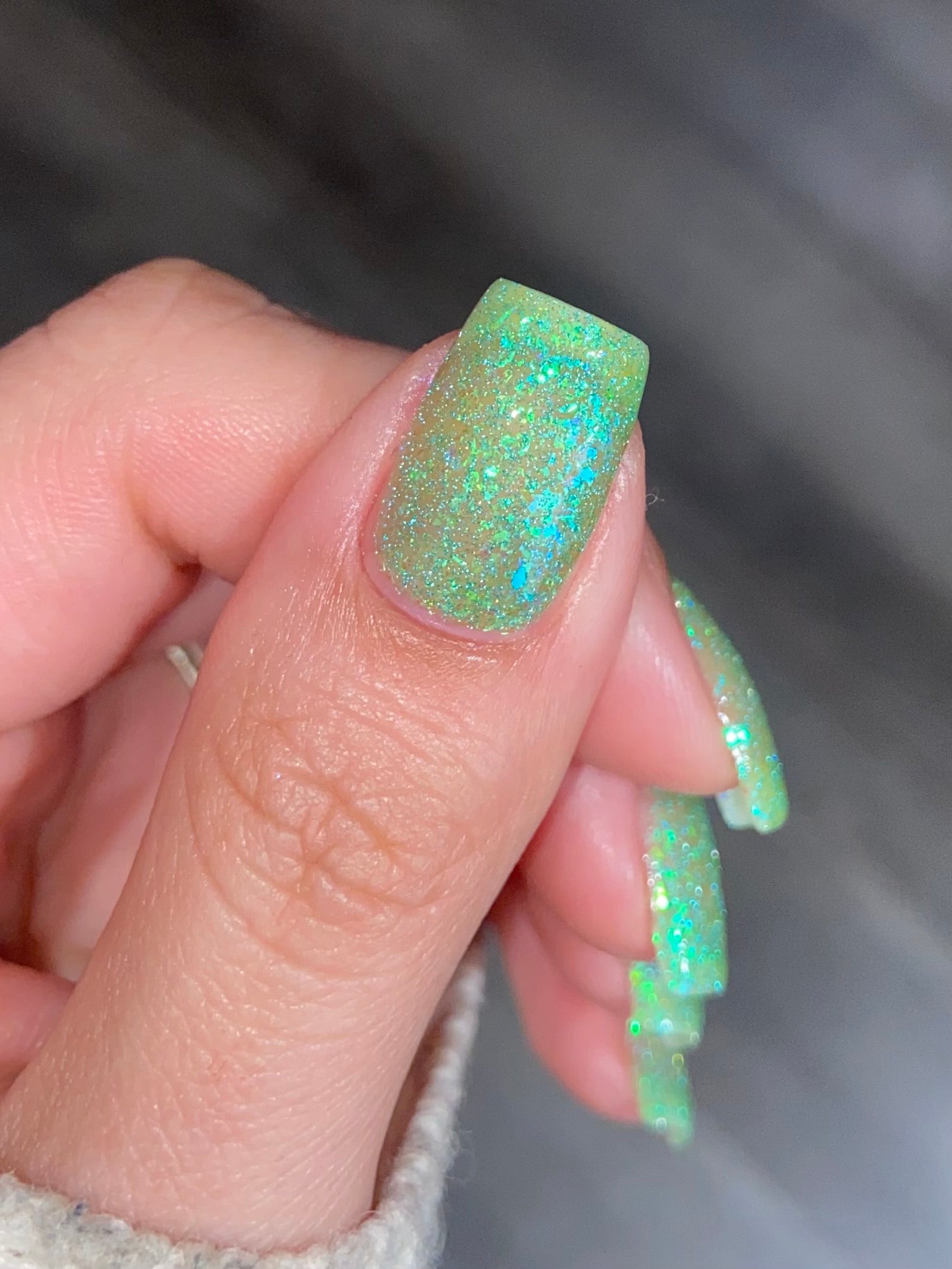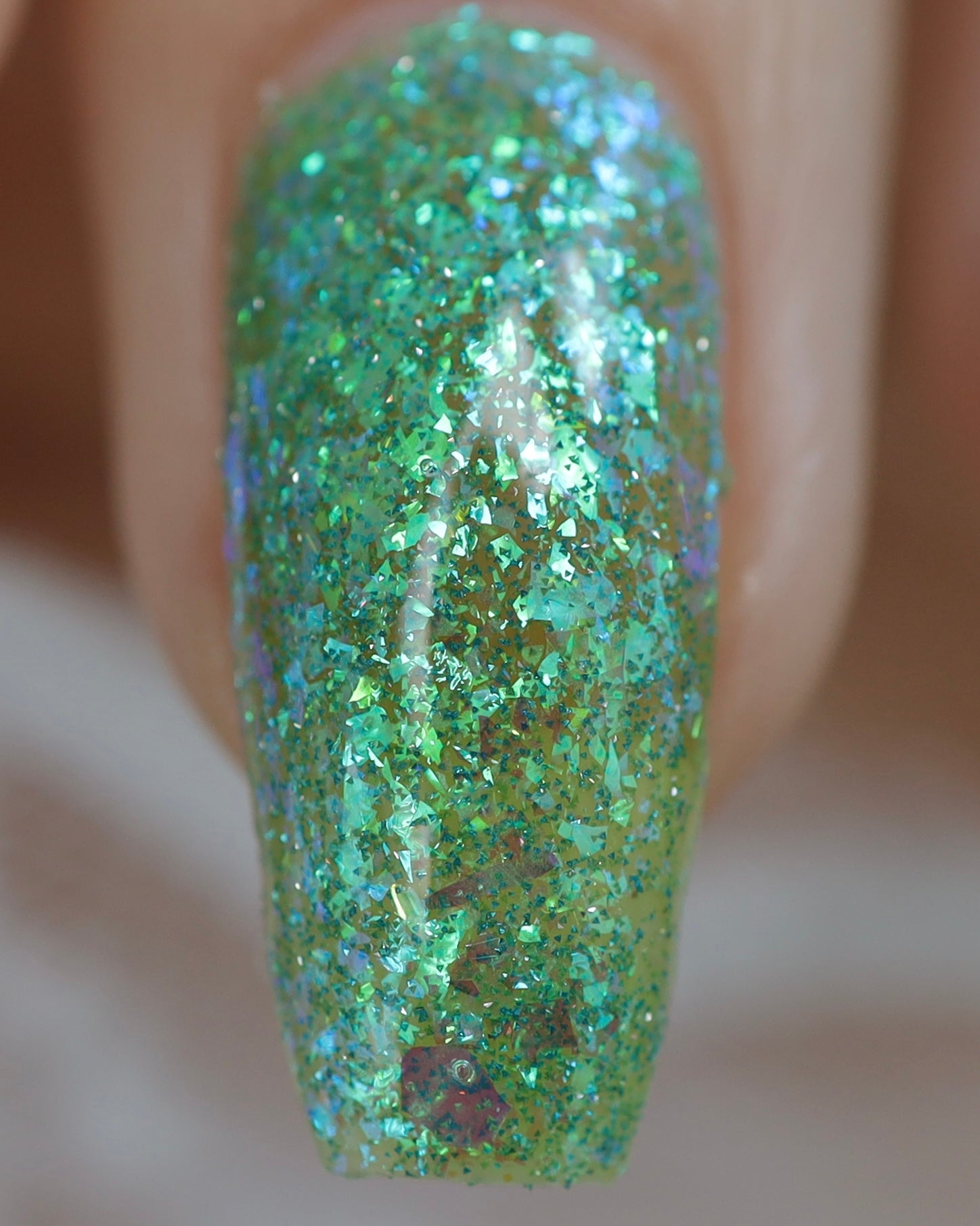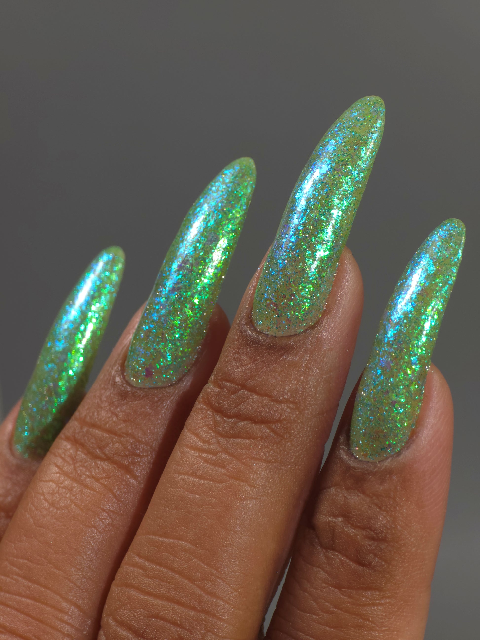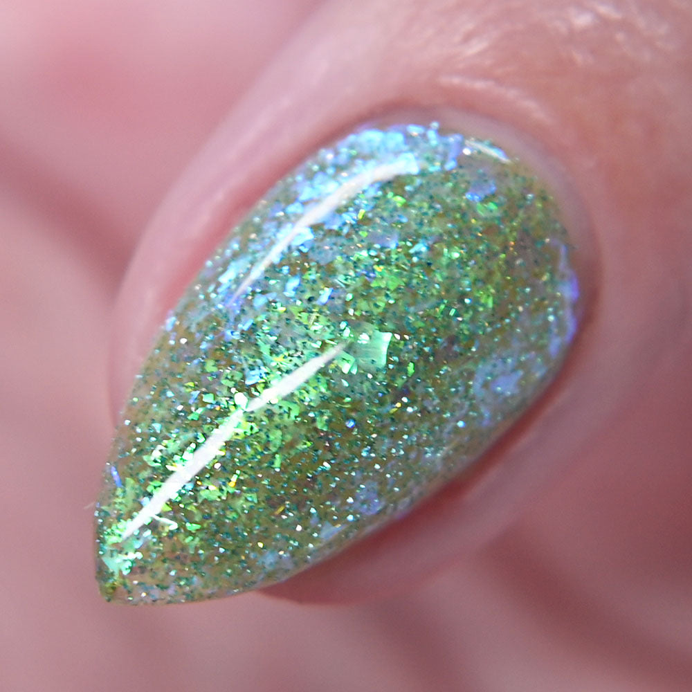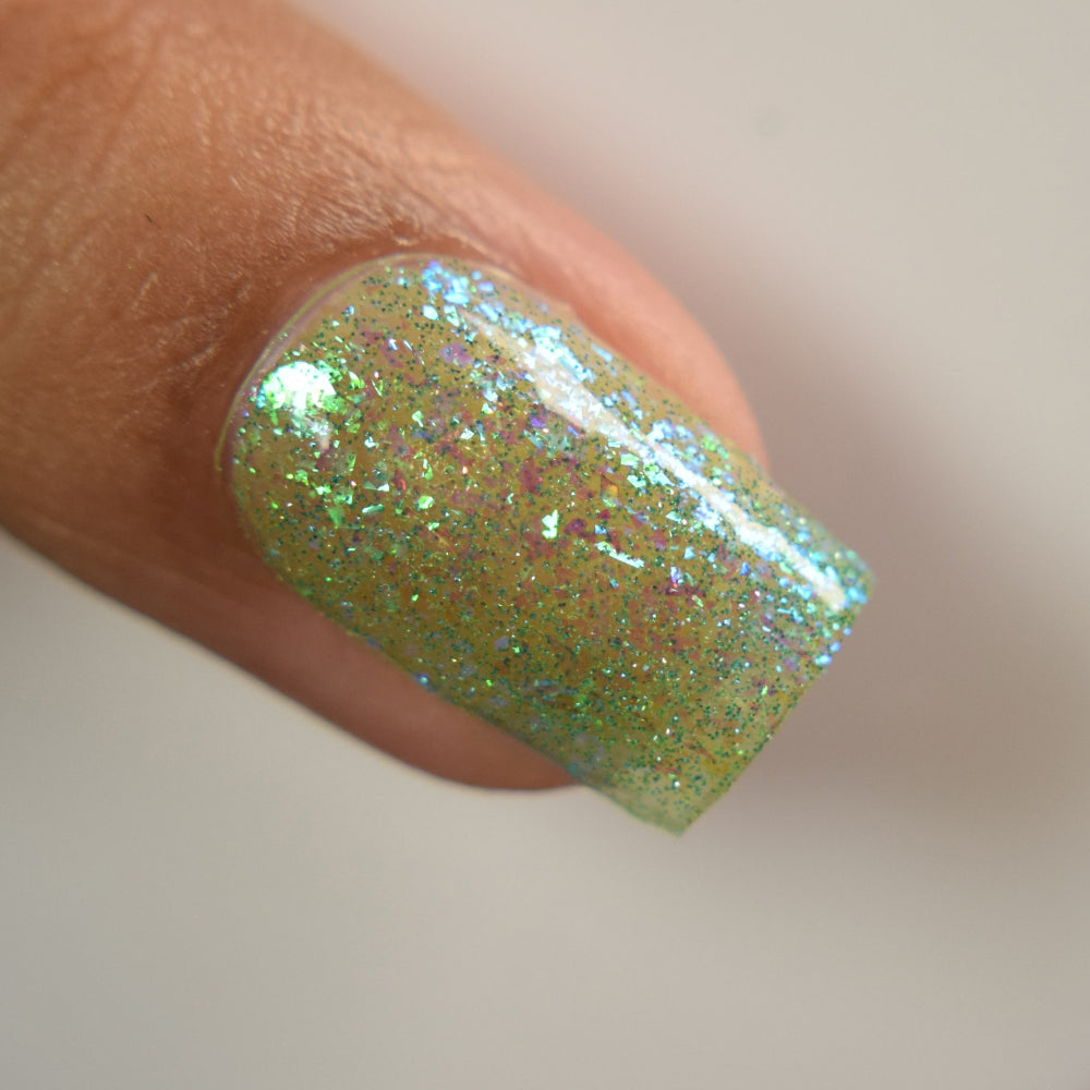 A semi-sheer yellow-leaning green base with light blue reflective glitter and iridescent flakies that shift from green to blue