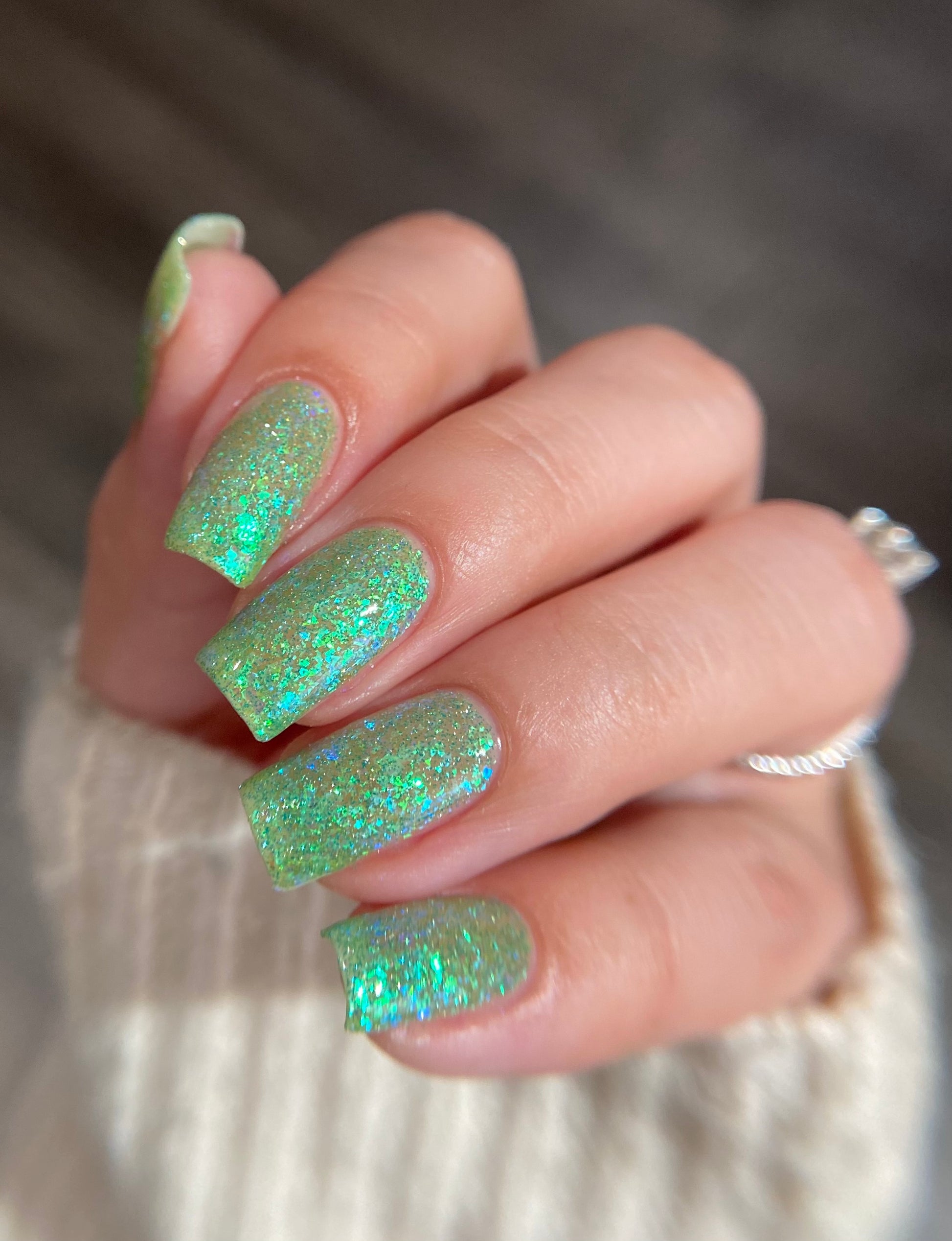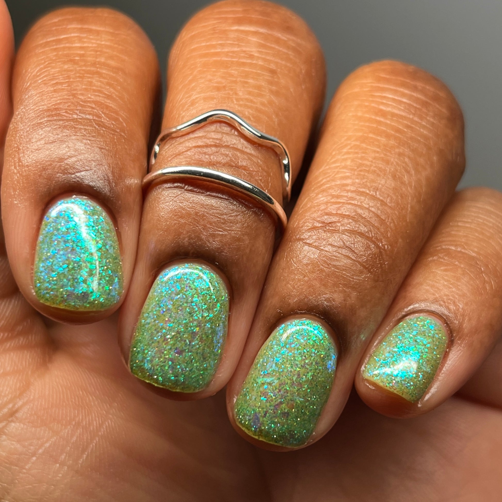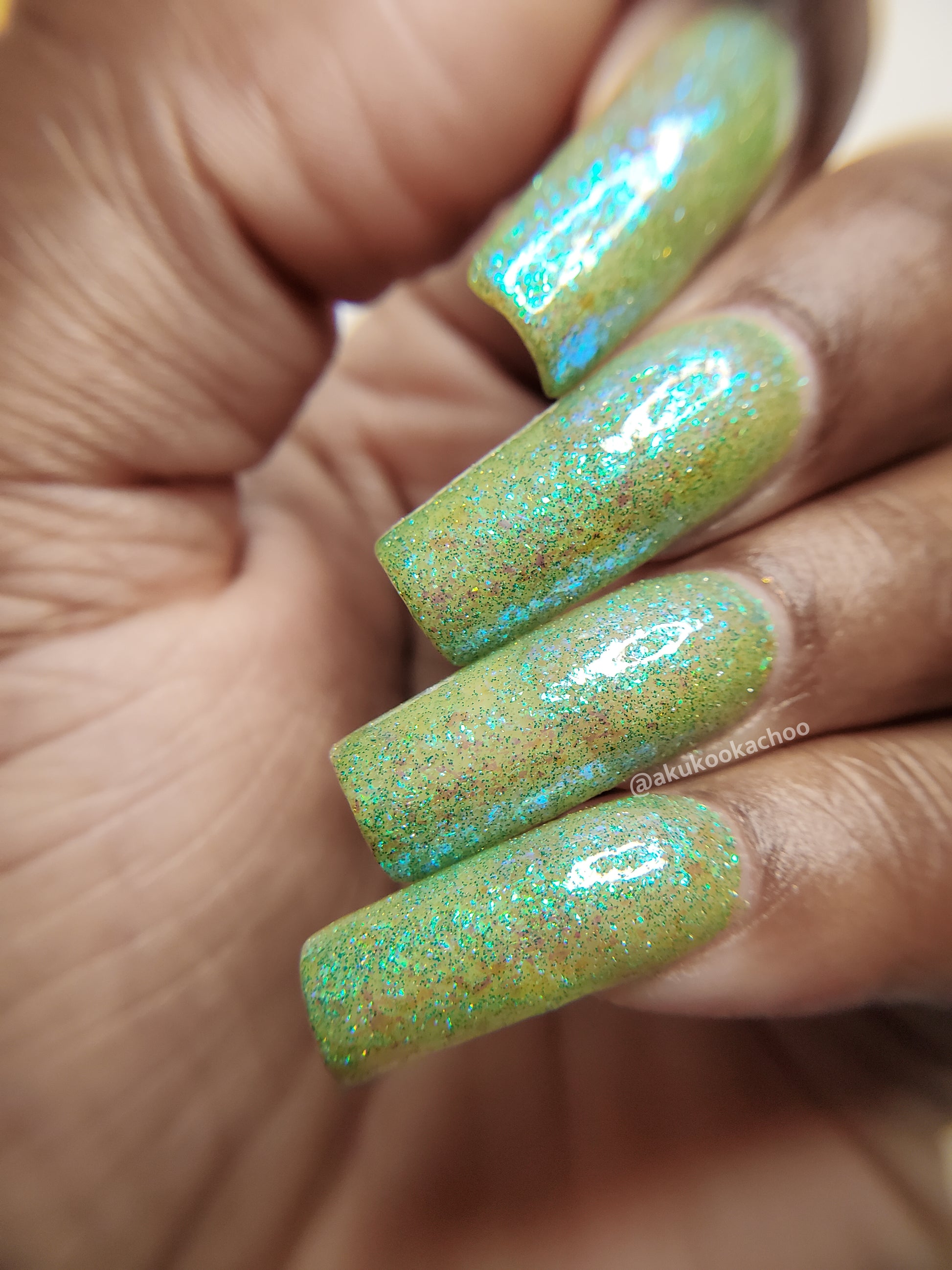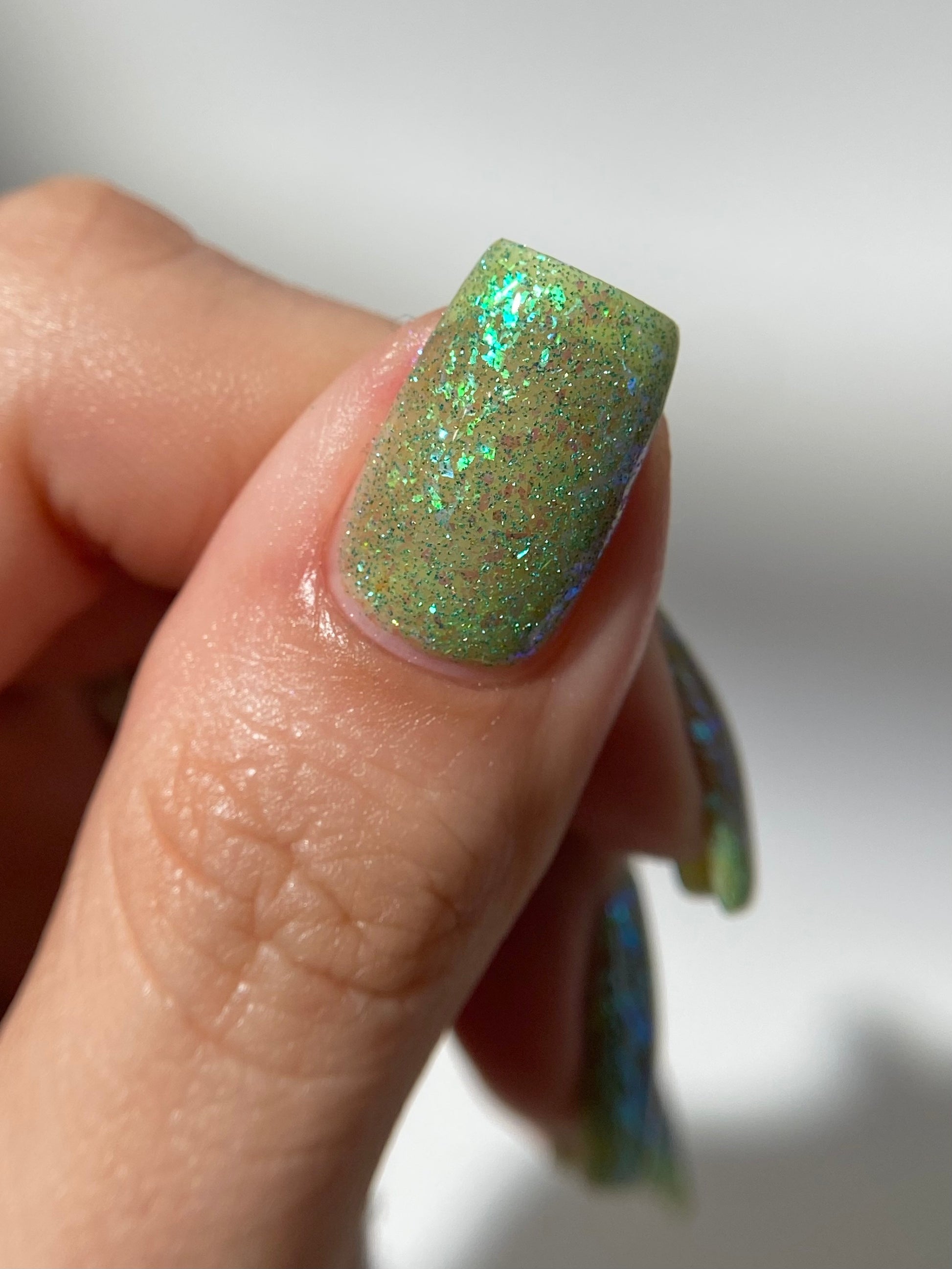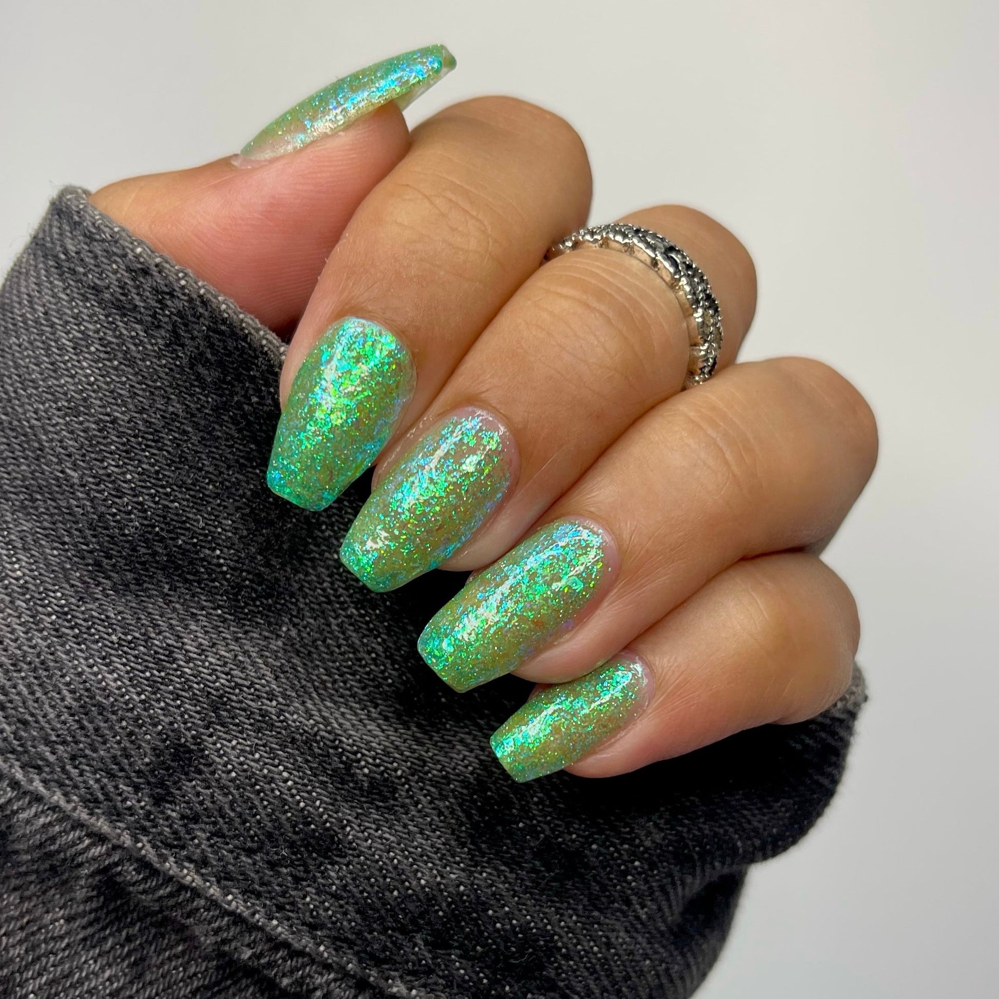 A semi-sheer yellow-leaning green base with light blue reflective glitter and iridescent flakies that shift from green to blue
