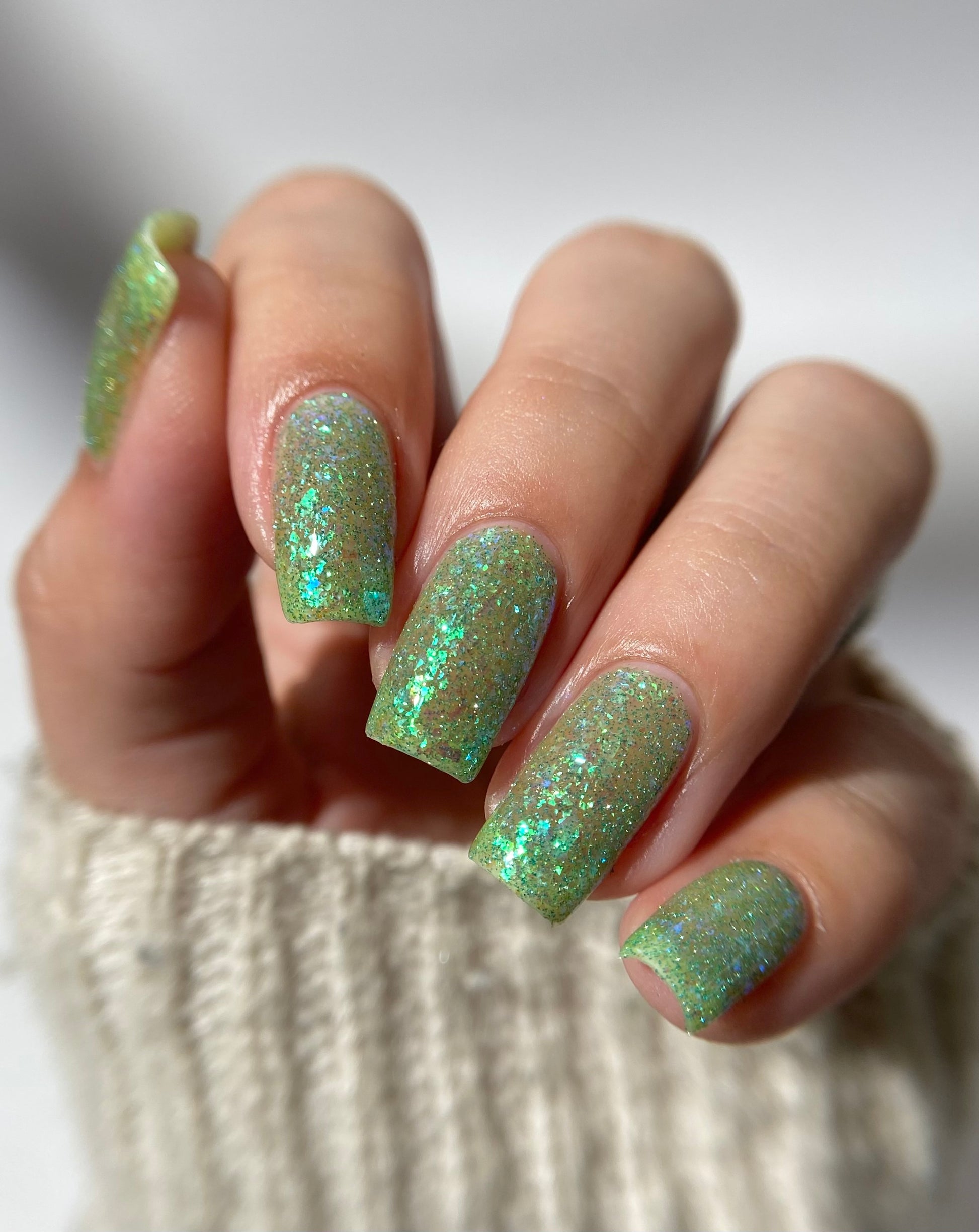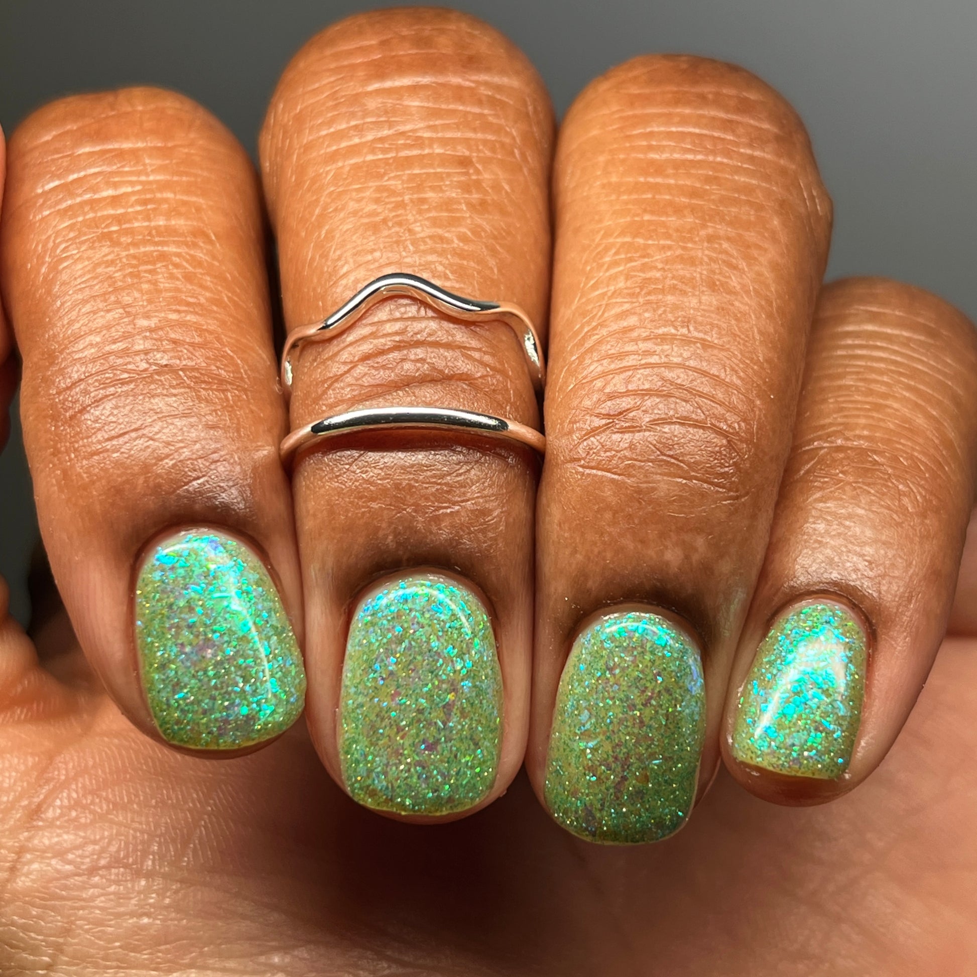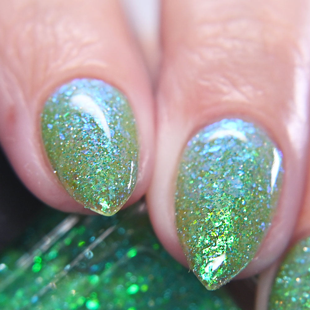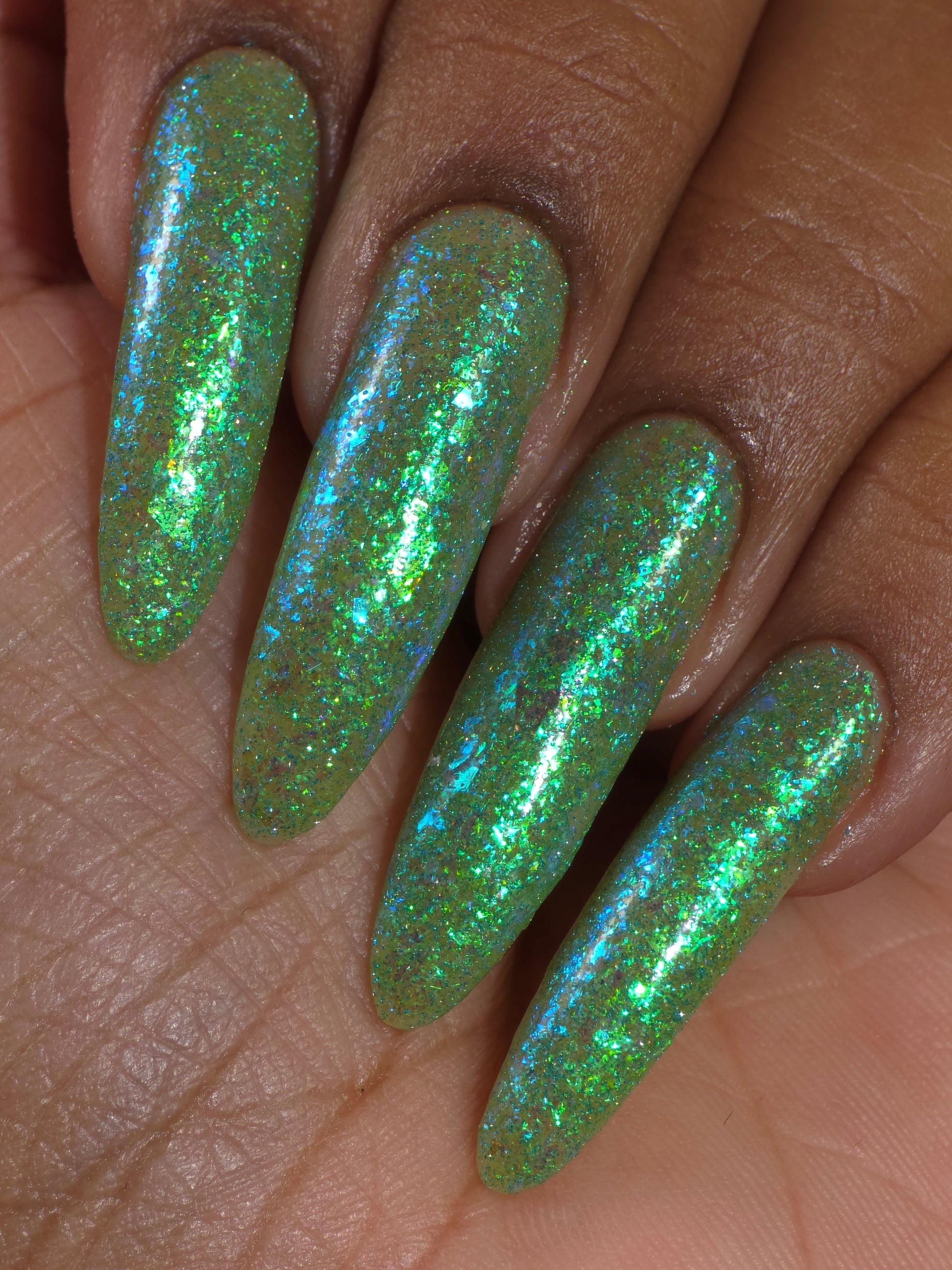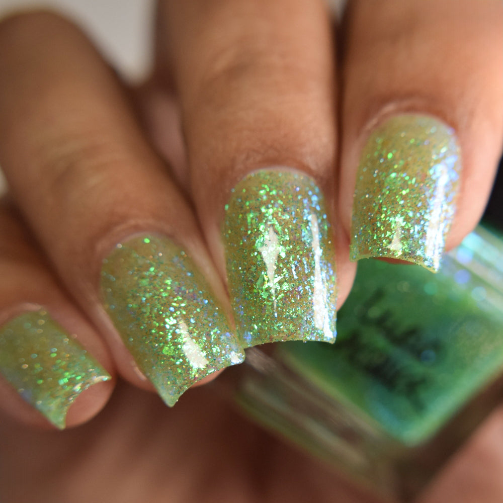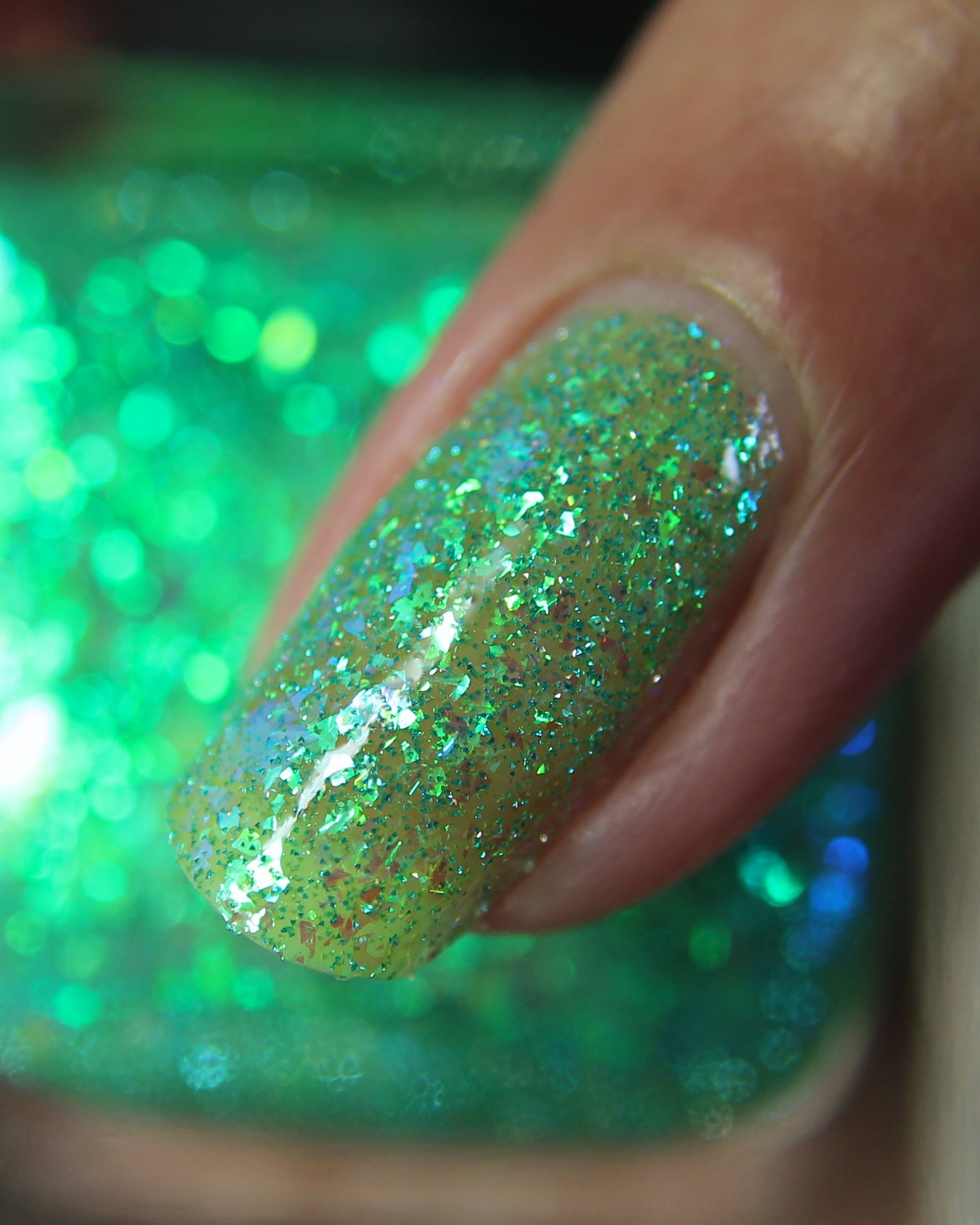 A semi-sheer yellow-leaning green base with light blue reflective glitter and iridescent flakies that shift from green to blue