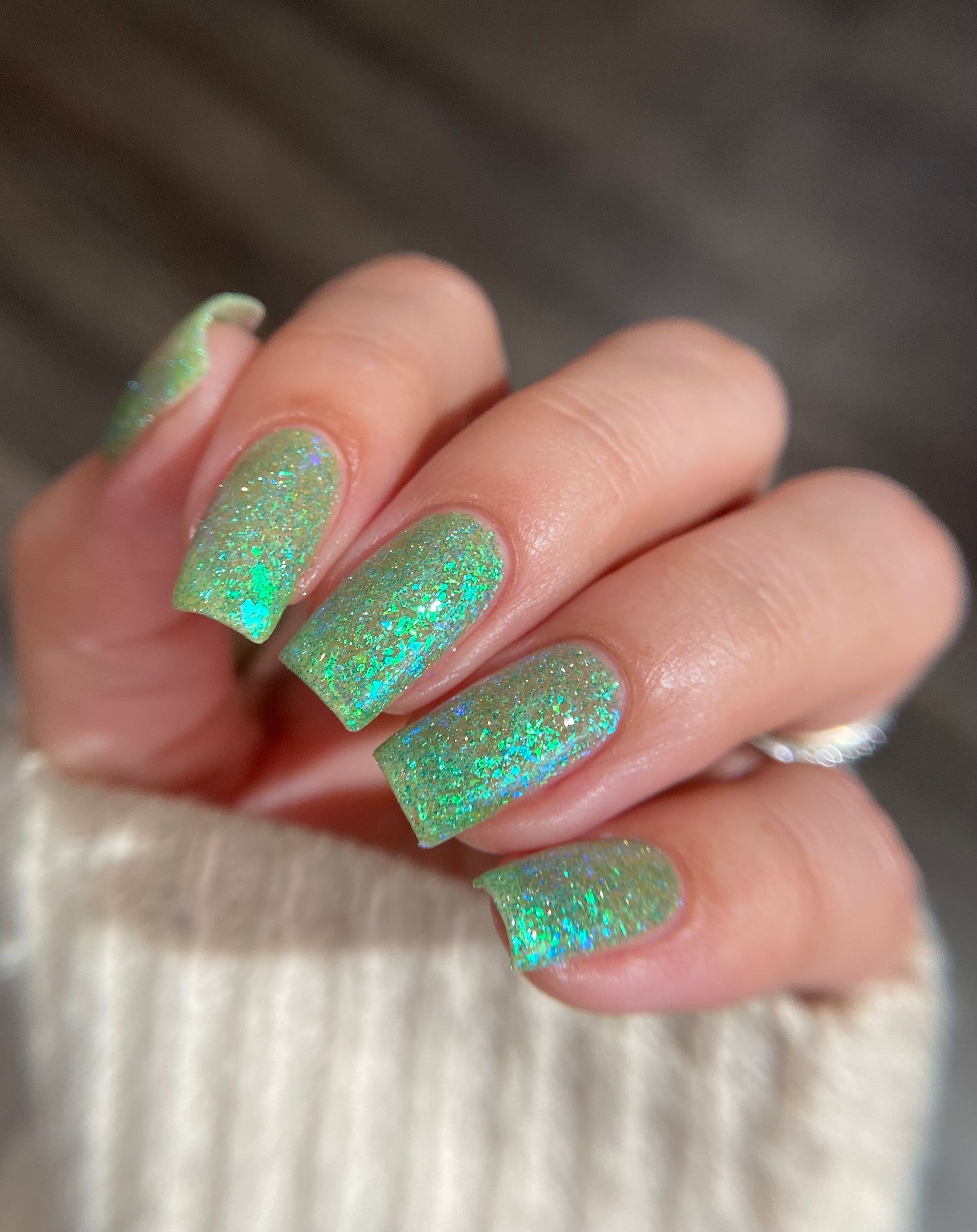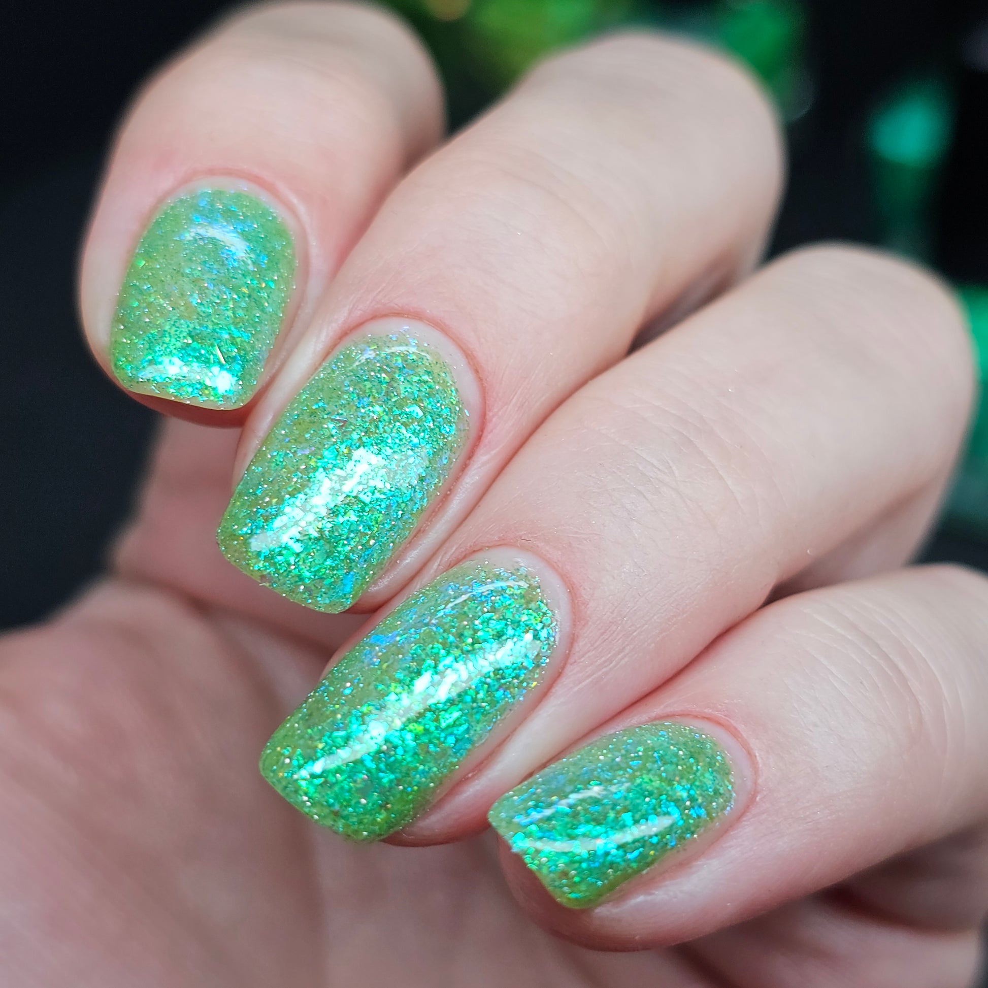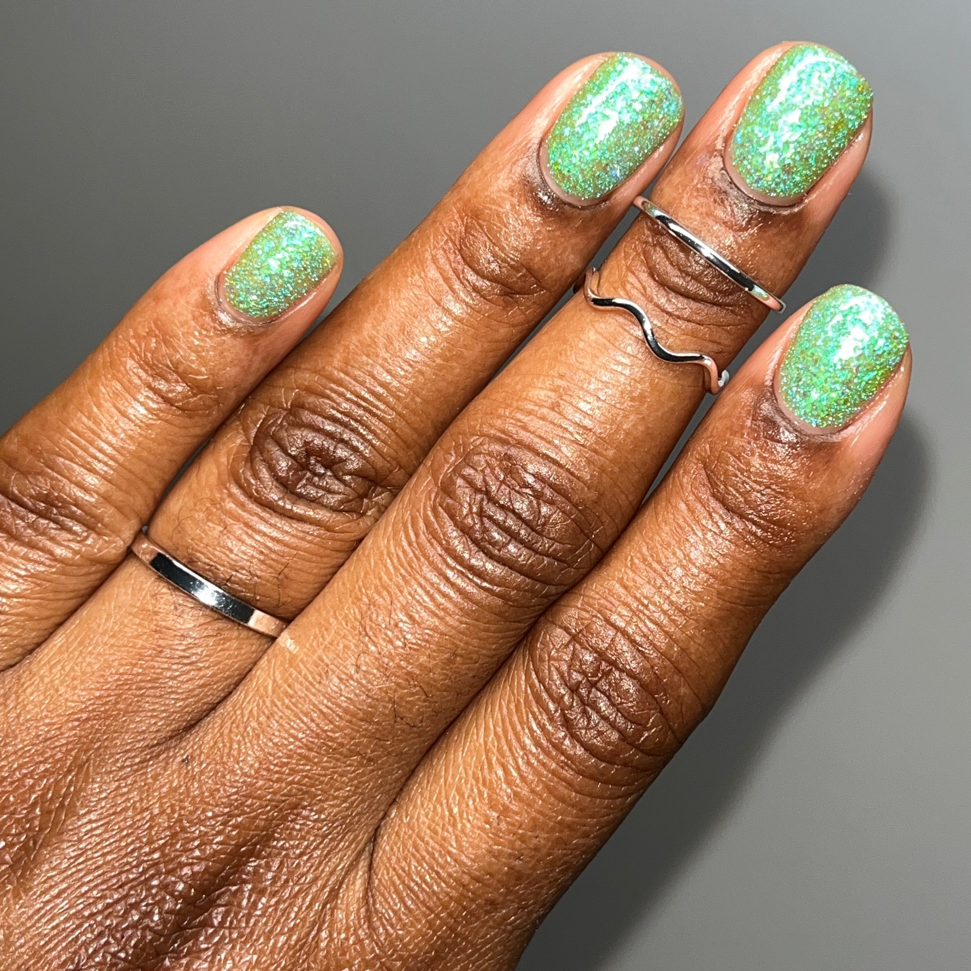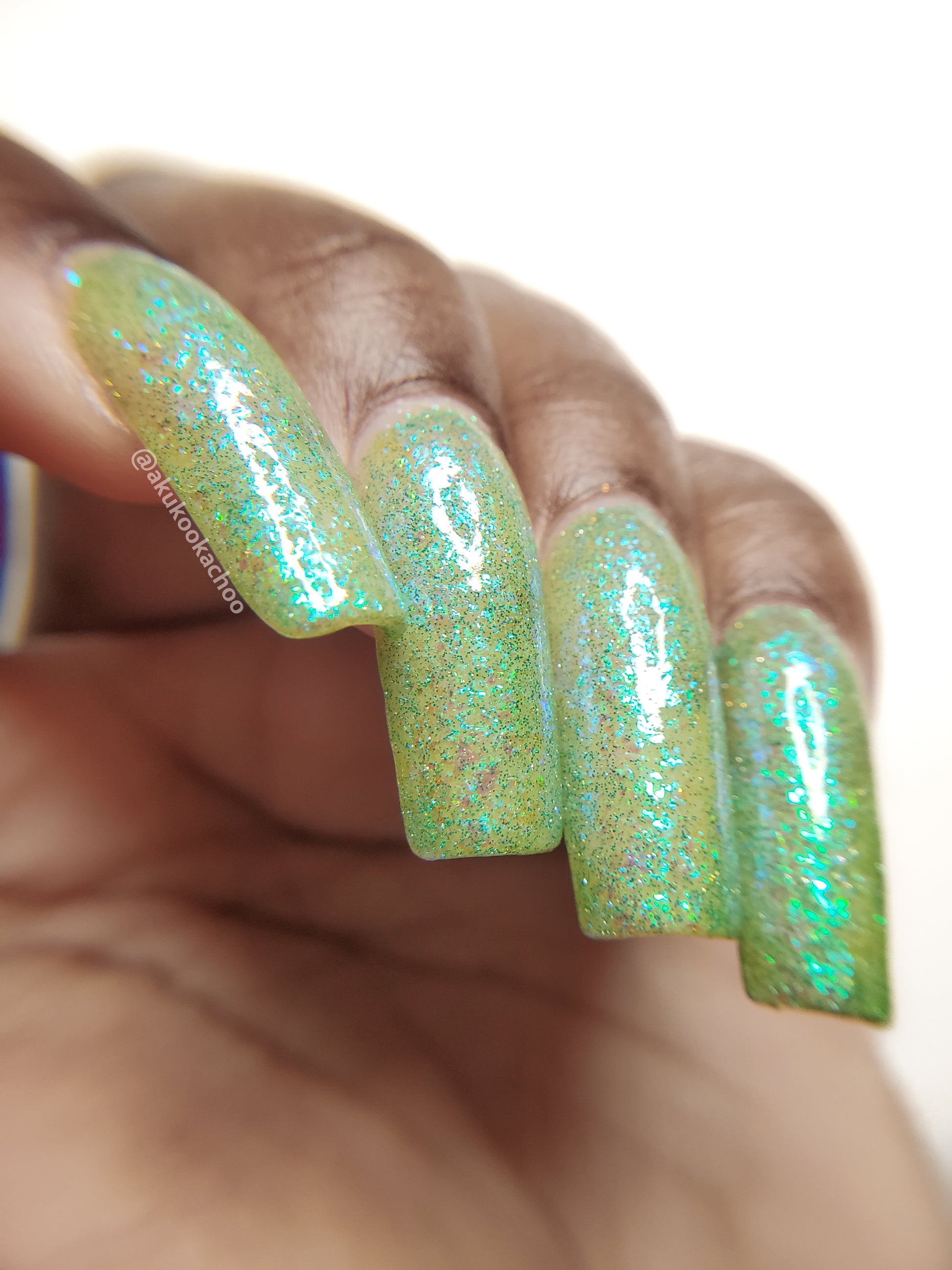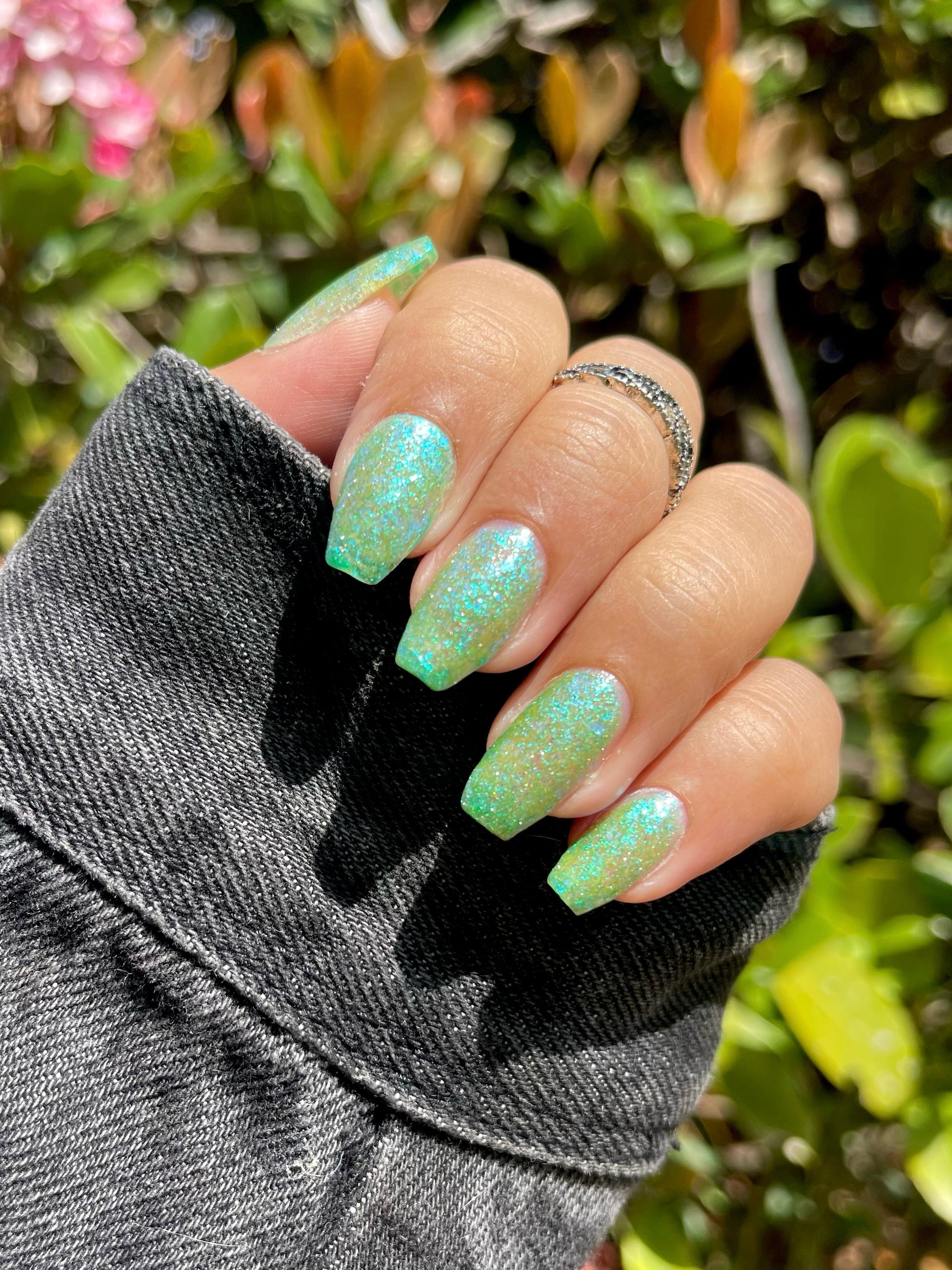 A semi-sheer yellow-leaning green base with light blue reflective glitter and iridescent flakies that shift from green to blue