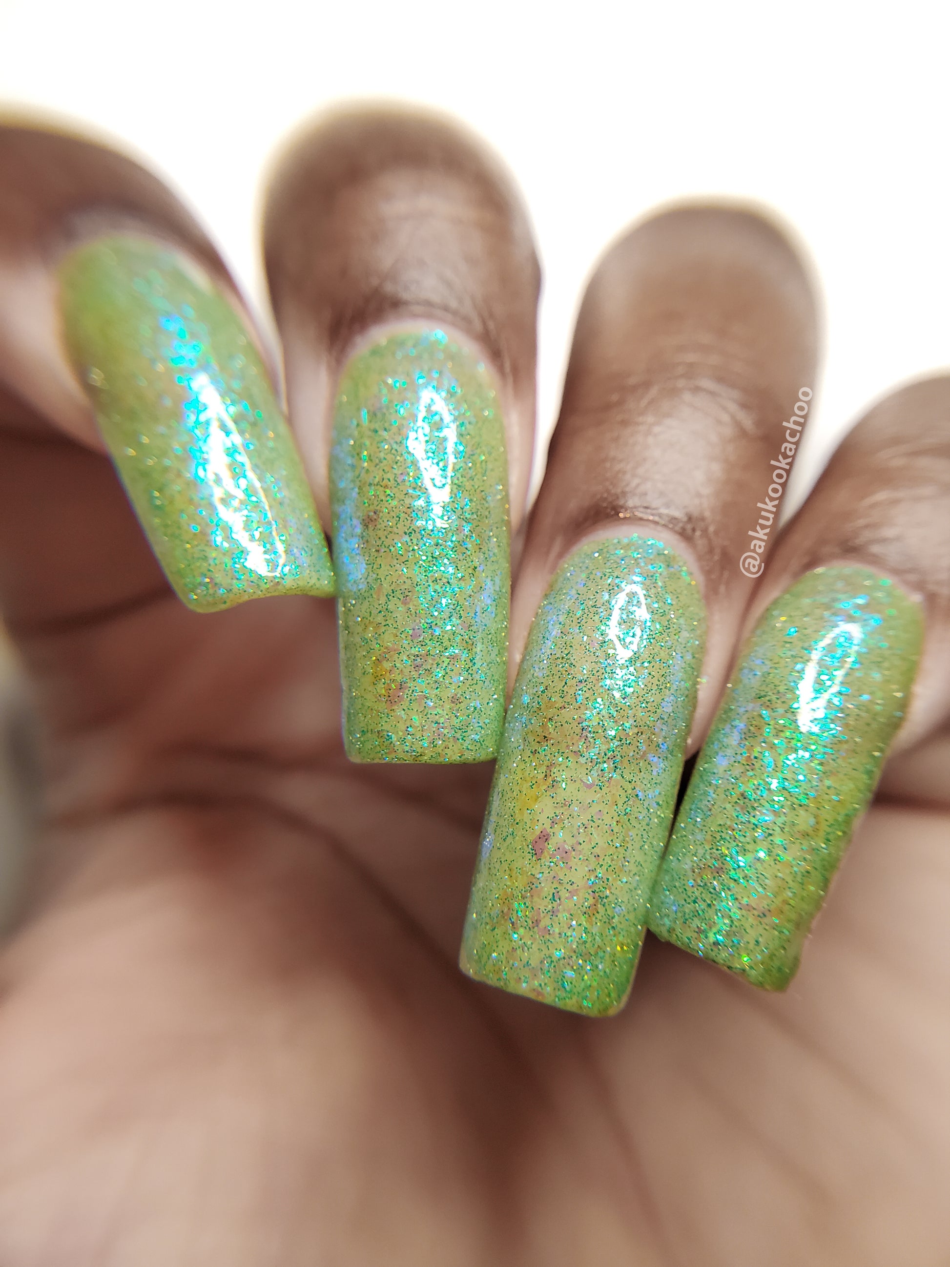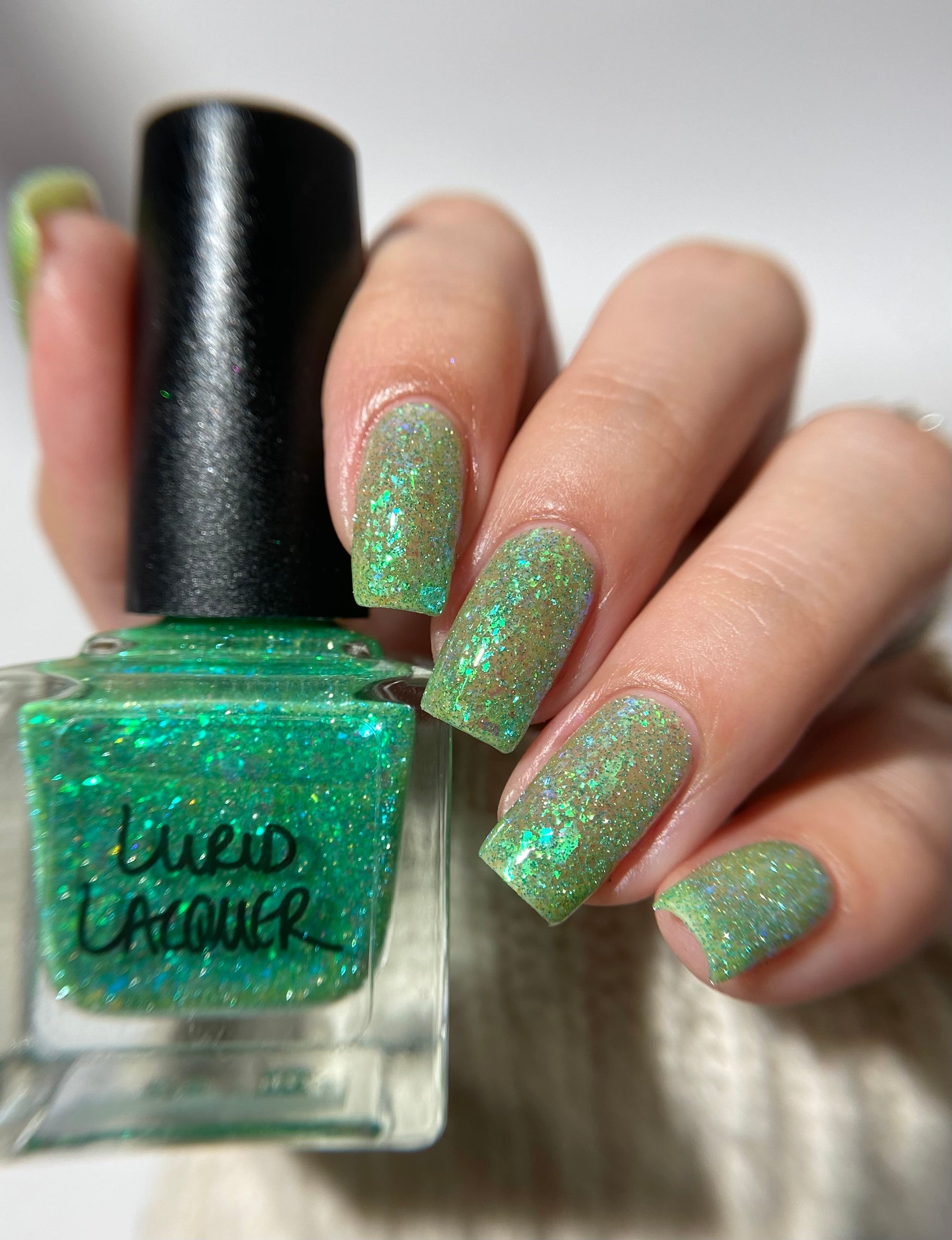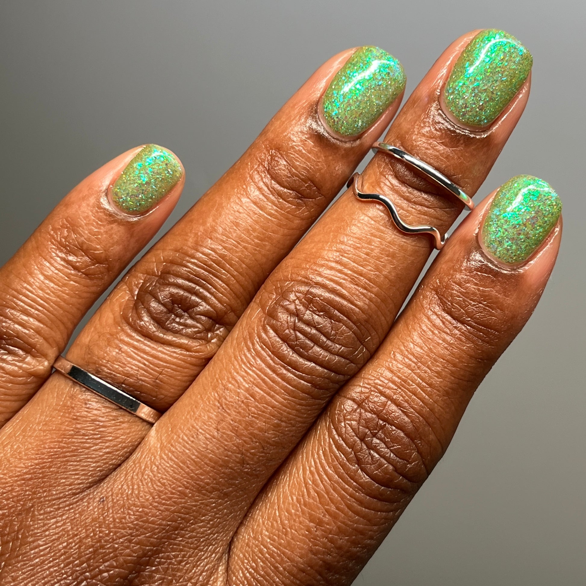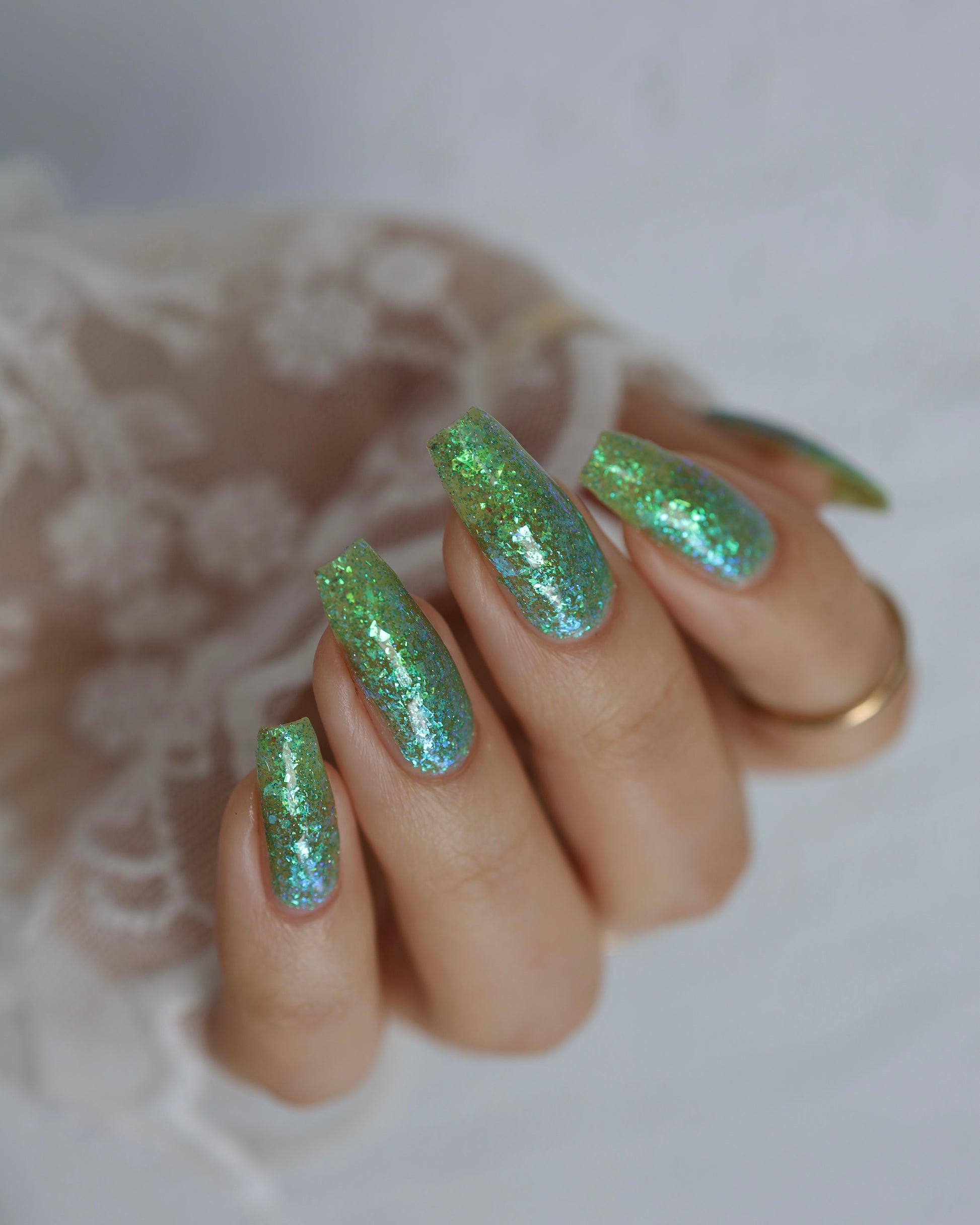 A semi-sheer yellow-leaning green base with light blue reflective glitter and iridescent flakies that shift from green to blue