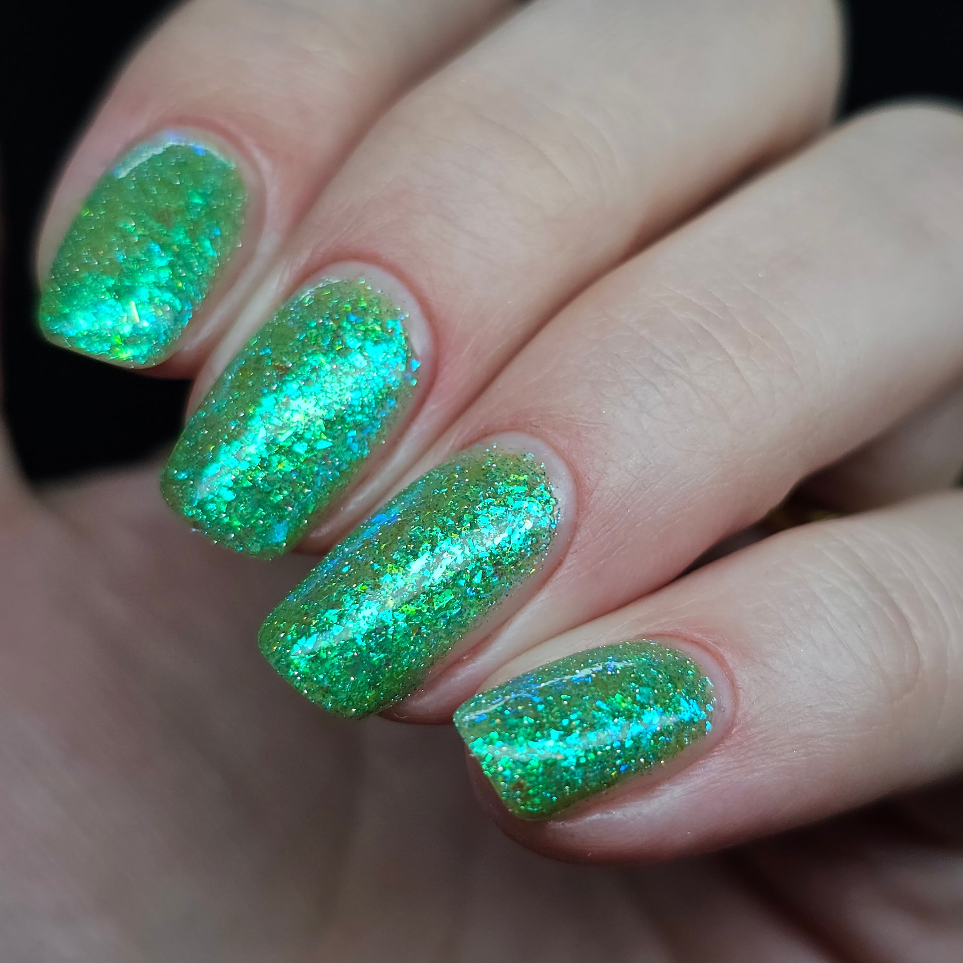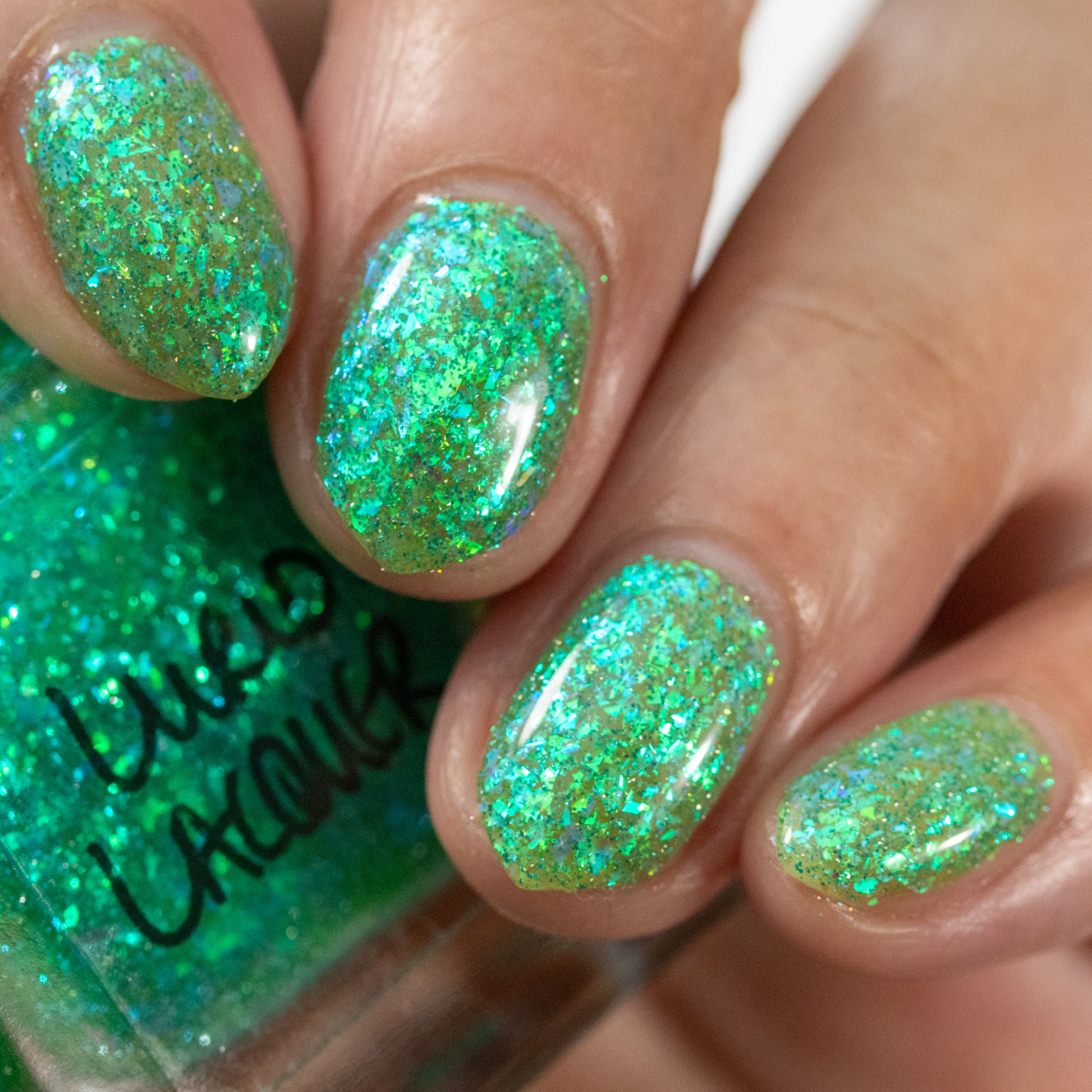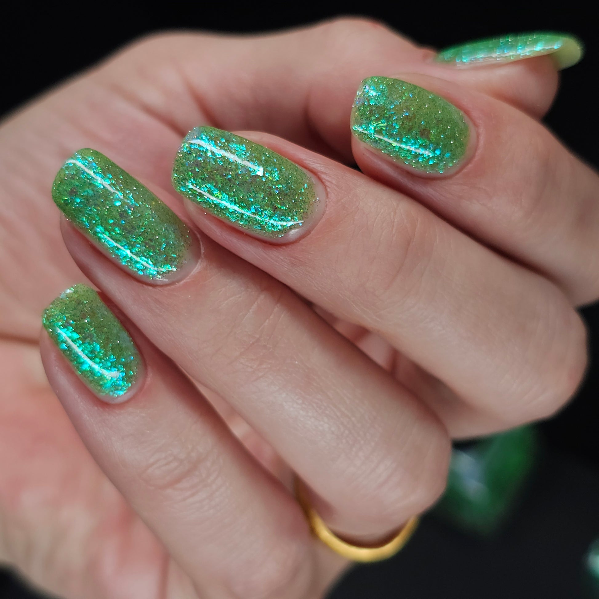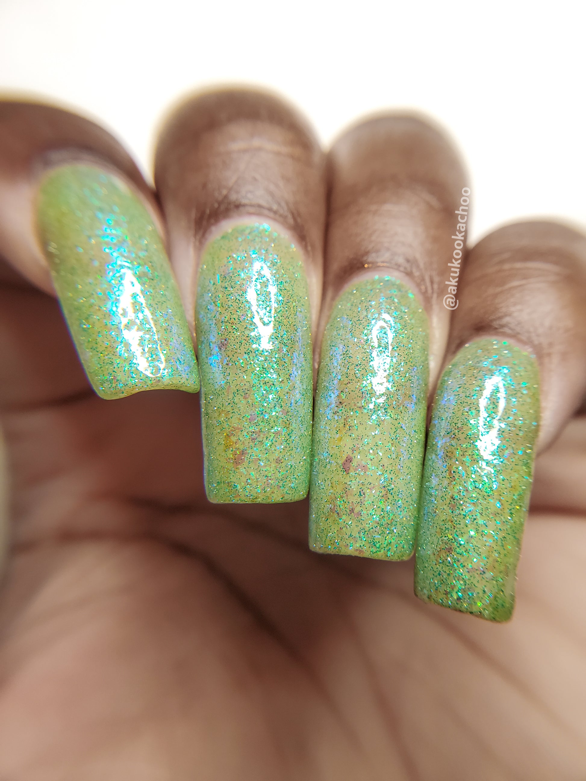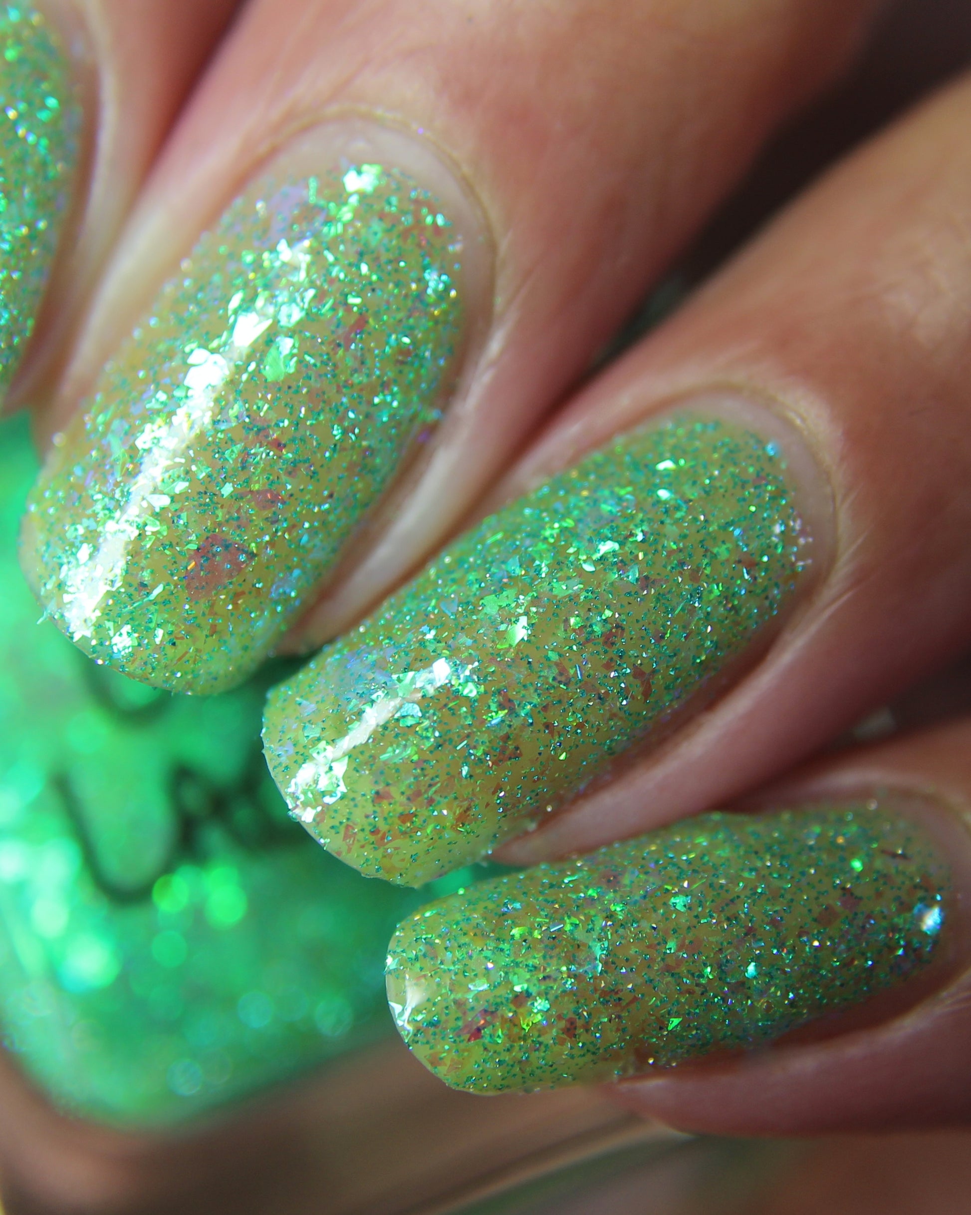 A semi-sheer yellow-leaning green base with light blue reflective glitter and iridescent flakies that shift from green to blue