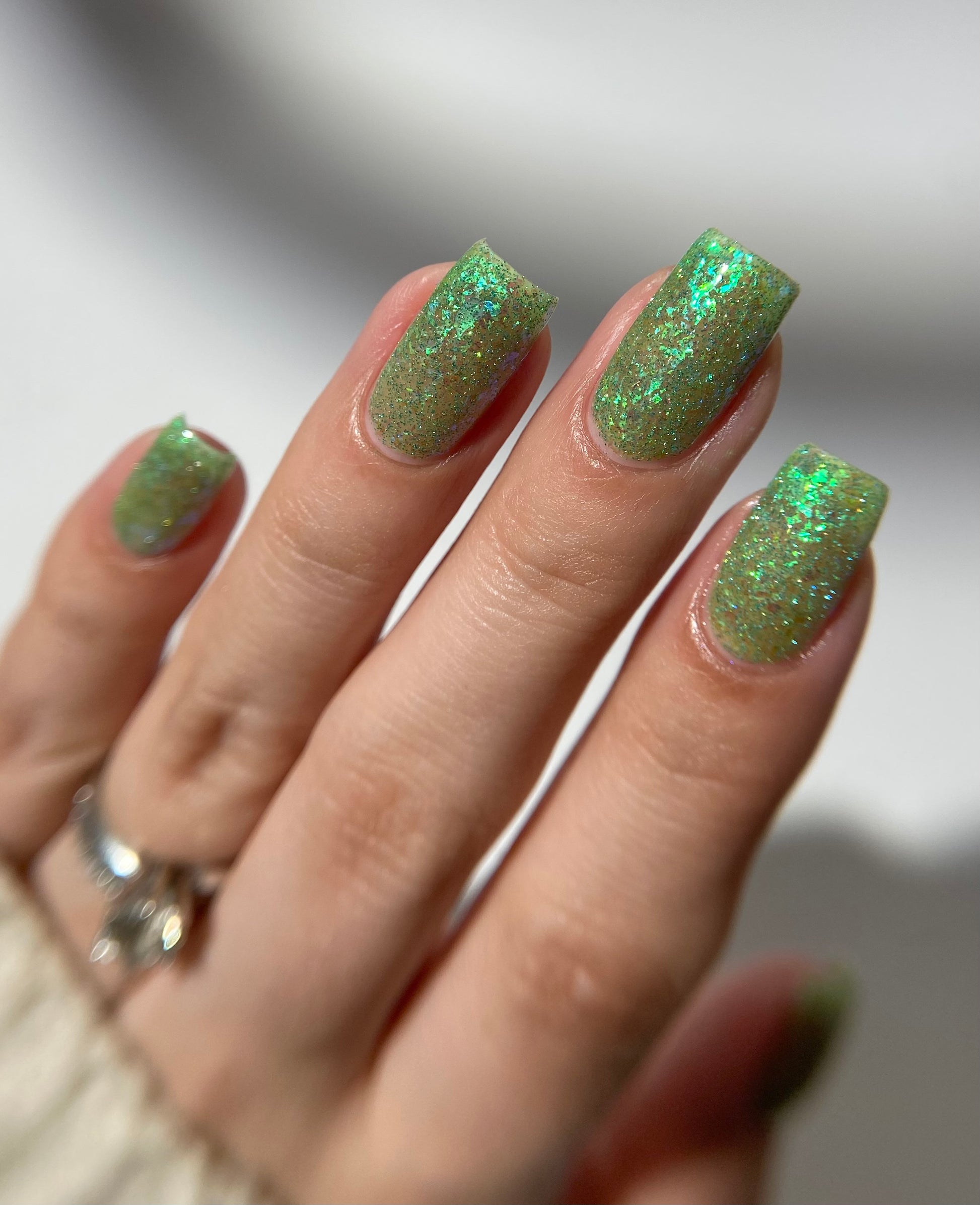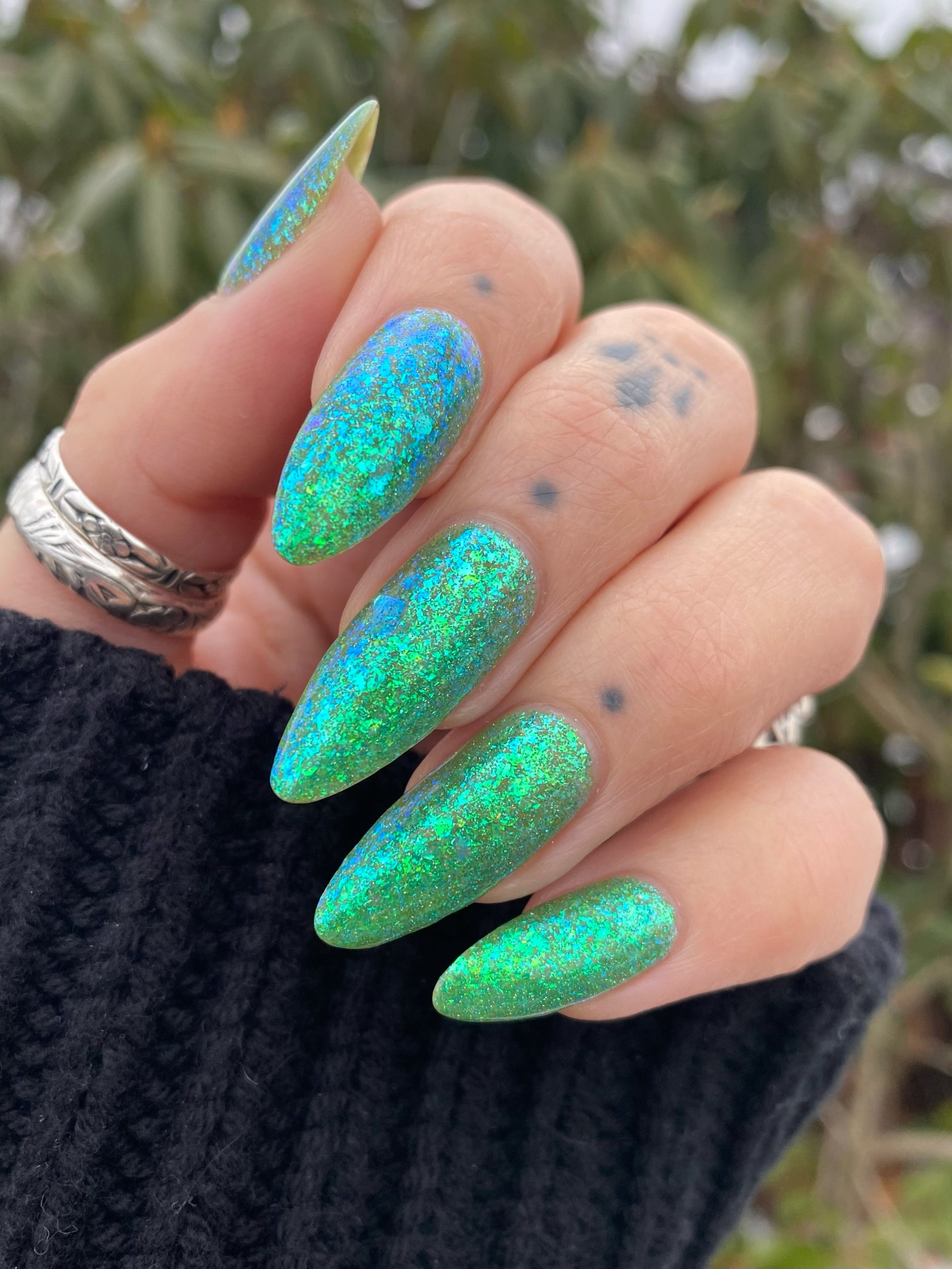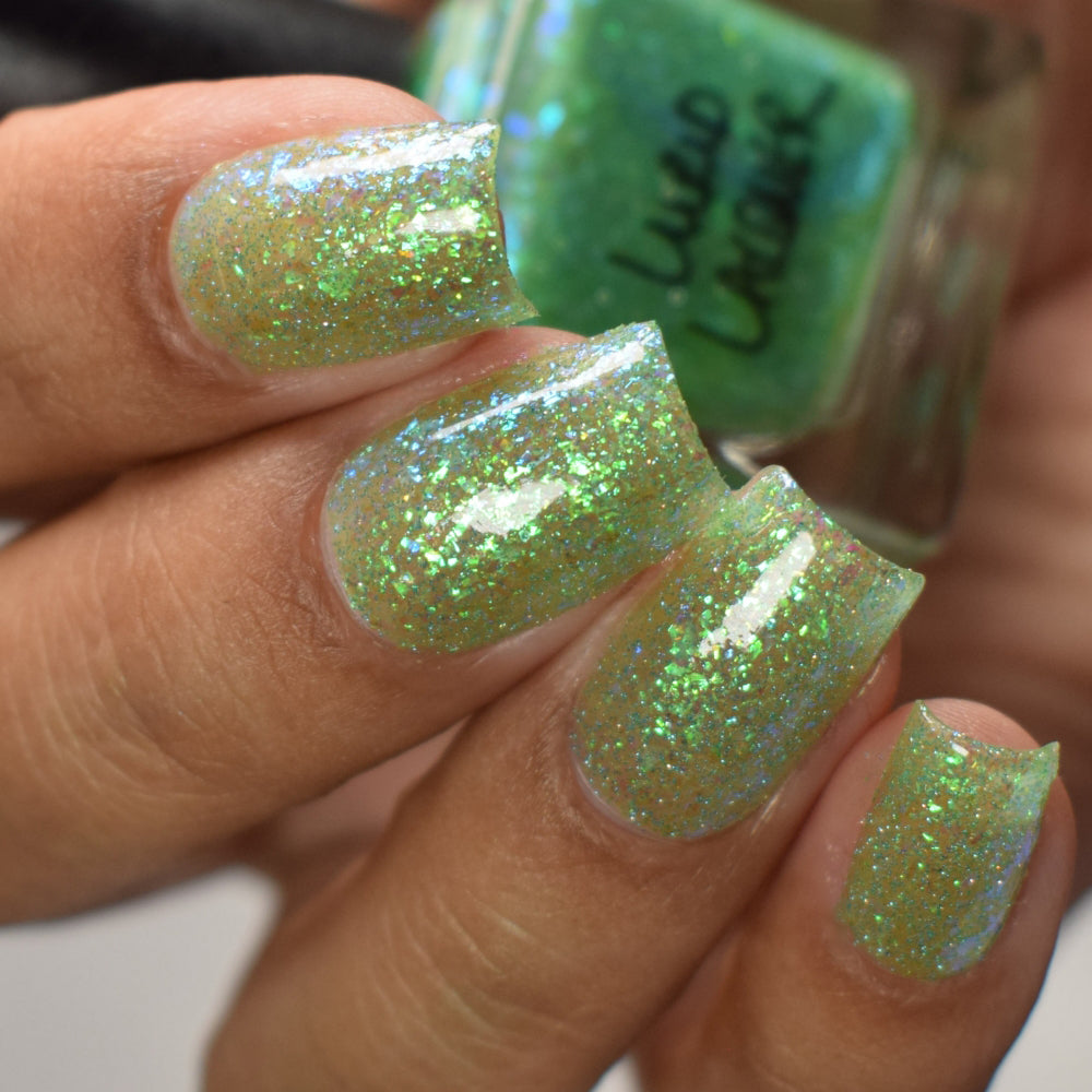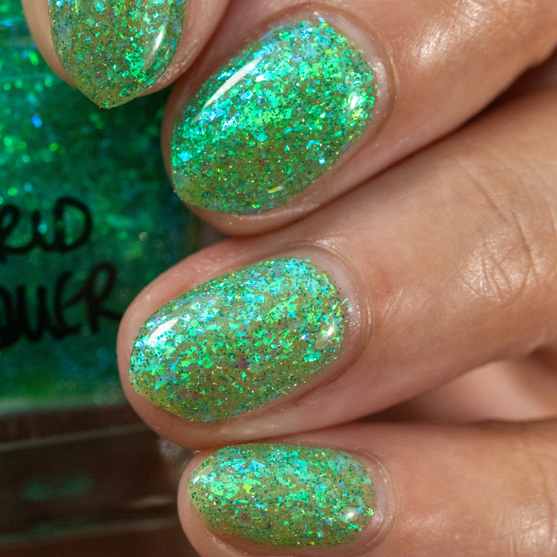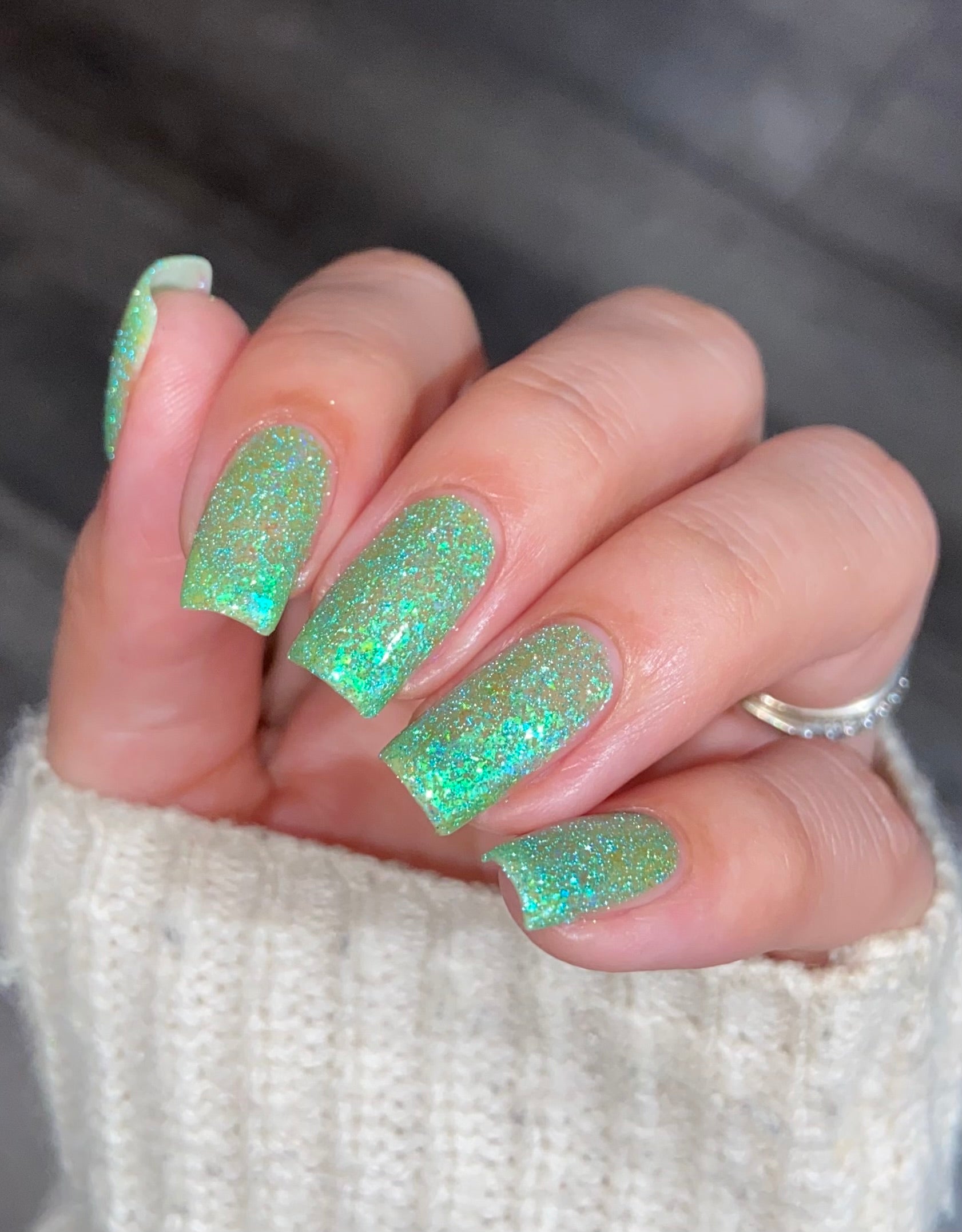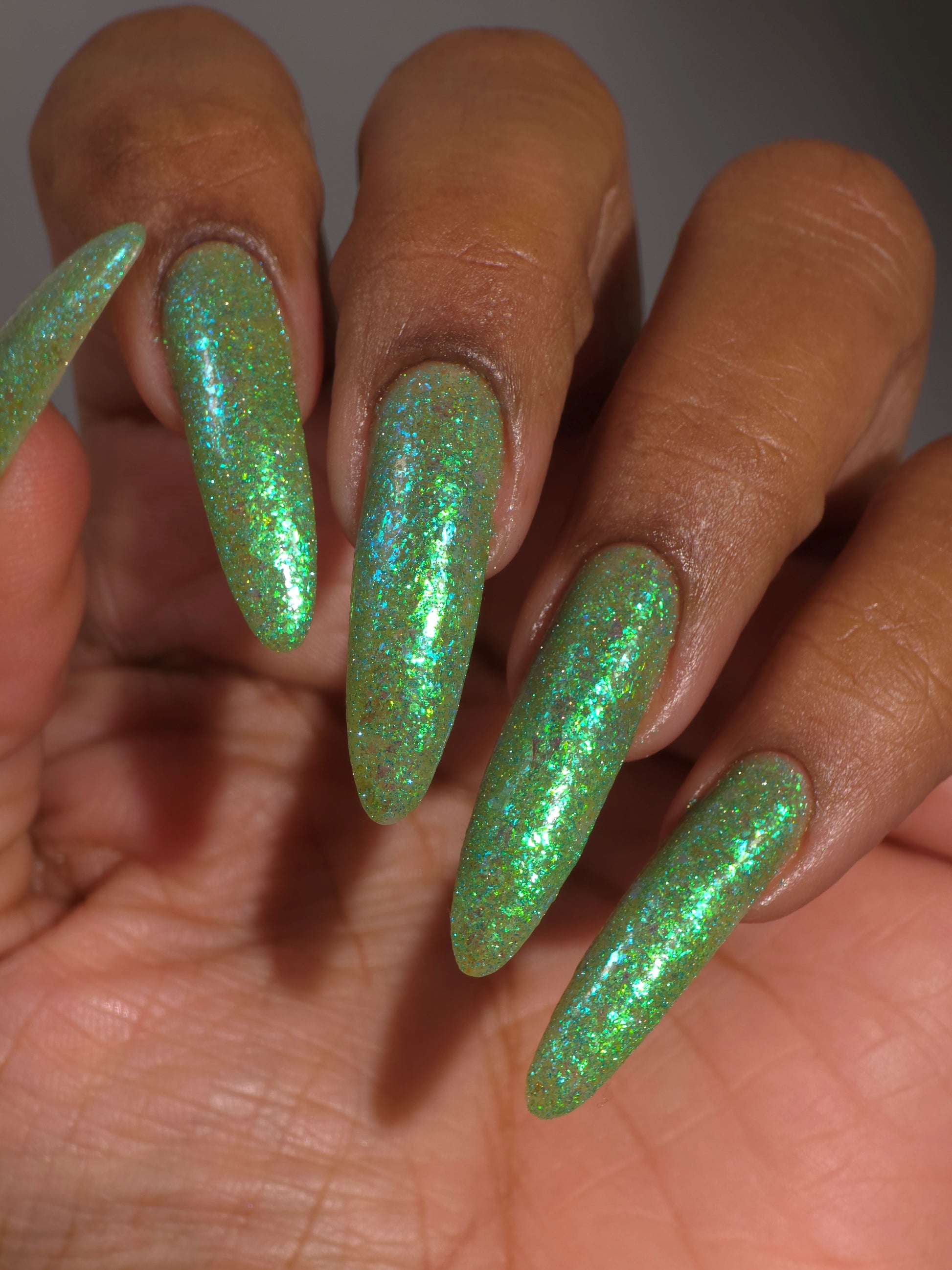 A semi-sheer yellow-leaning green base with light blue reflective glitter and iridescent flakies that shift from green to blue