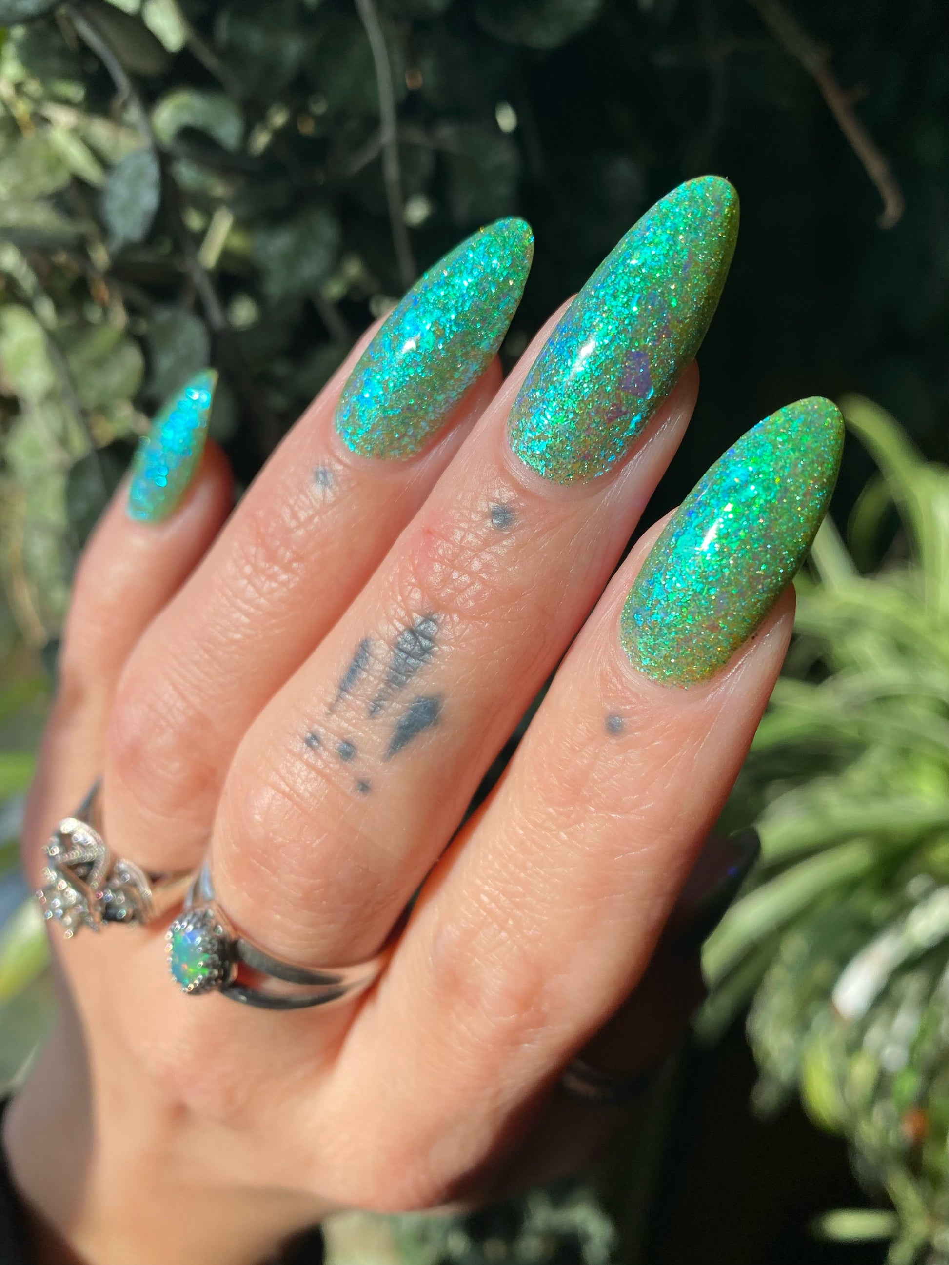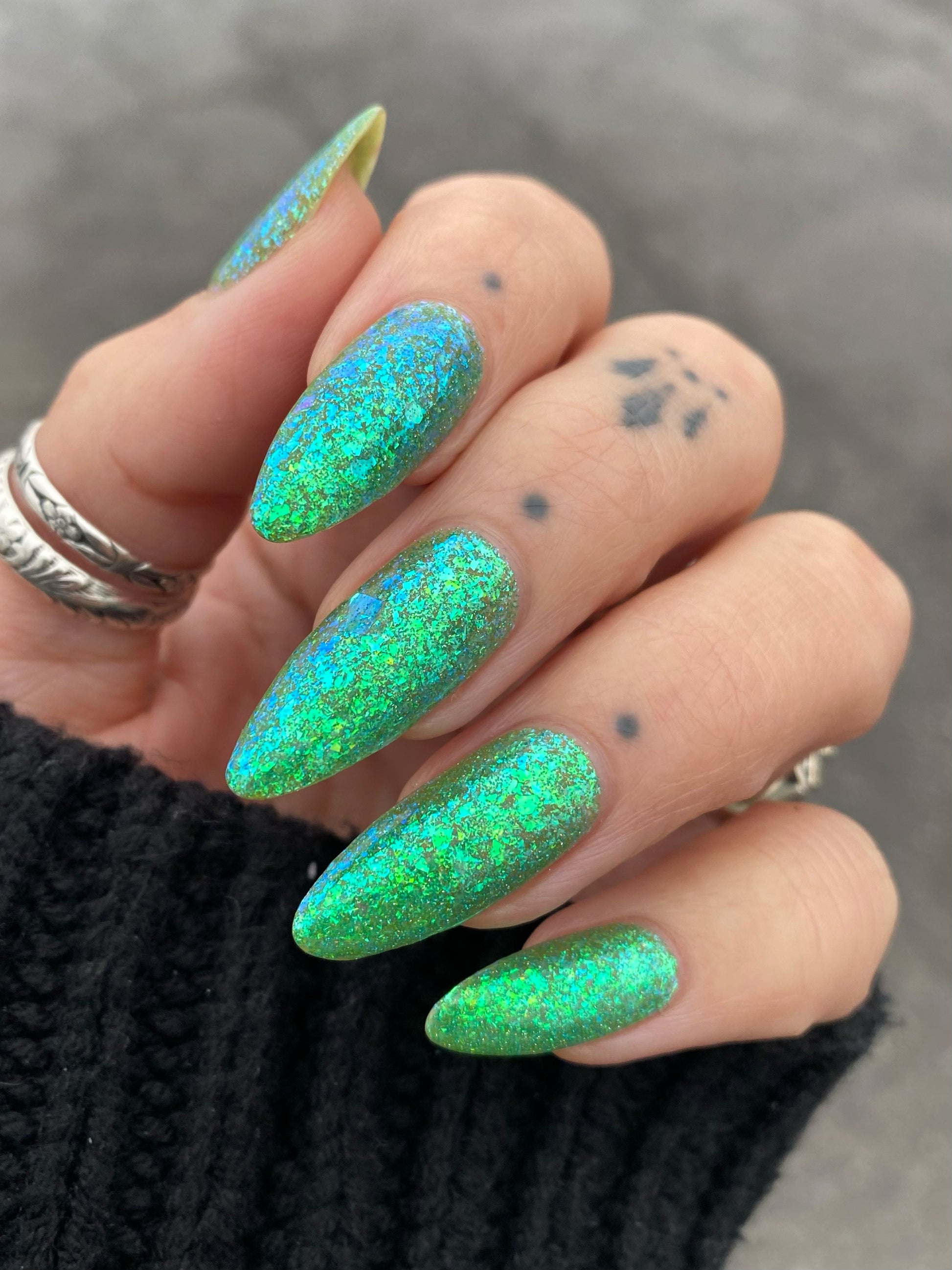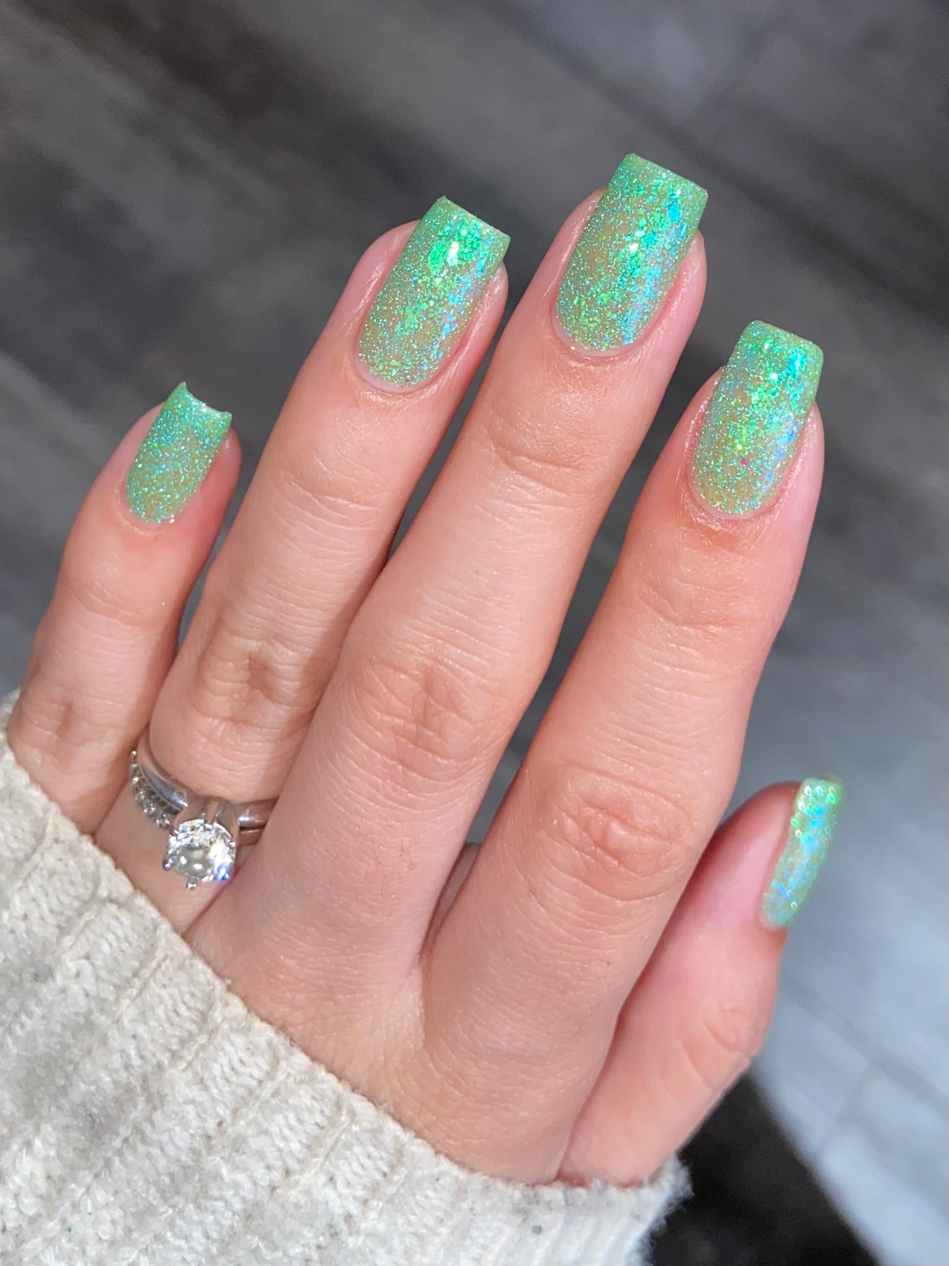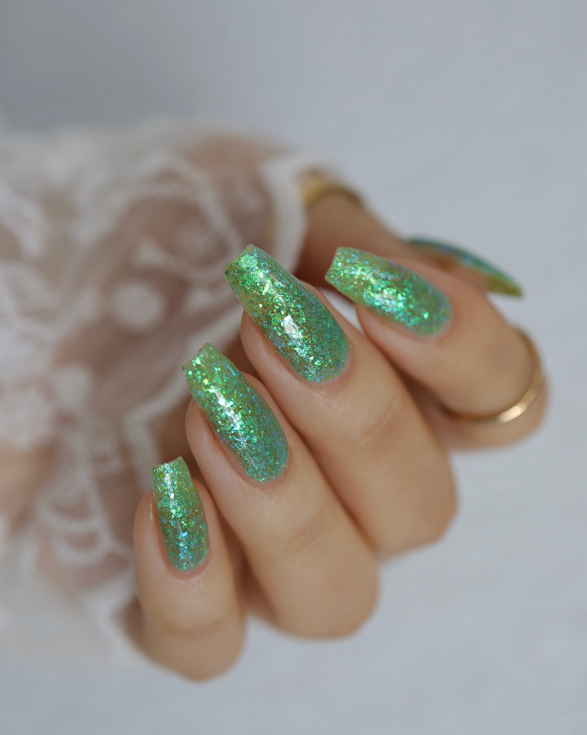 A semi-sheer yellow-leaning green base with light blue reflective glitter and iridescent flakies that shift from green to blue