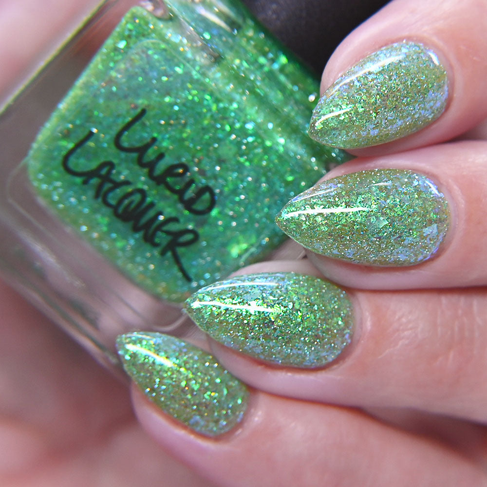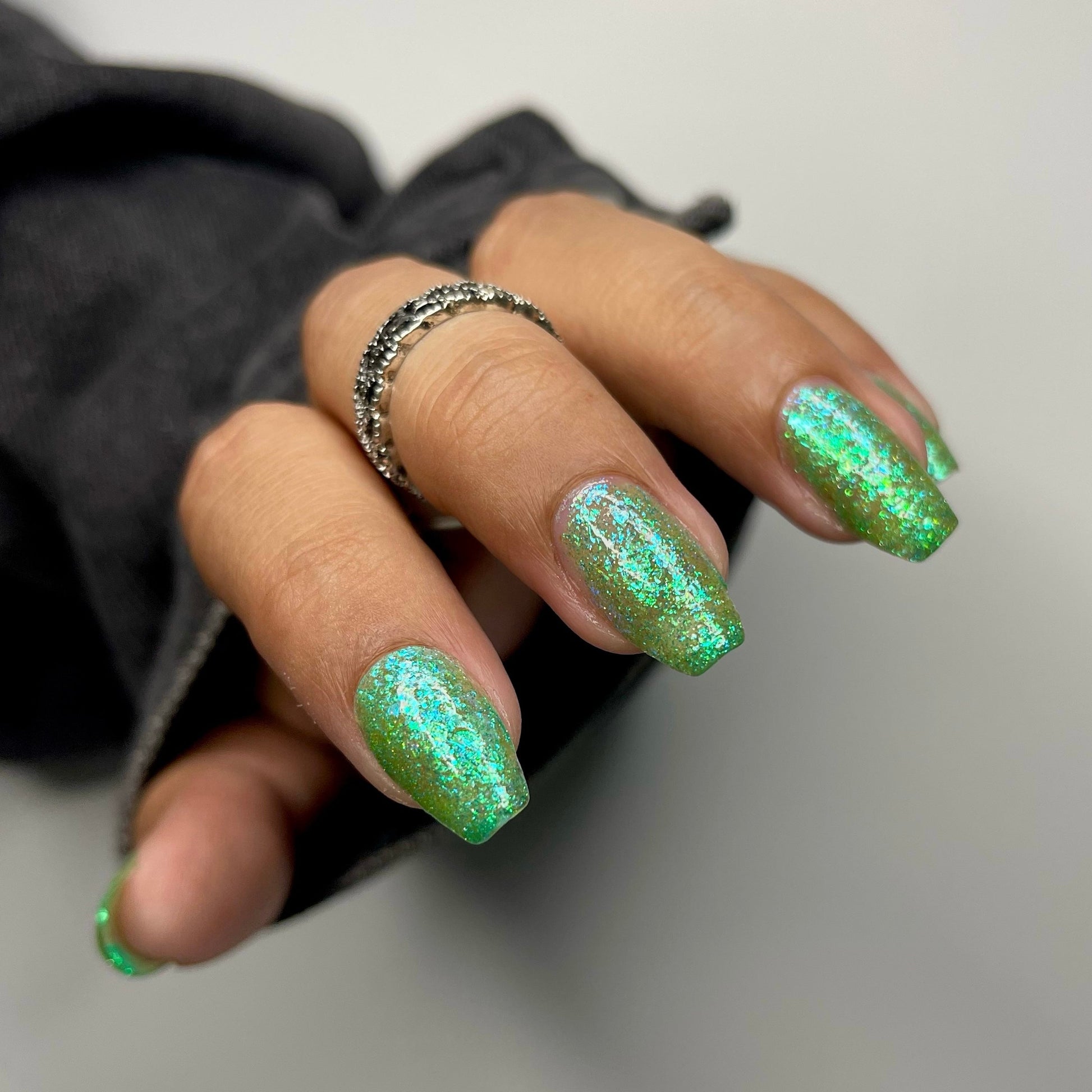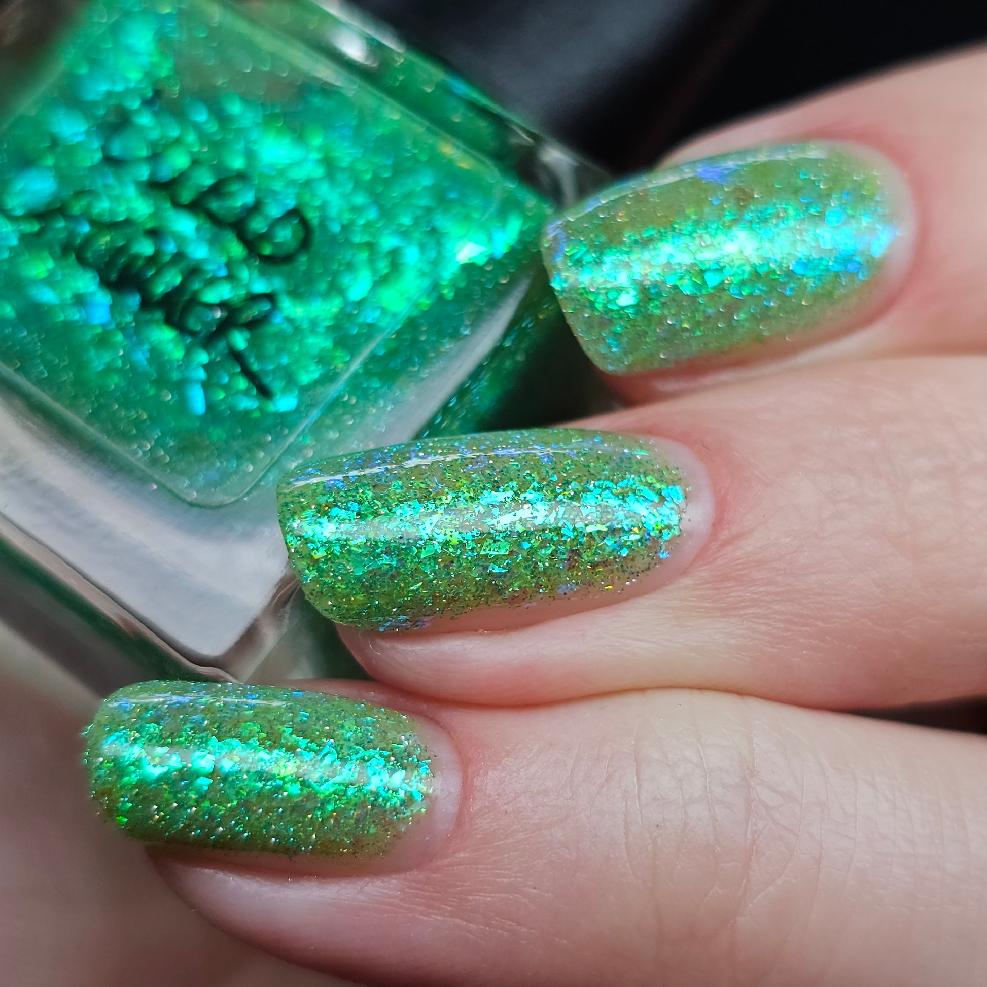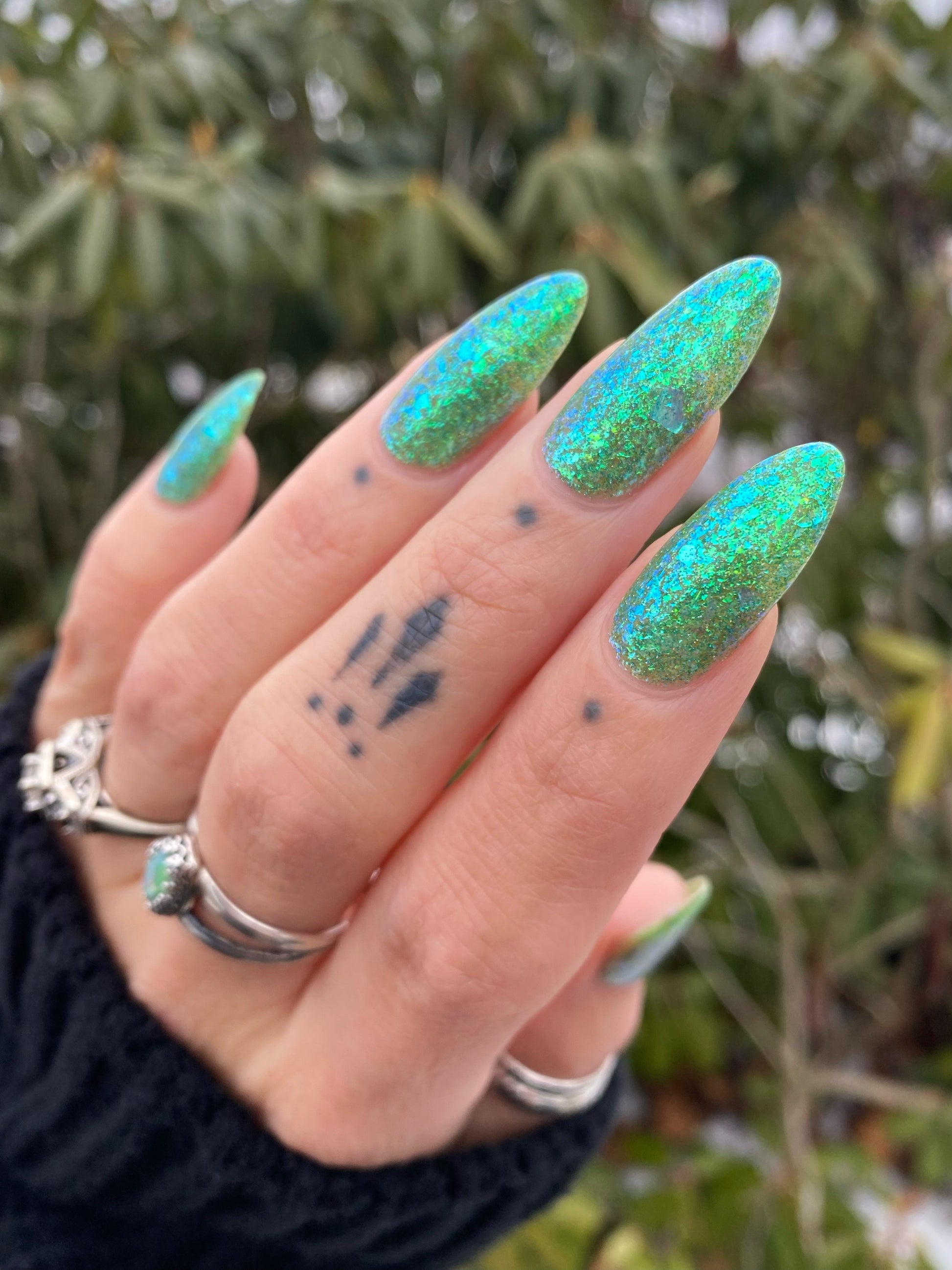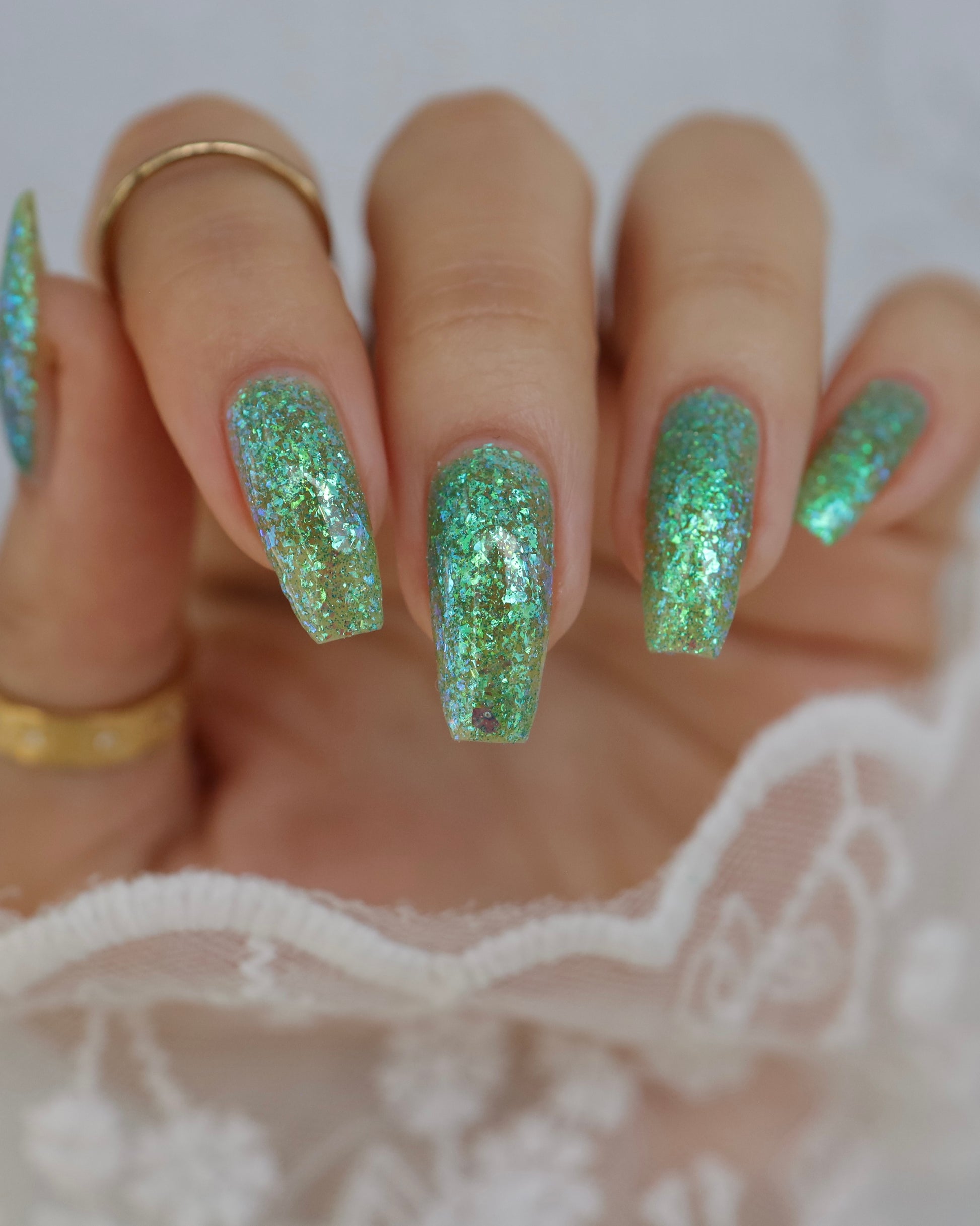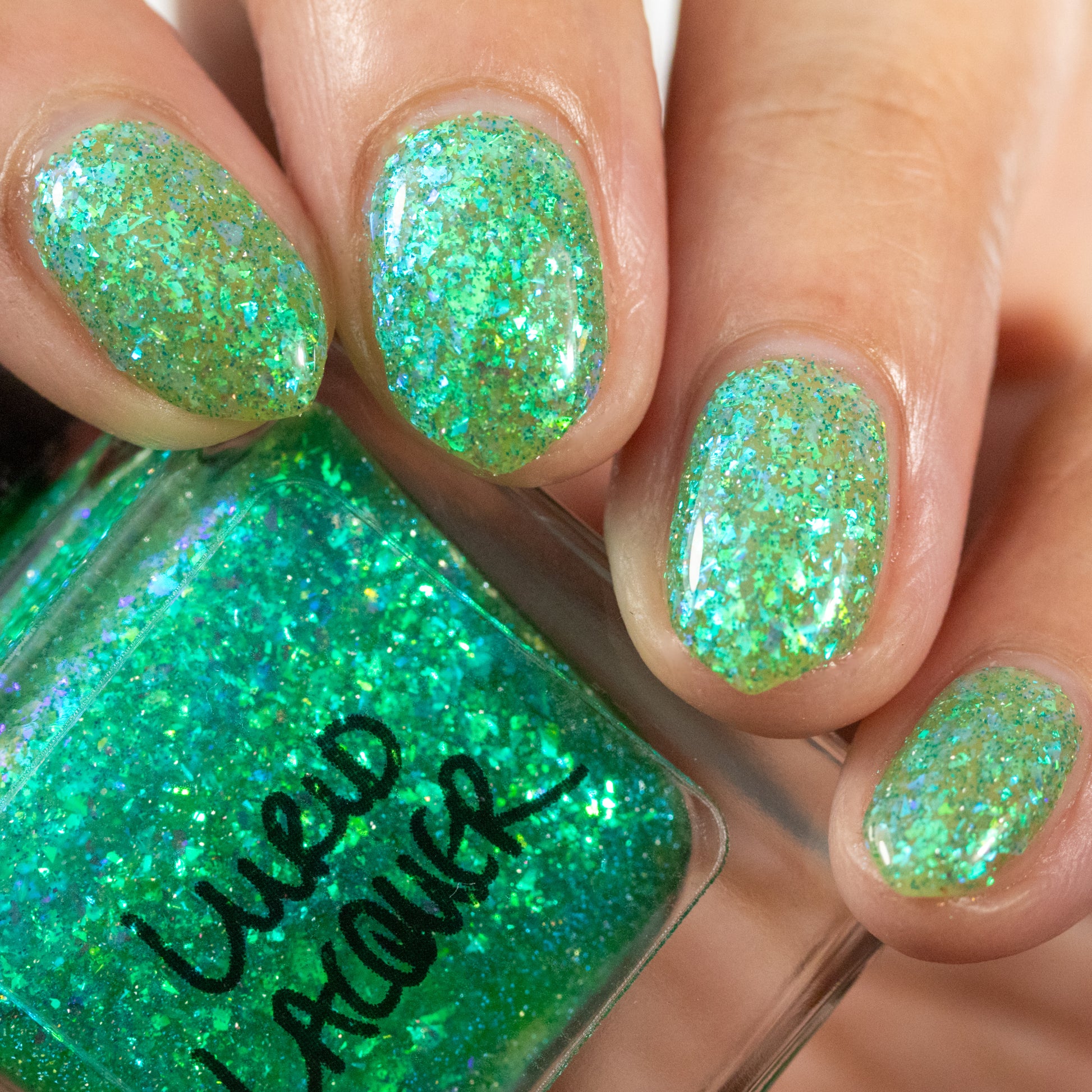 A semi-sheer yellow-leaning green base with light blue reflective glitter and iridescent flakies that shift from green to blue