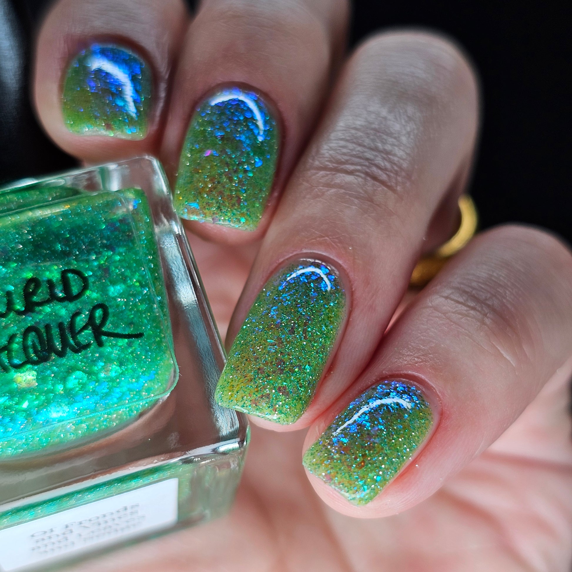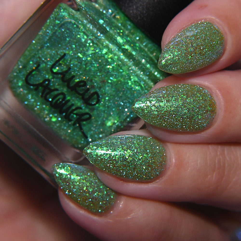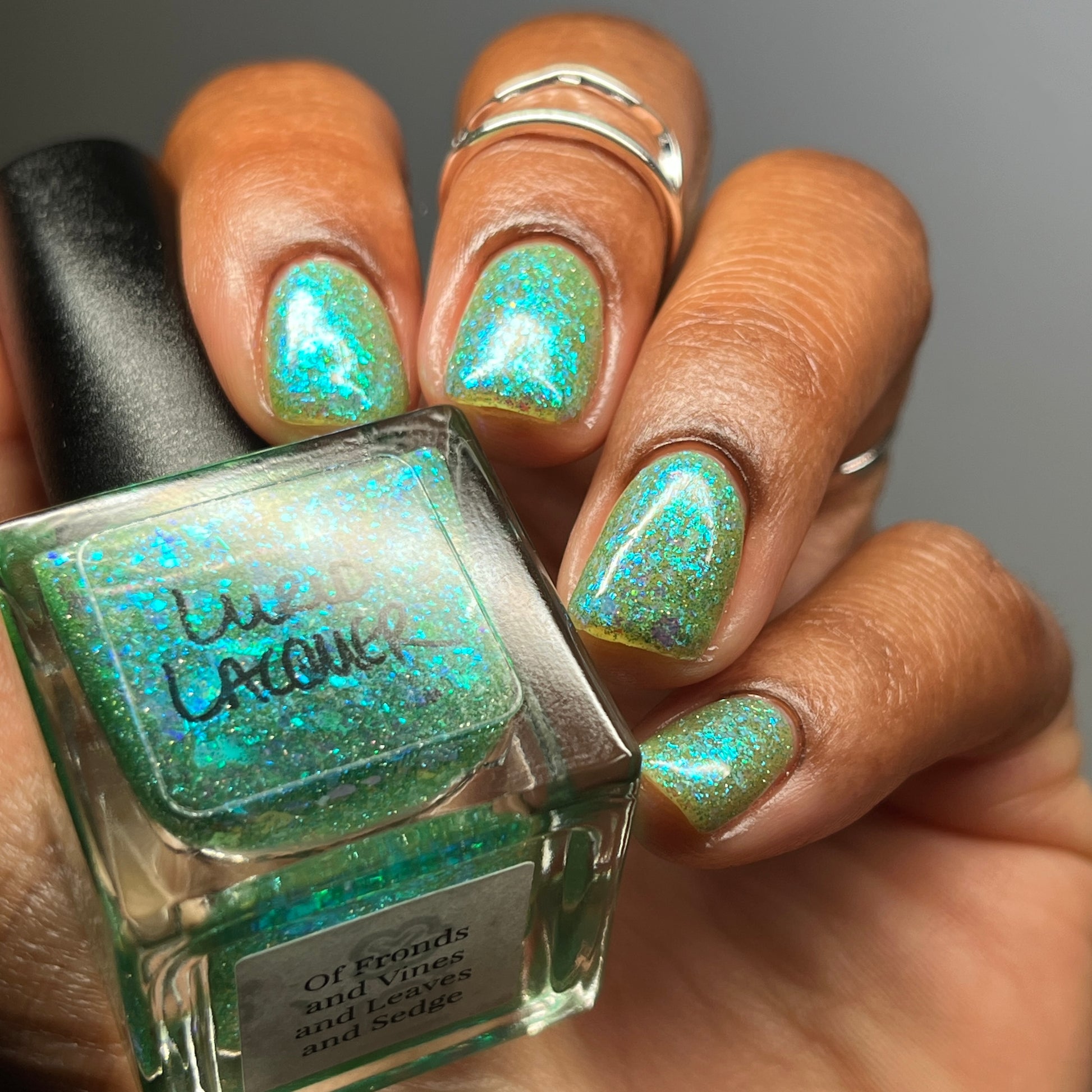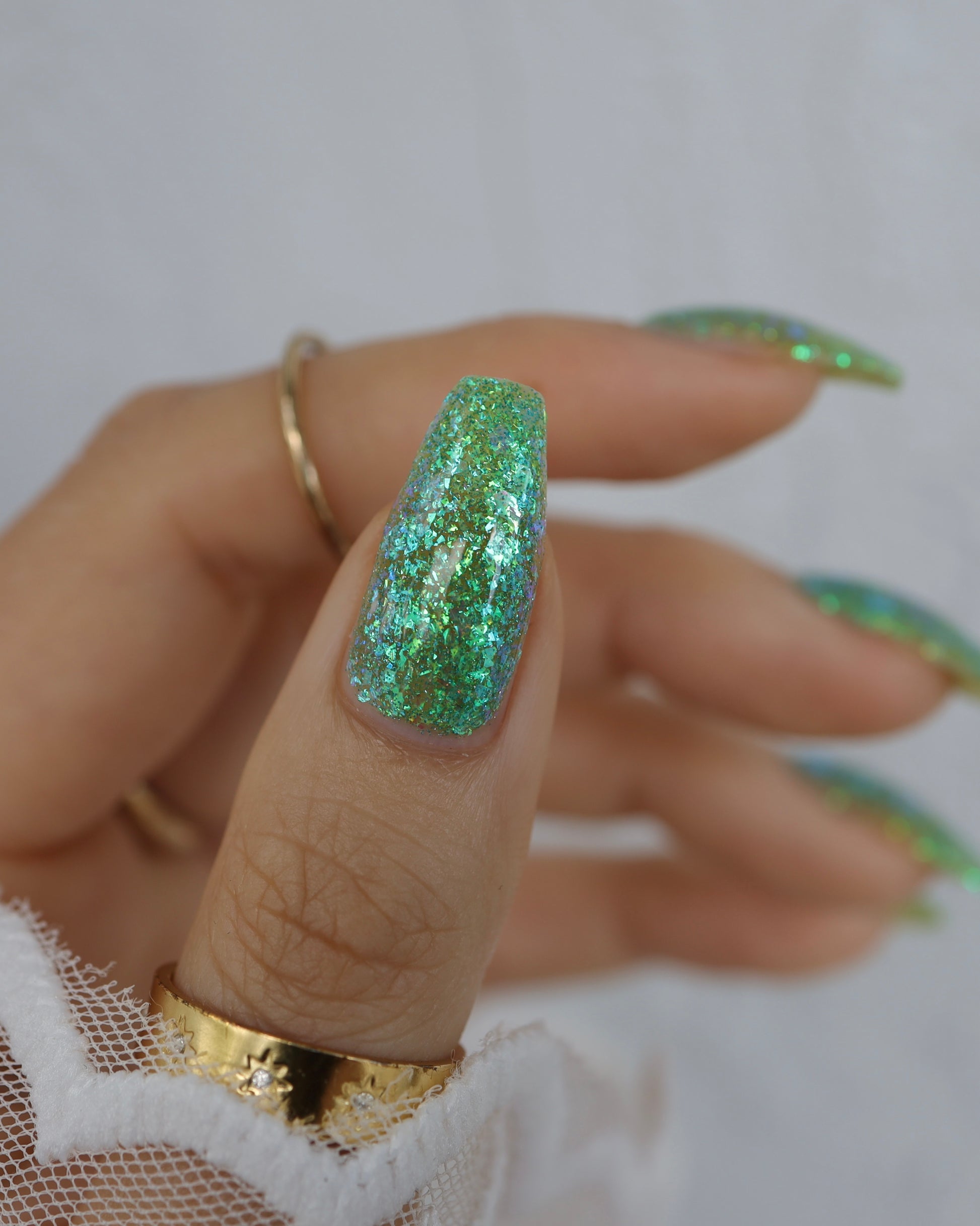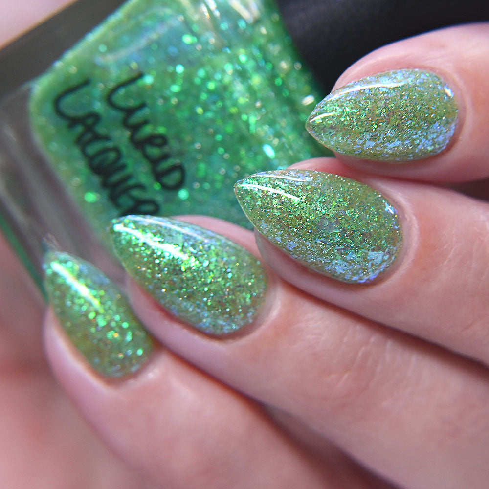 A semi-sheer yellow-leaning green base with light blue reflective glitter and iridescent flakies that shift from green to blue