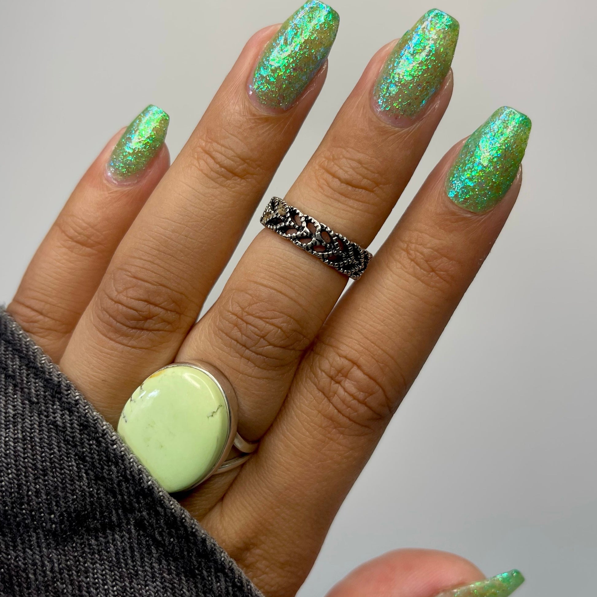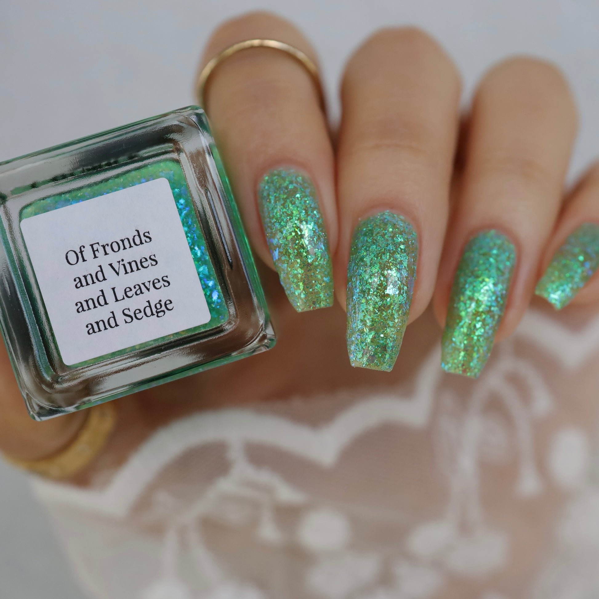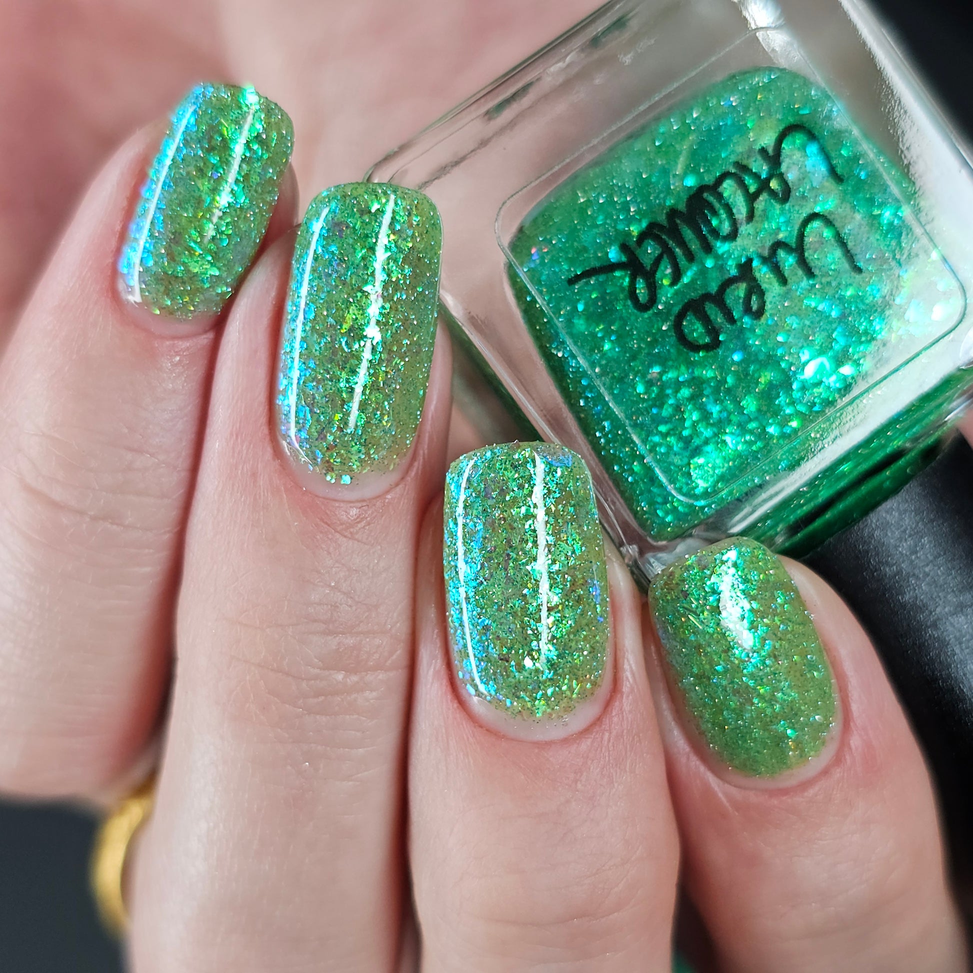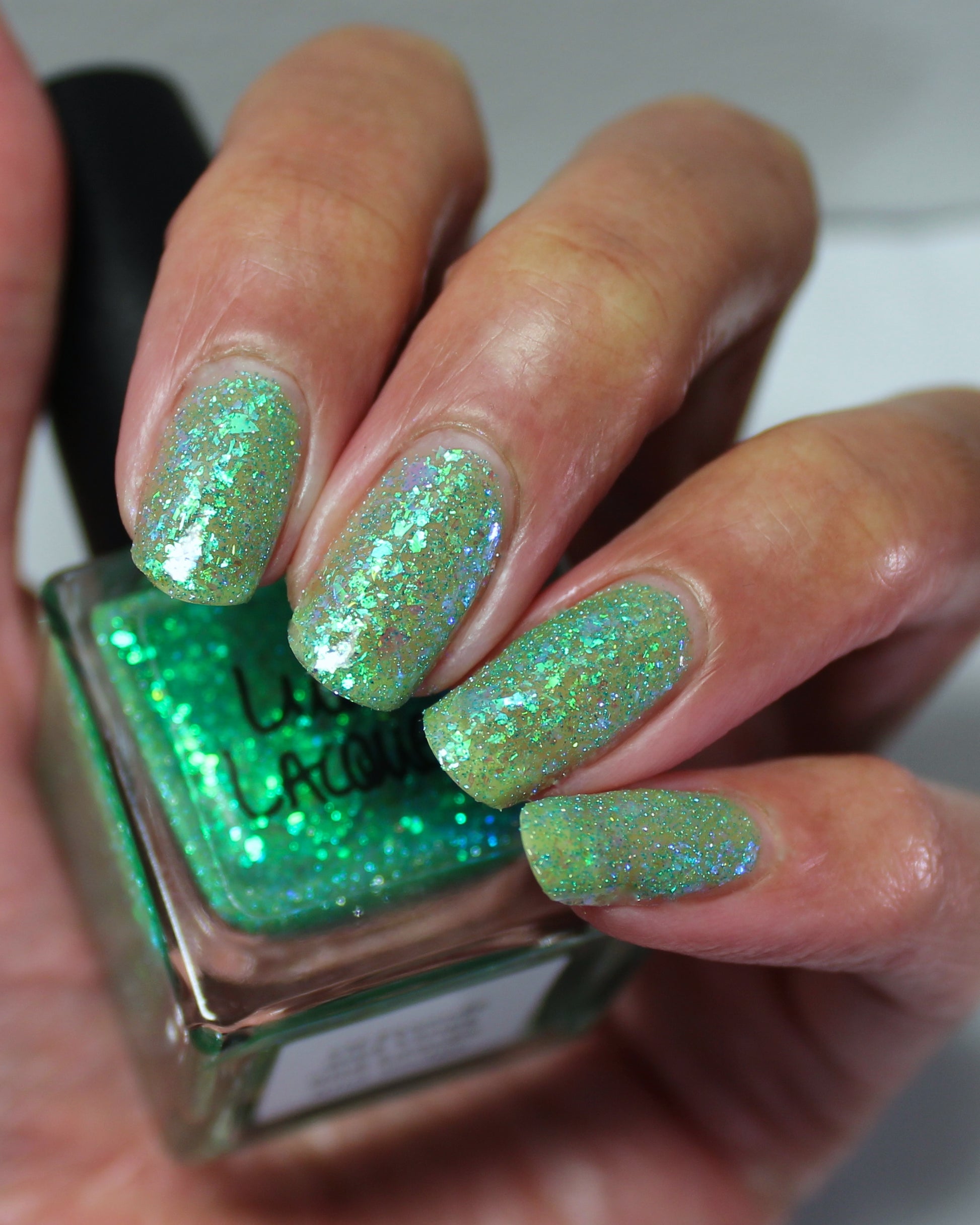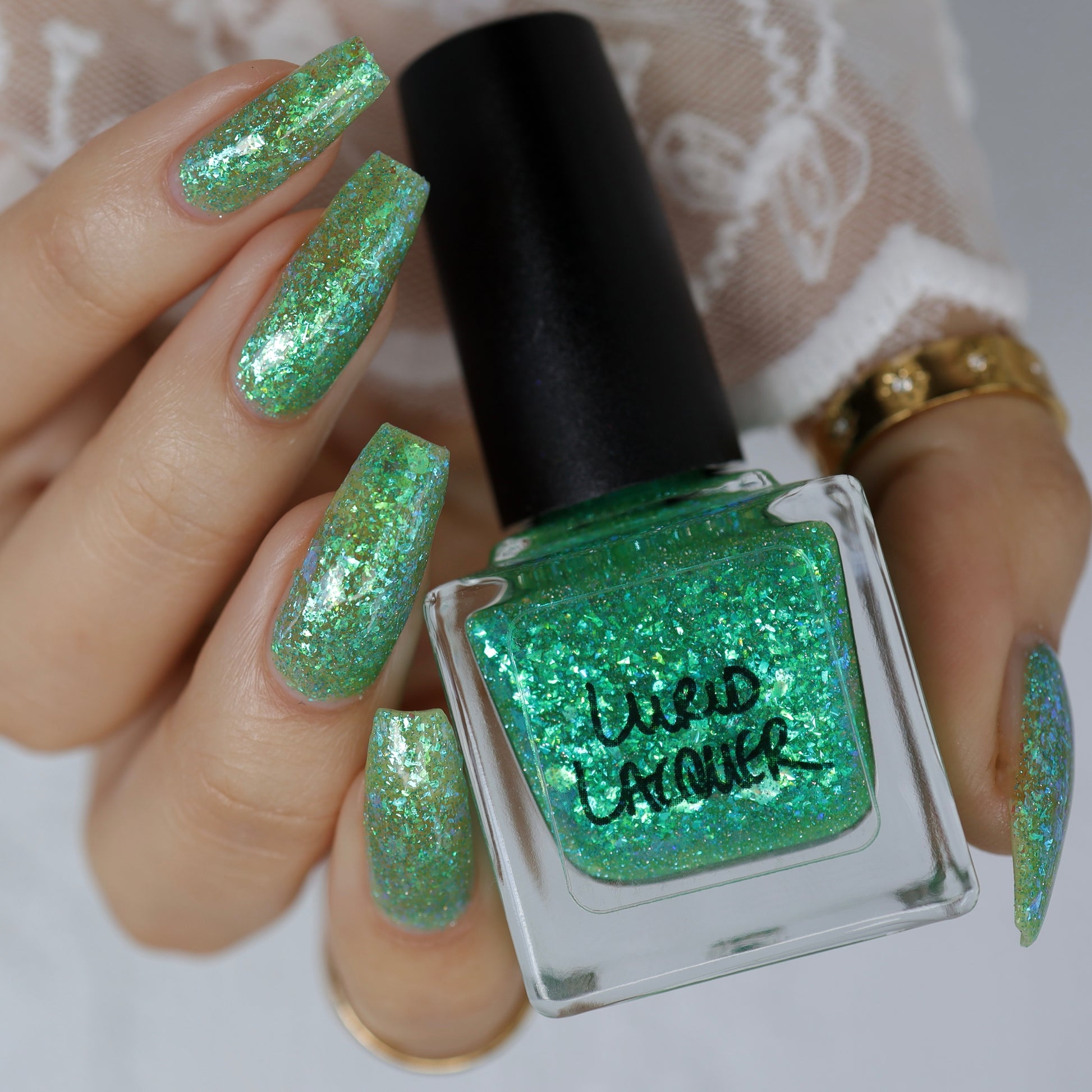 A semi-sheer yellow-leaning green base with light blue reflective glitter and iridescent flakies that shift from green to blue