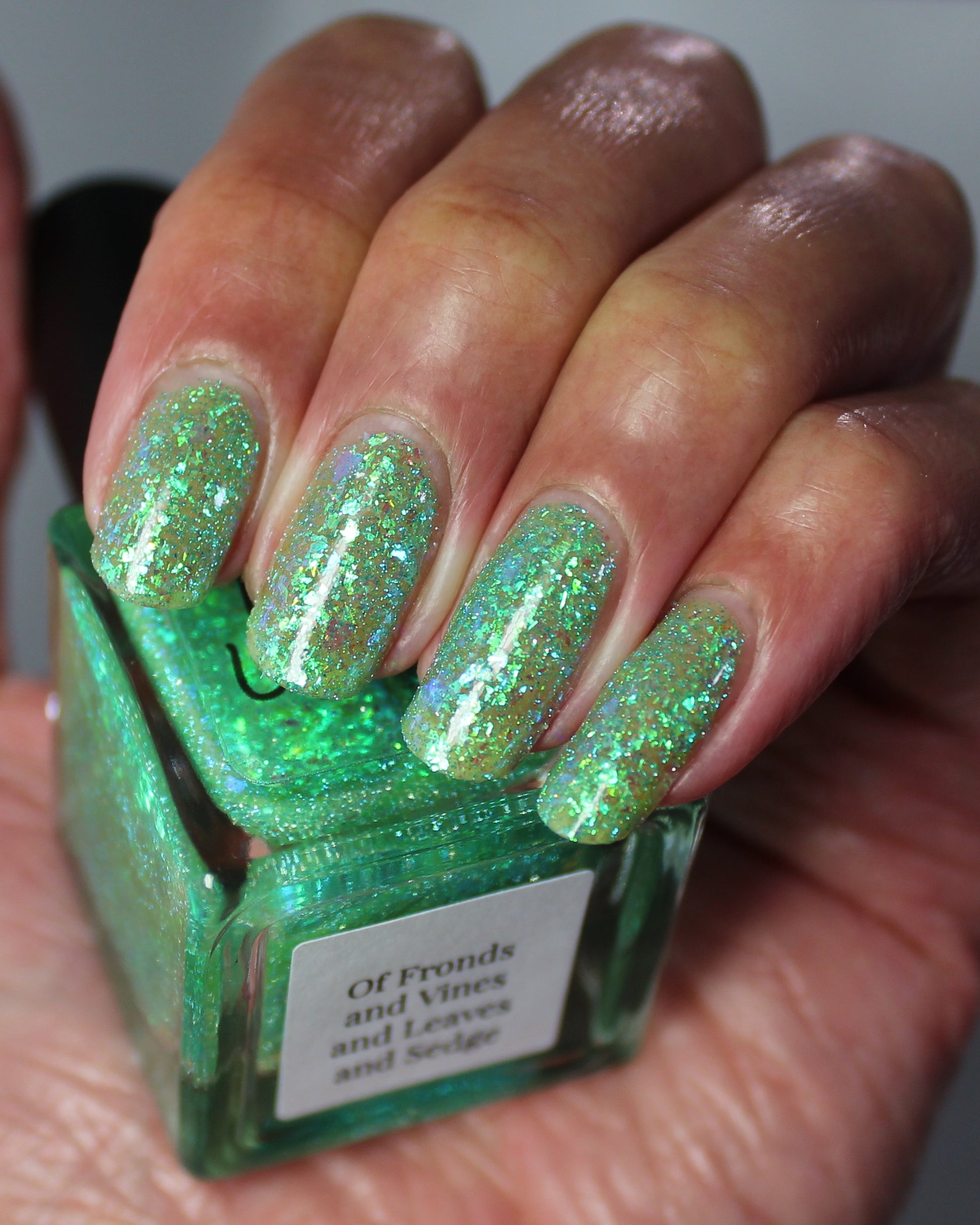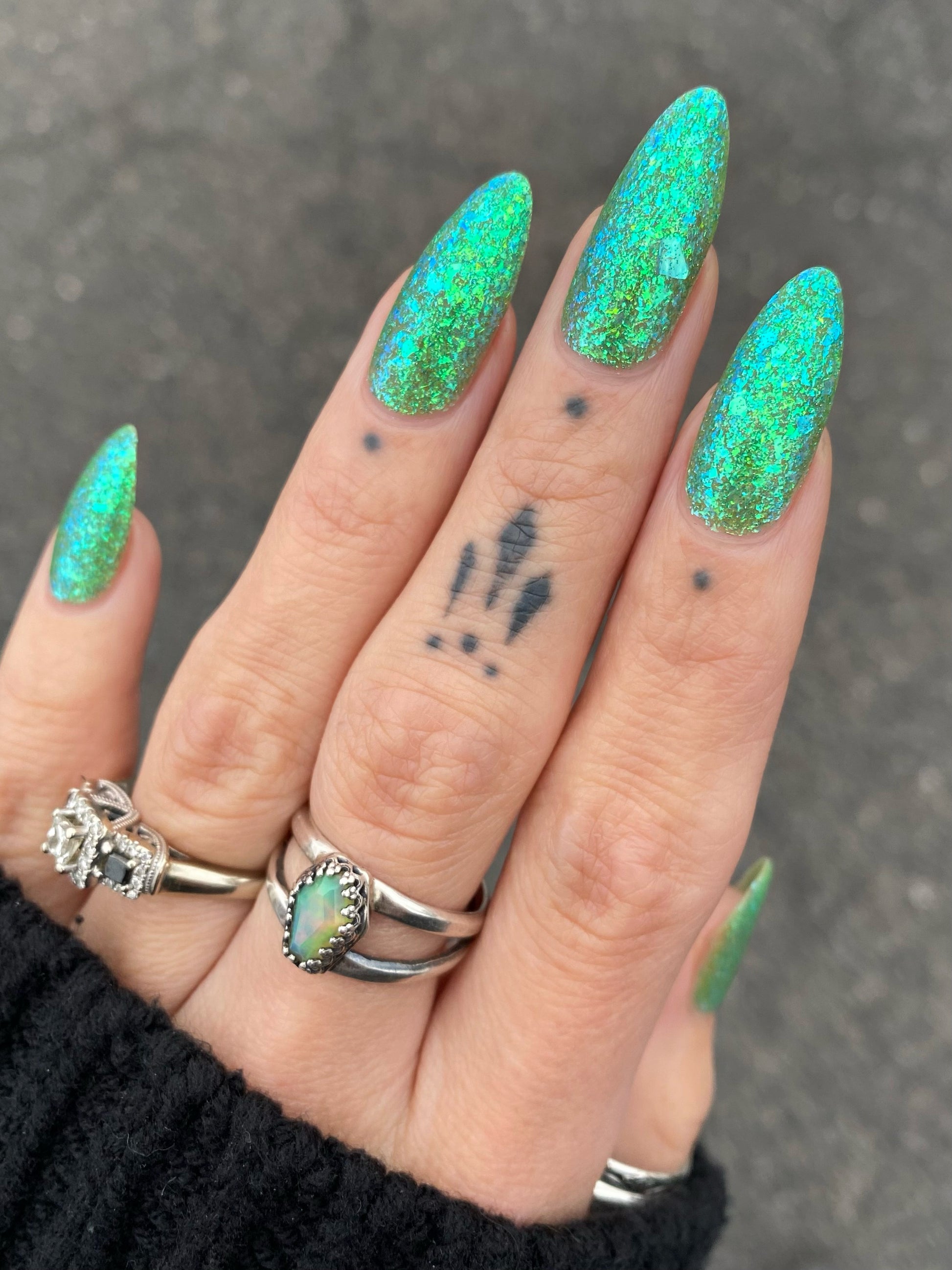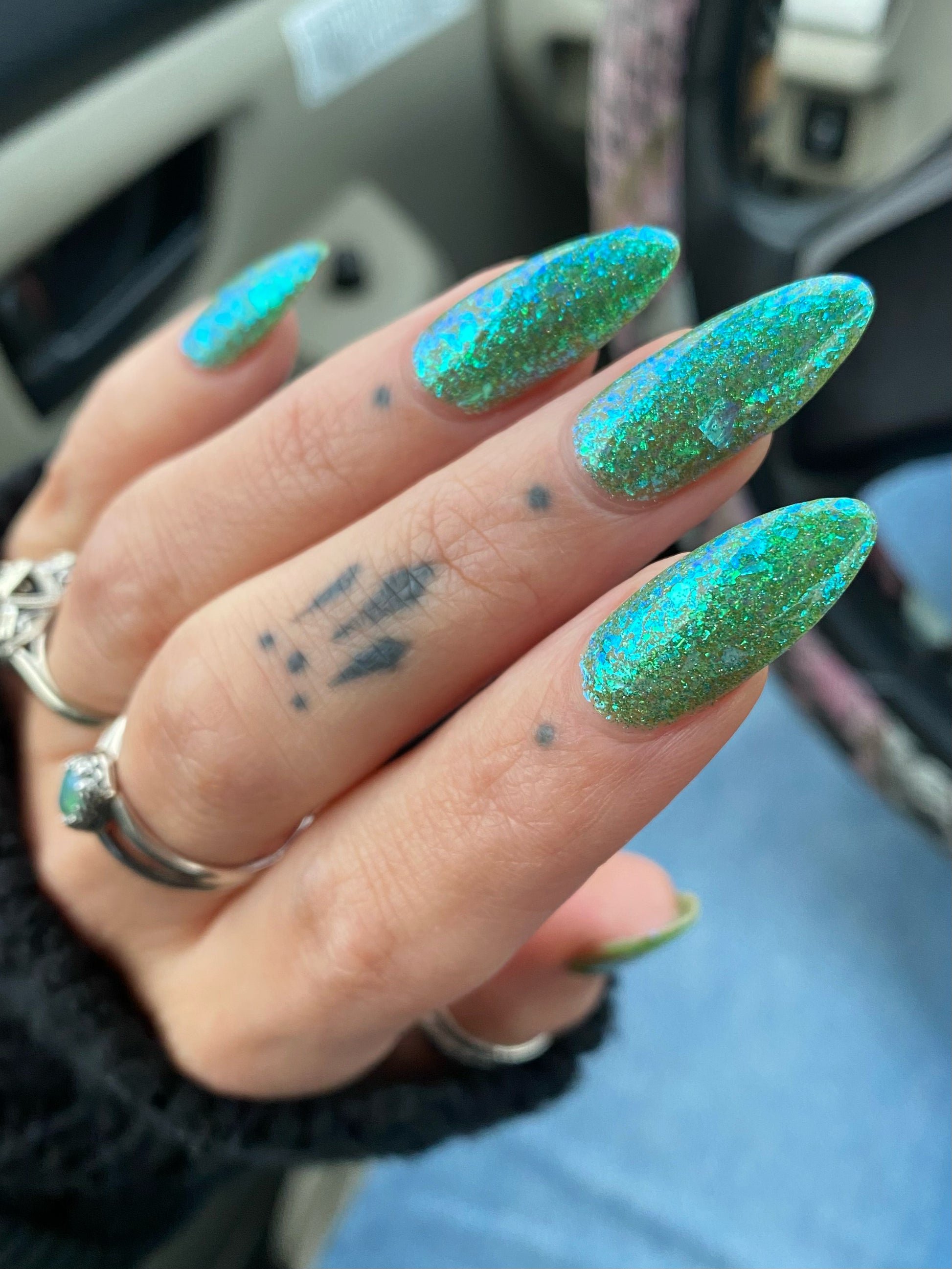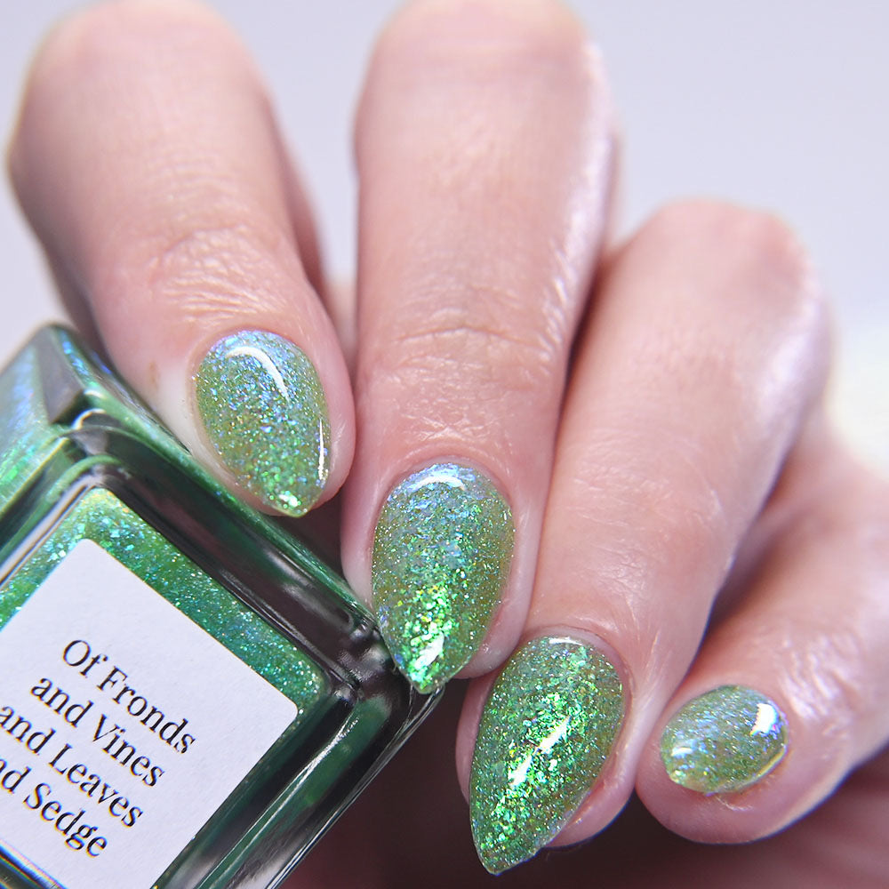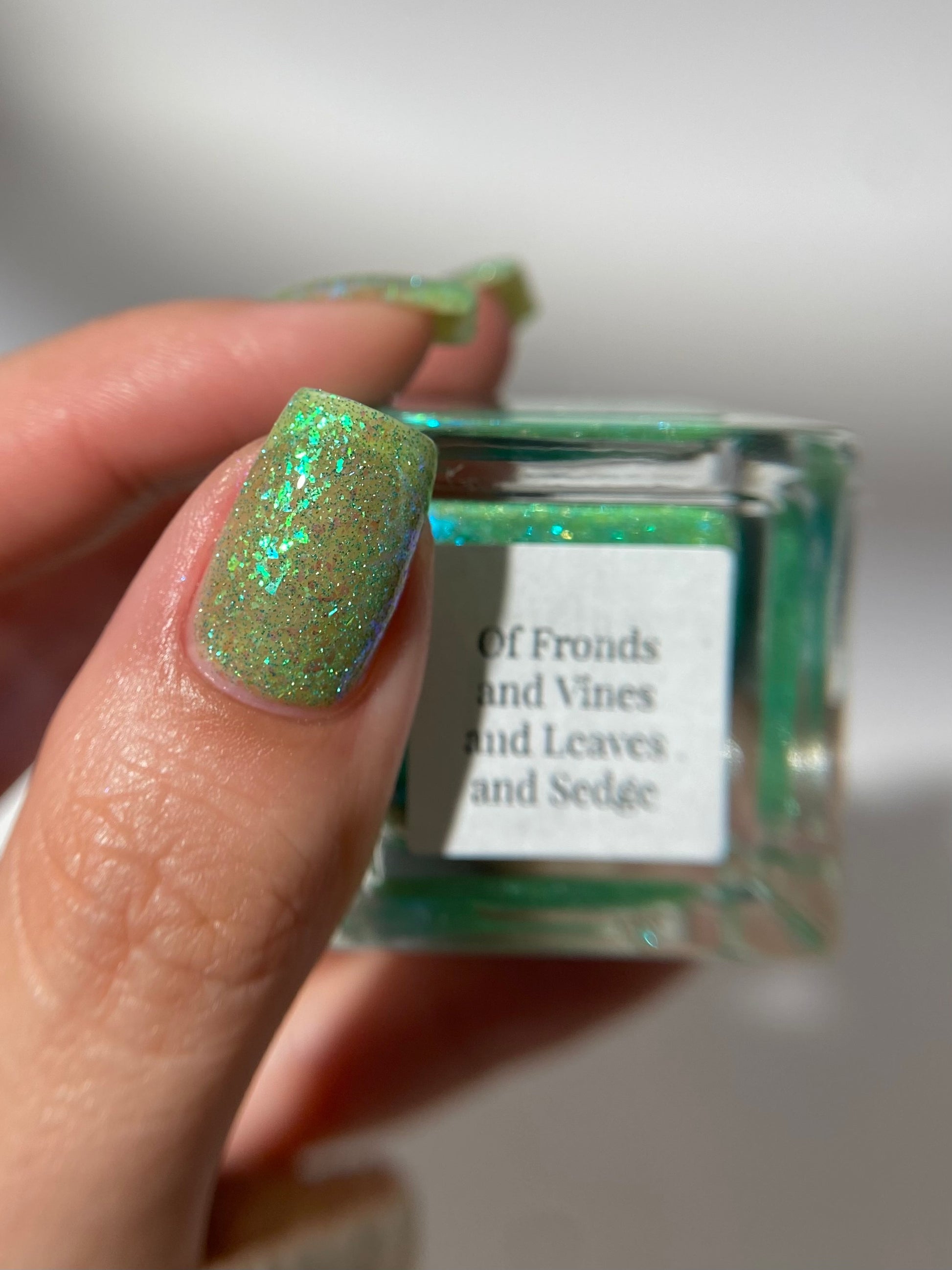 A semi-sheer yellow-leaning green base with light blue reflective glitter and iridescent flakies that shift from green to blue