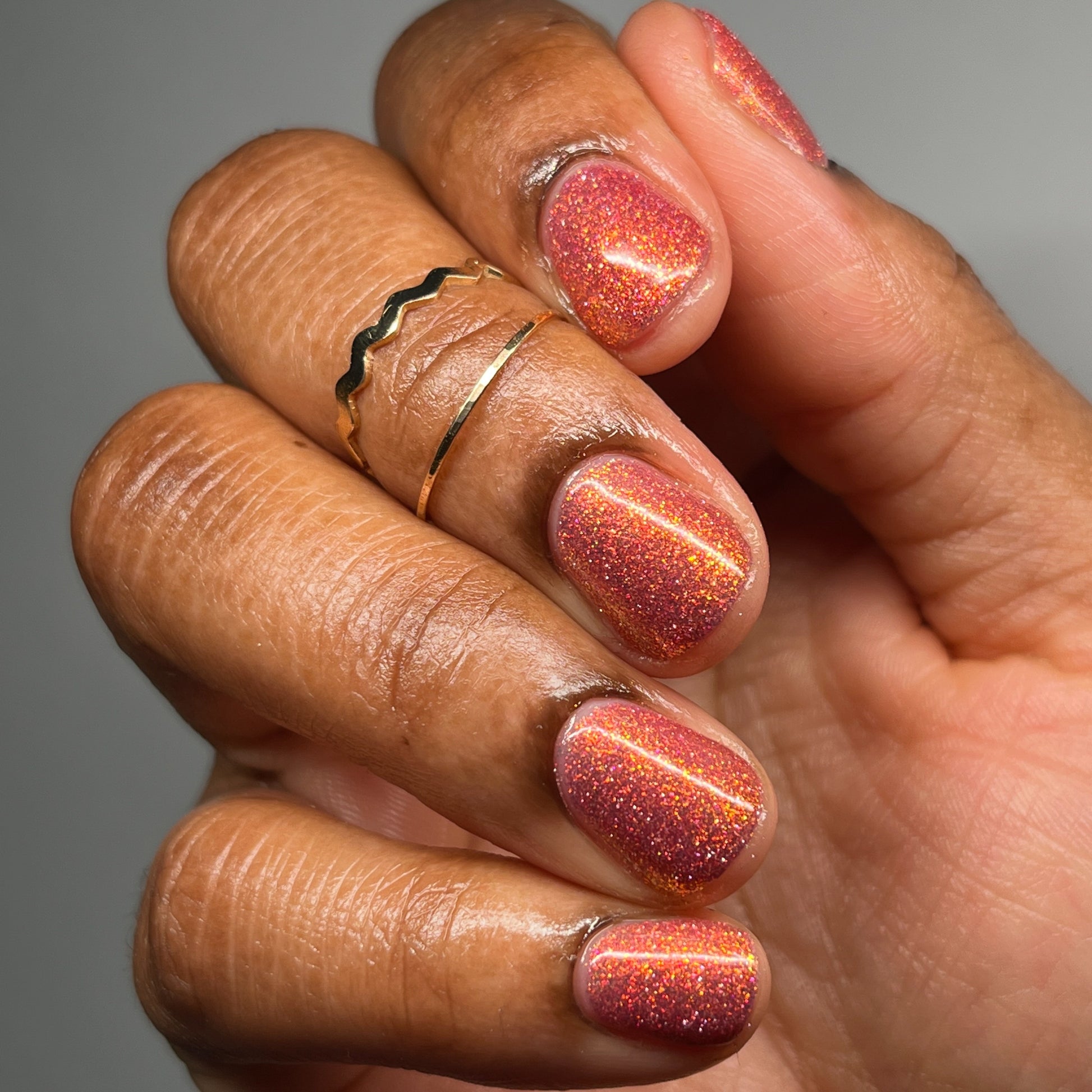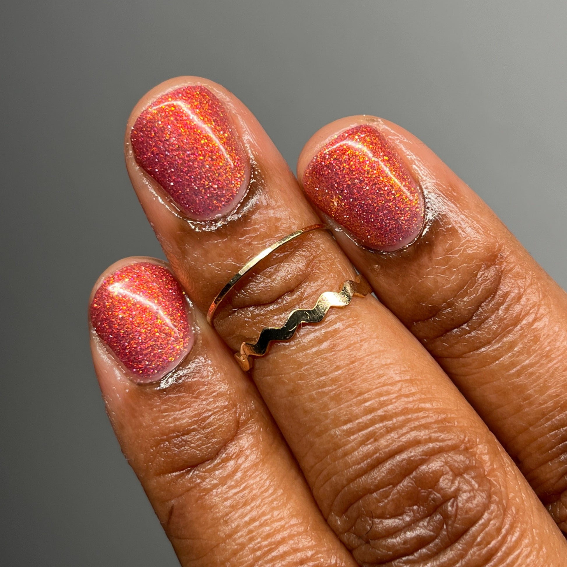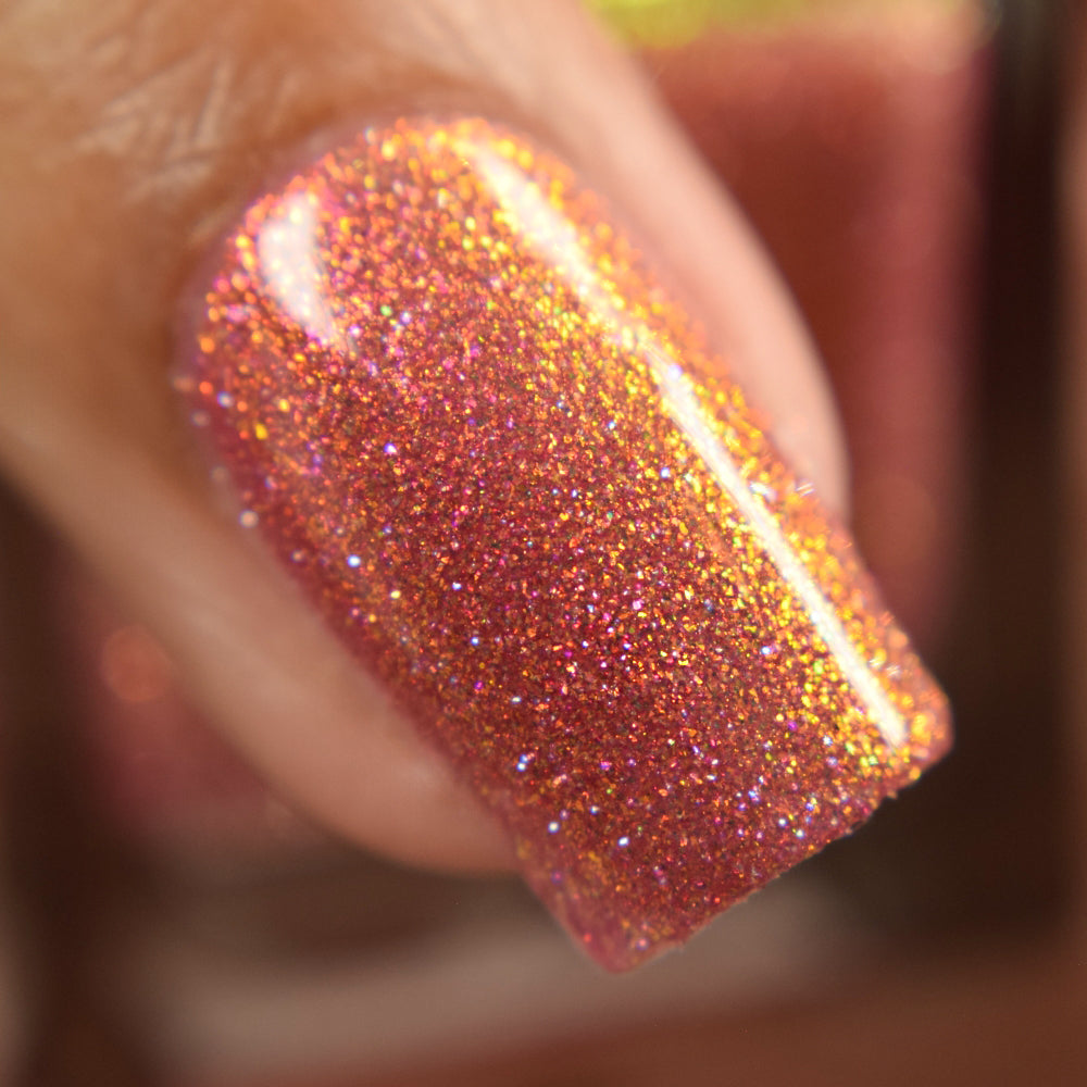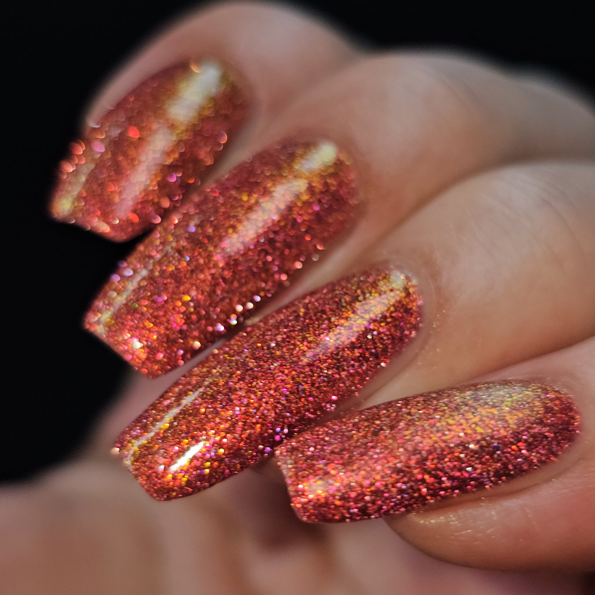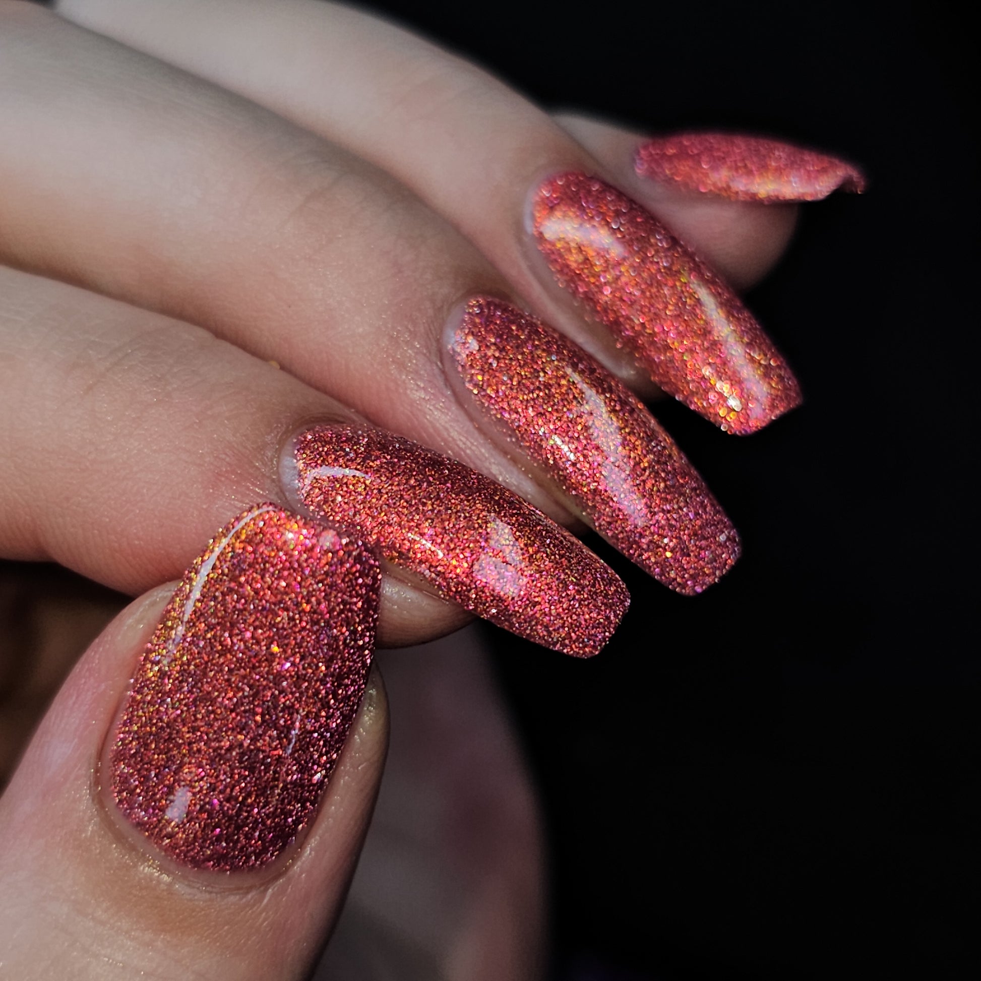 A red coral jelly base with vibrant aurora microflake that shifts from orange to gold to green and coral light reflective glitter