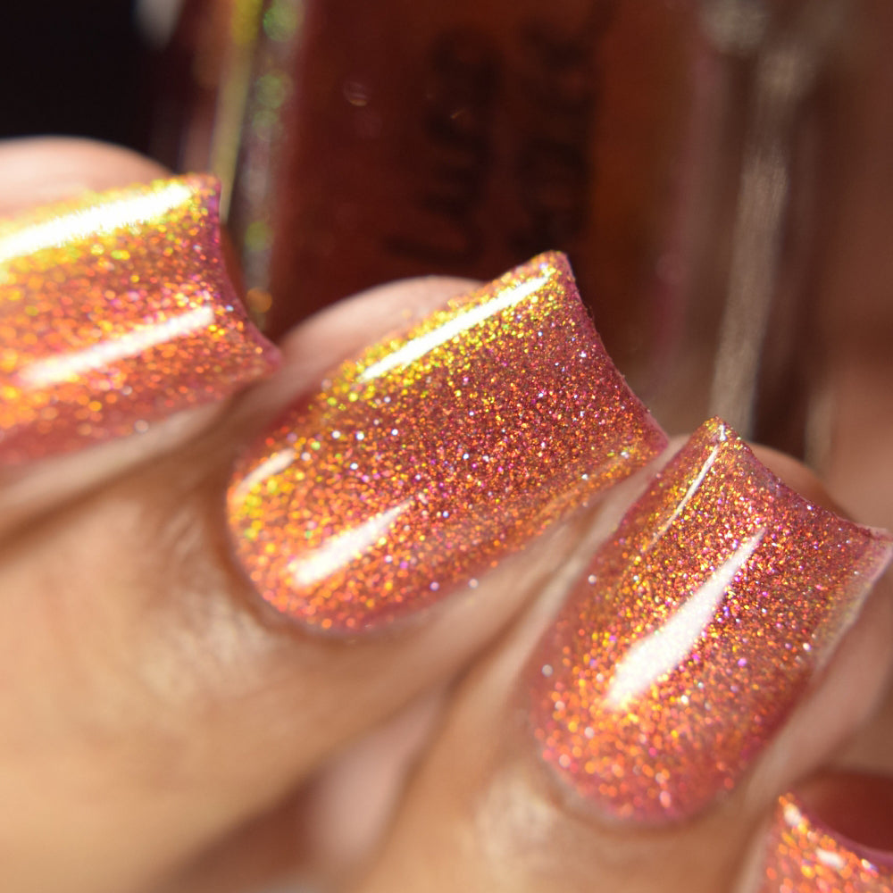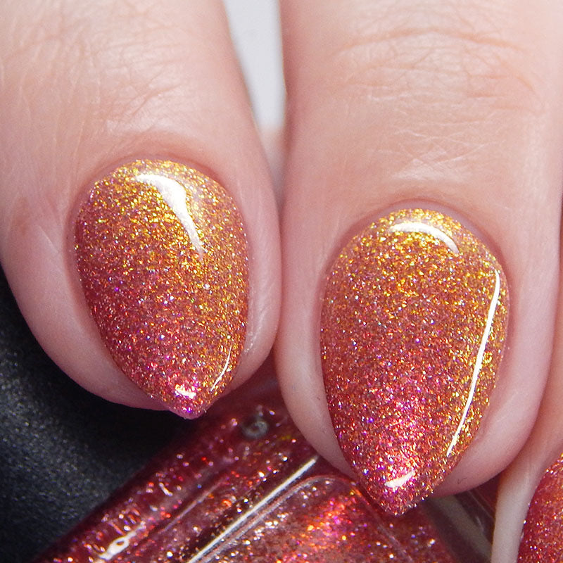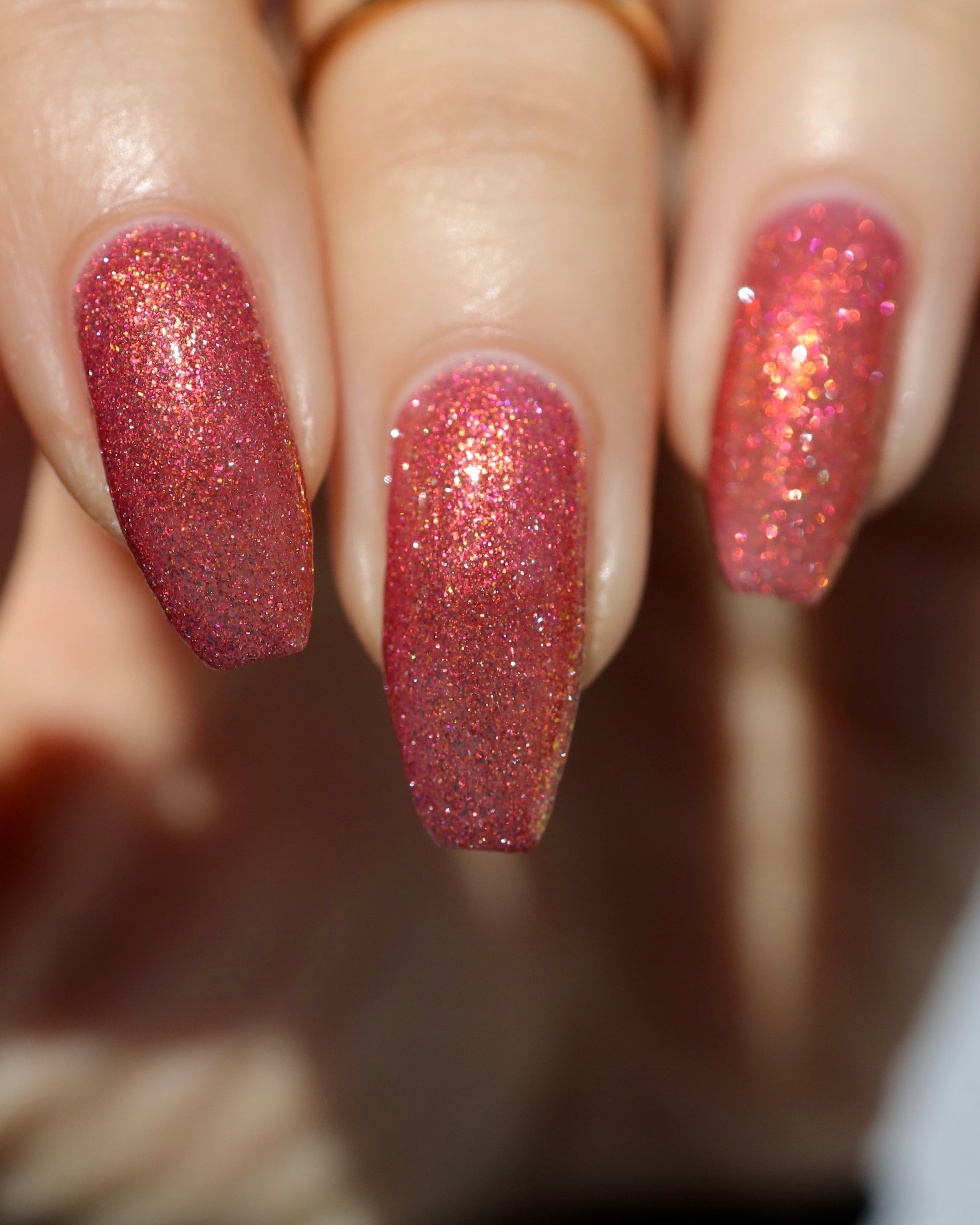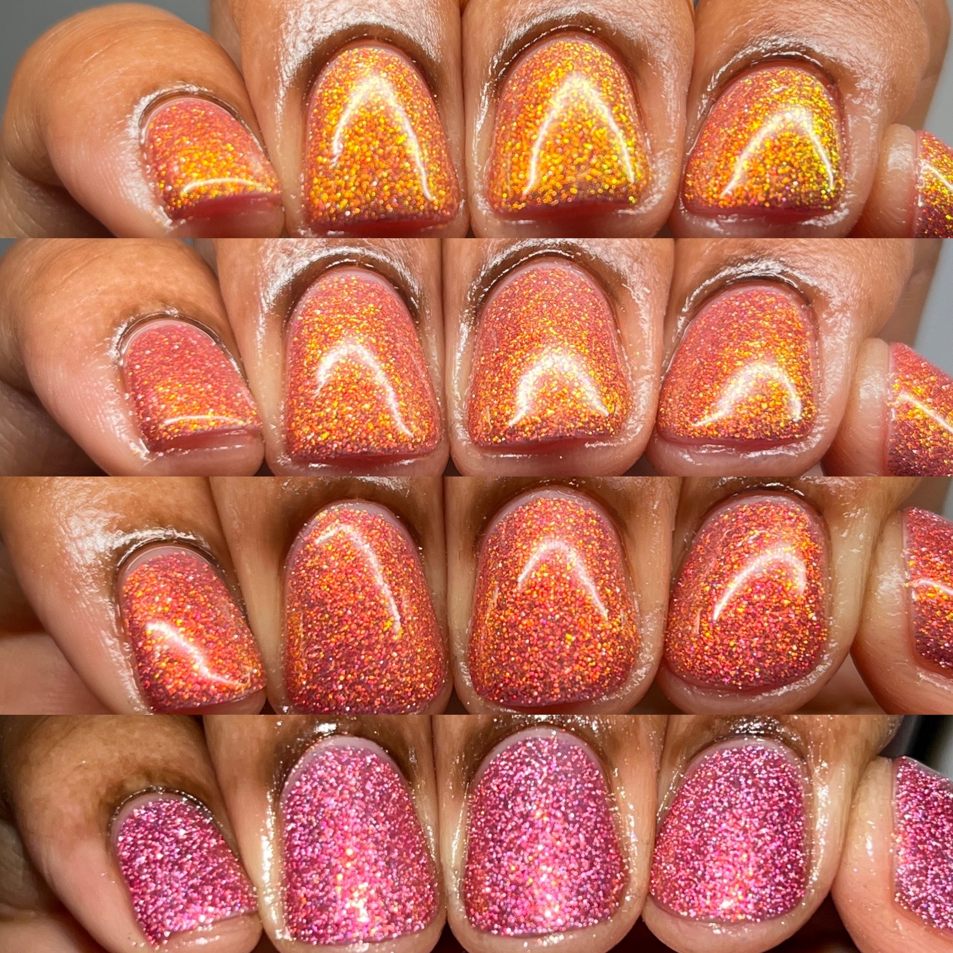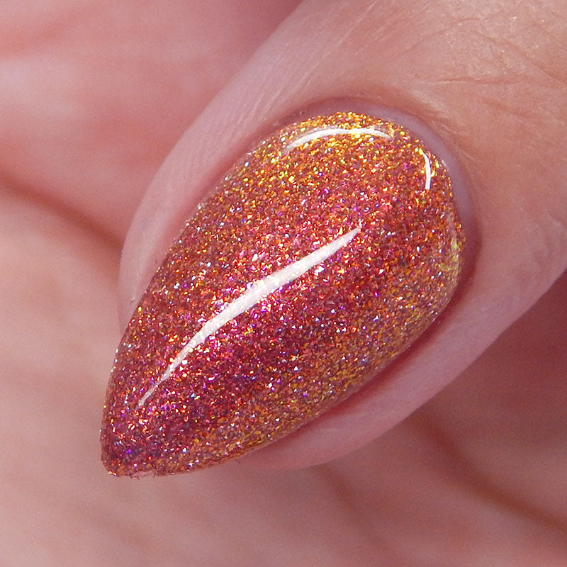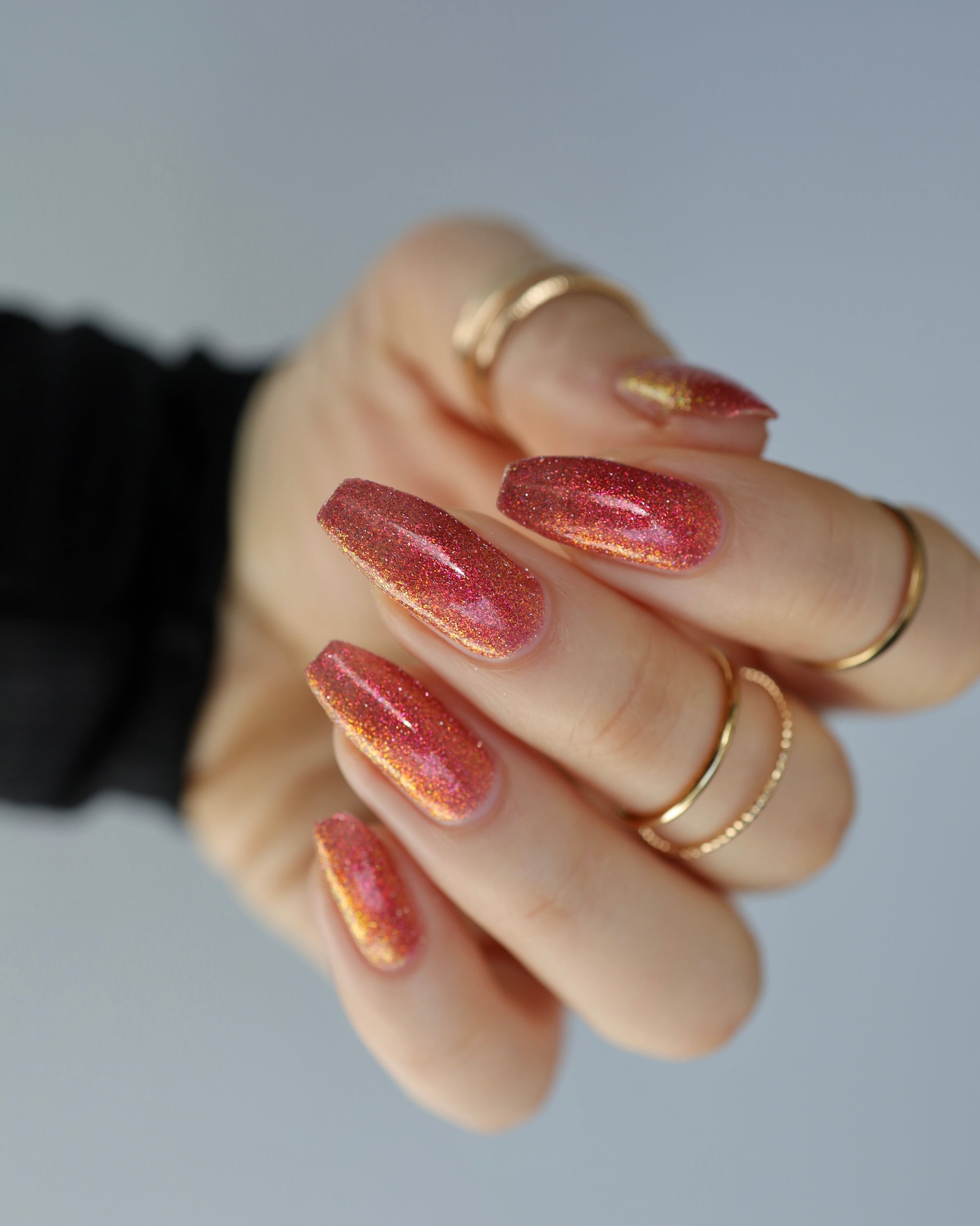 A red coral jelly base with vibrant aurora microflake that shifts from orange to gold to green and coral light reflective glitter
