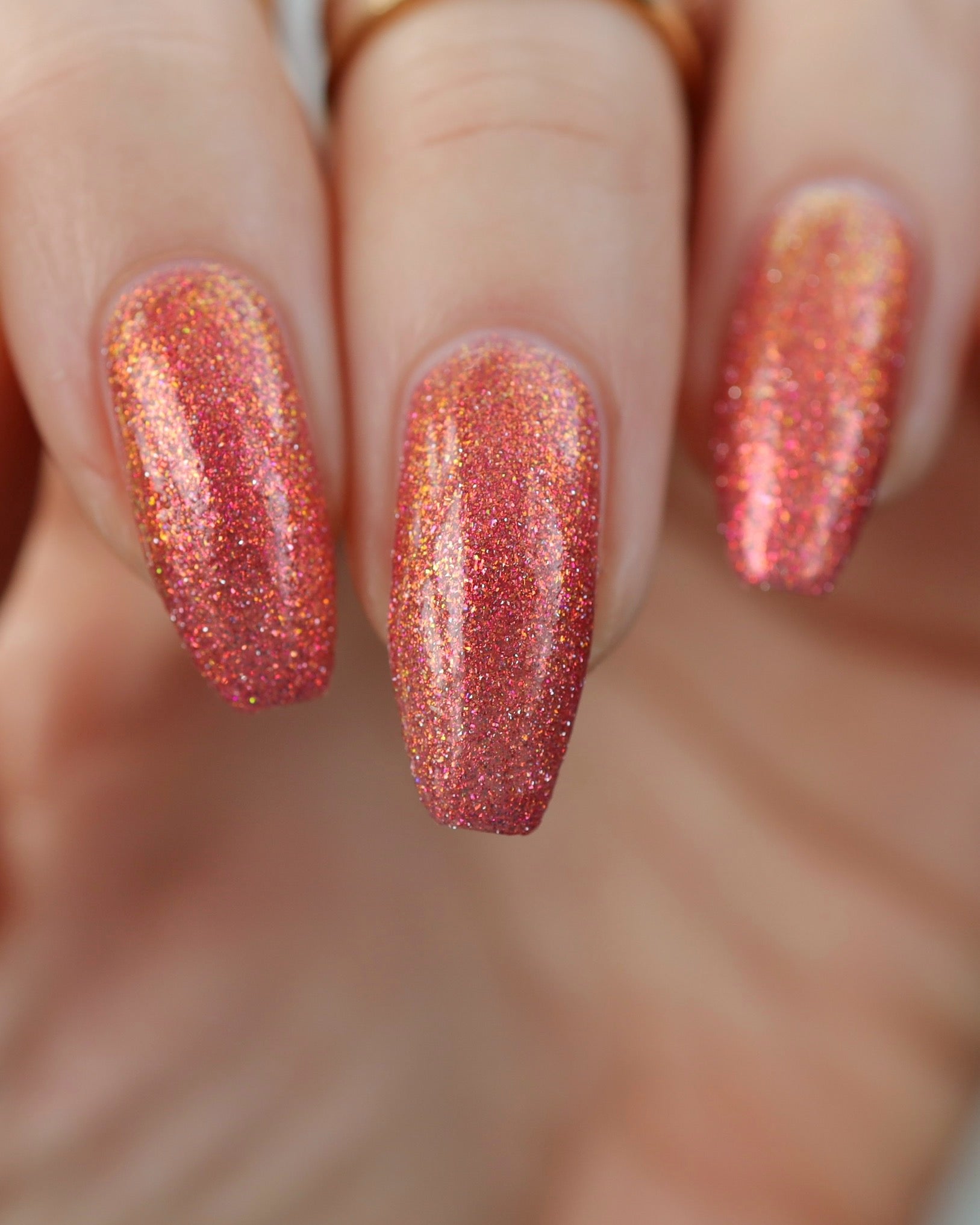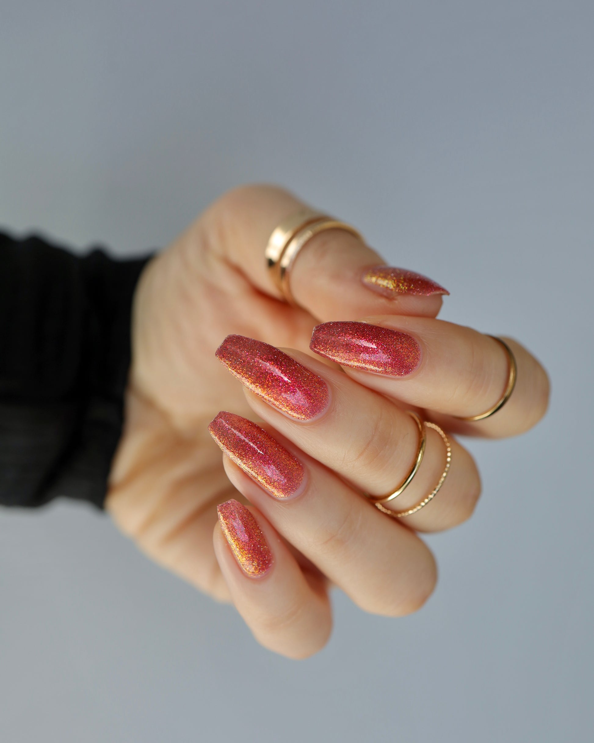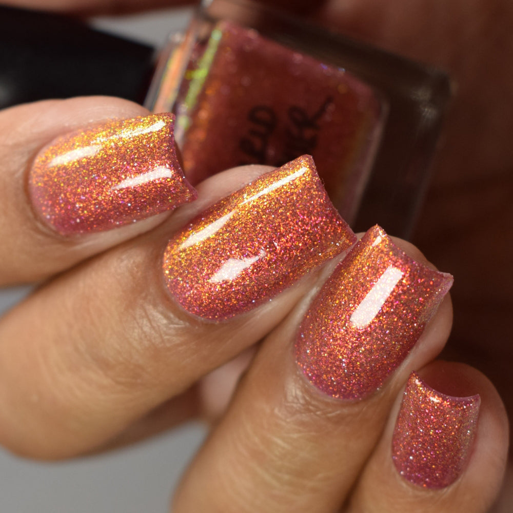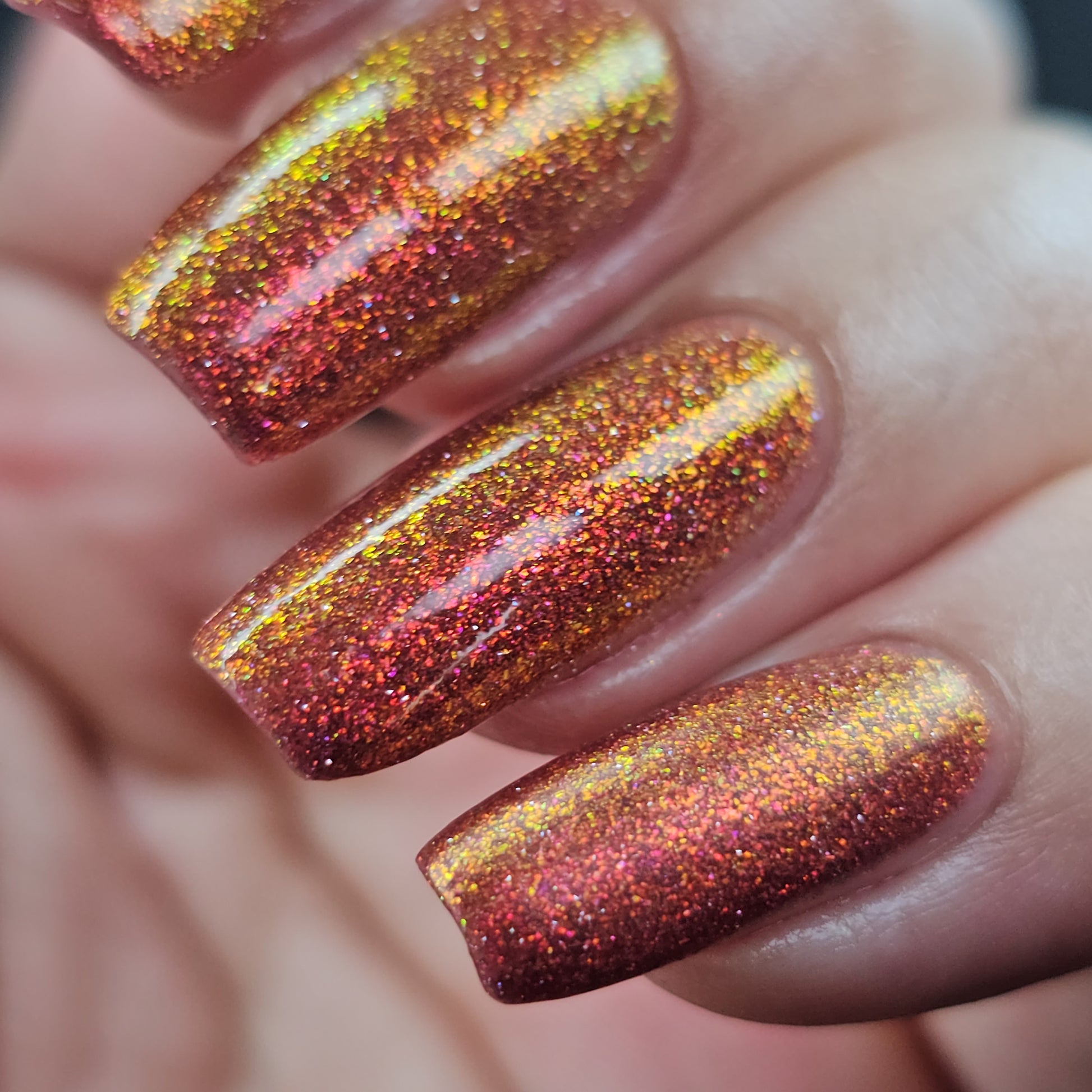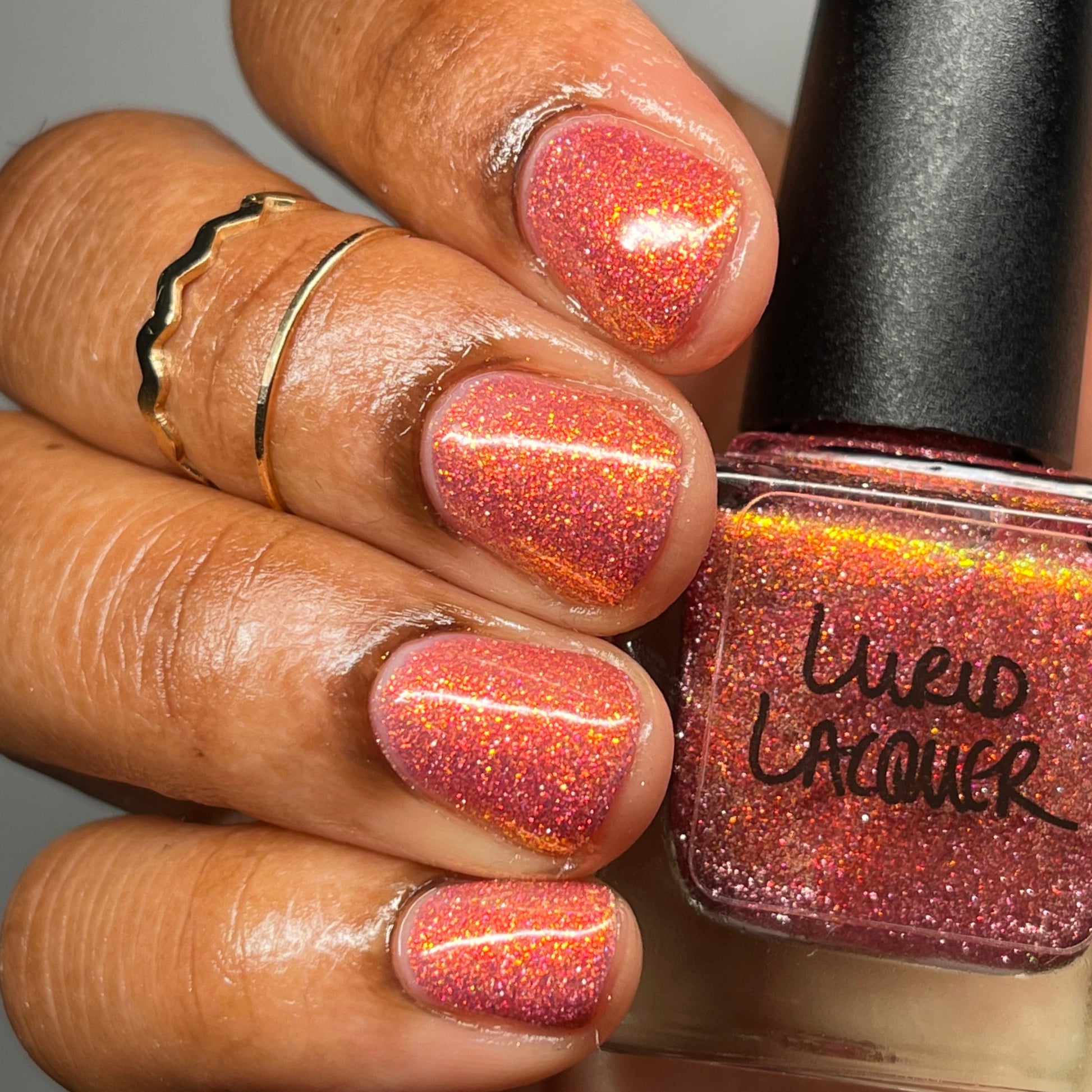 A red coral jelly base with vibrant aurora microflake that shifts from orange to gold to green and coral light reflective glitter