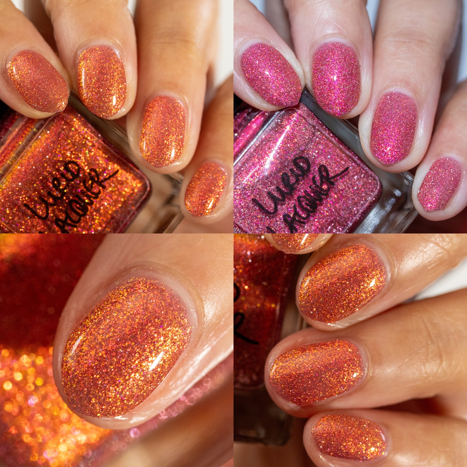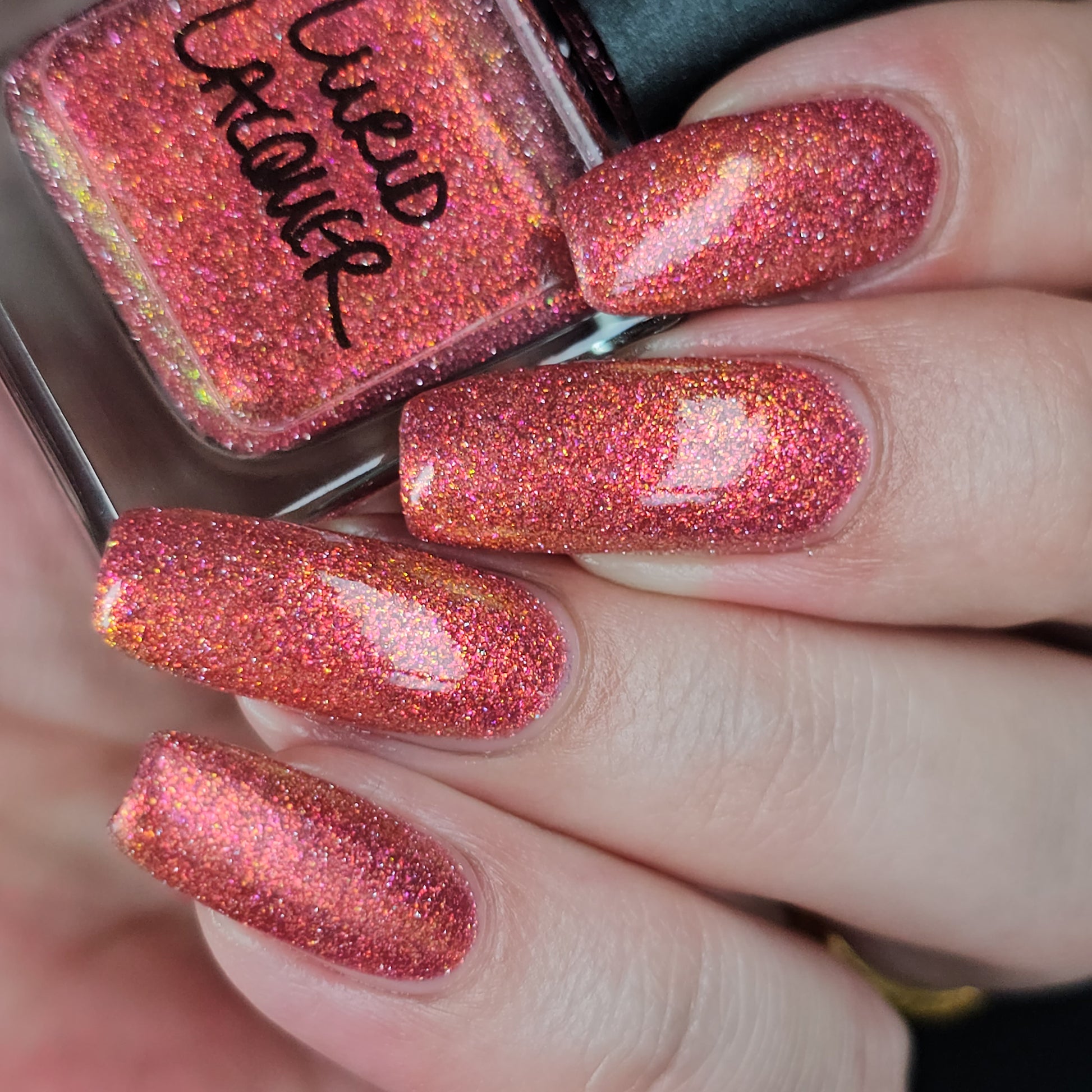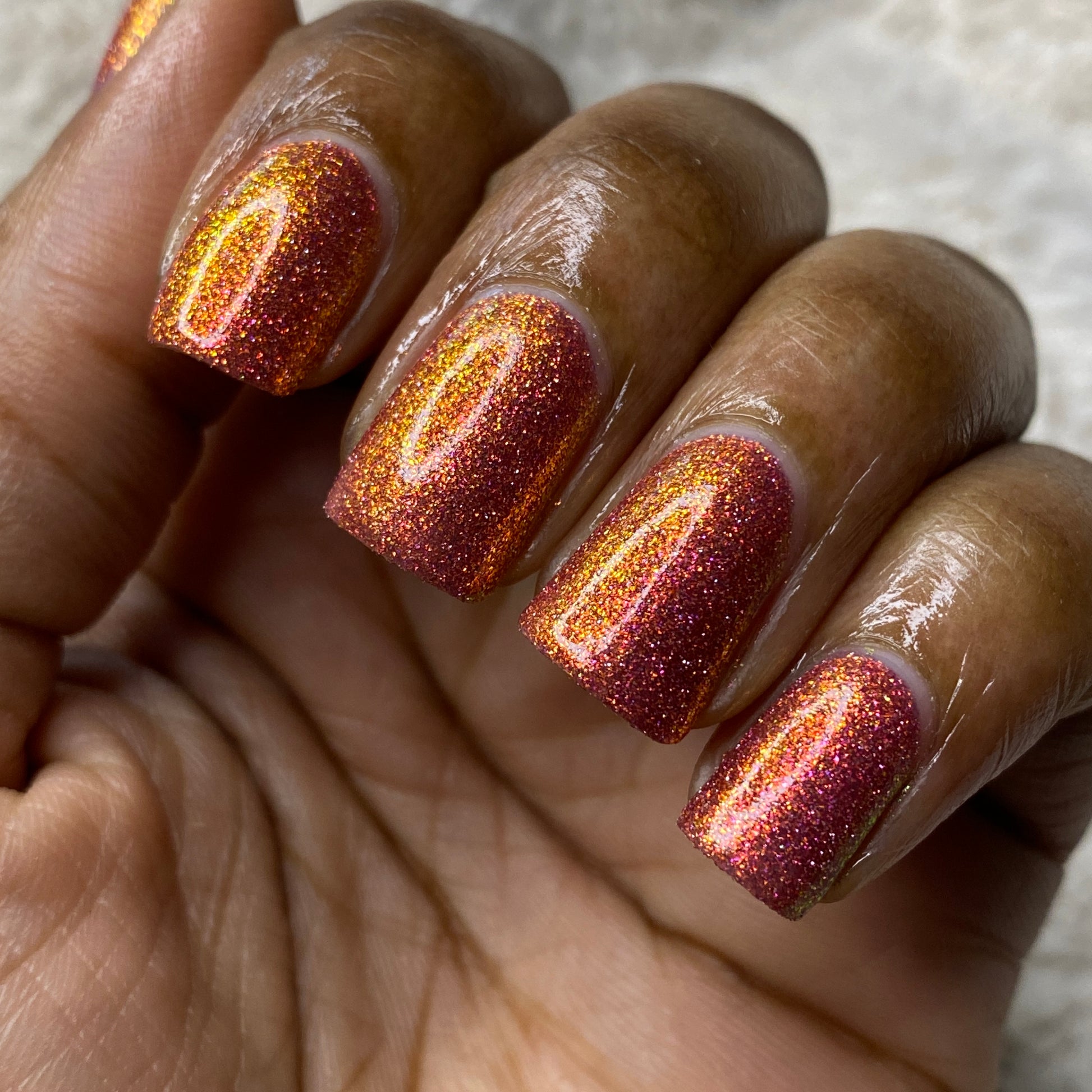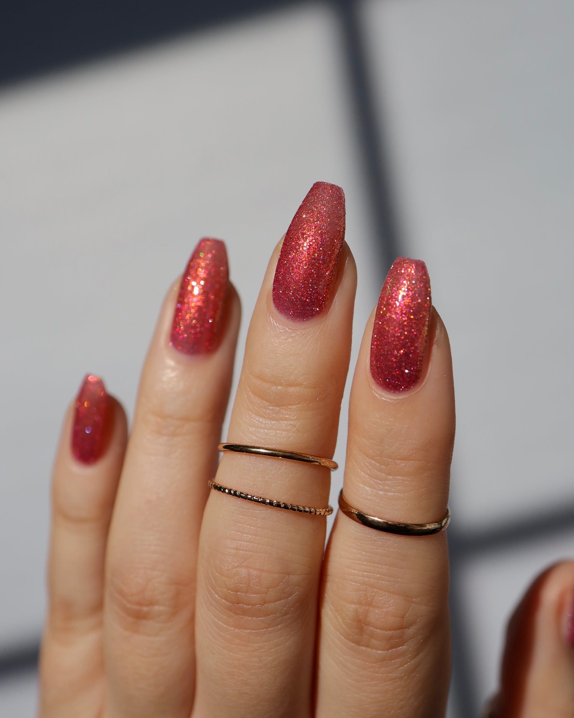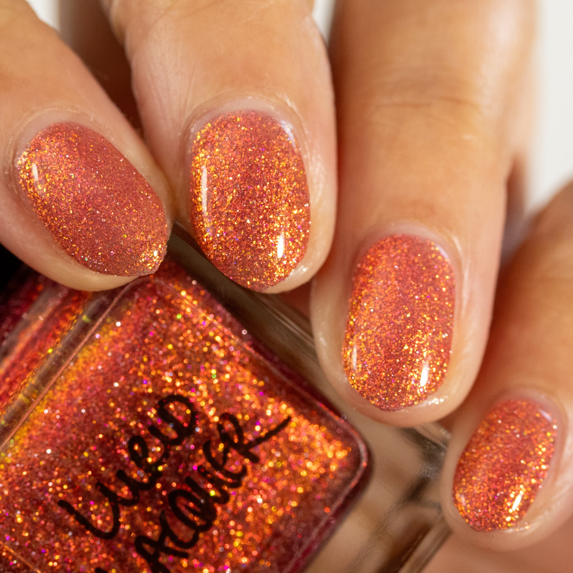 A red coral jelly base with vibrant aurora microflake that shifts from orange to gold to green and coral light reflective glitter