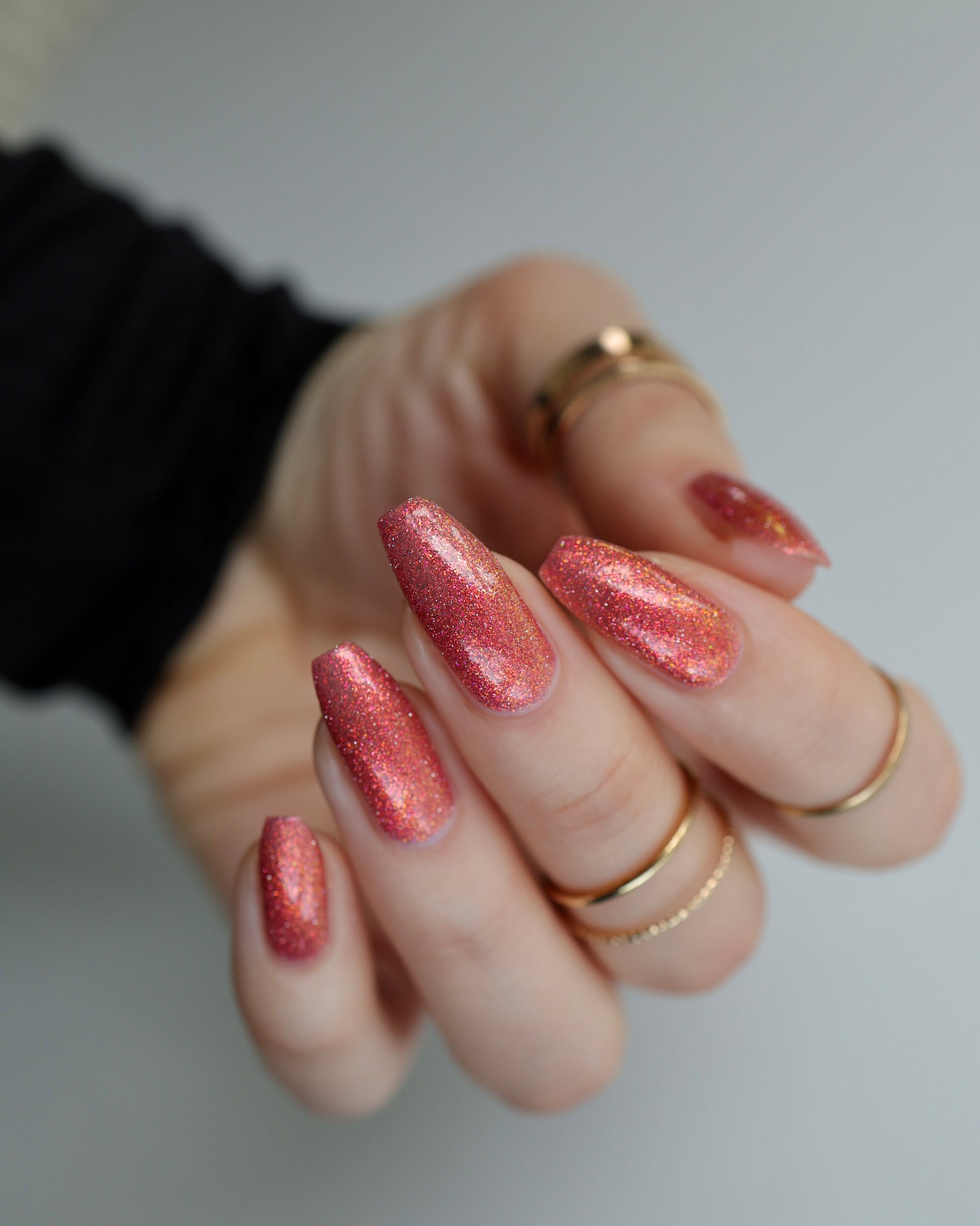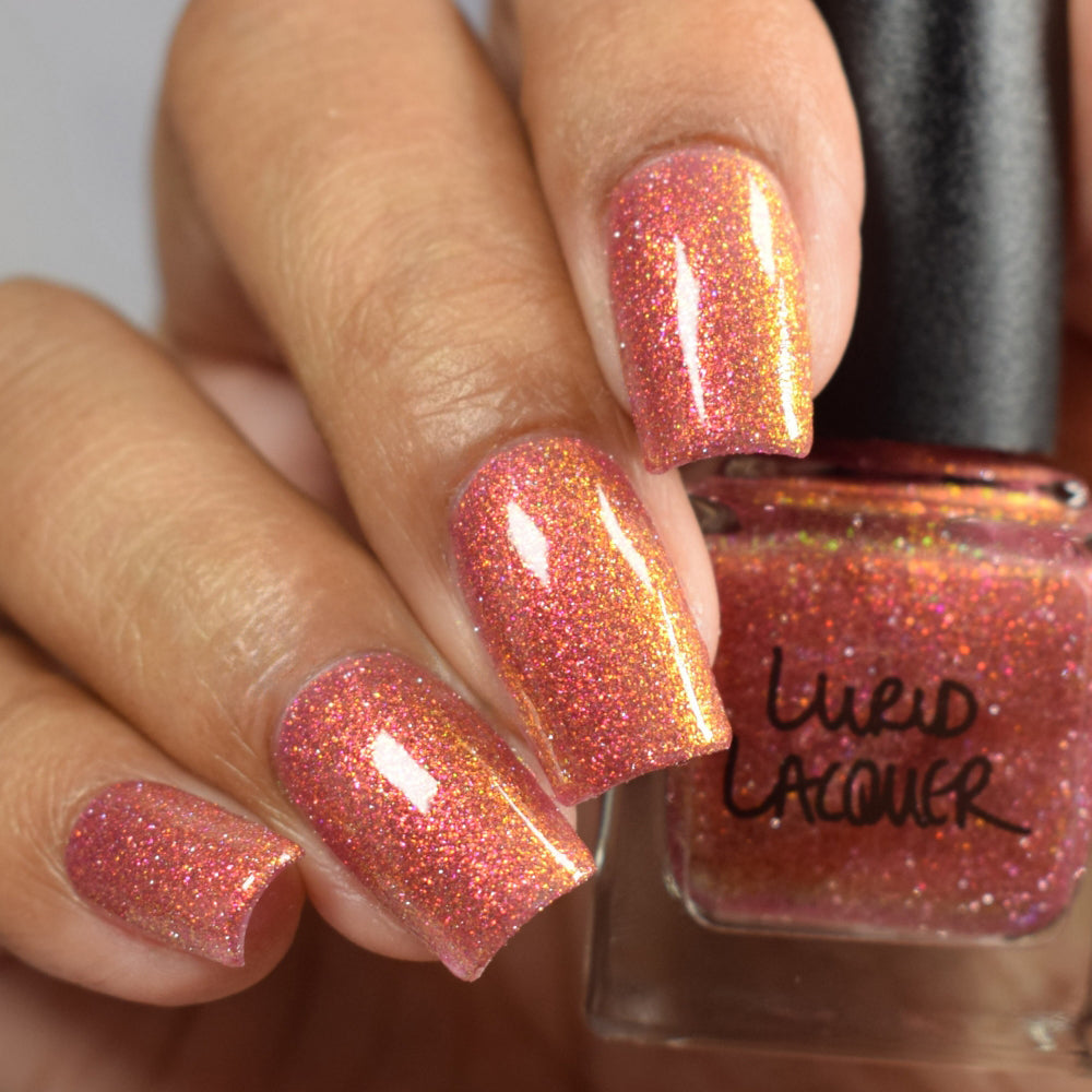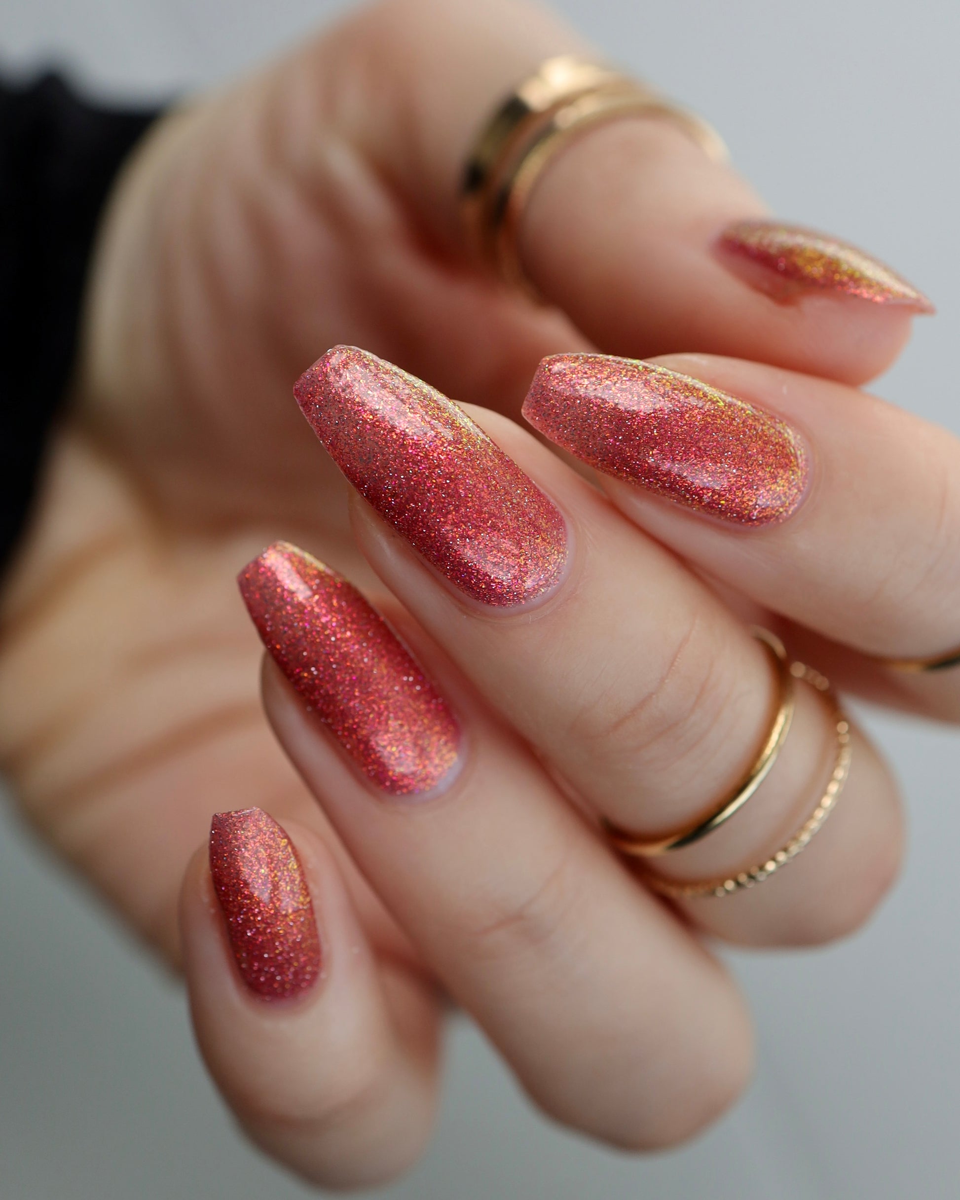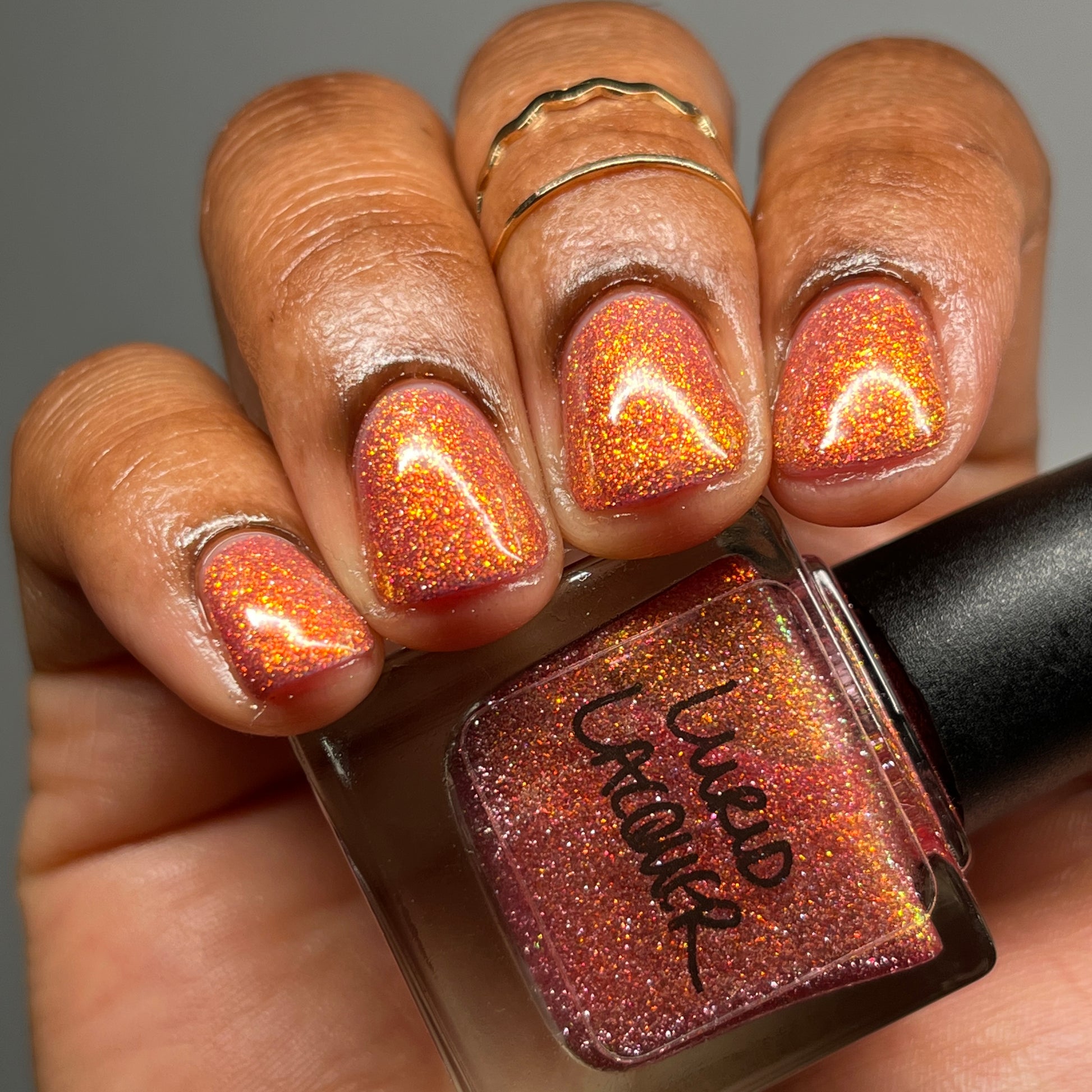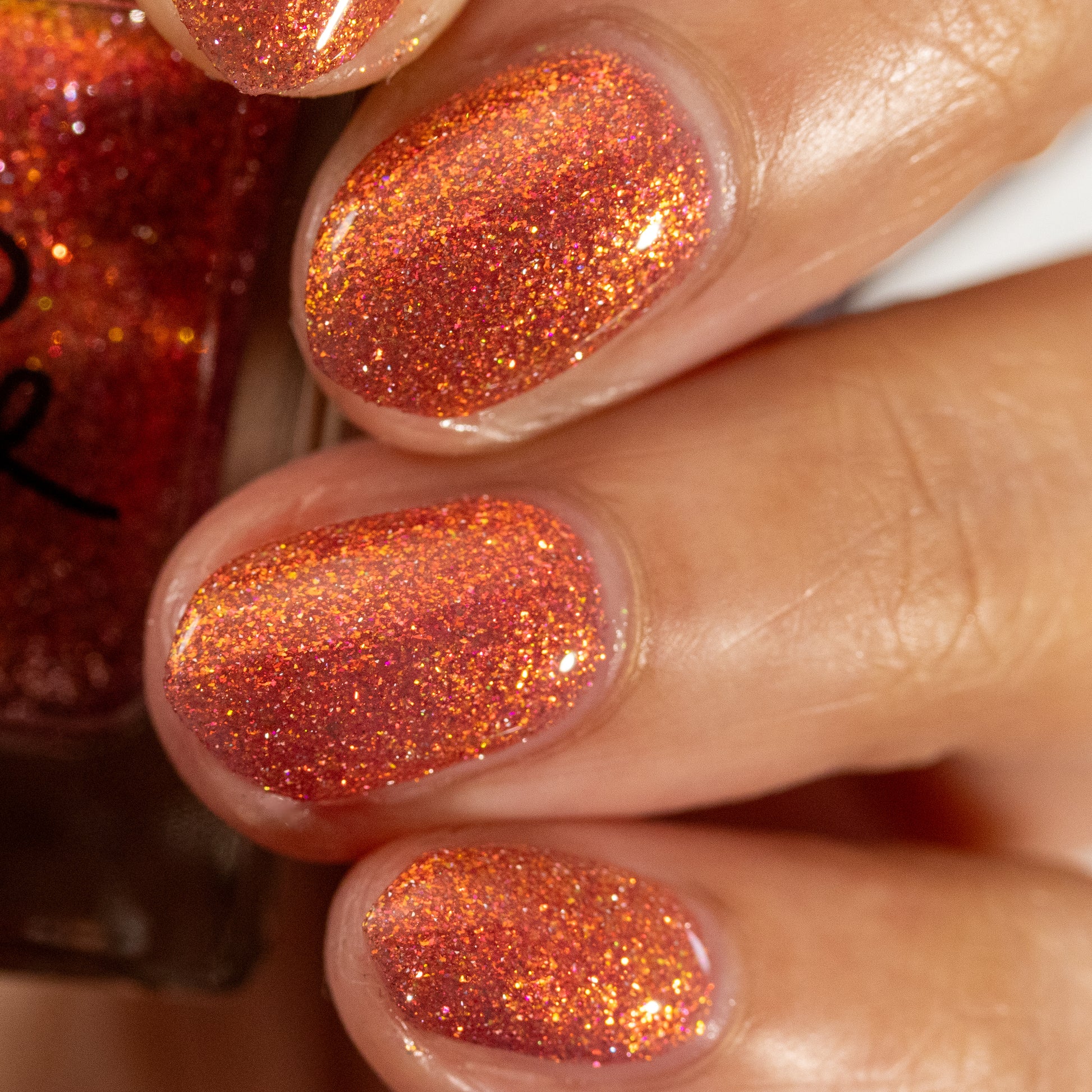 A red coral jelly base with vibrant aurora microflake that shifts from orange to gold to green and coral light reflective glitter