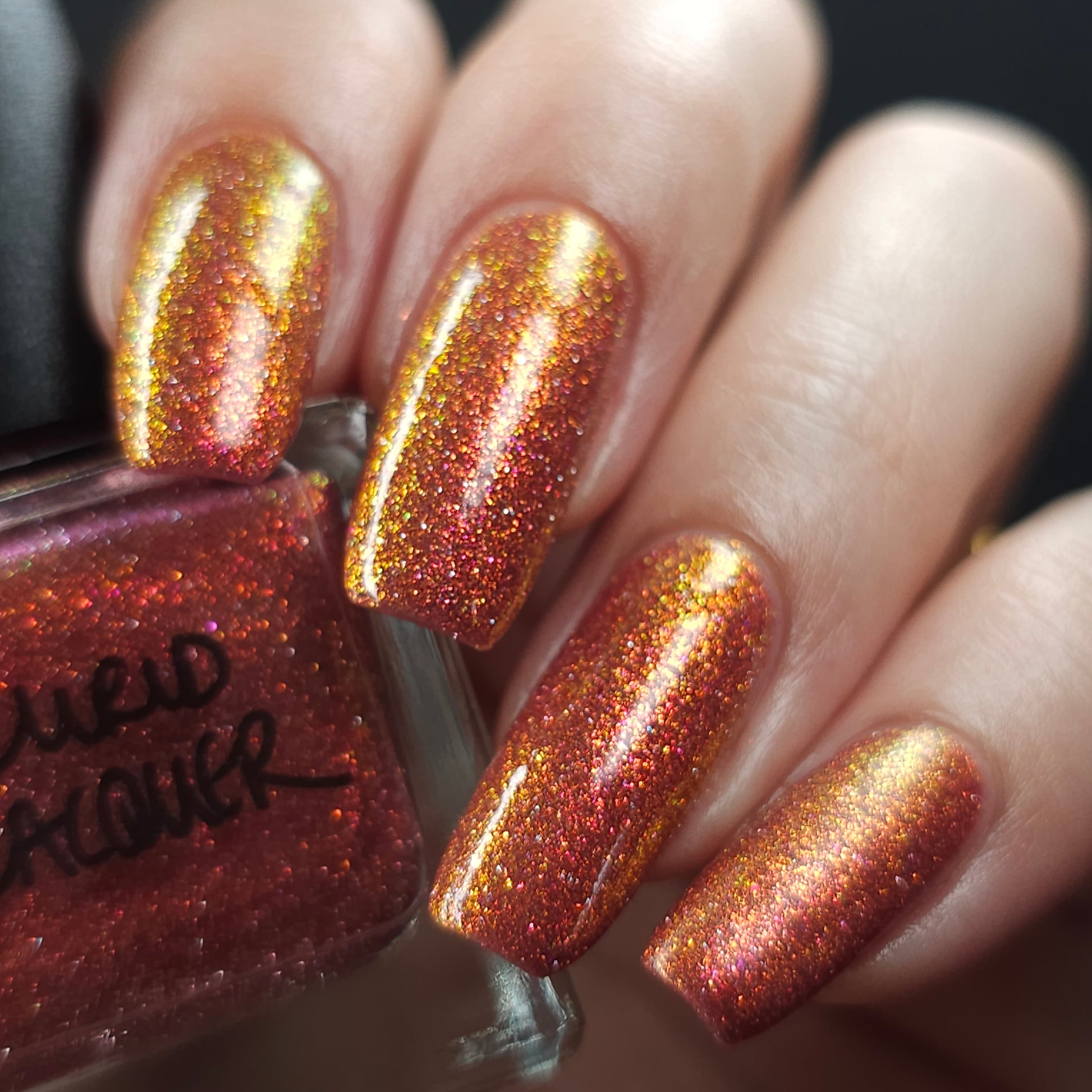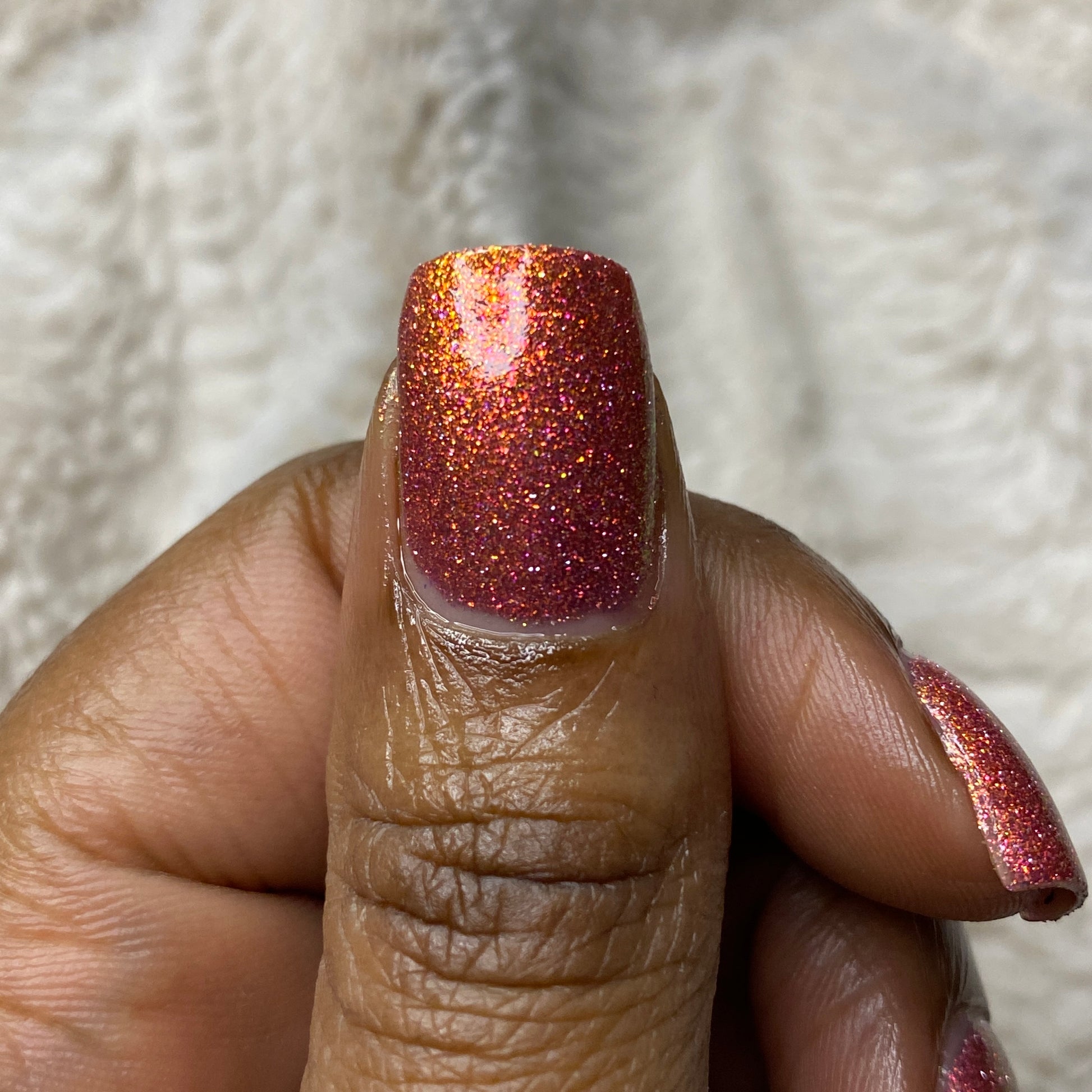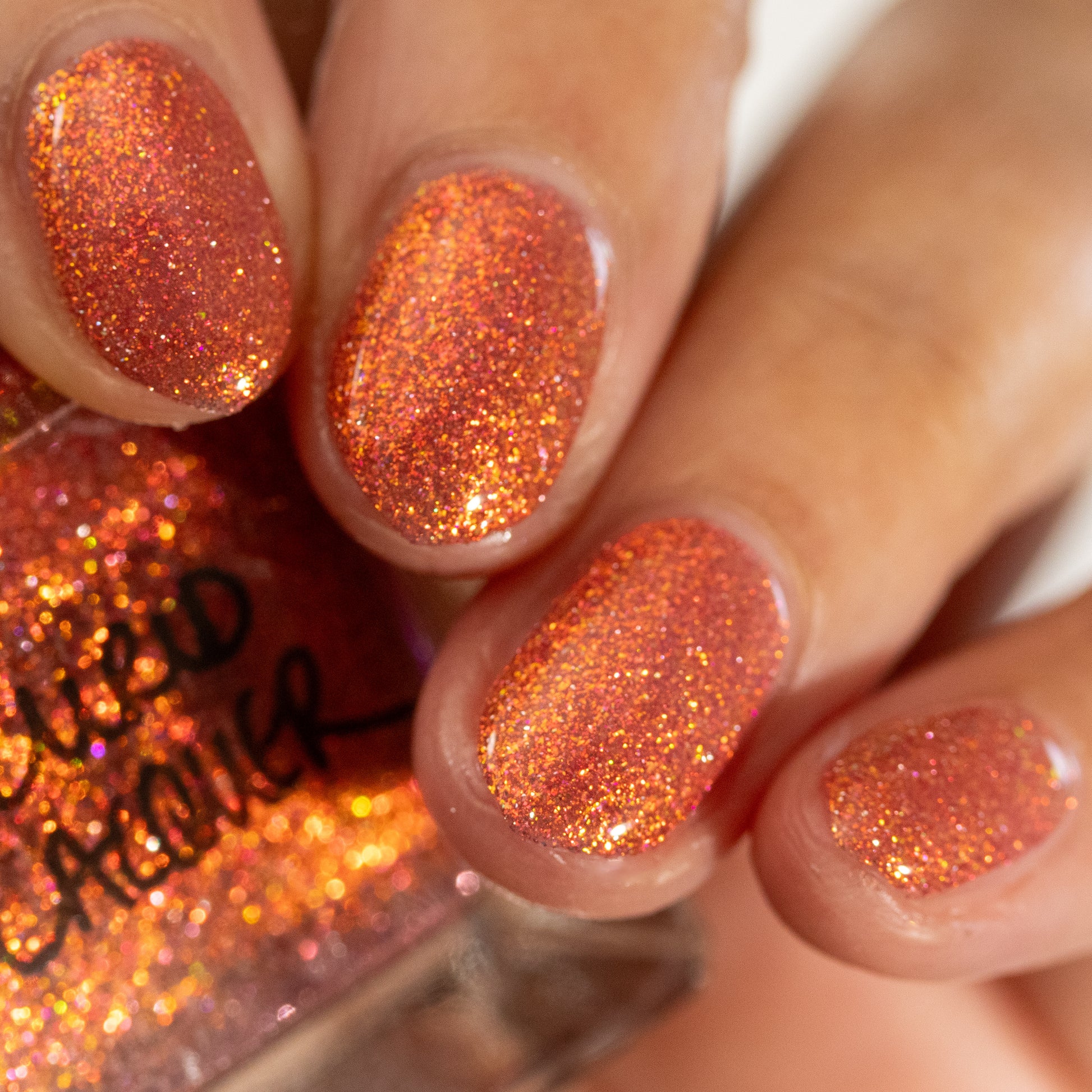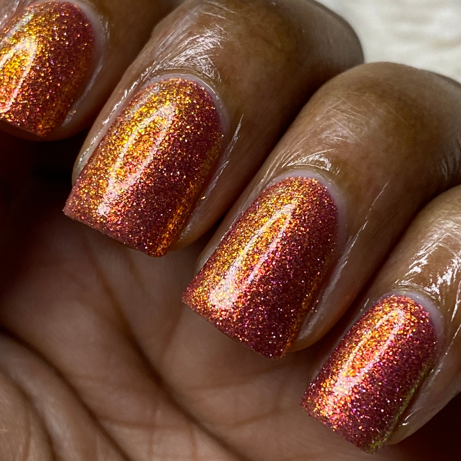 A red coral jelly base with vibrant aurora microflake that shifts from orange to gold to green and coral light reflective glitter