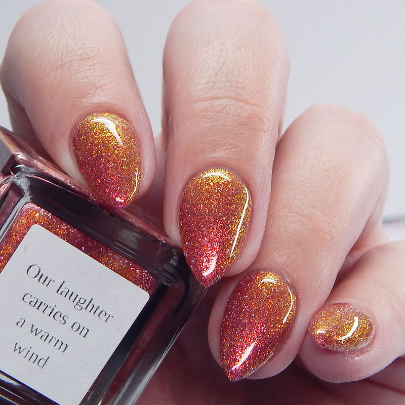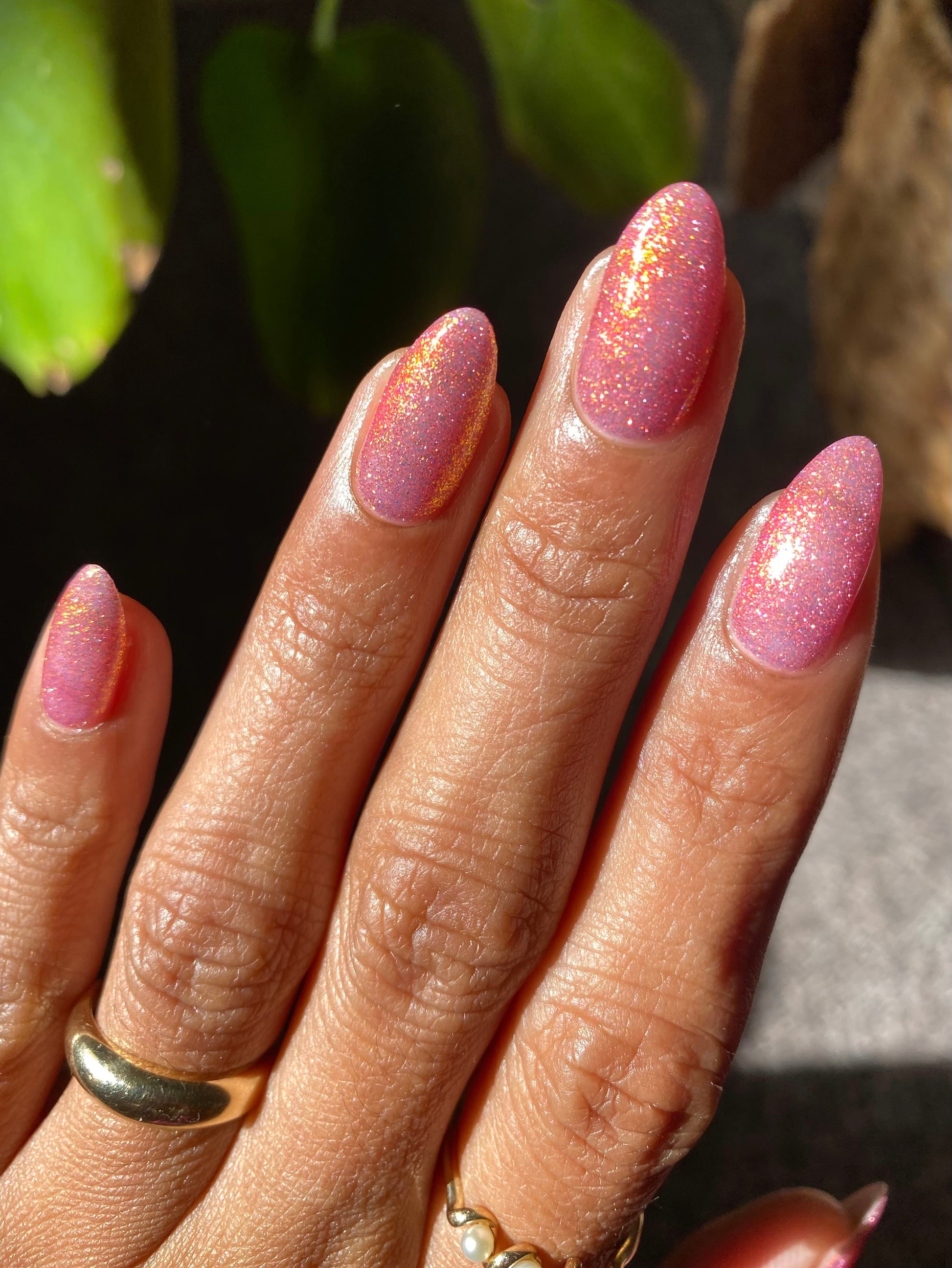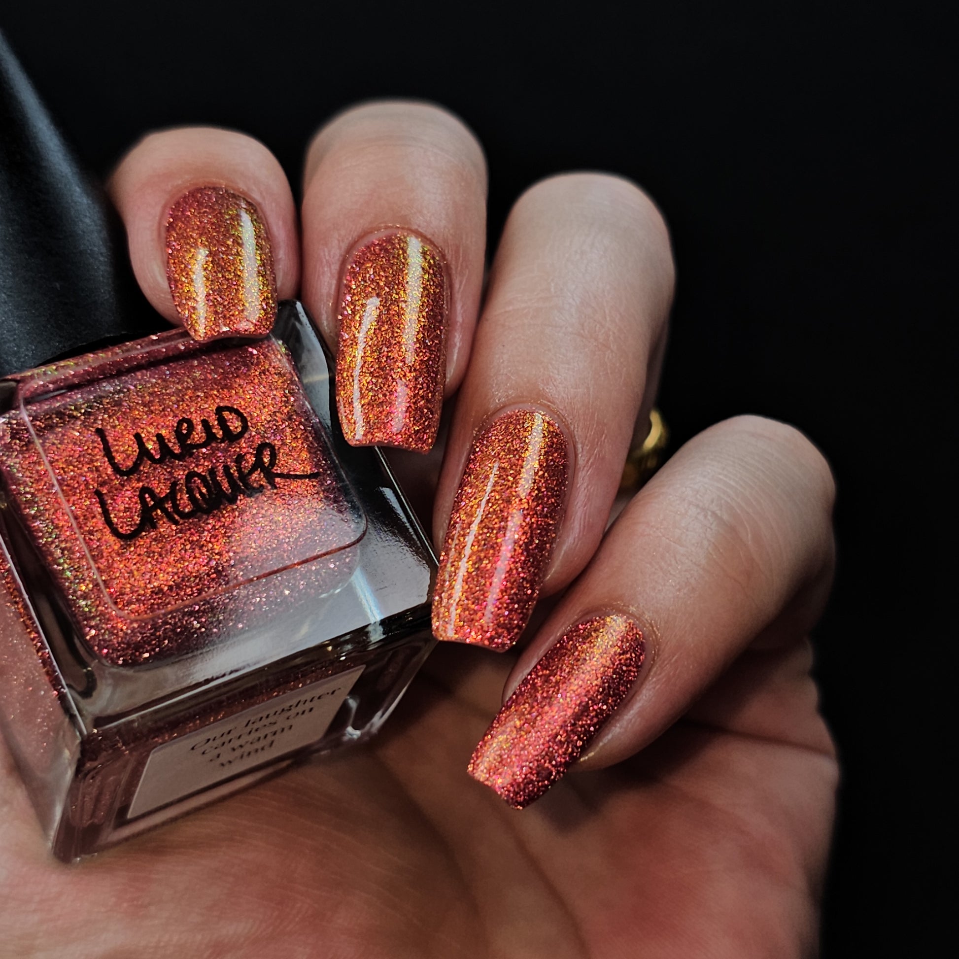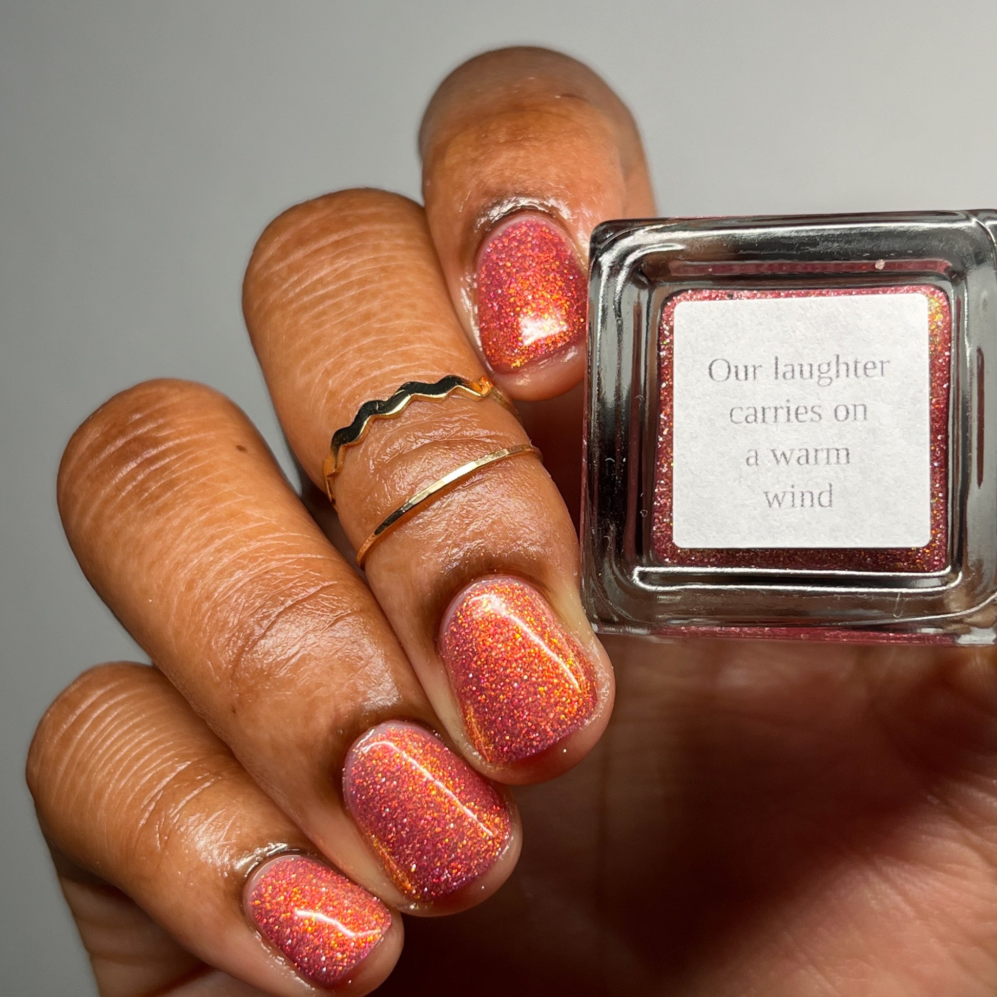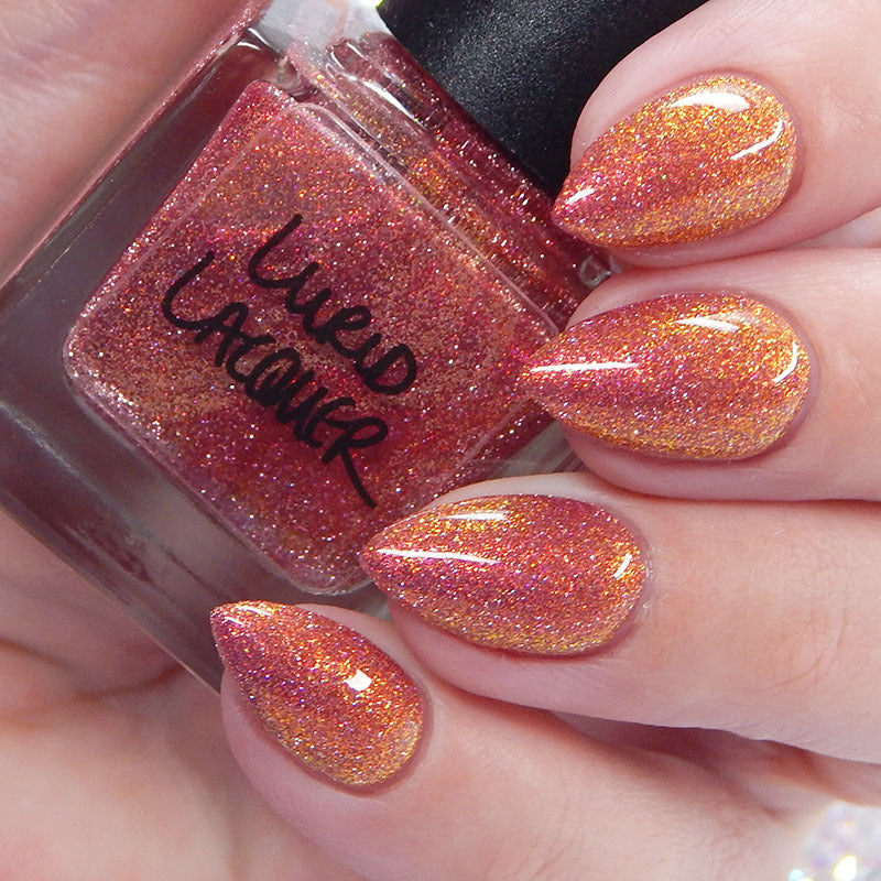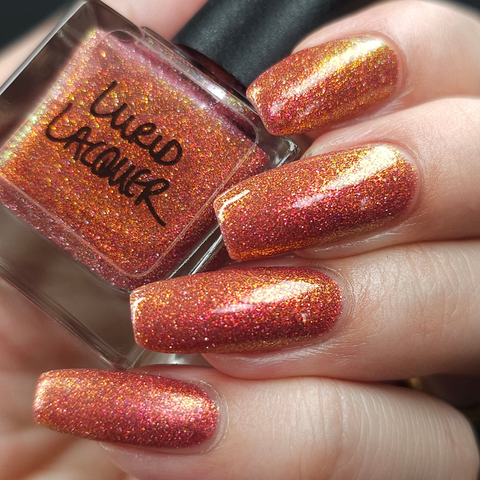 A red coral jelly base with vibrant aurora microflake that shifts from orange to gold to green and coral light reflective glitter