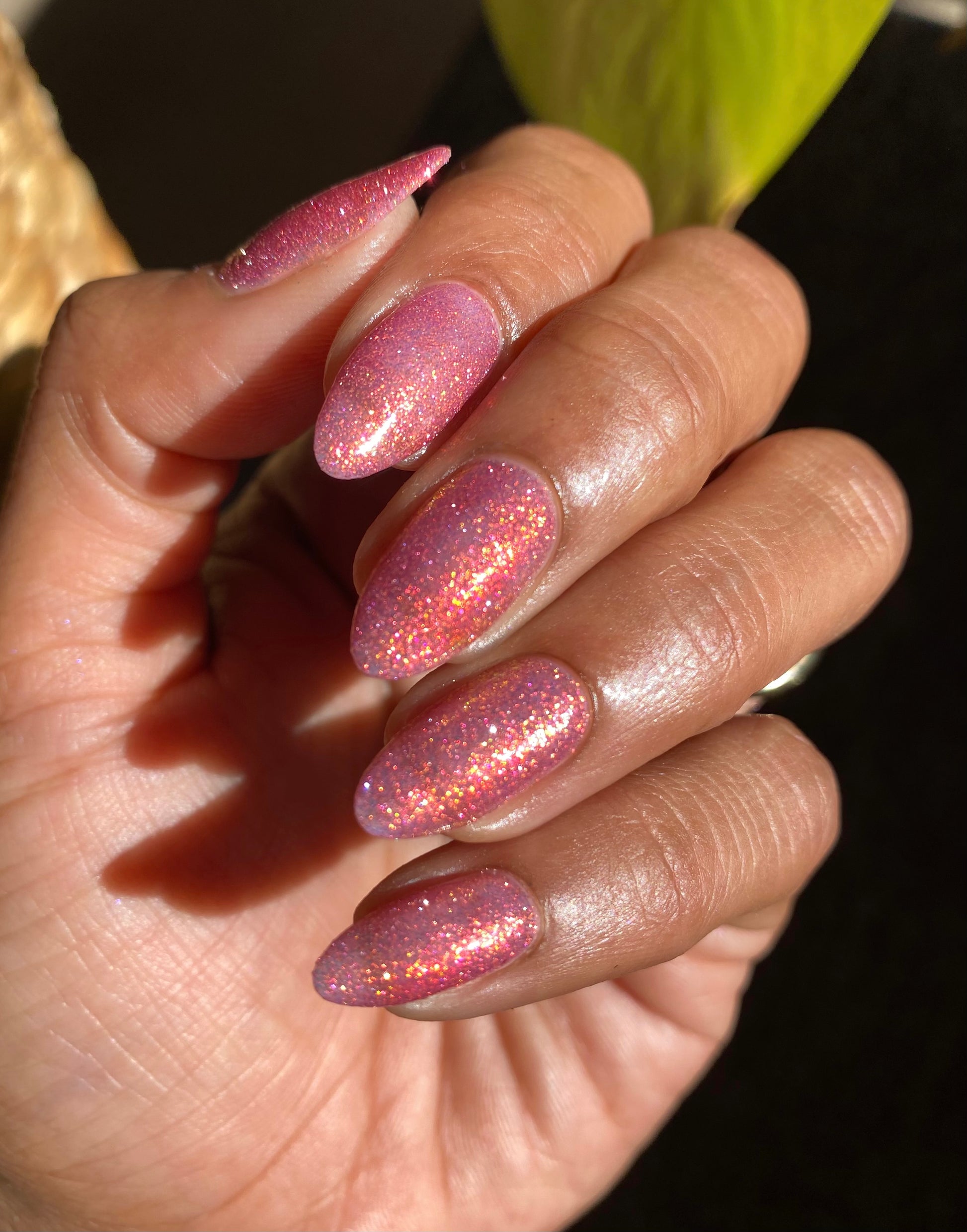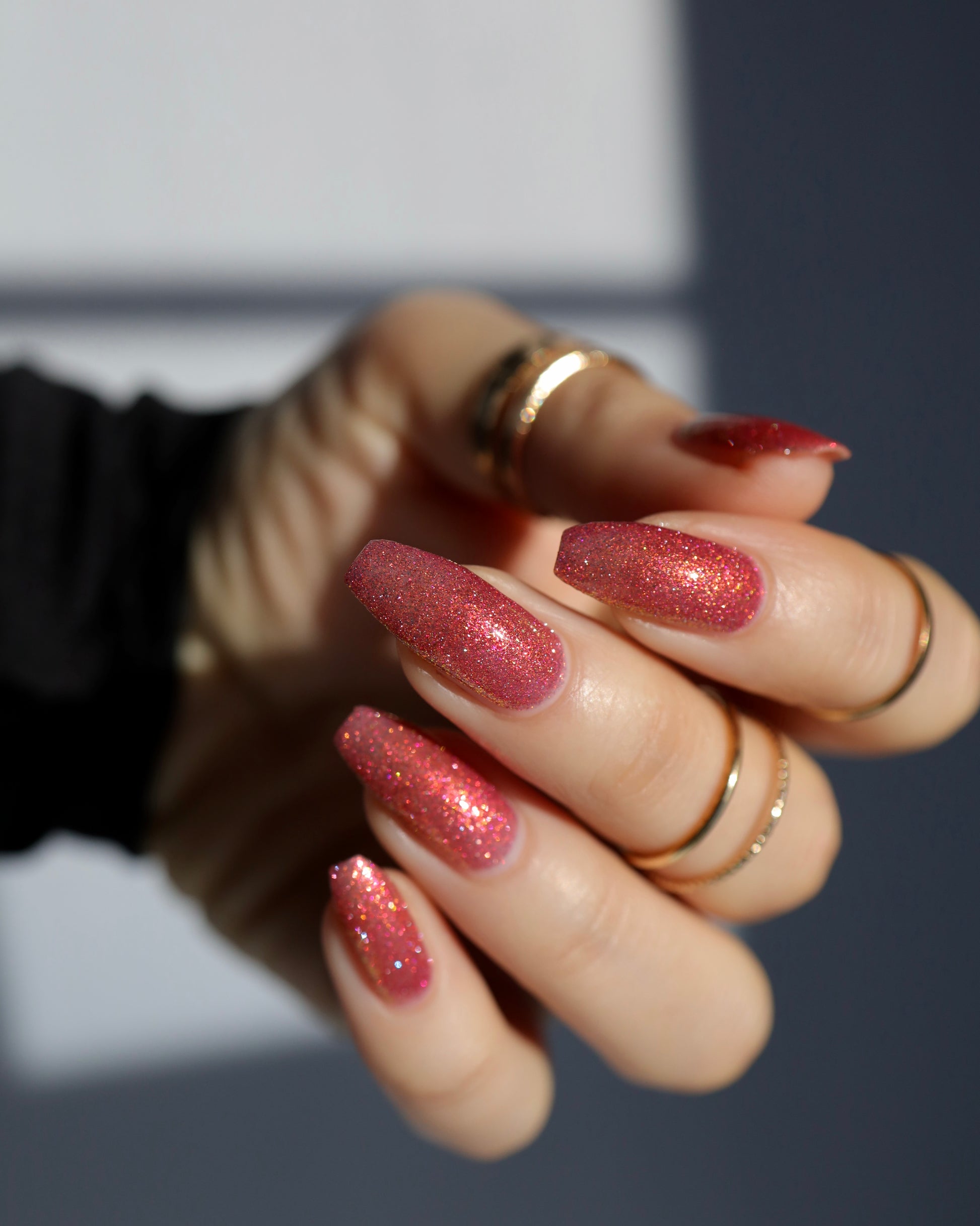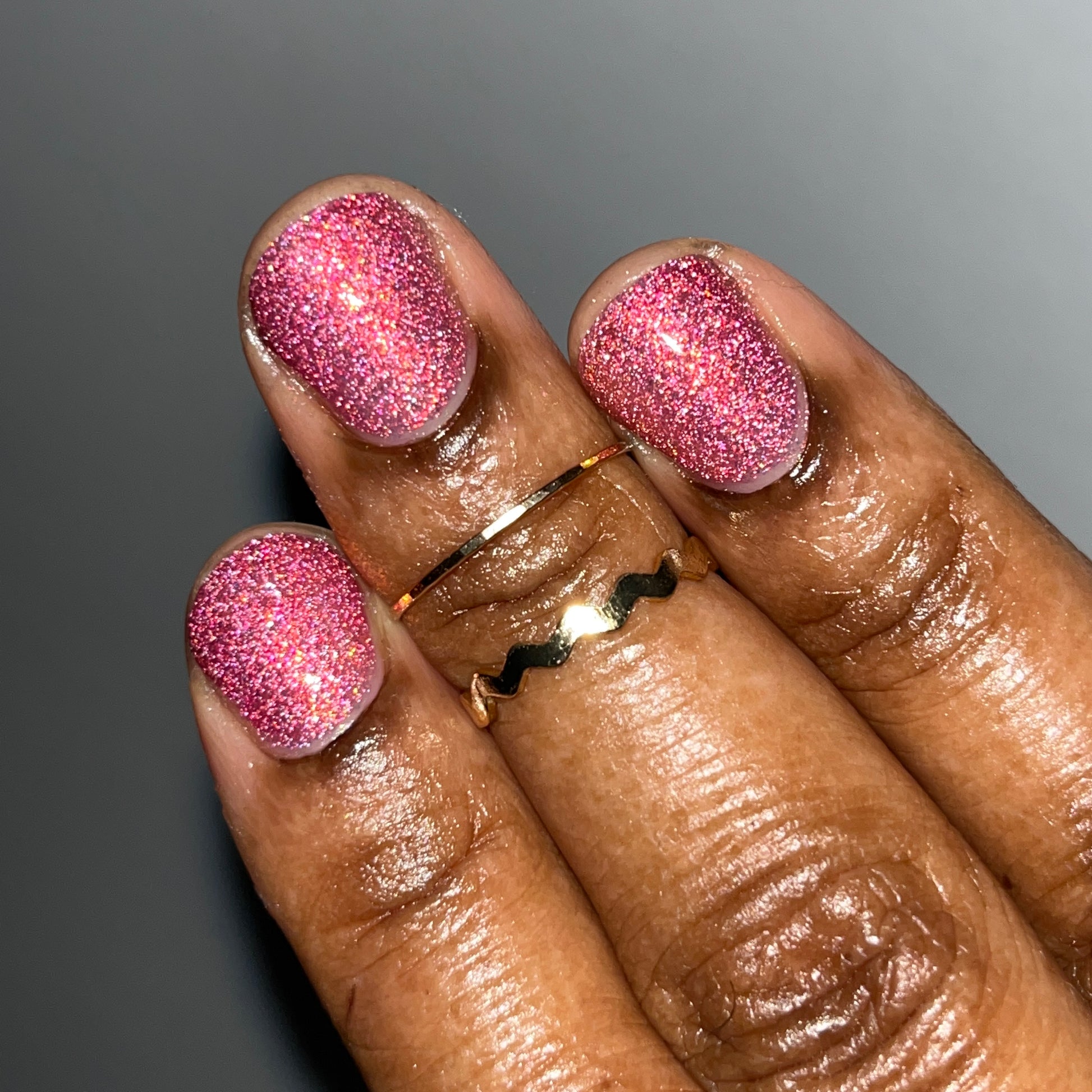 Please note: Reflective glitter polishes are textured and dry down with a gritty, sandpaper feeling. To make them look smooth and glossy, I recommend applying 2-3 coats of the polish, then applying one coat of a glitter smoother, followed by one coat of top coat.
