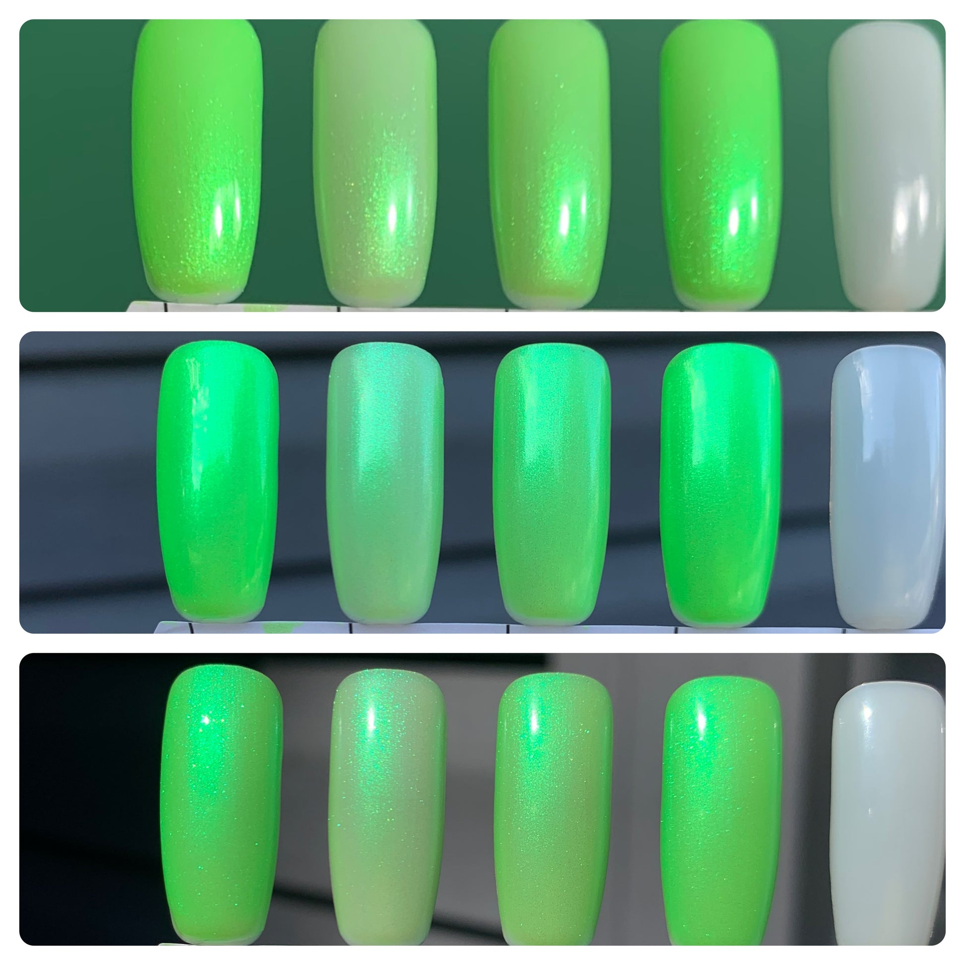 A neon green base with glowy green shimmer that shifts subtly to teal at extremes