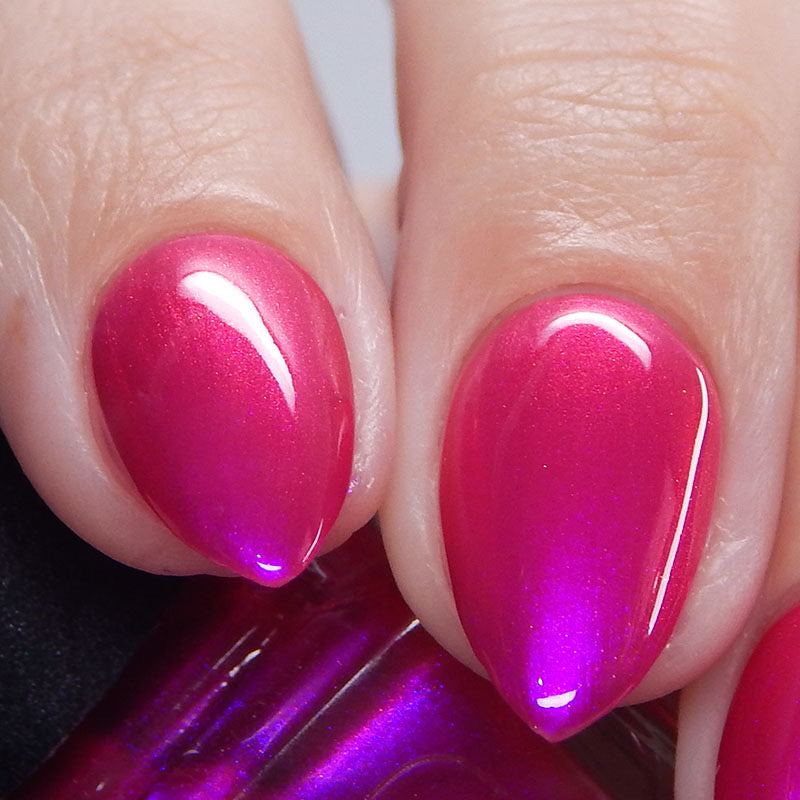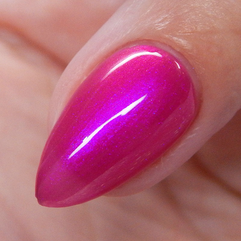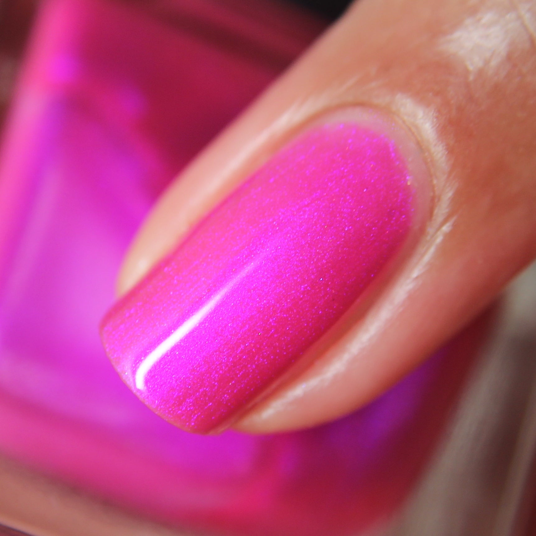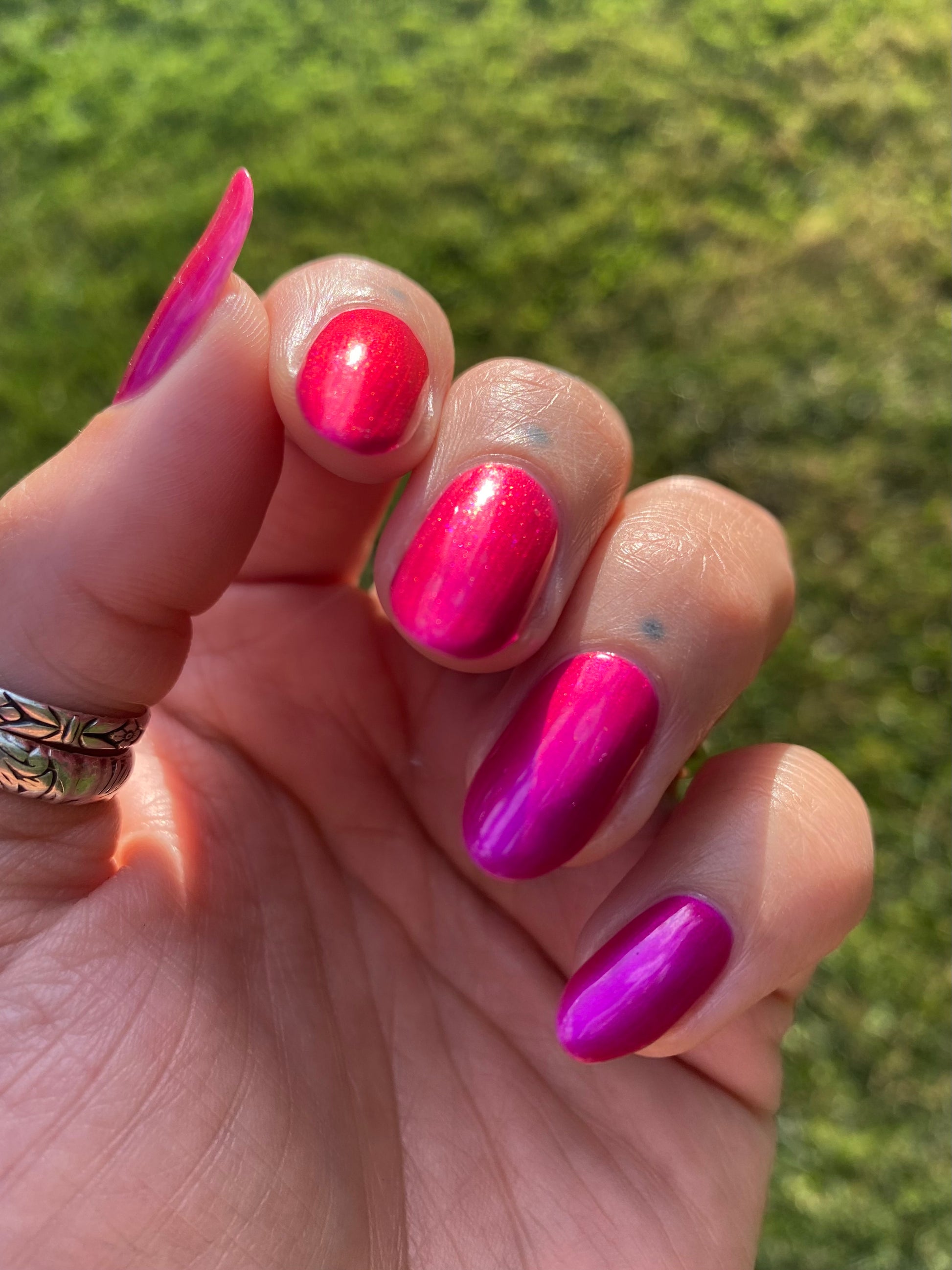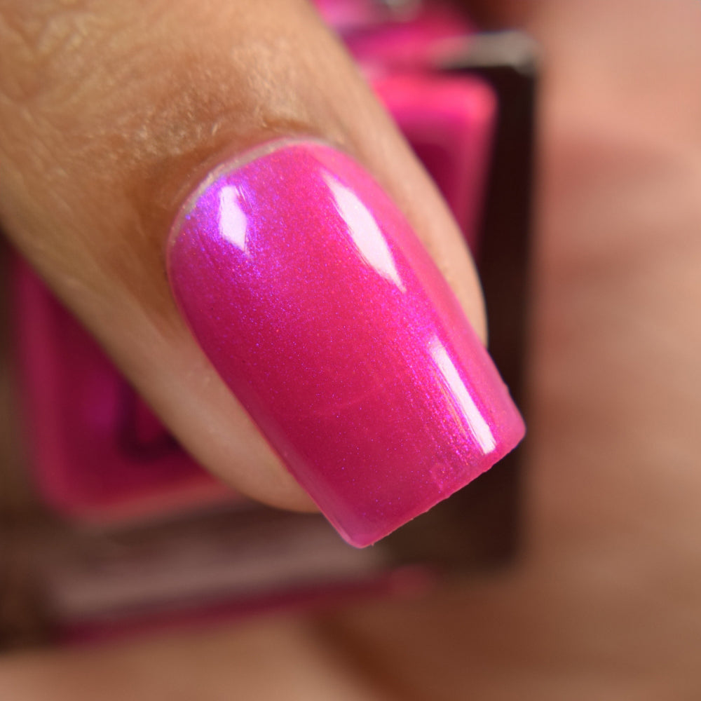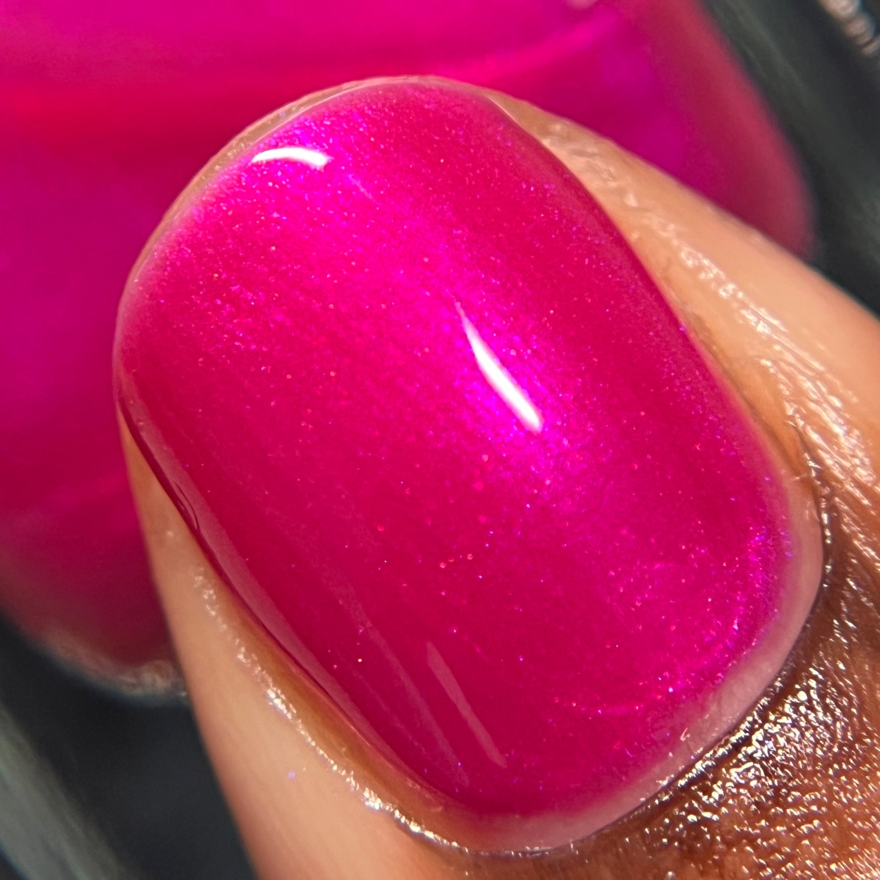 A semi-sheer raspberry pink jelly base with shimmer that shifts from purple to pink to red at extremes. (I highly recommend 3 coats for this one.)