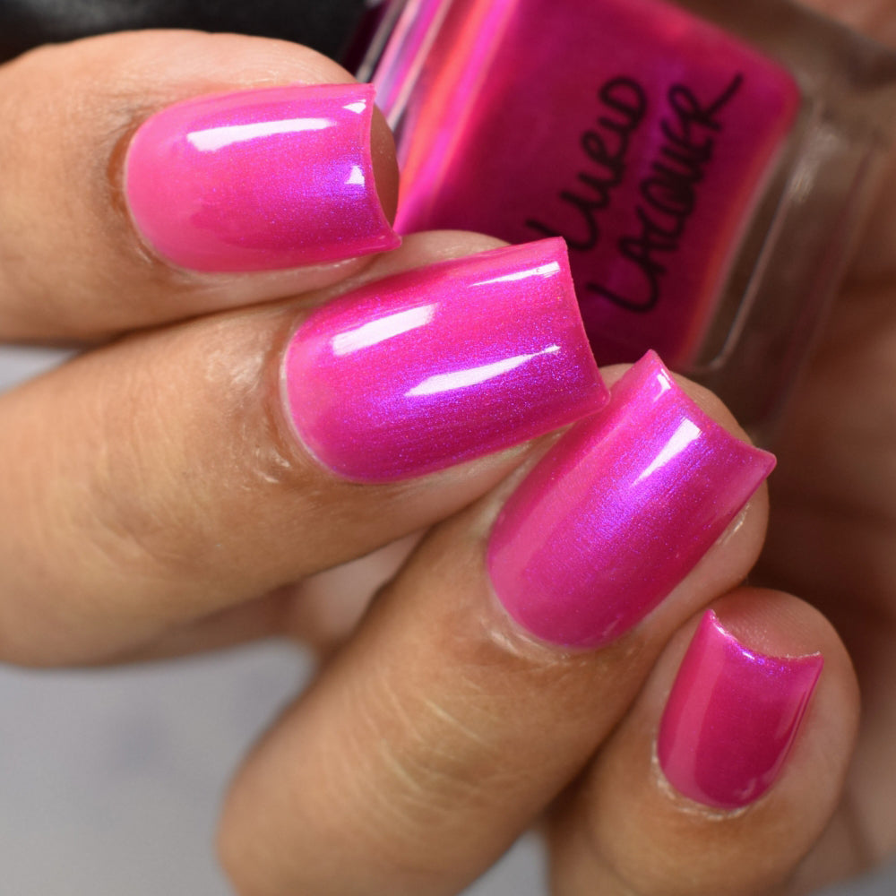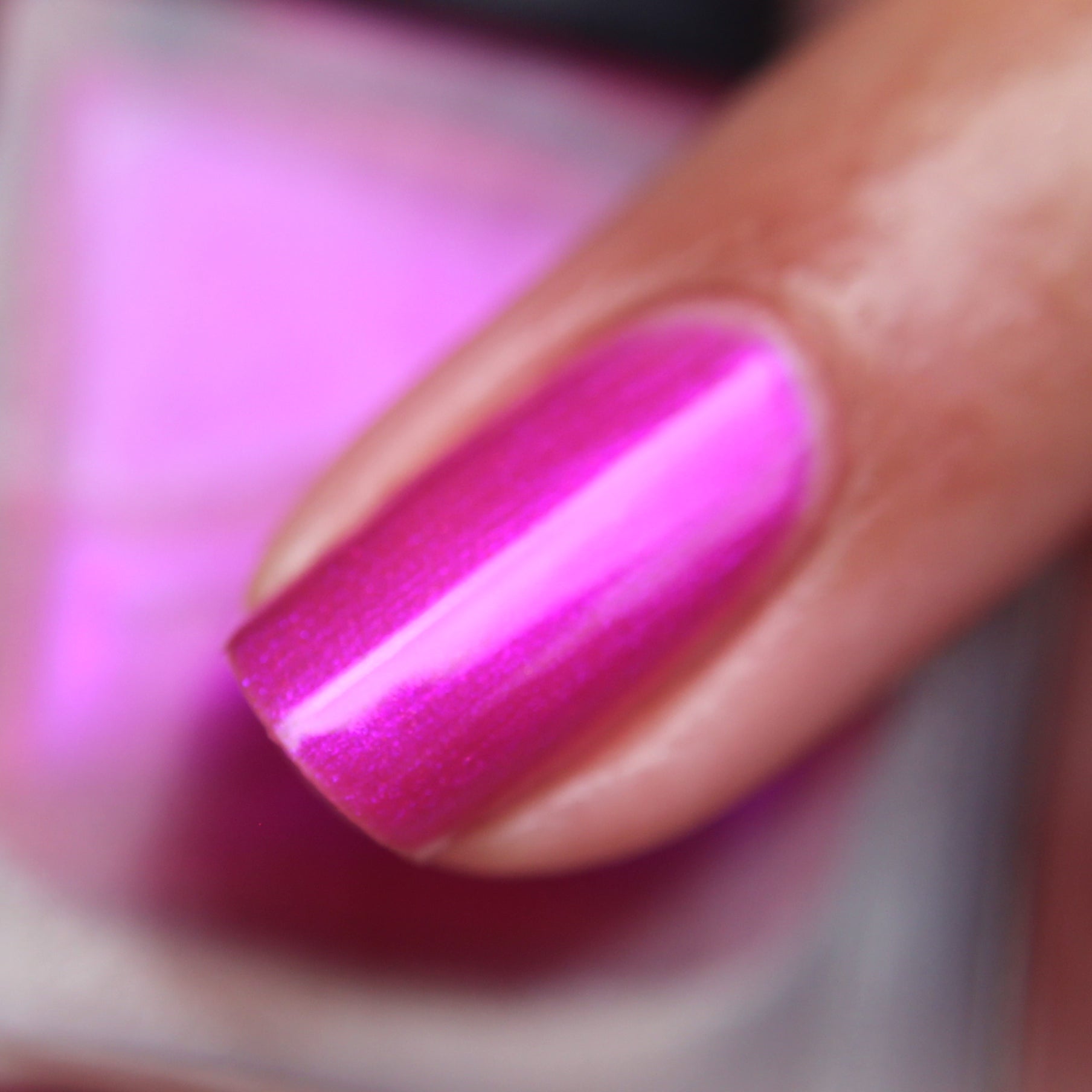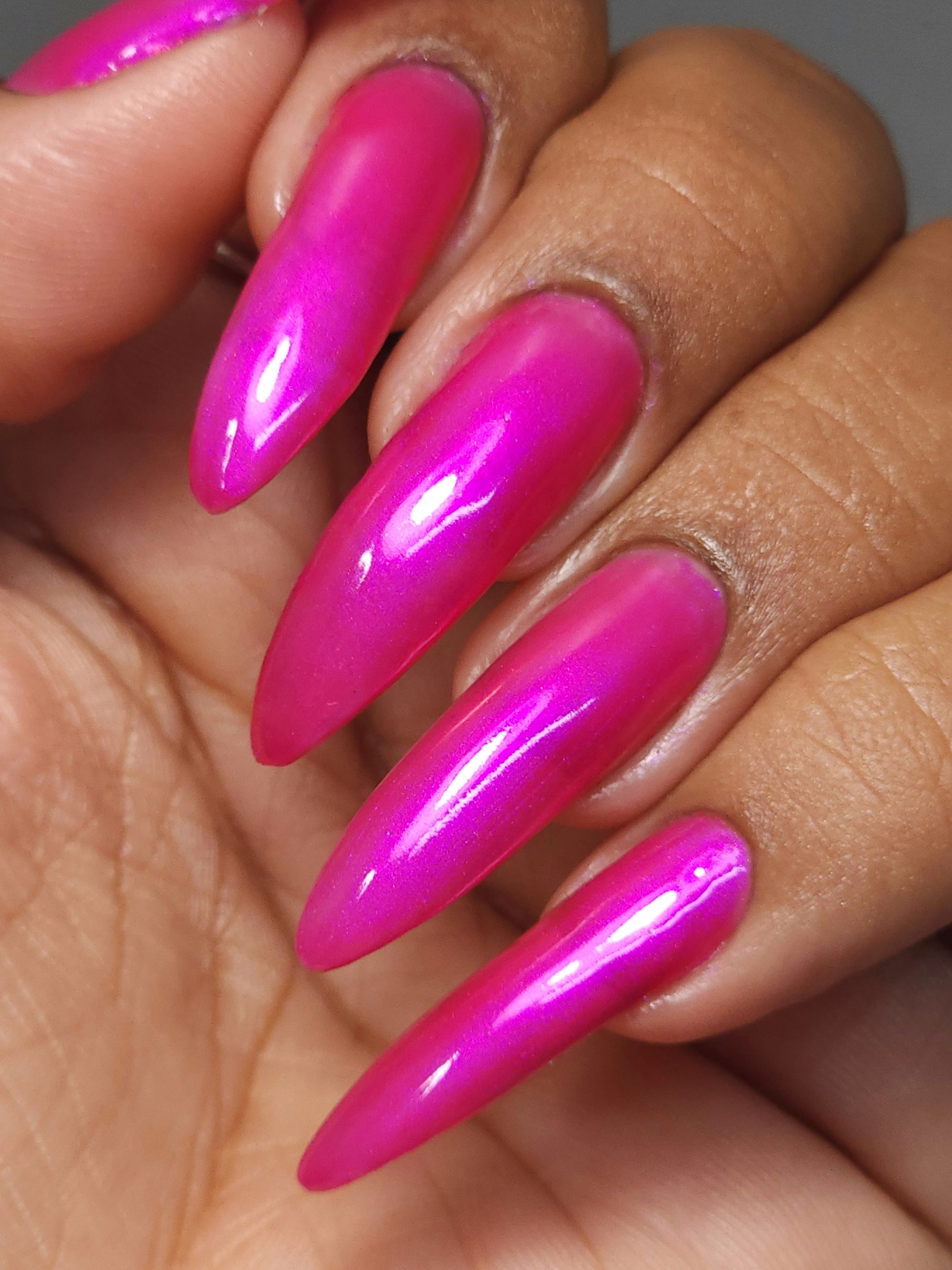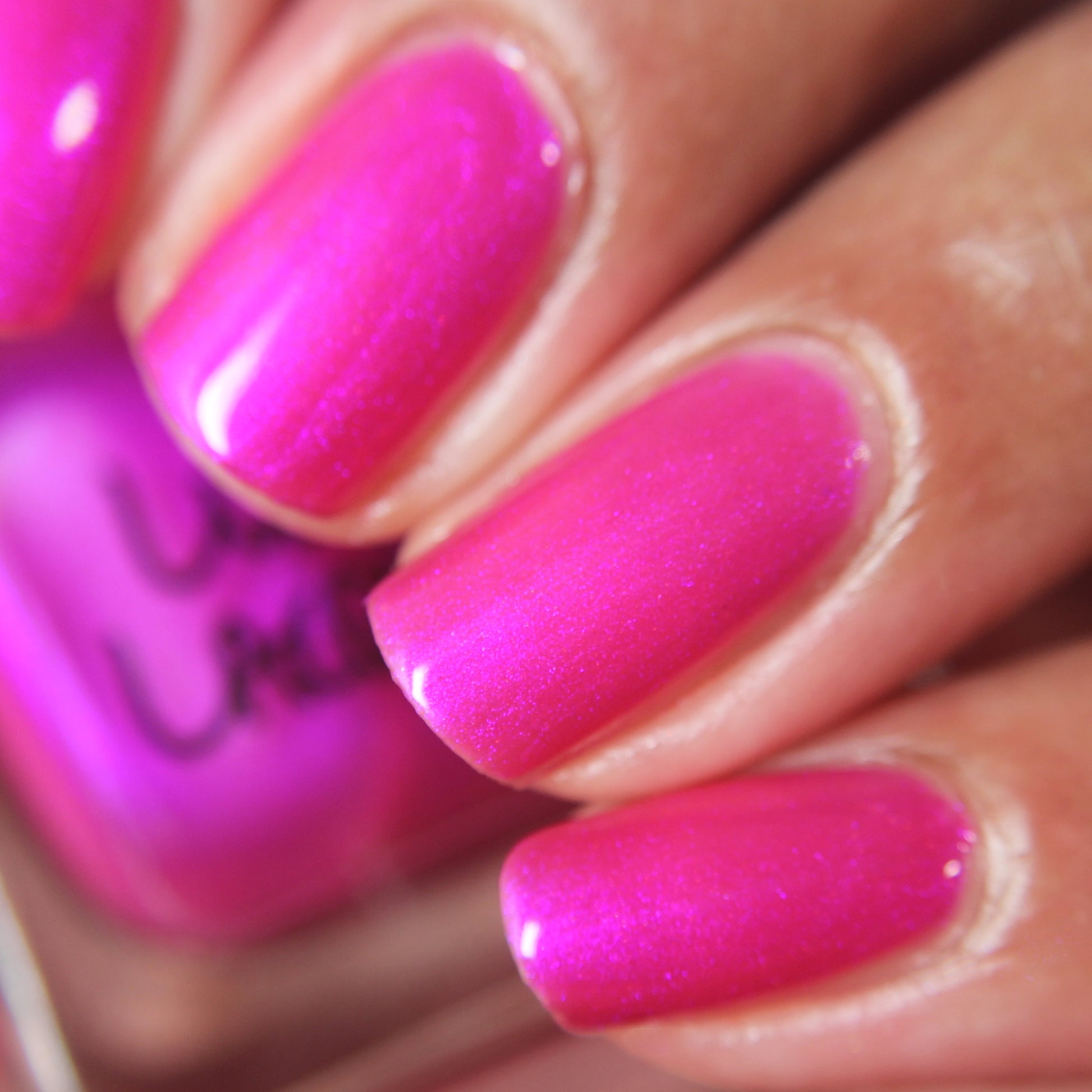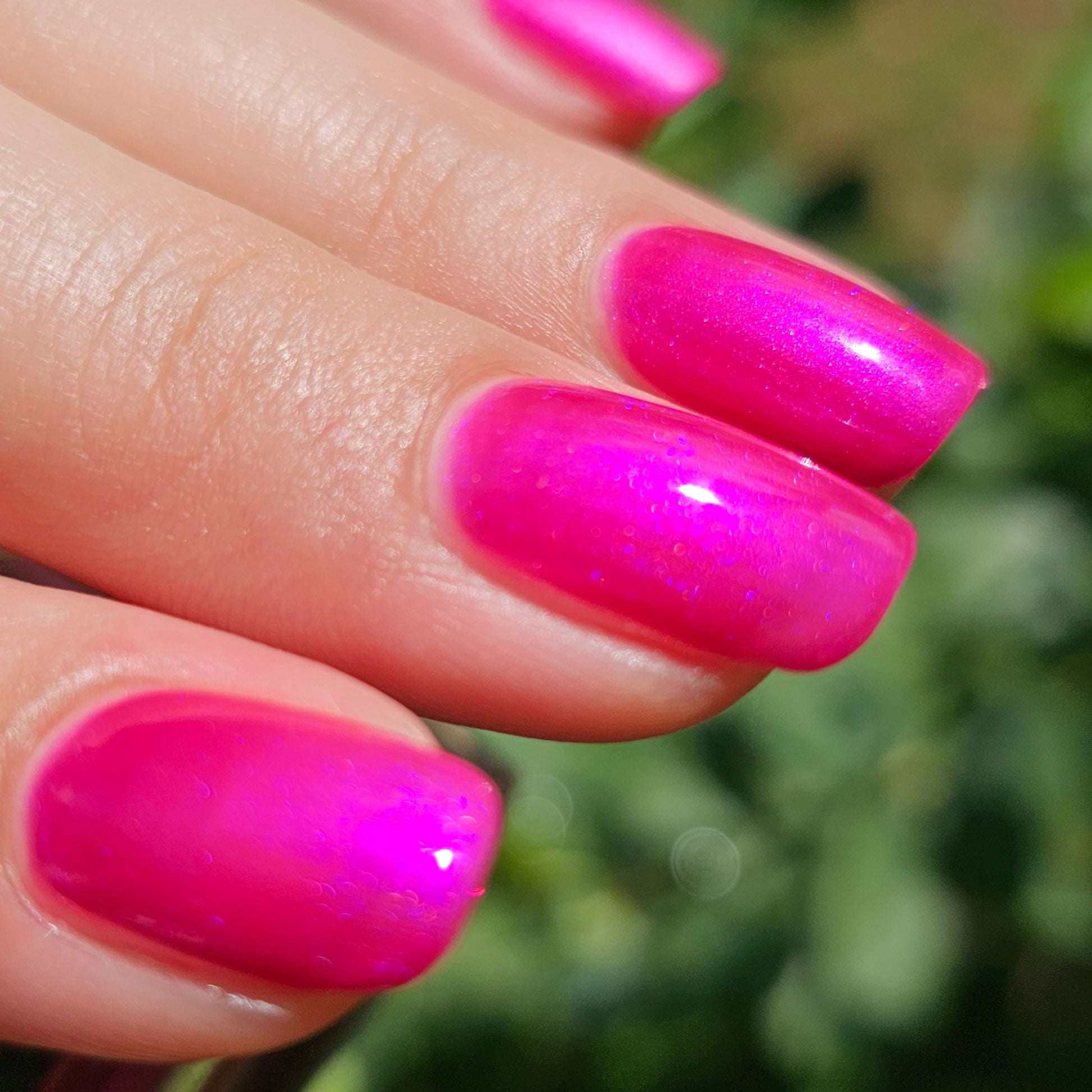 A semi-sheer raspberry pink jelly base with shimmer that shifts from purple to pink to red at extremes. (I highly recommend 3 coats for this one.)