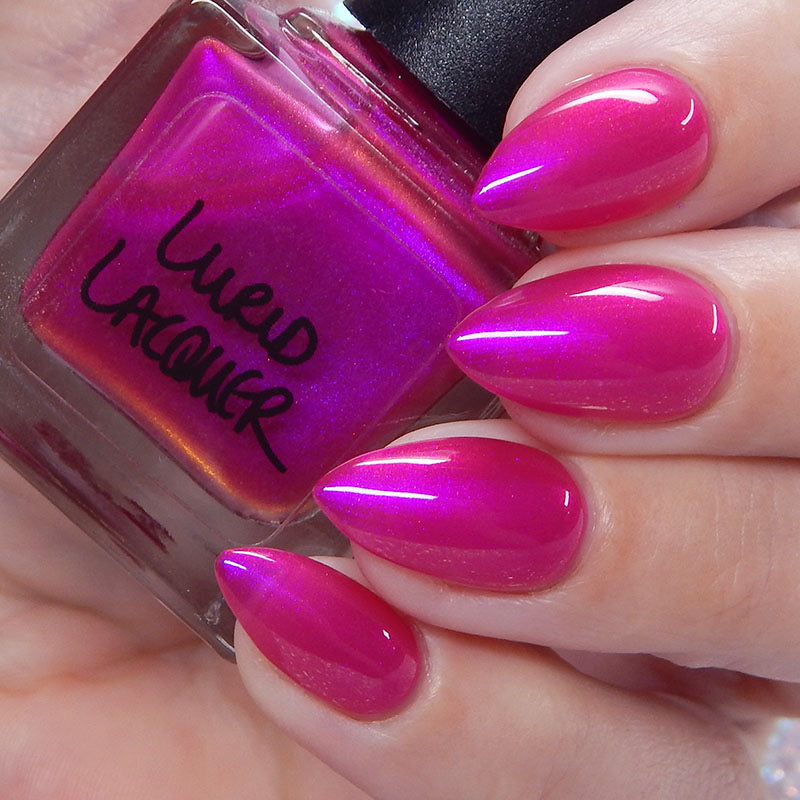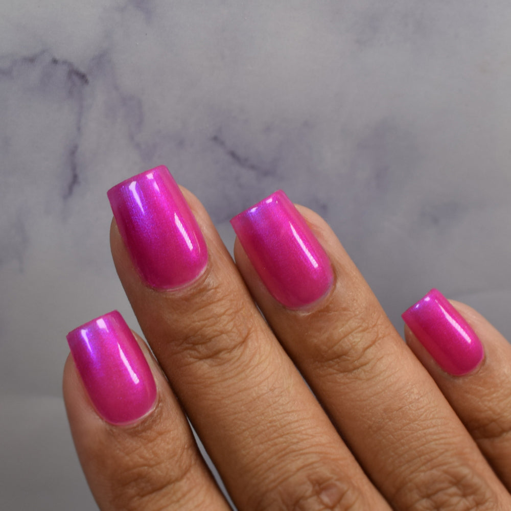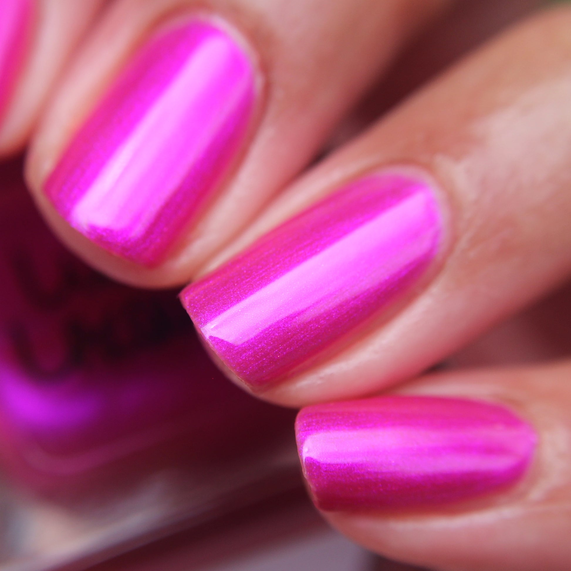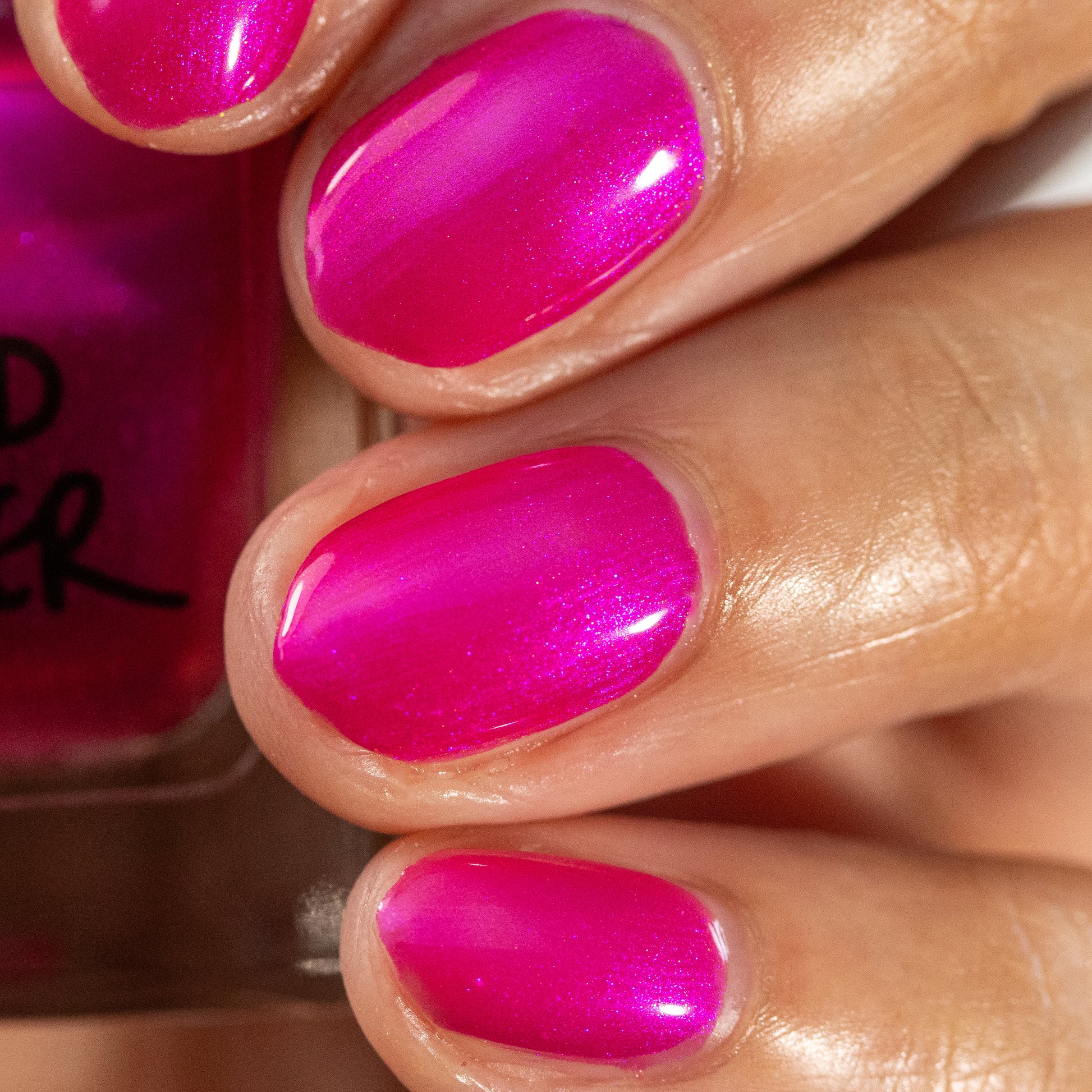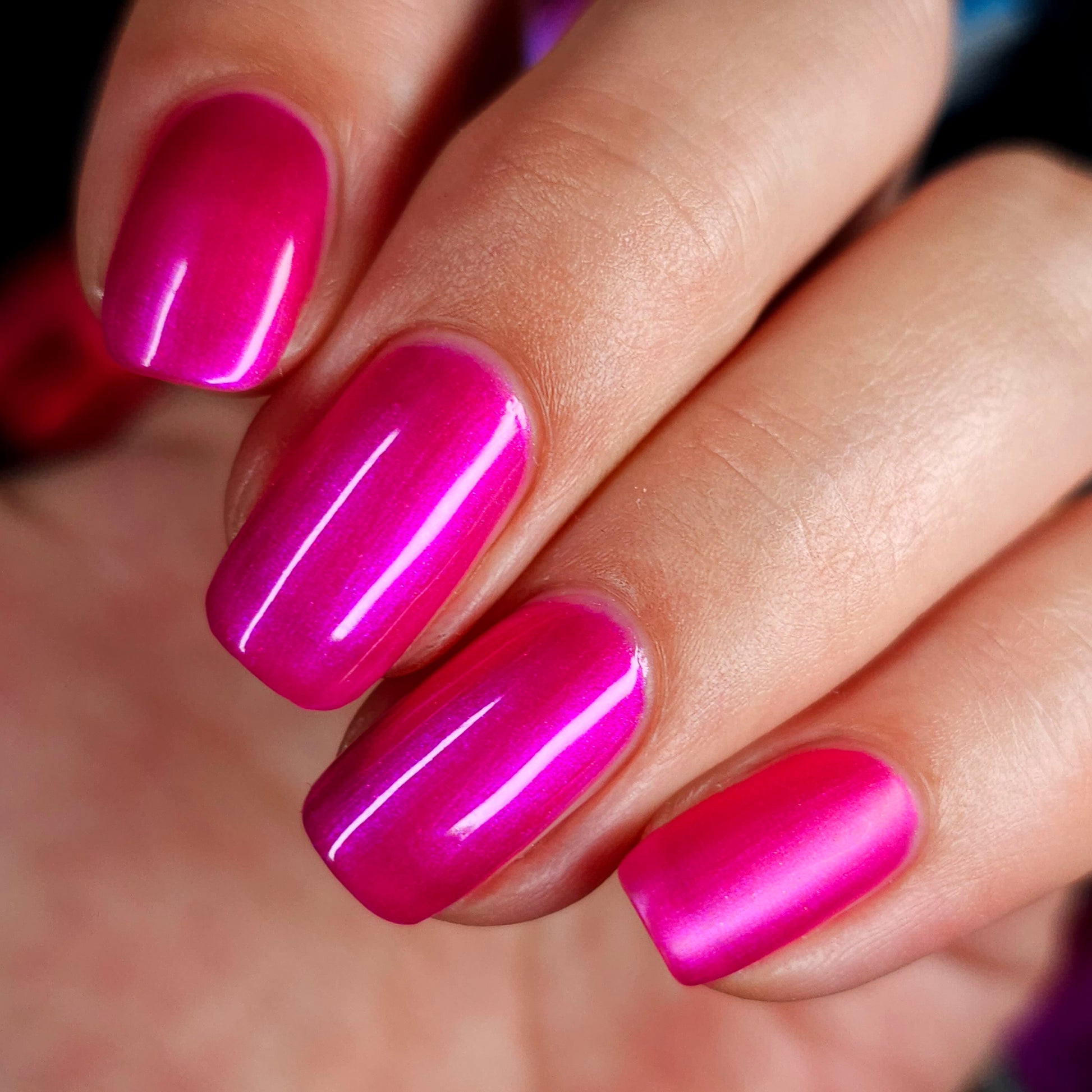 A semi-sheer raspberry pink jelly base with shimmer that shifts from purple to pink to red at extremes. (I highly recommend 3 coats for this one.)