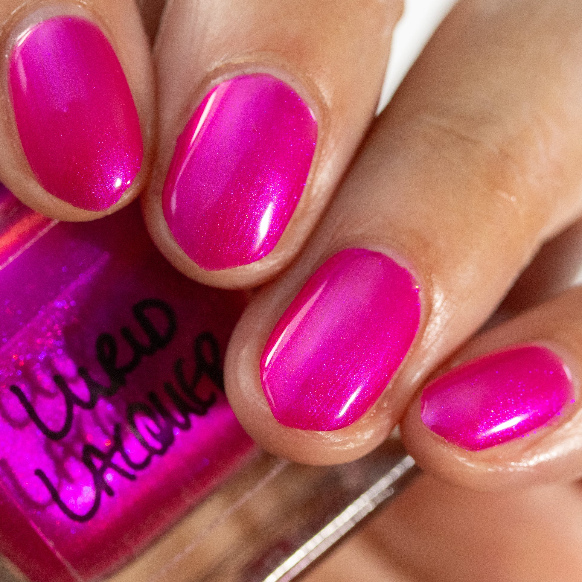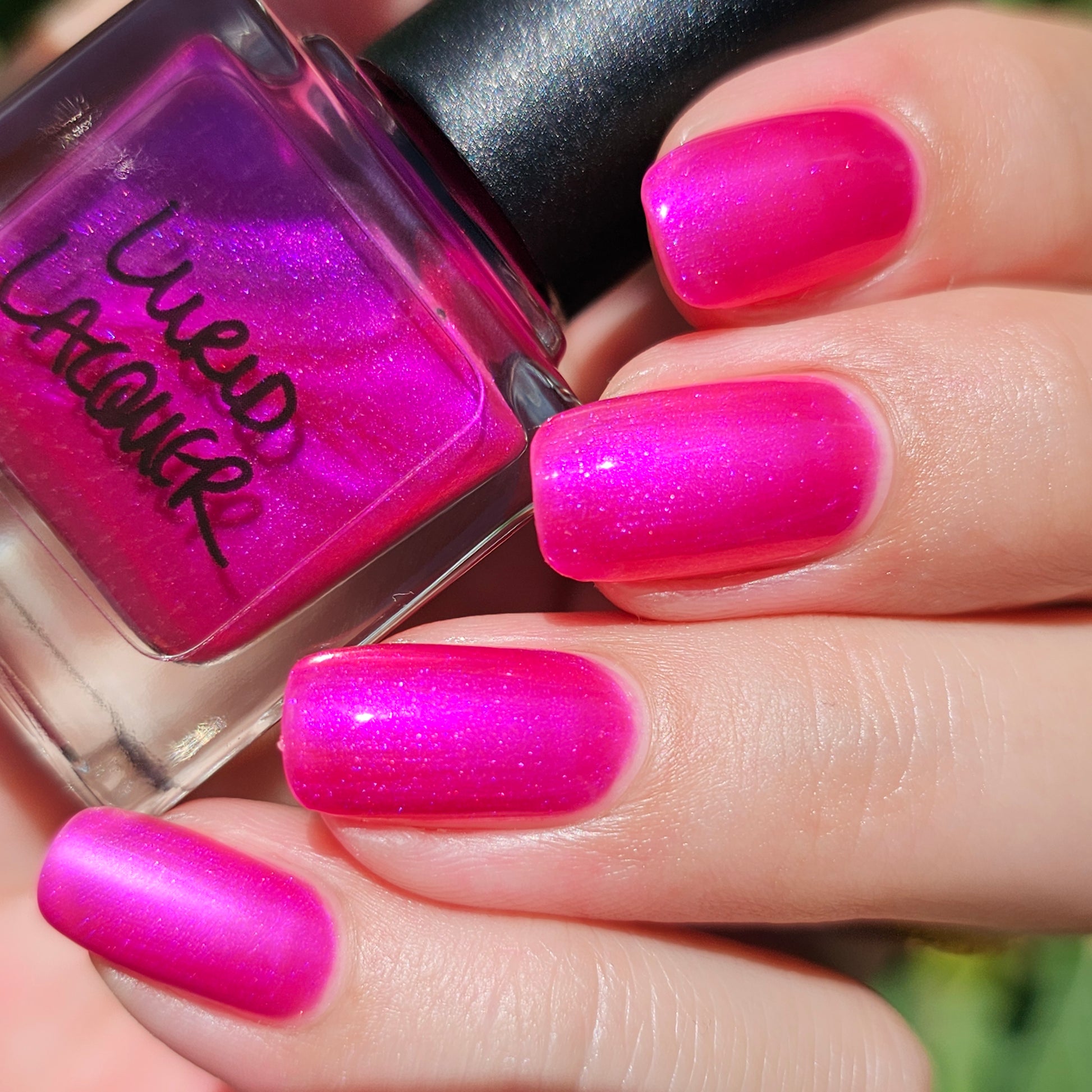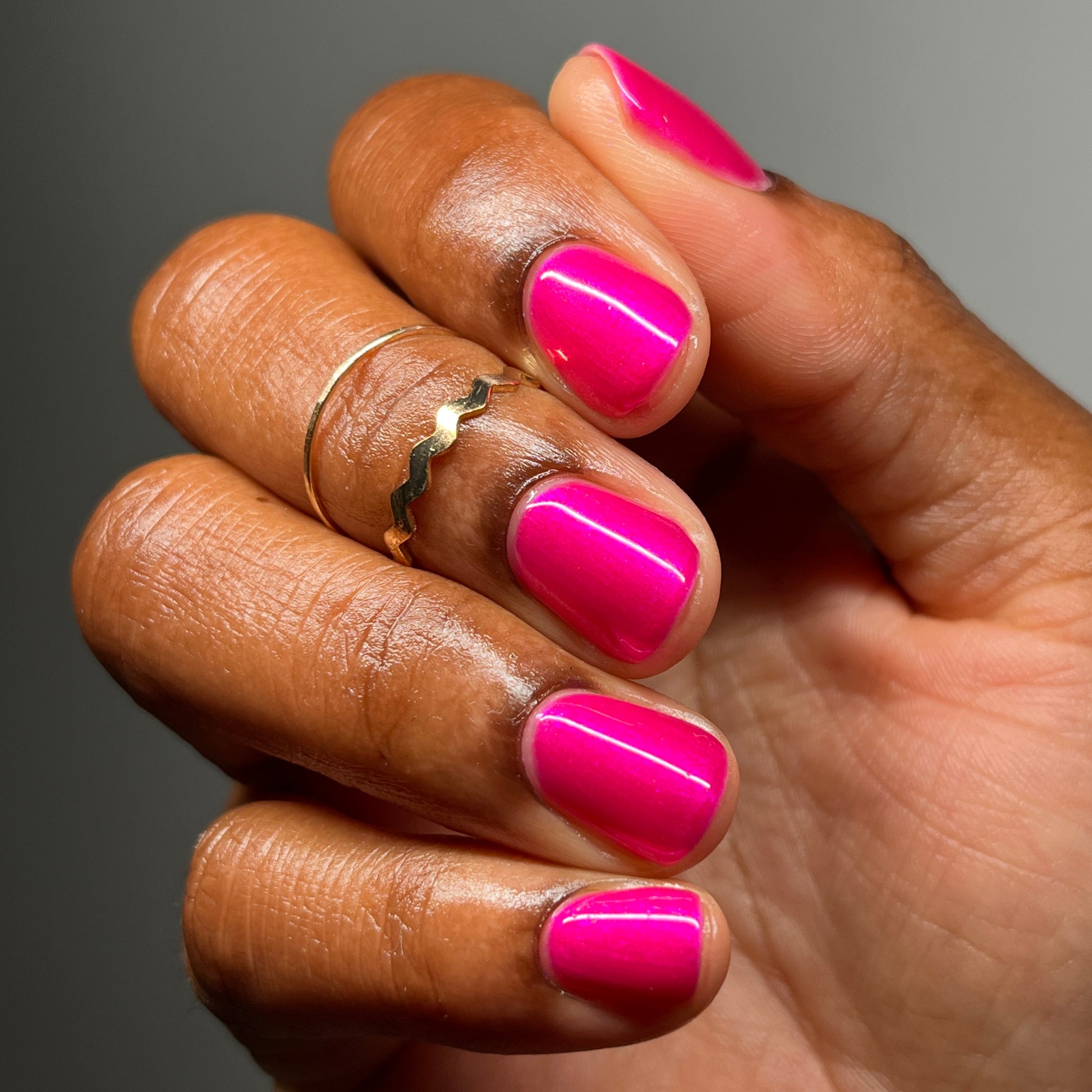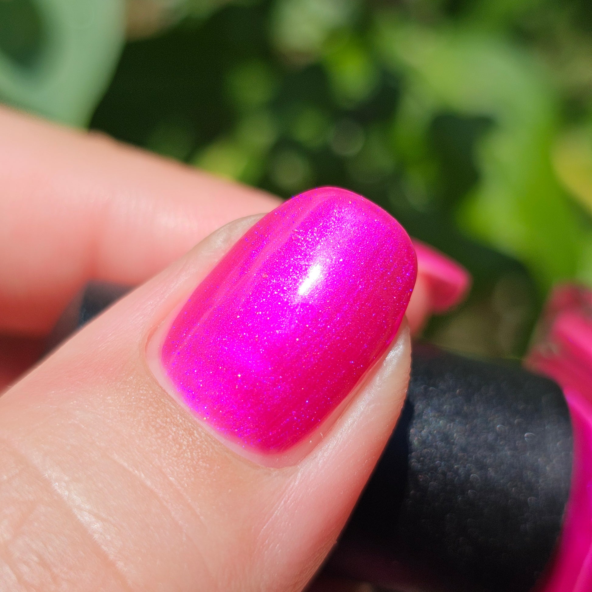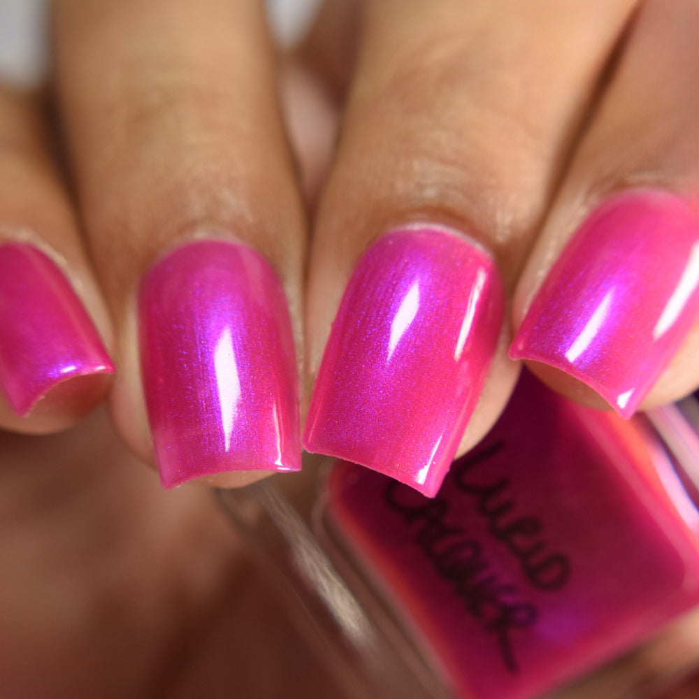 A semi-sheer raspberry pink jelly base with shimmer that shifts from purple to pink to red at extremes. (I highly recommend 3 coats for this one.)