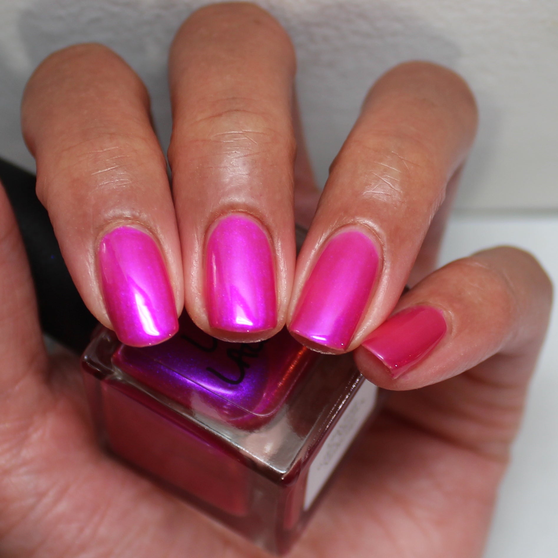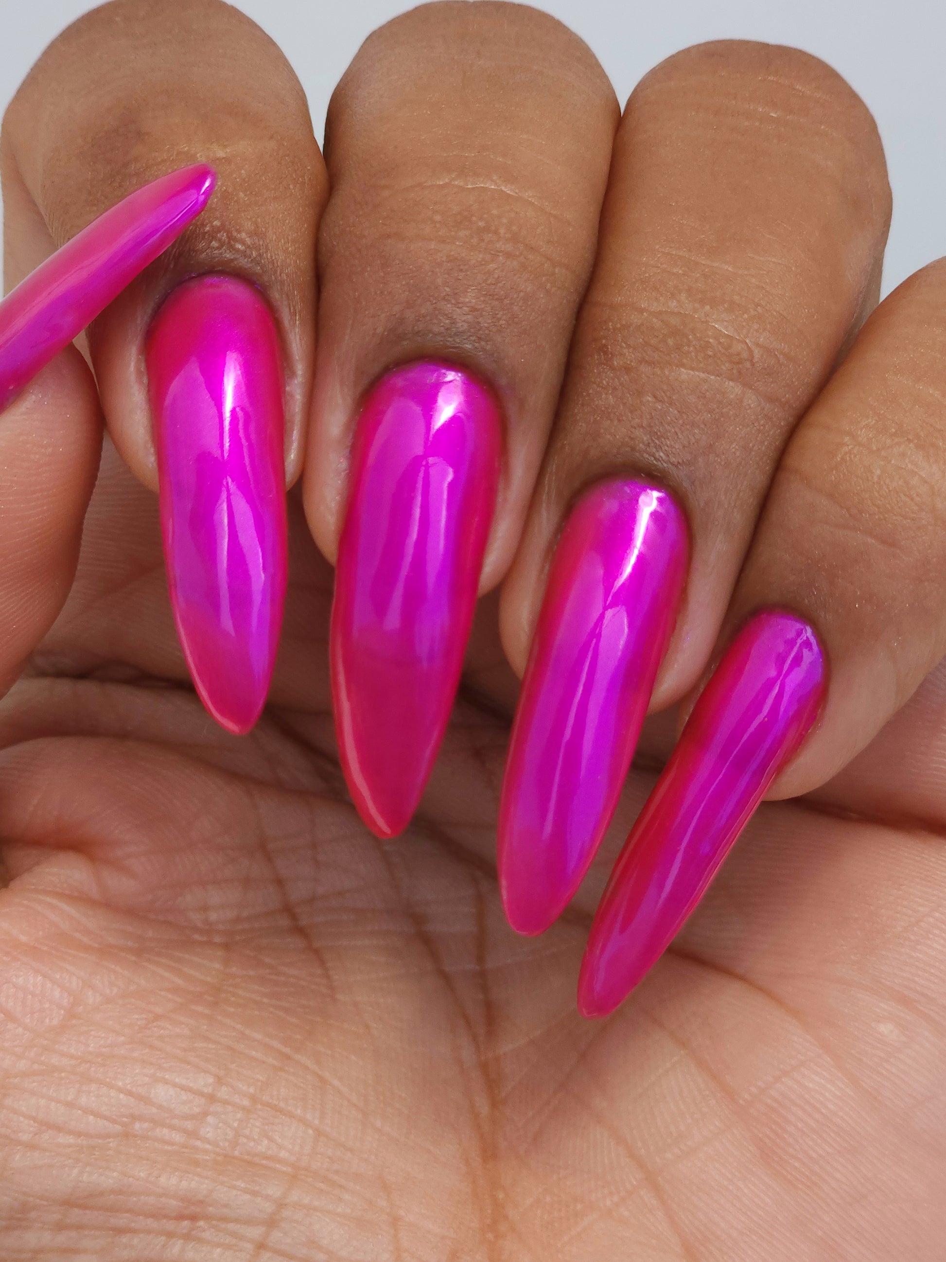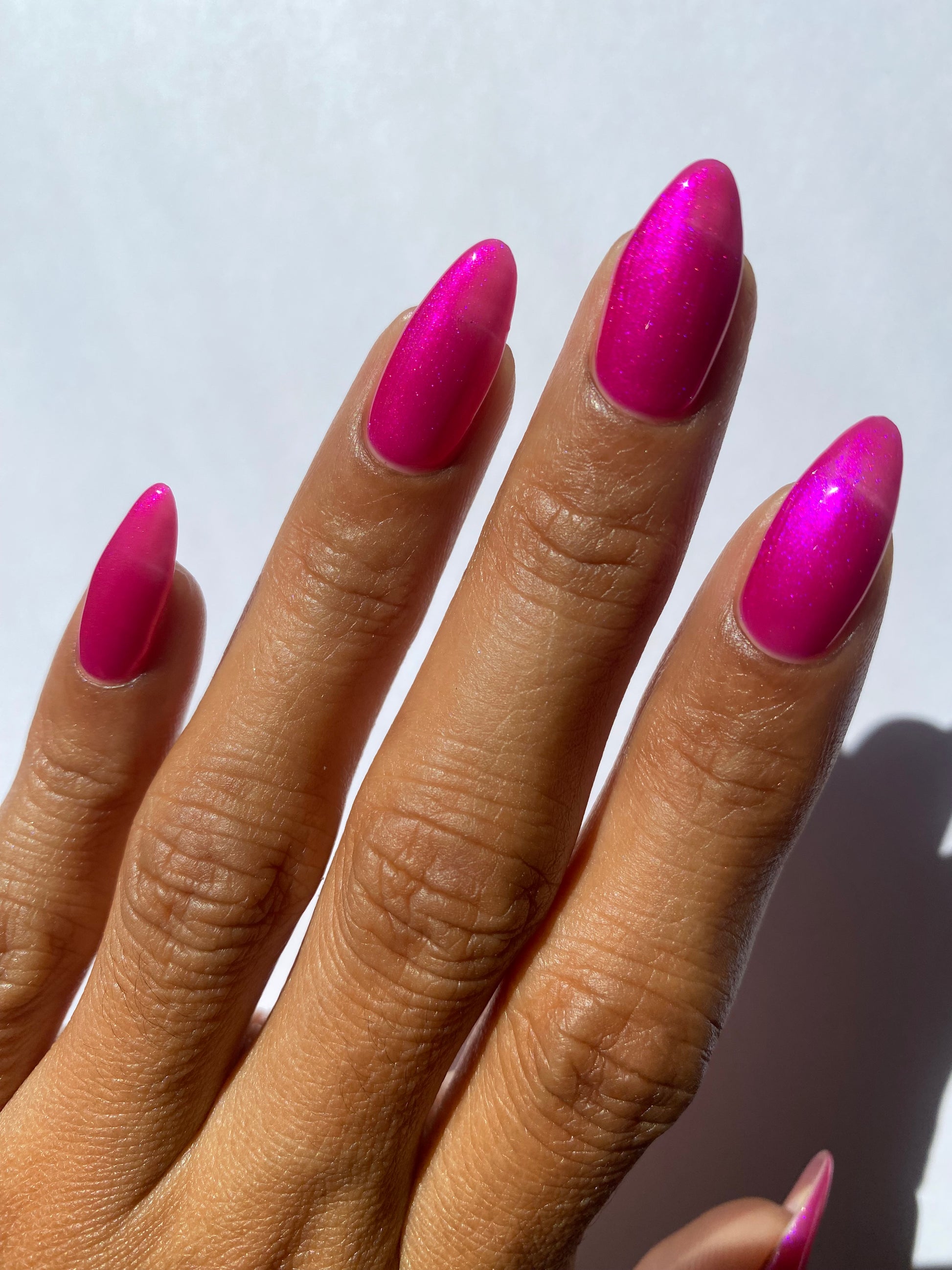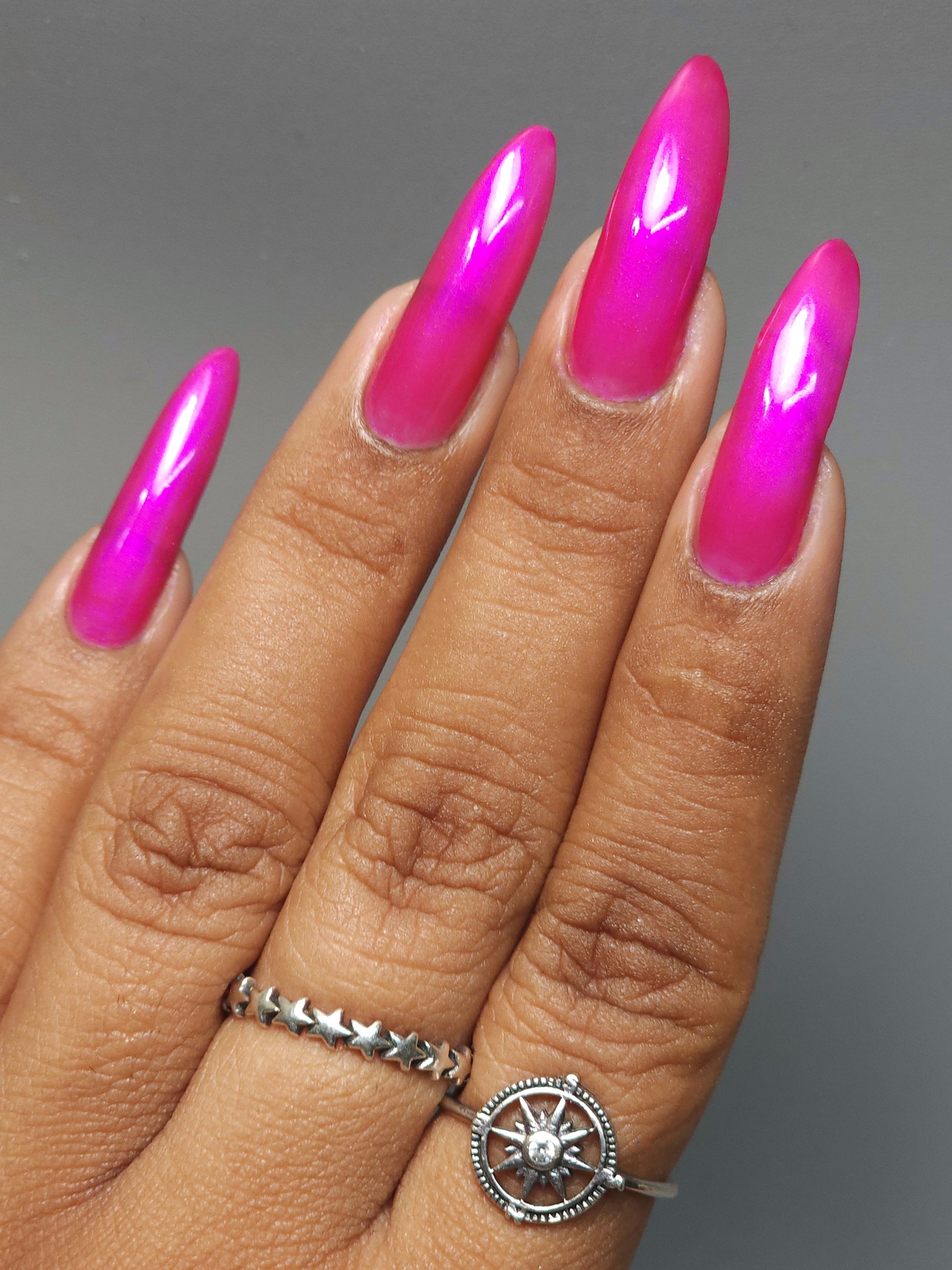A semi-sheer raspberry pink jelly base with shimmer that shifts from purple to pink to red at extremes. (I highly recommend 3 coats for this one.)