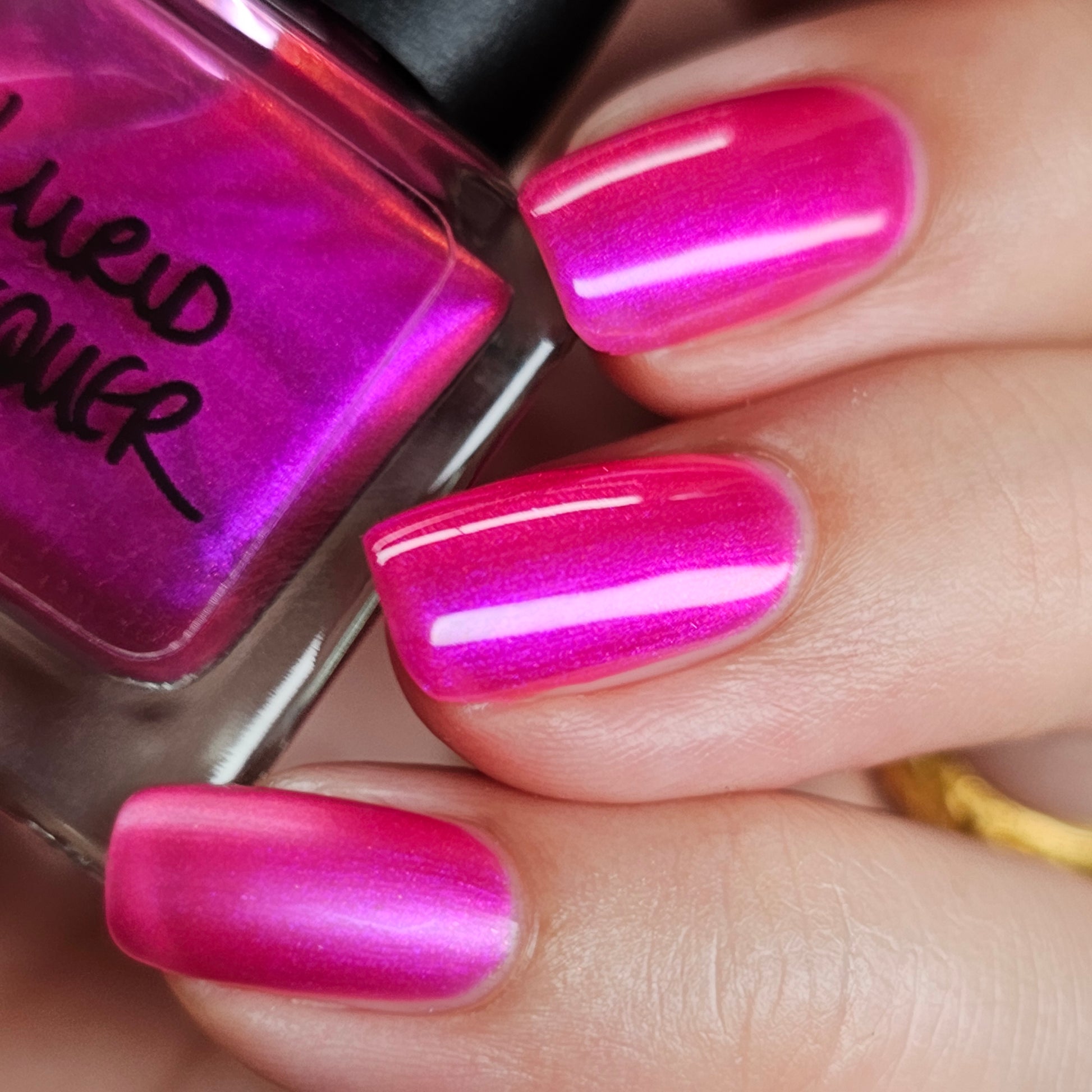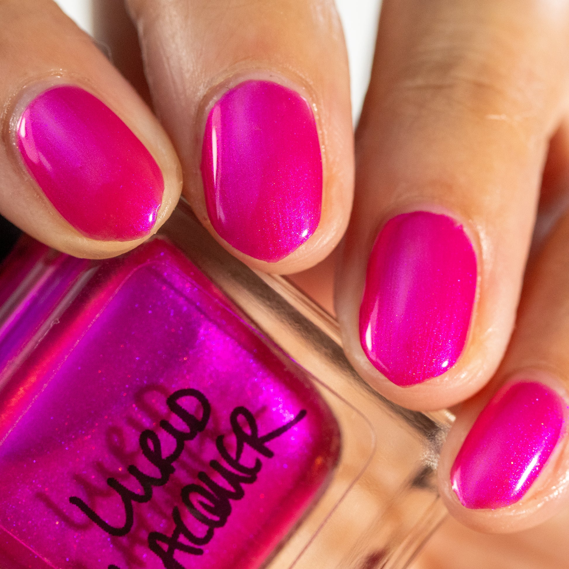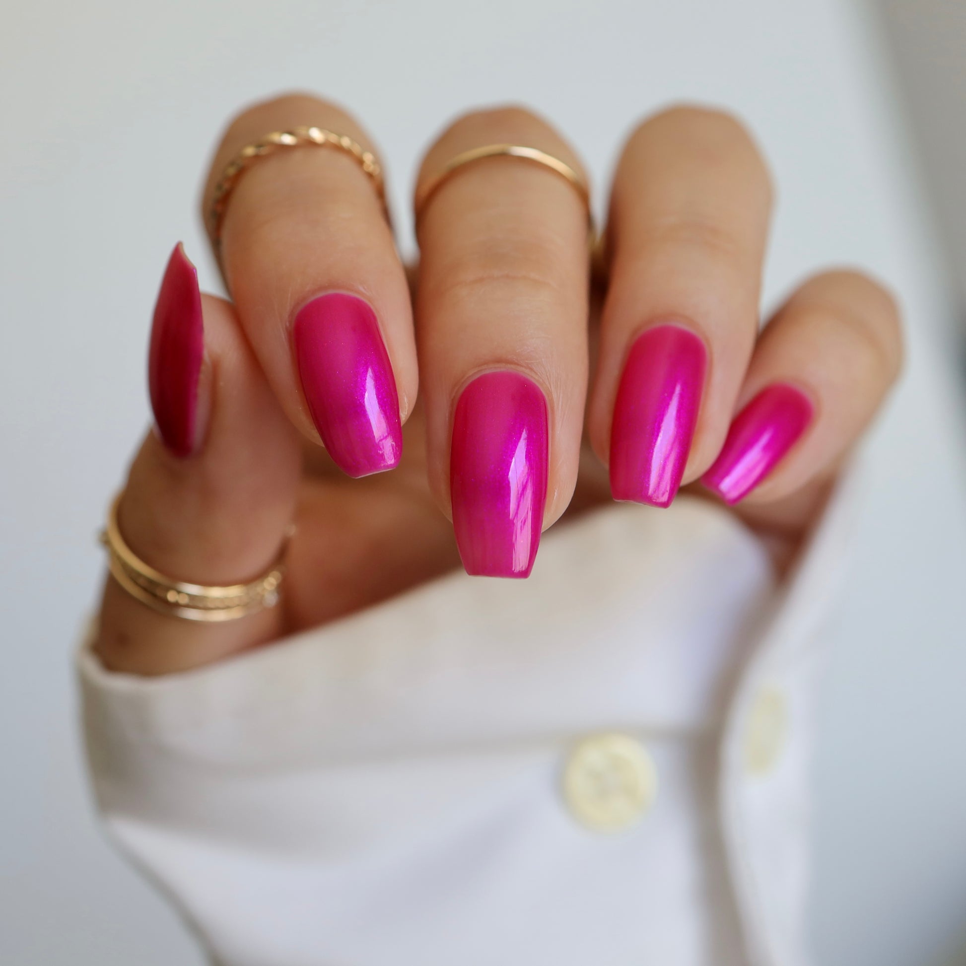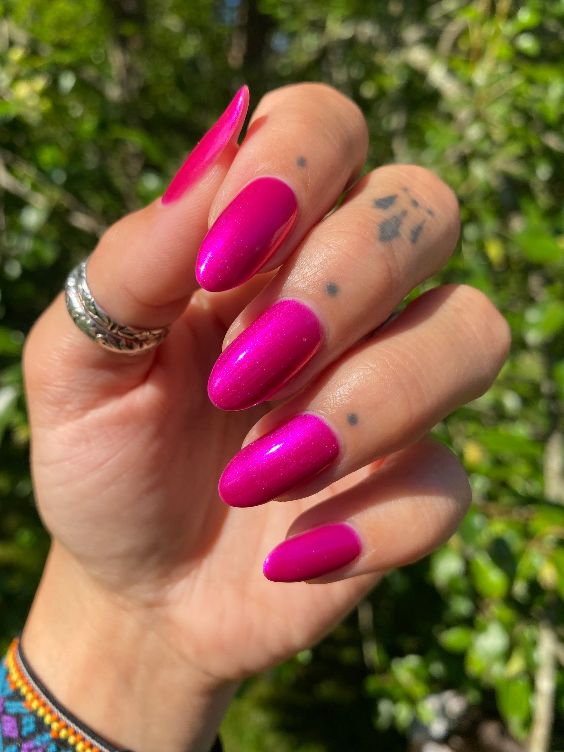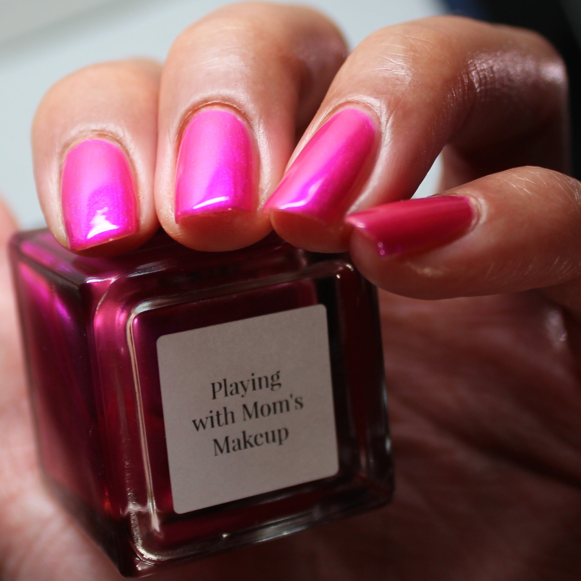 A semi-sheer raspberry pink jelly base with shimmer that shifts from purple to pink to red at extremes. (I highly recommend 3 coats for this one.)