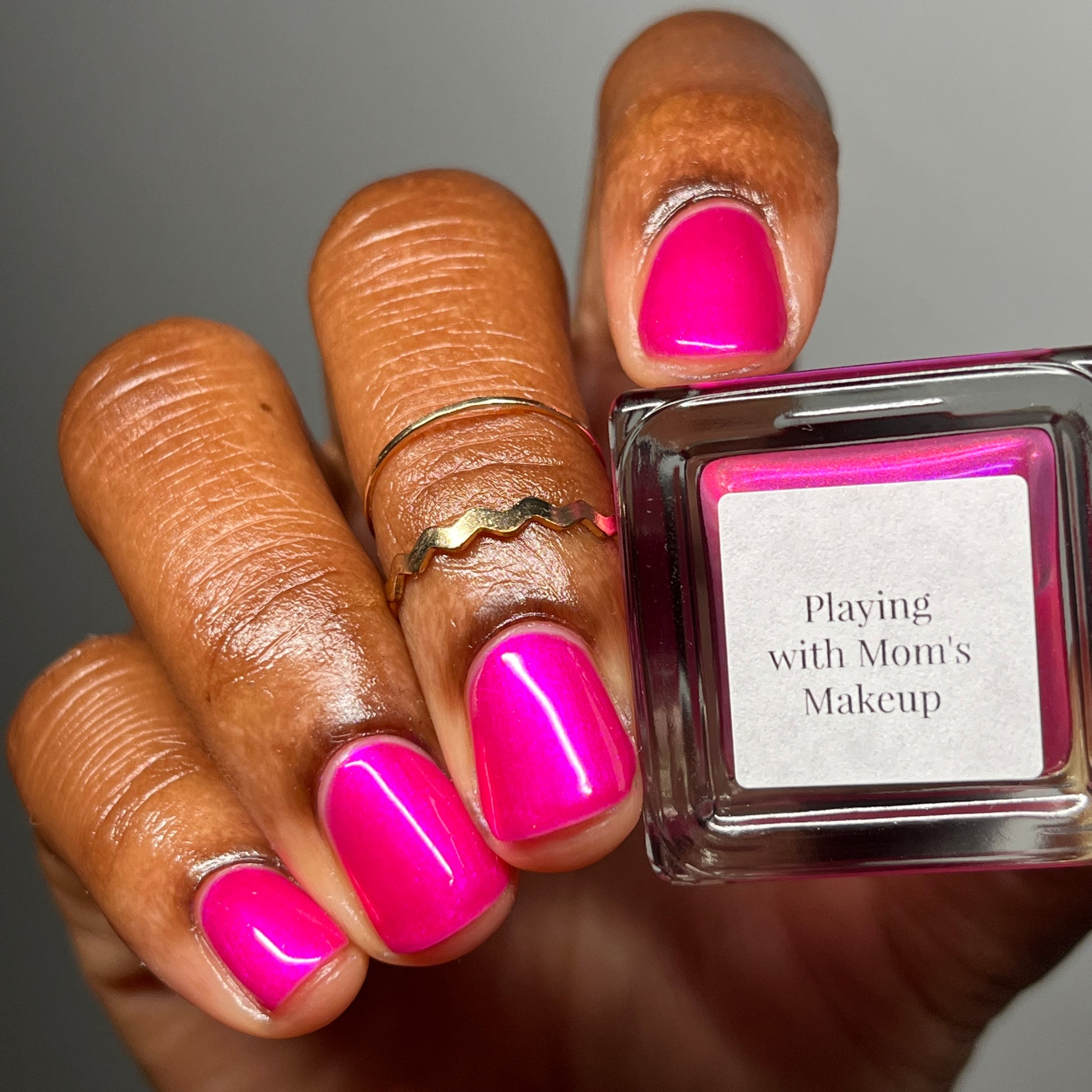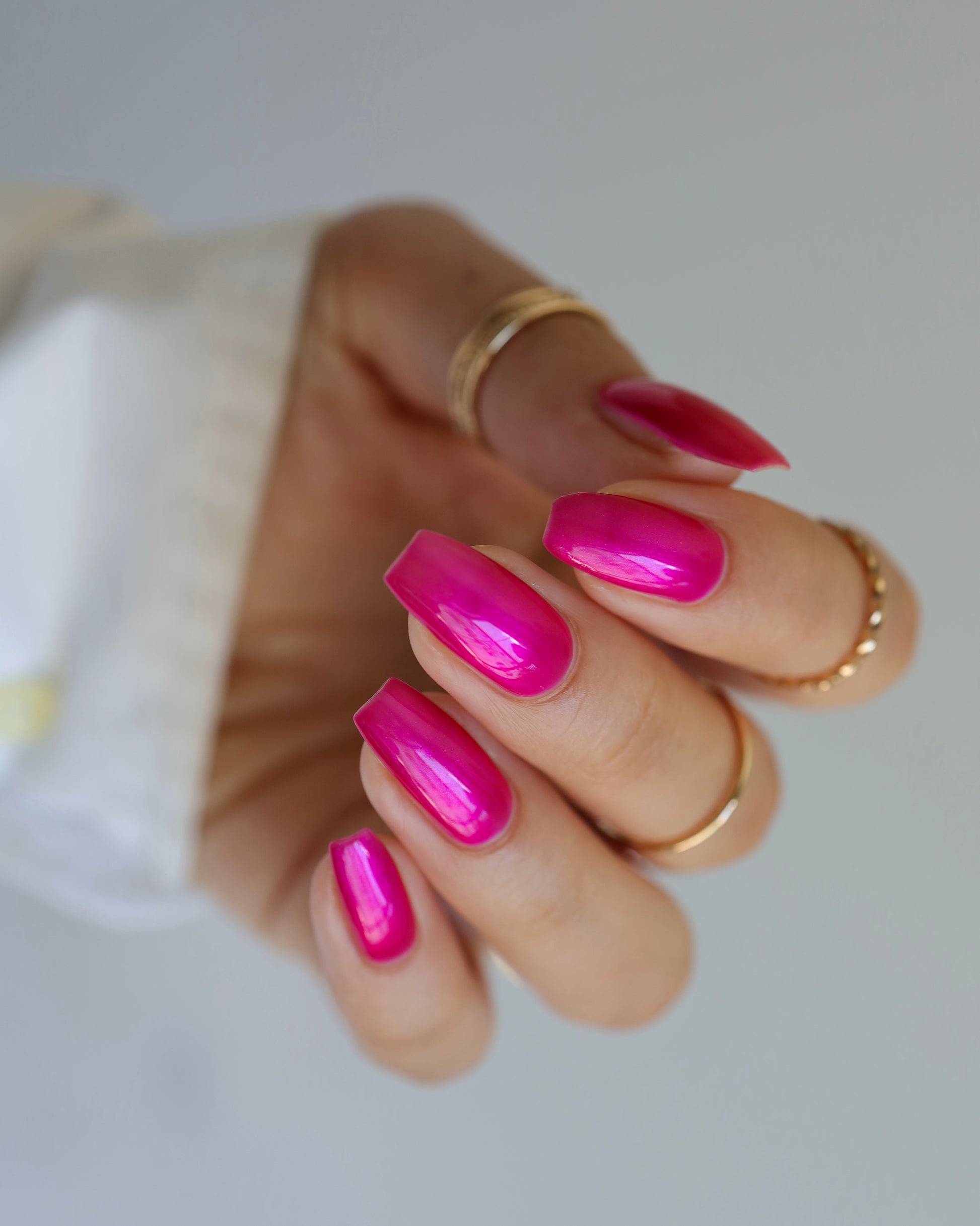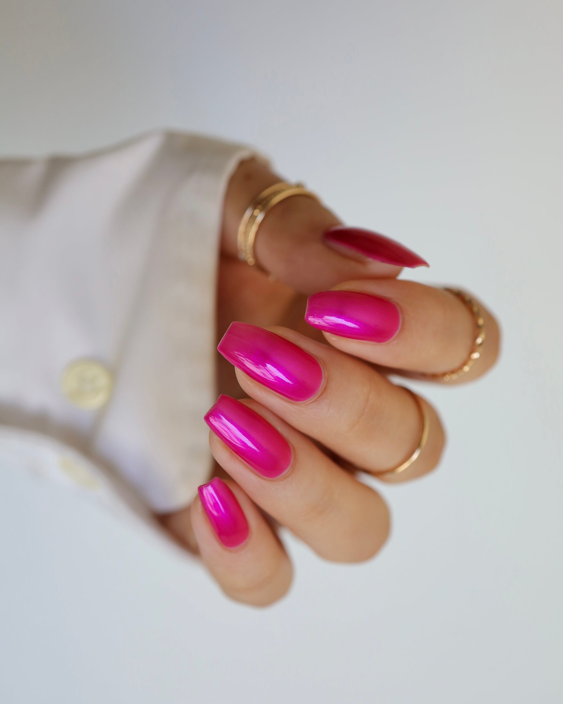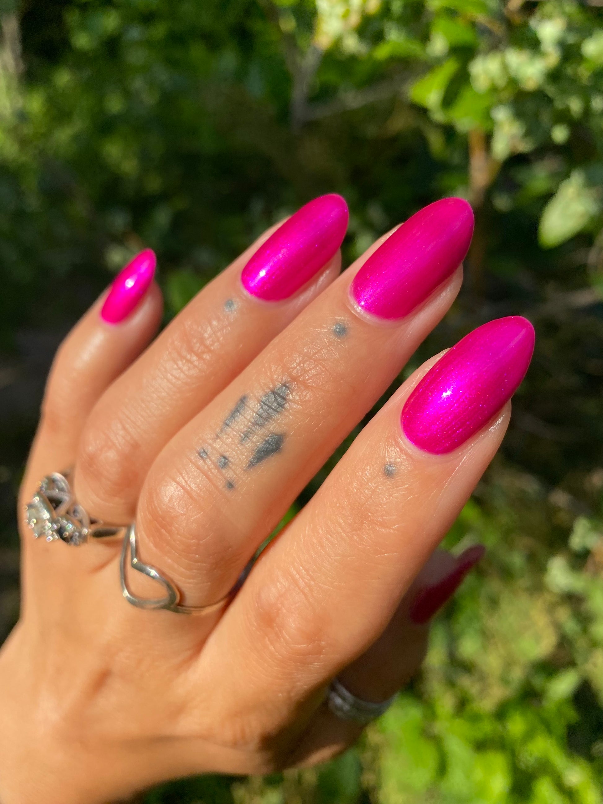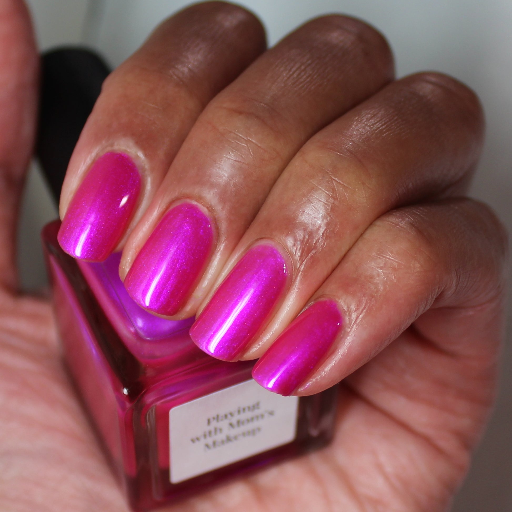 A semi-sheer raspberry pink jelly base with shimmer that shifts from purple to pink to red at extremes. (I highly recommend 3 coats for this one.)
