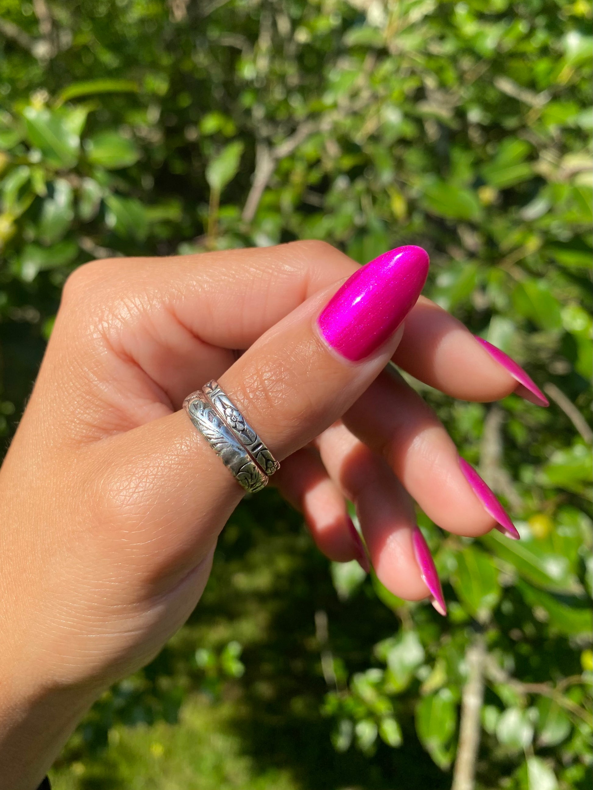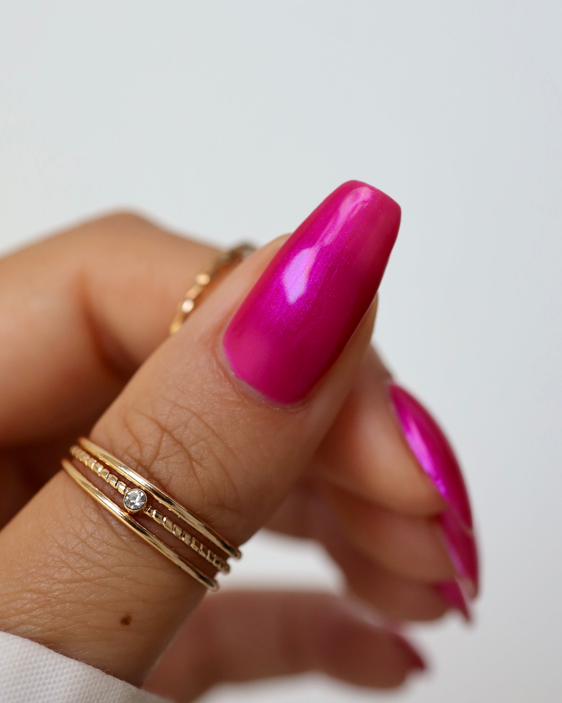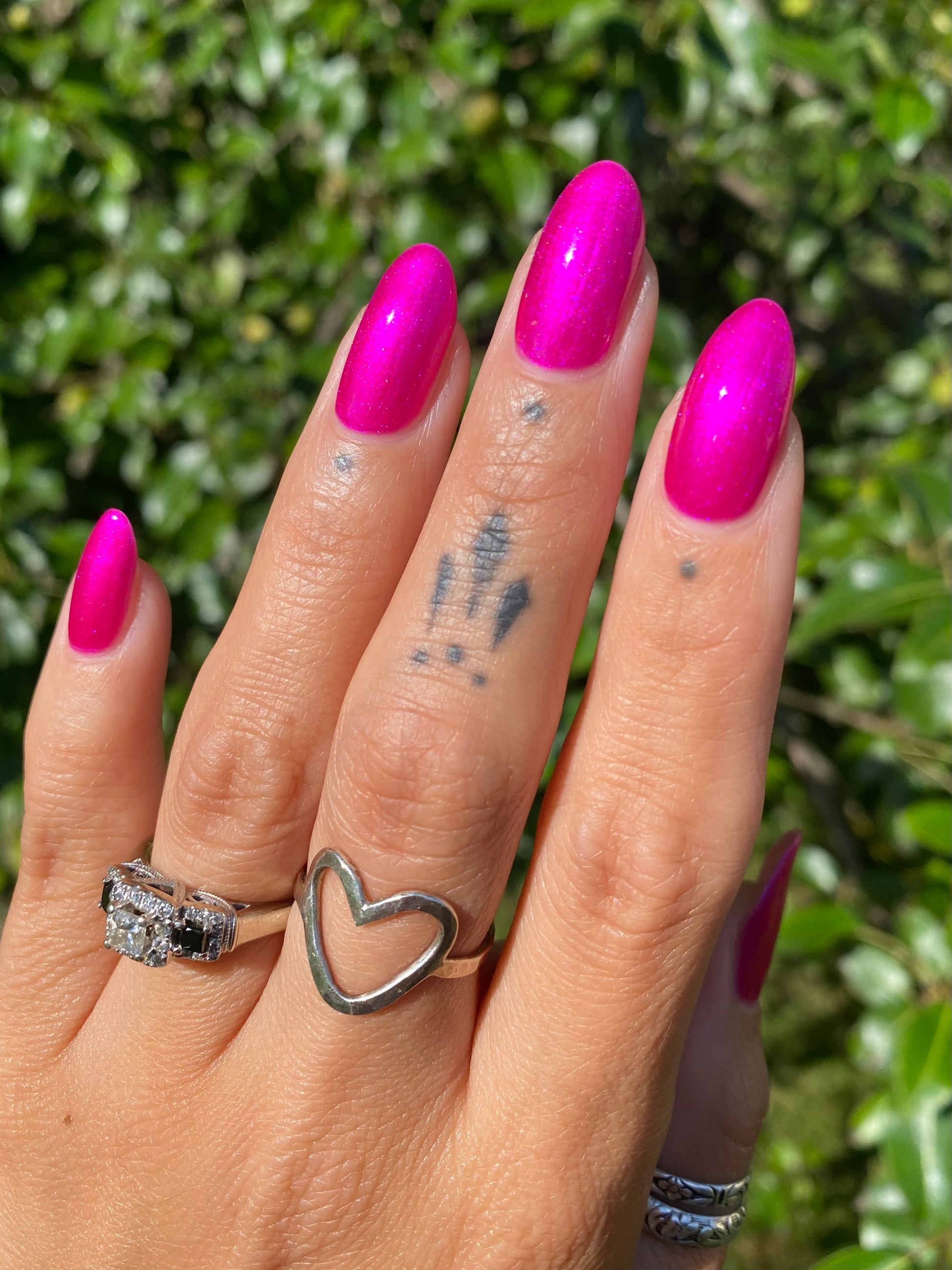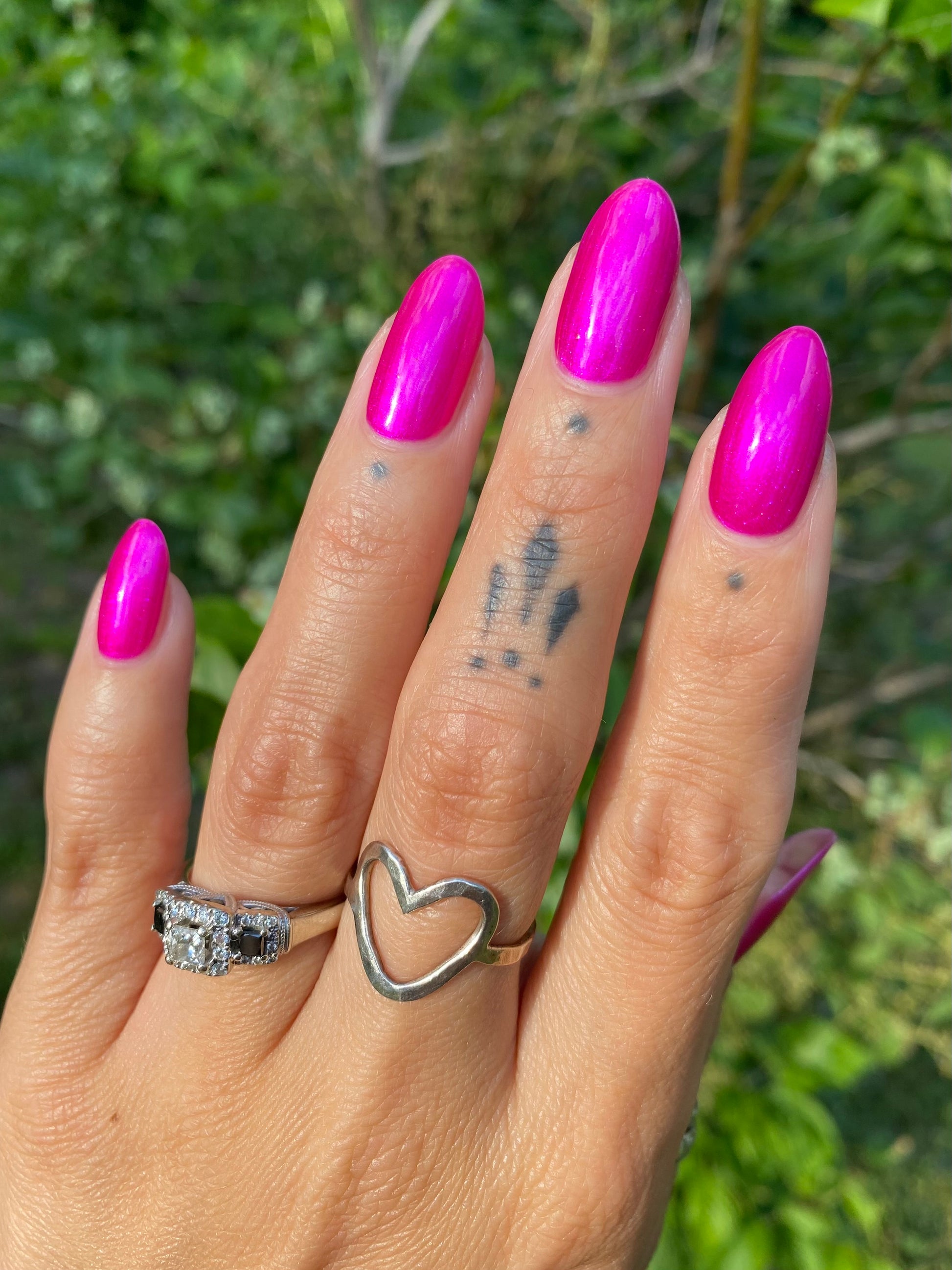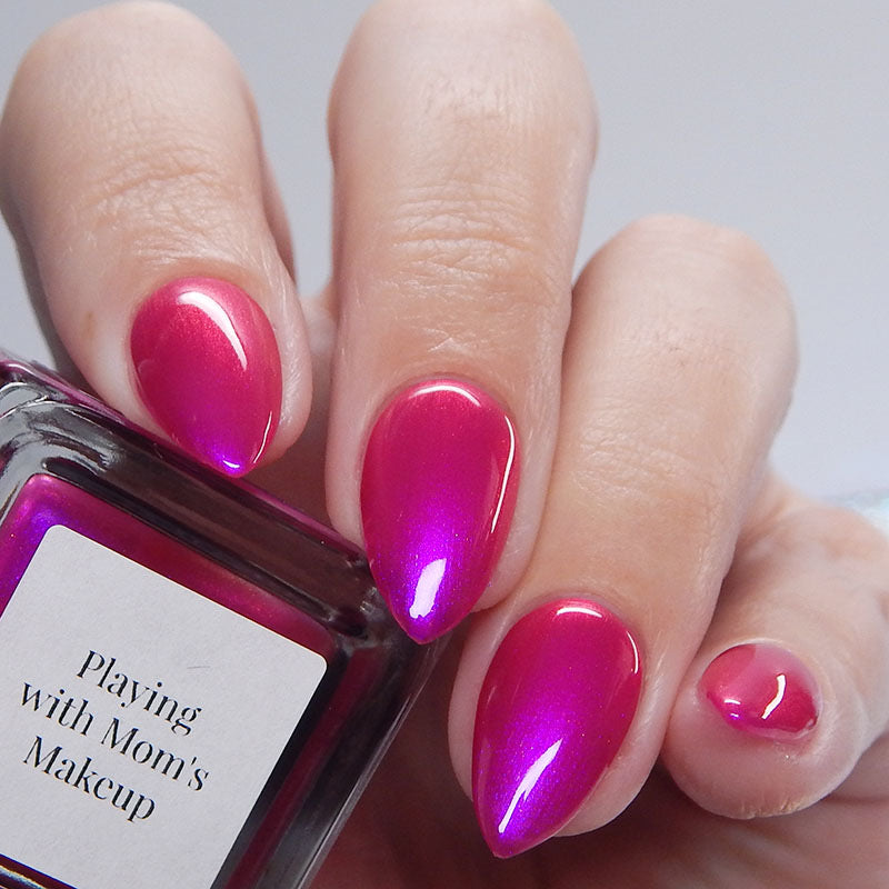 A semi-sheer raspberry pink jelly base with shimmer that shifts from purple to pink to red at extremes. (I highly recommend 3 coats for this one.)