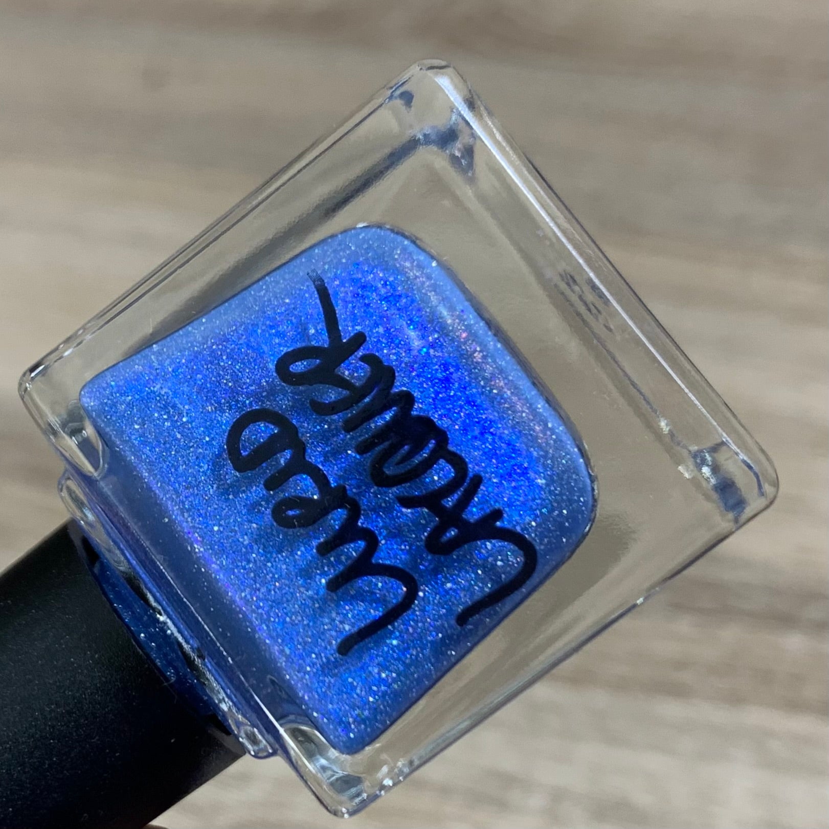 A dusty pale blue crelly base with silver light reflective glitter, a hint of linear holographic twinkle, and aurora shimmer that shifts from blue to purple.