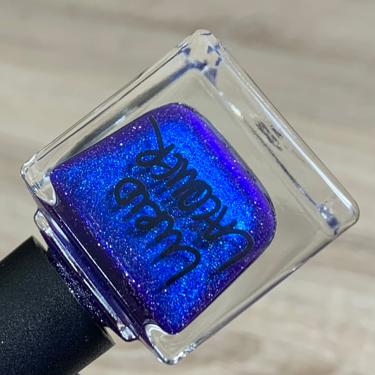 A deep purple base with silver light reflective glitter and aurora shimmer that shifts from a warm cerulean blue to a darker, cool-toned blue