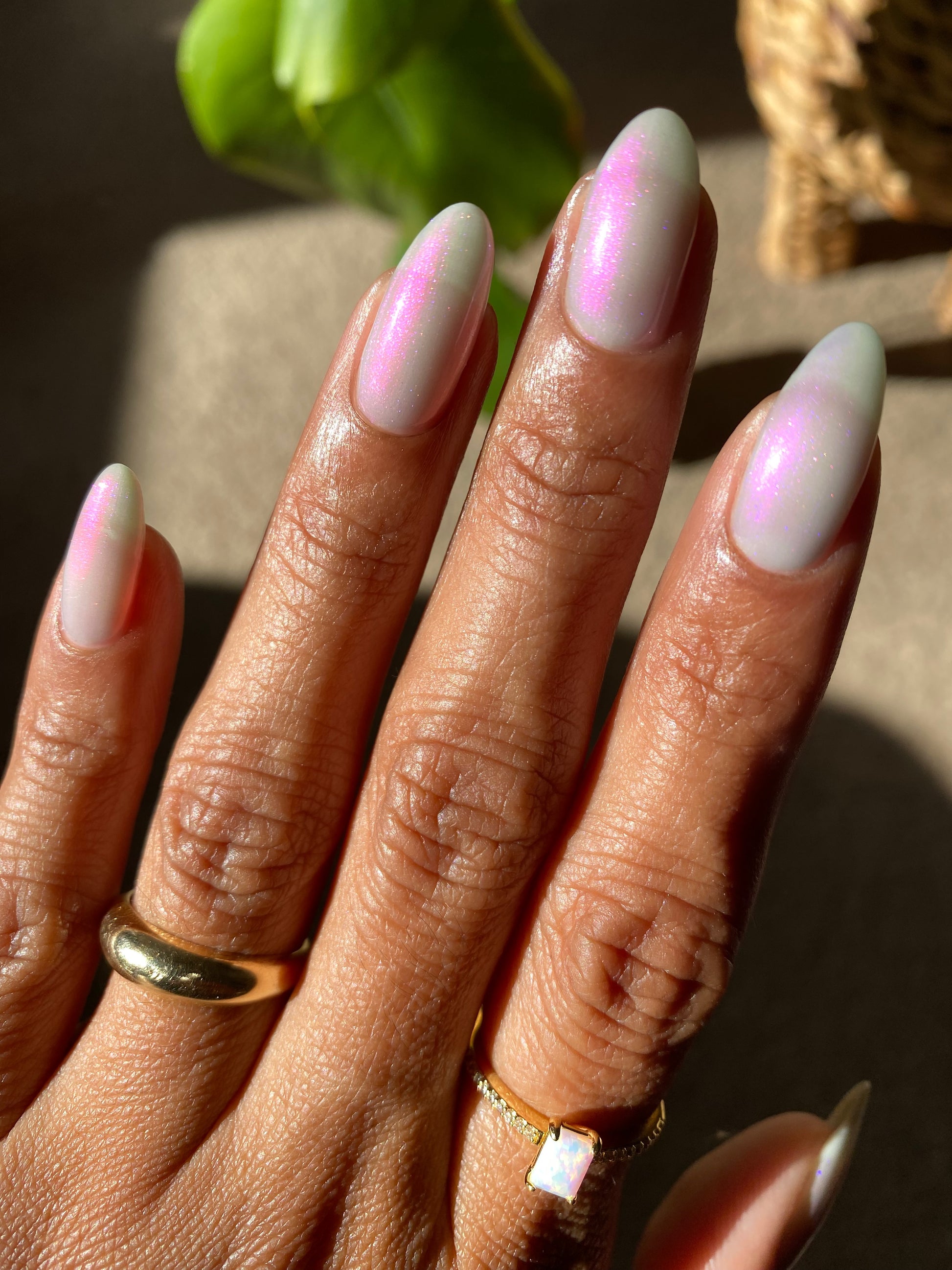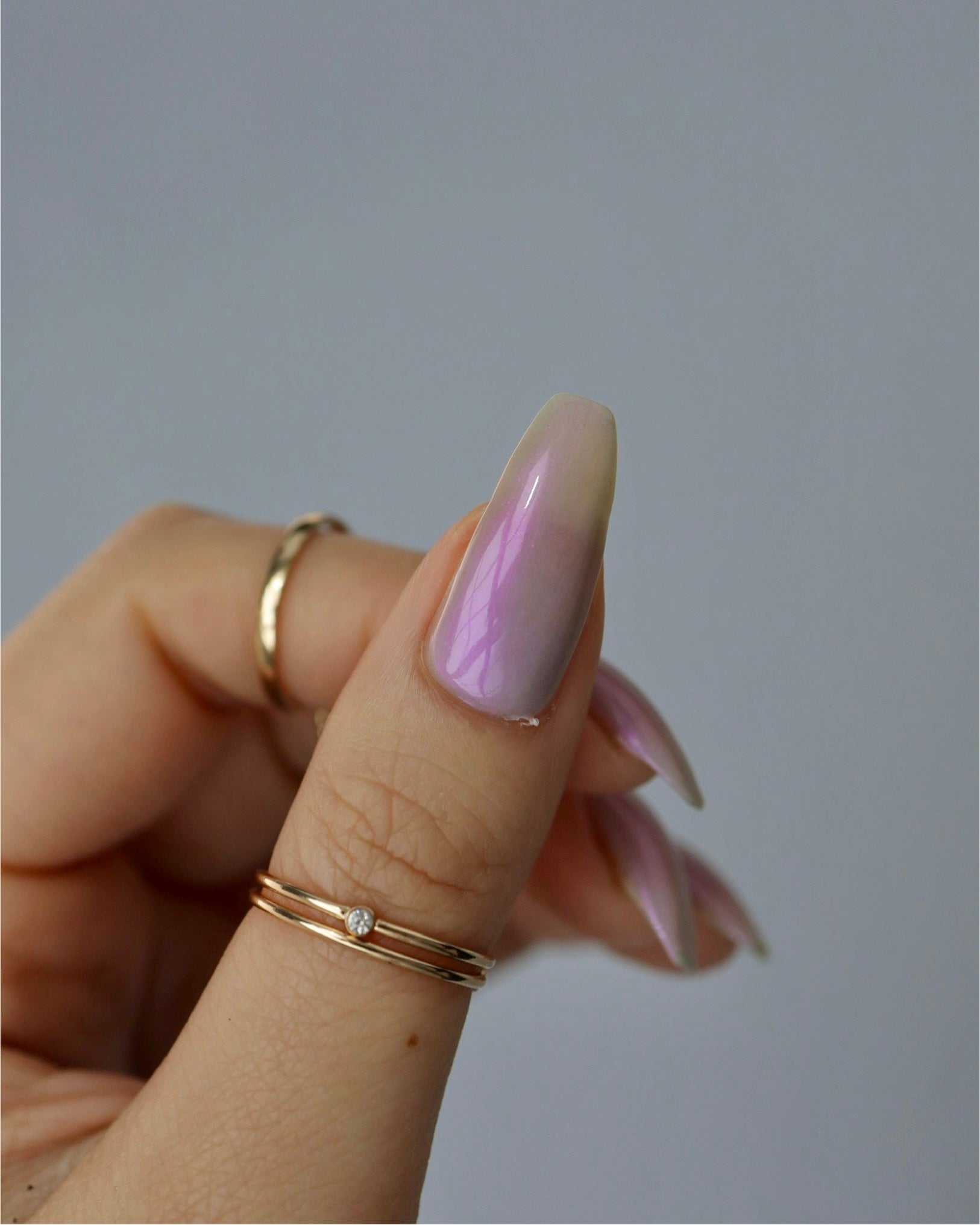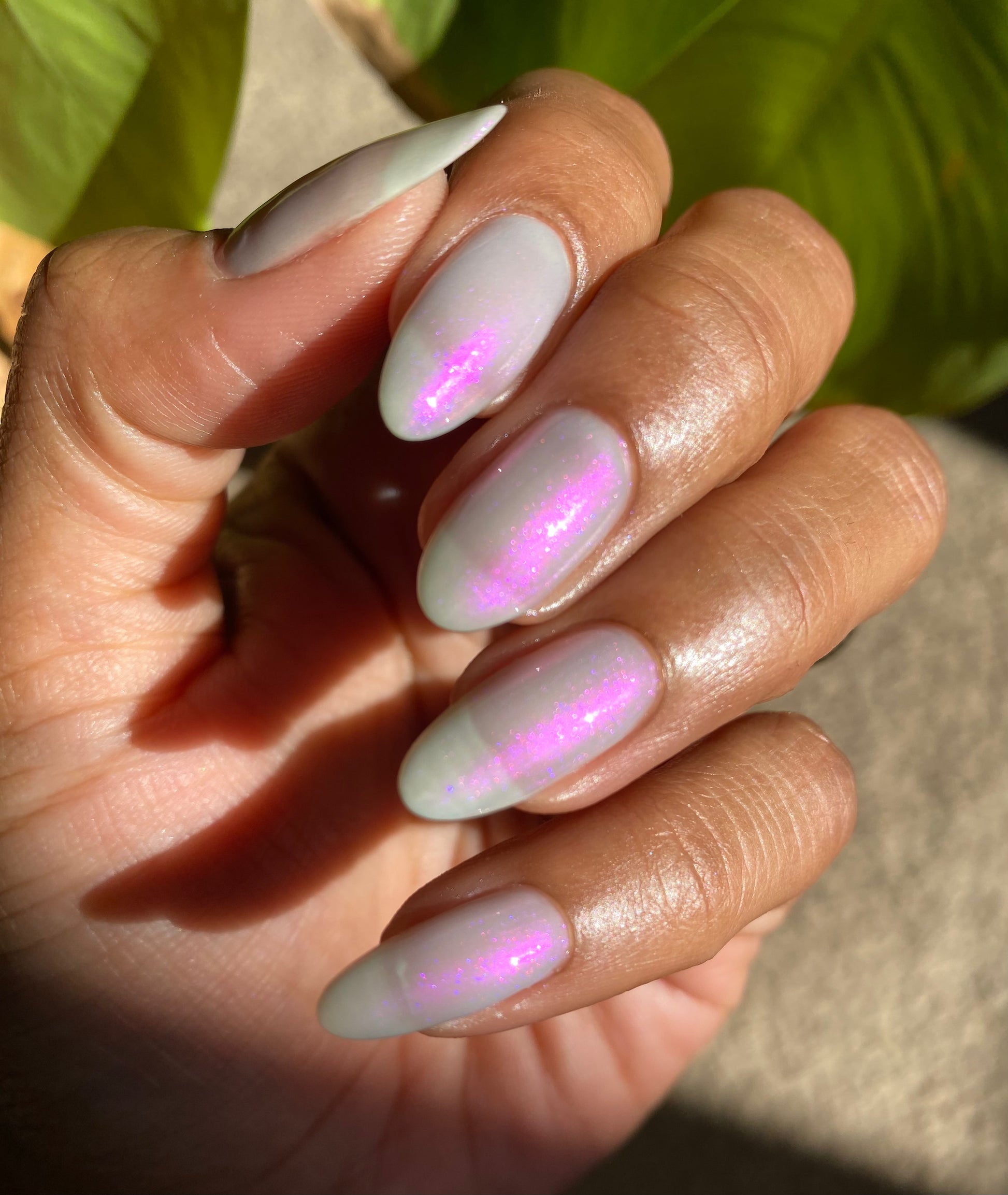 A soft gray base with purple to pink to red shimmer