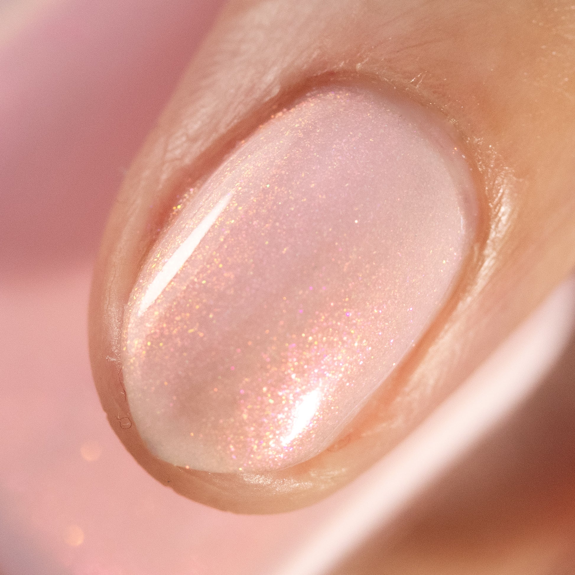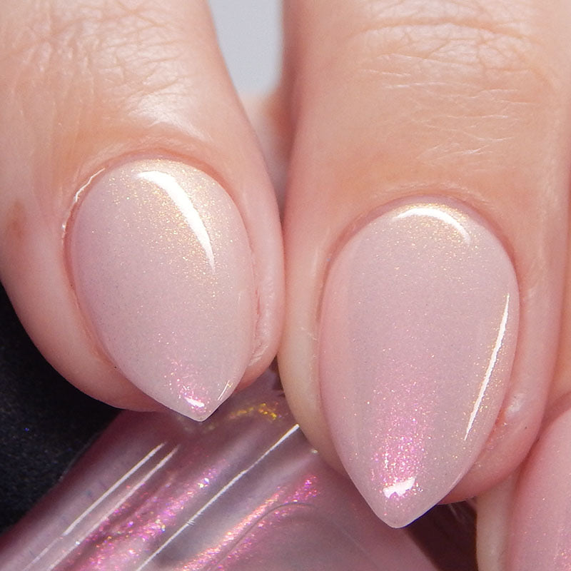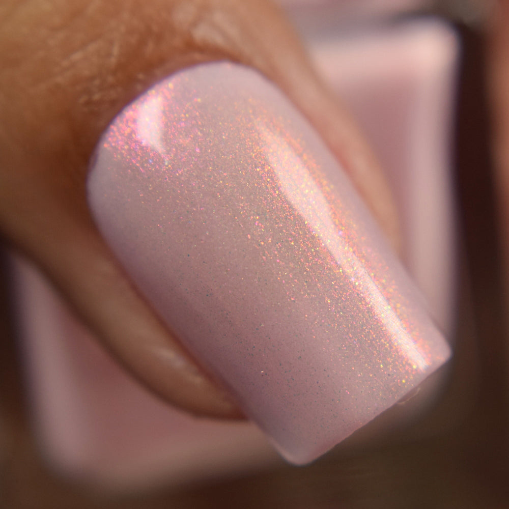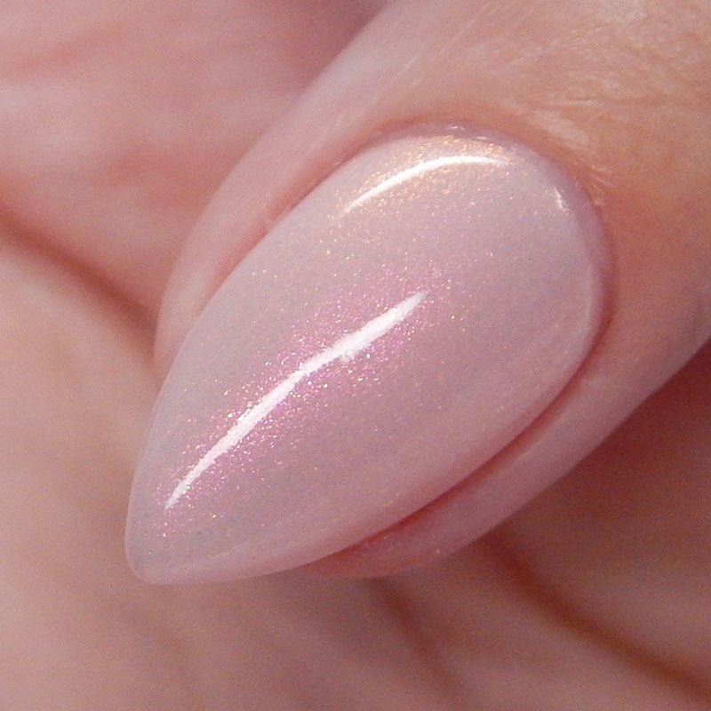 A pale peachy pink crelly with red to orange to gold aurora shimmer