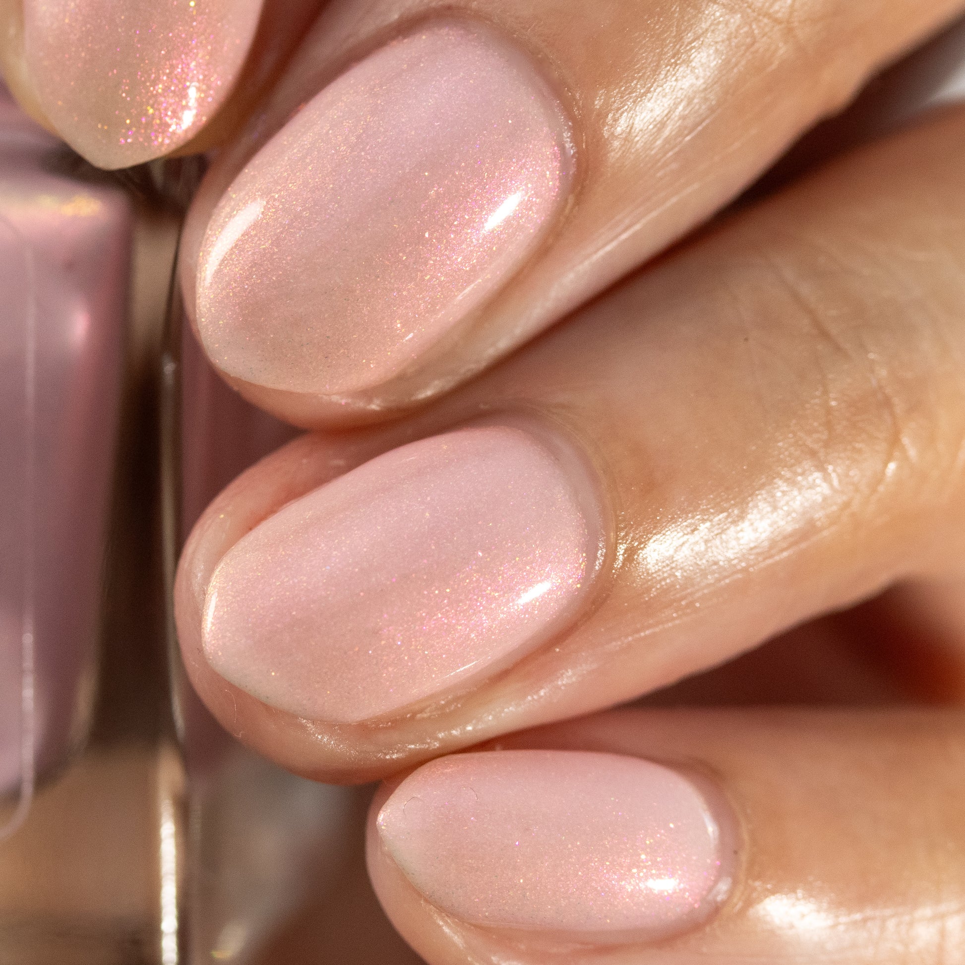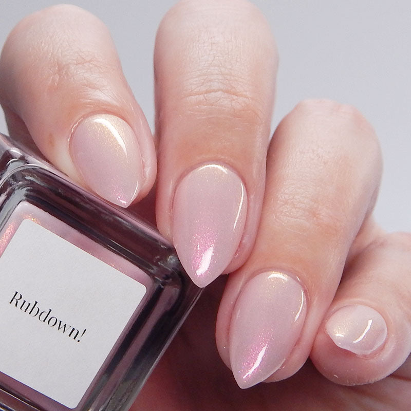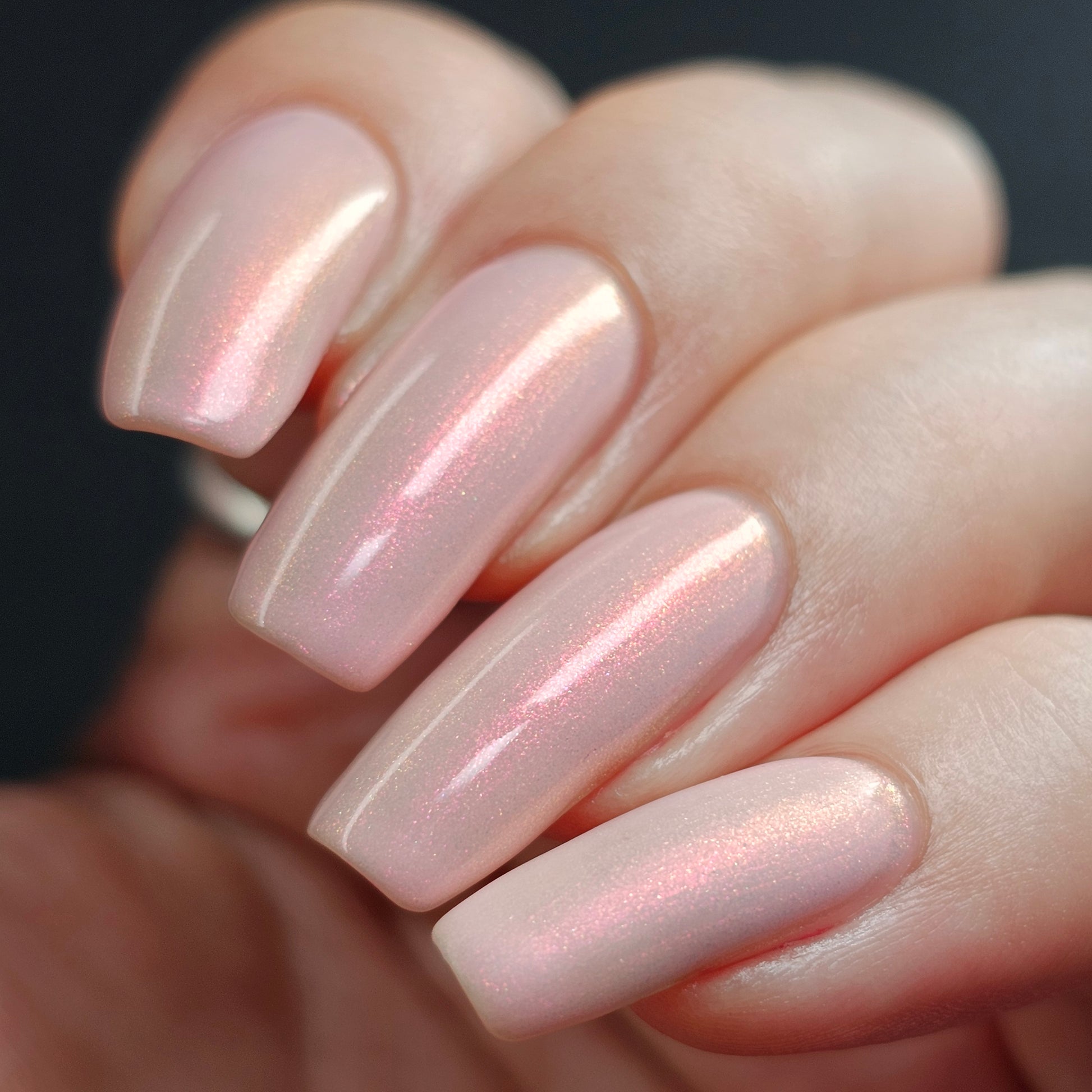 A pale peachy pink crelly with red to orange to gold aurora shimmer