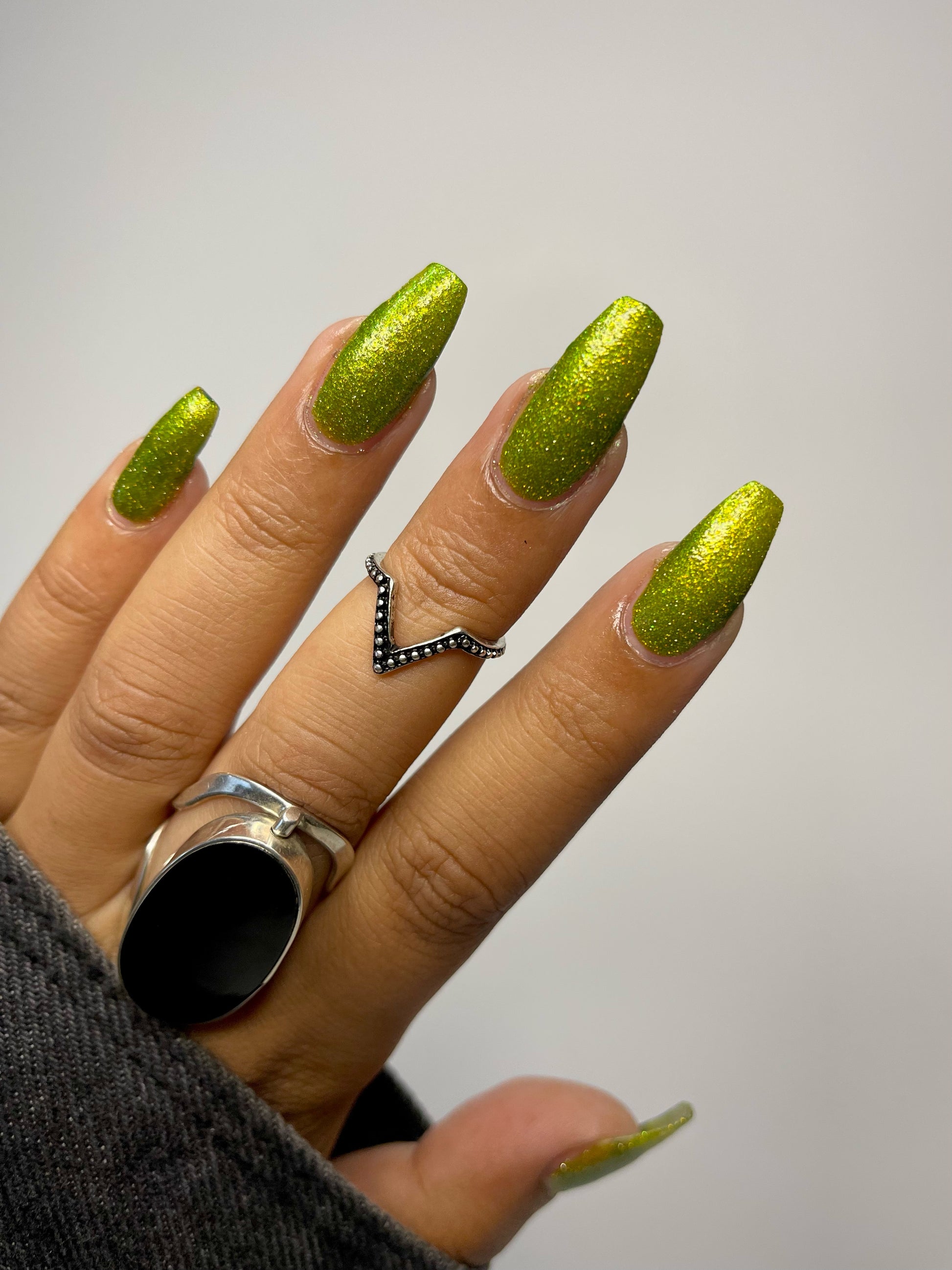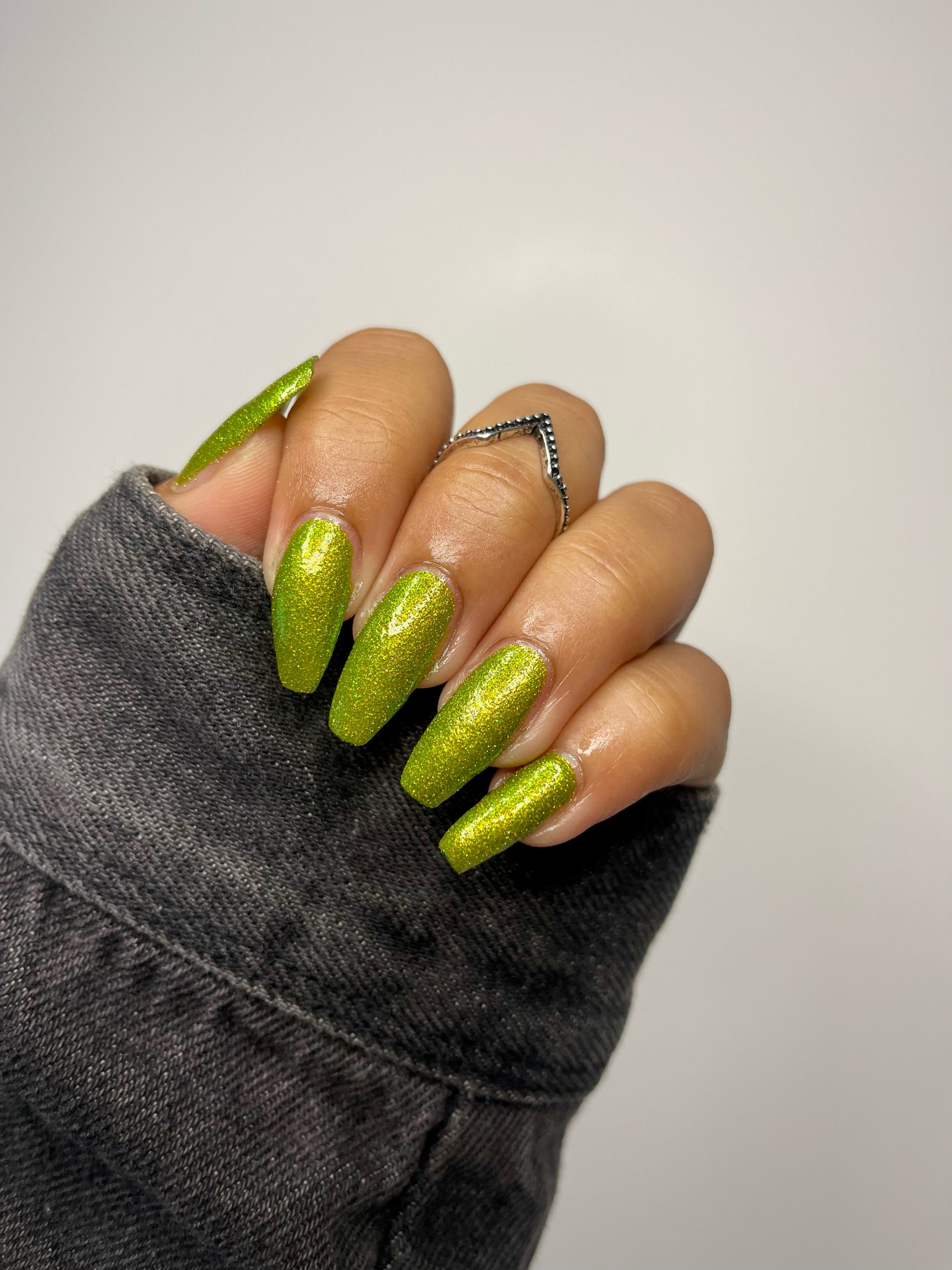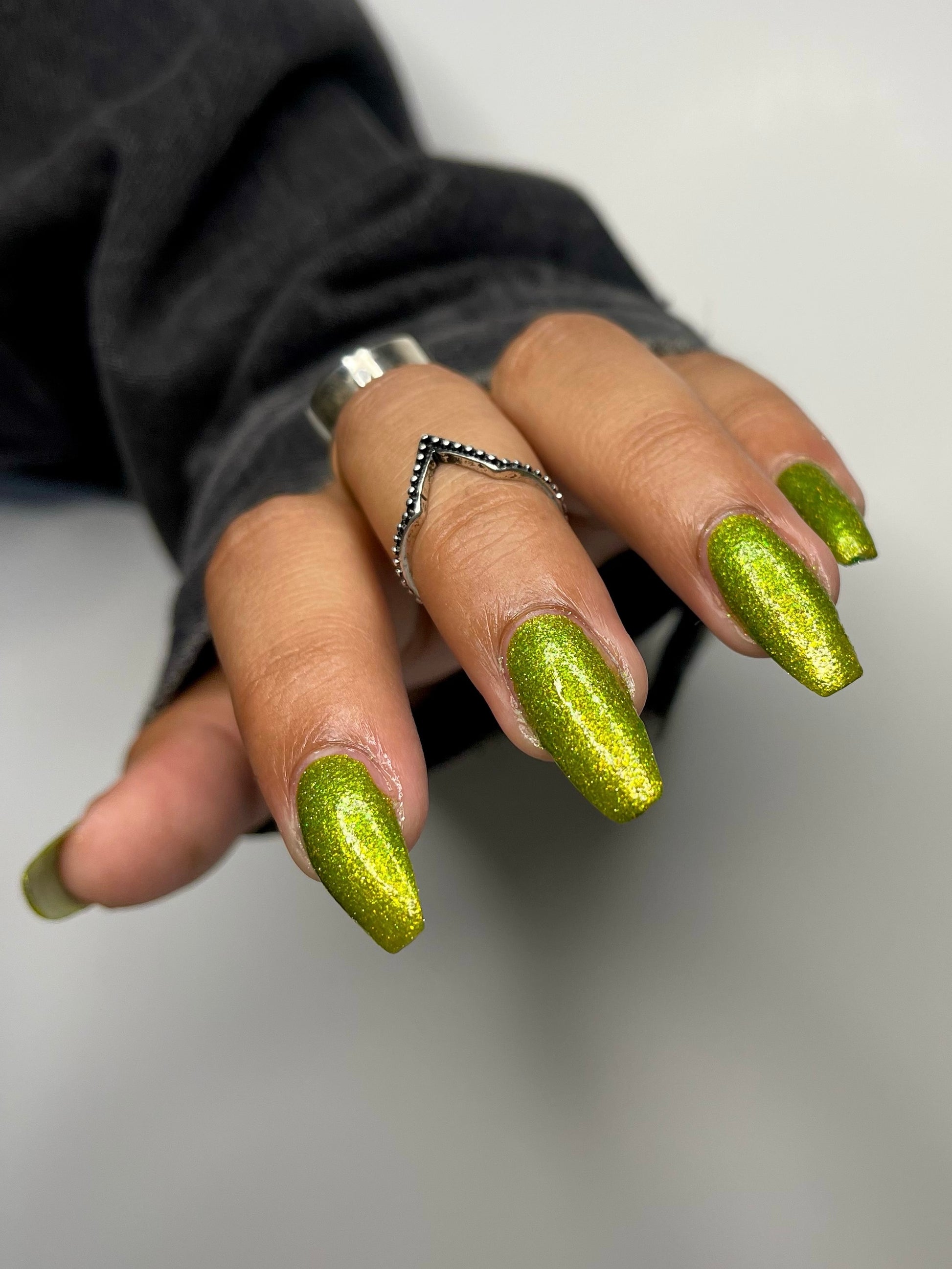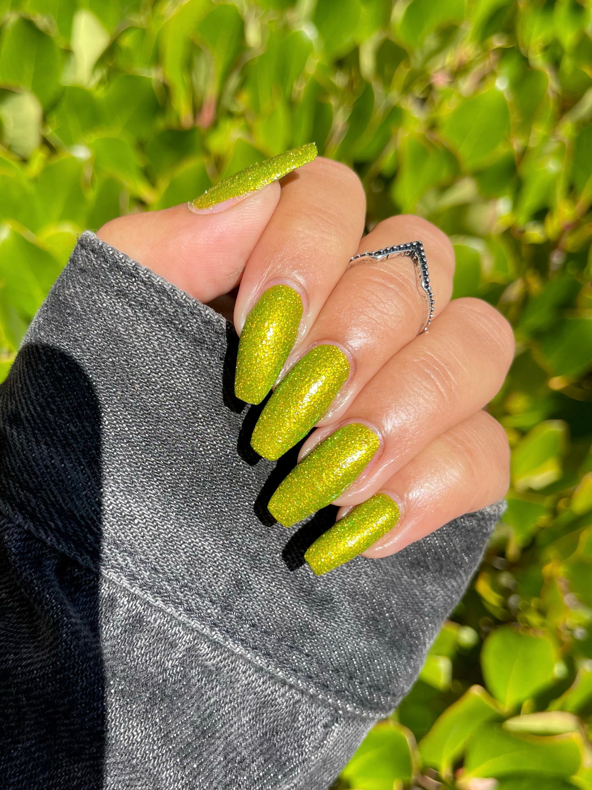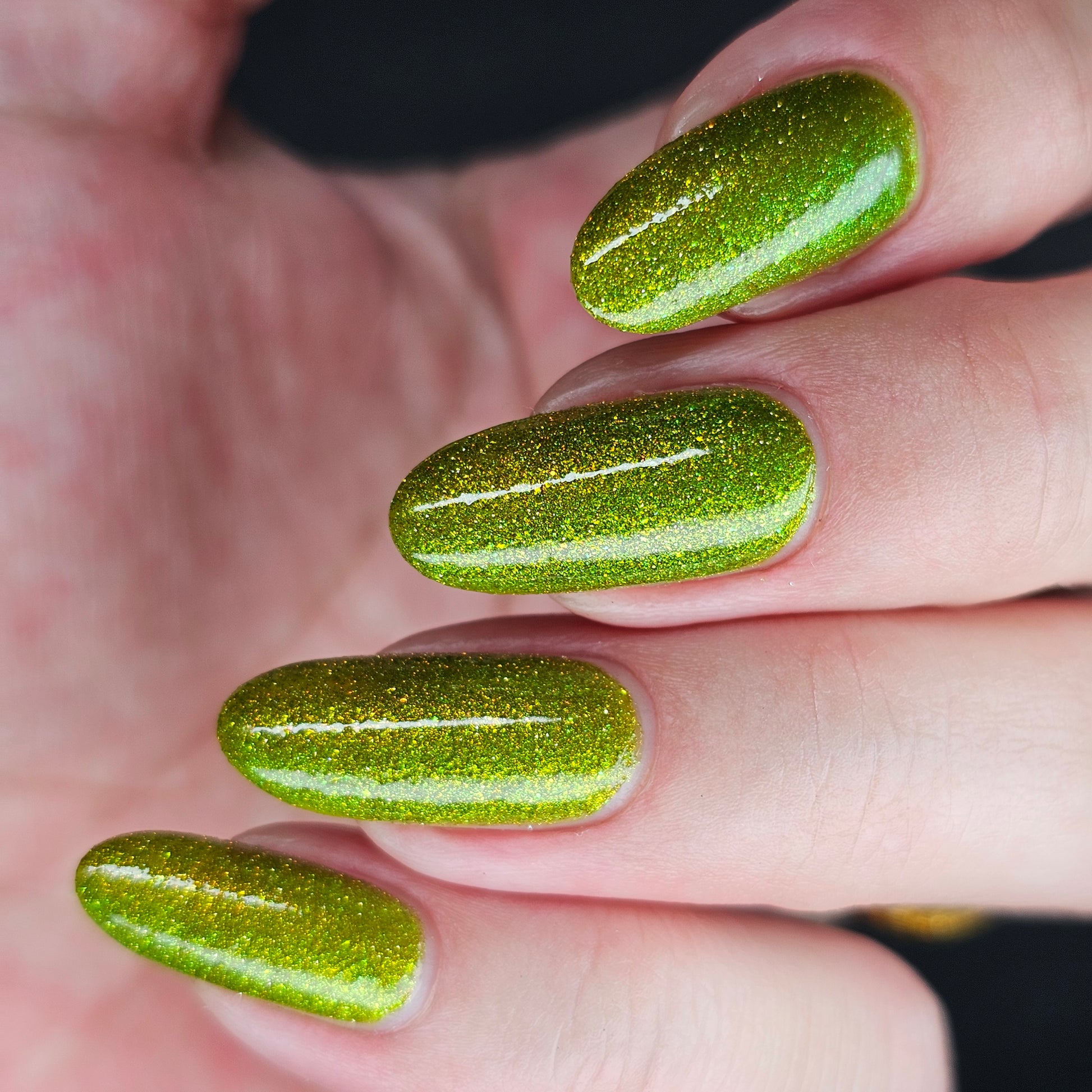 A chartreuse base with a mix of large particle and small particle gold to green aurora shimmer and bronze light reflective glitter