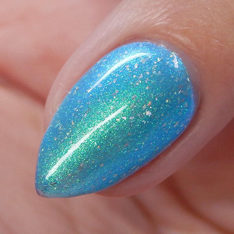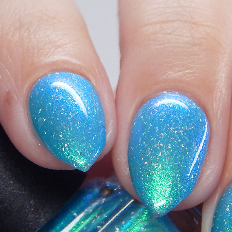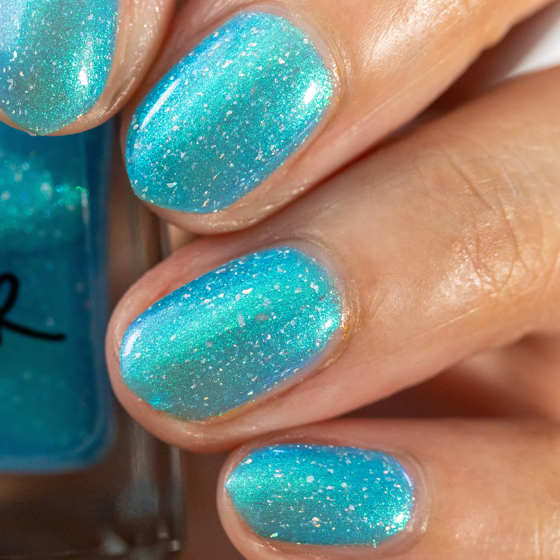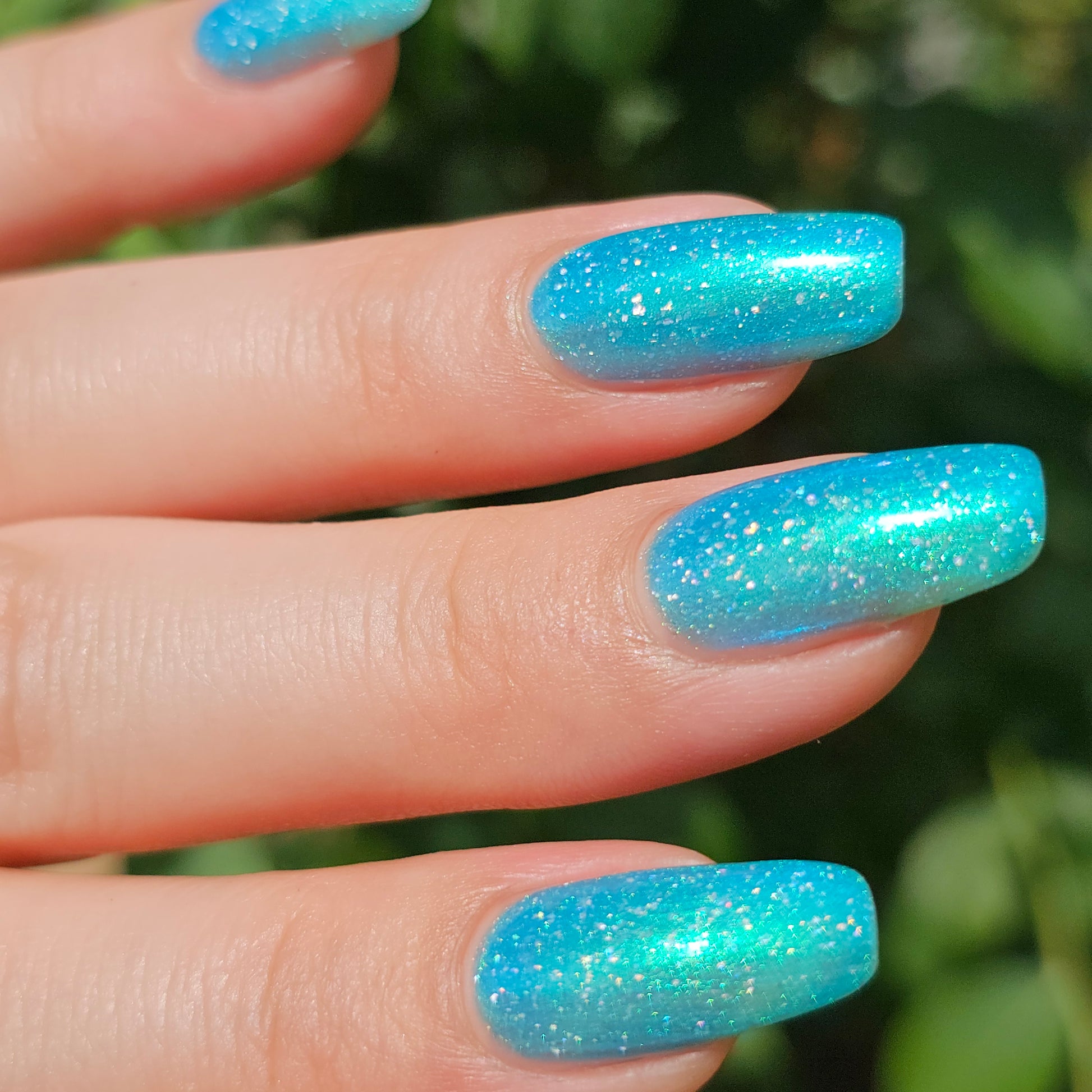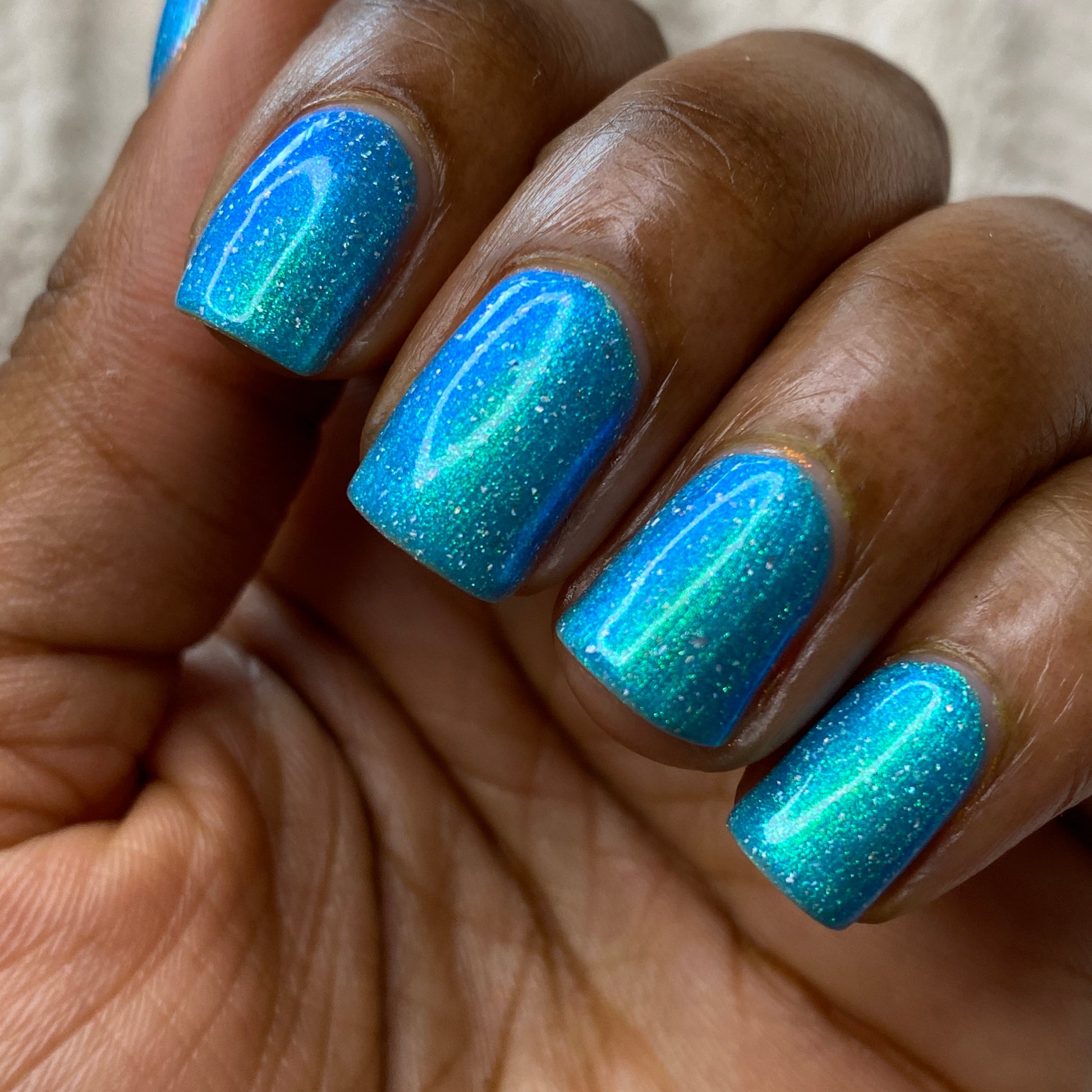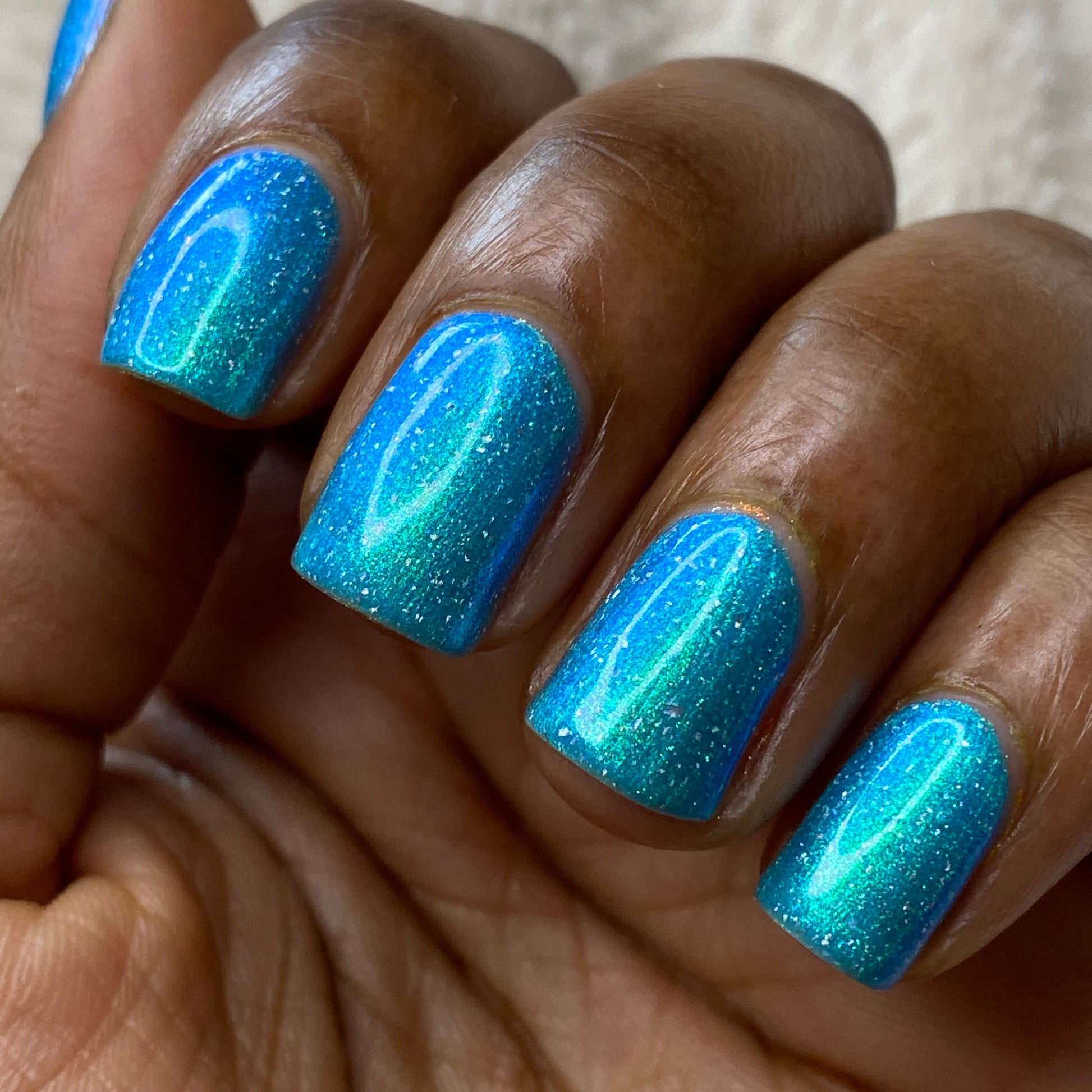 A cerulean crelly base with green to blue shimmer and micro holographic flakes